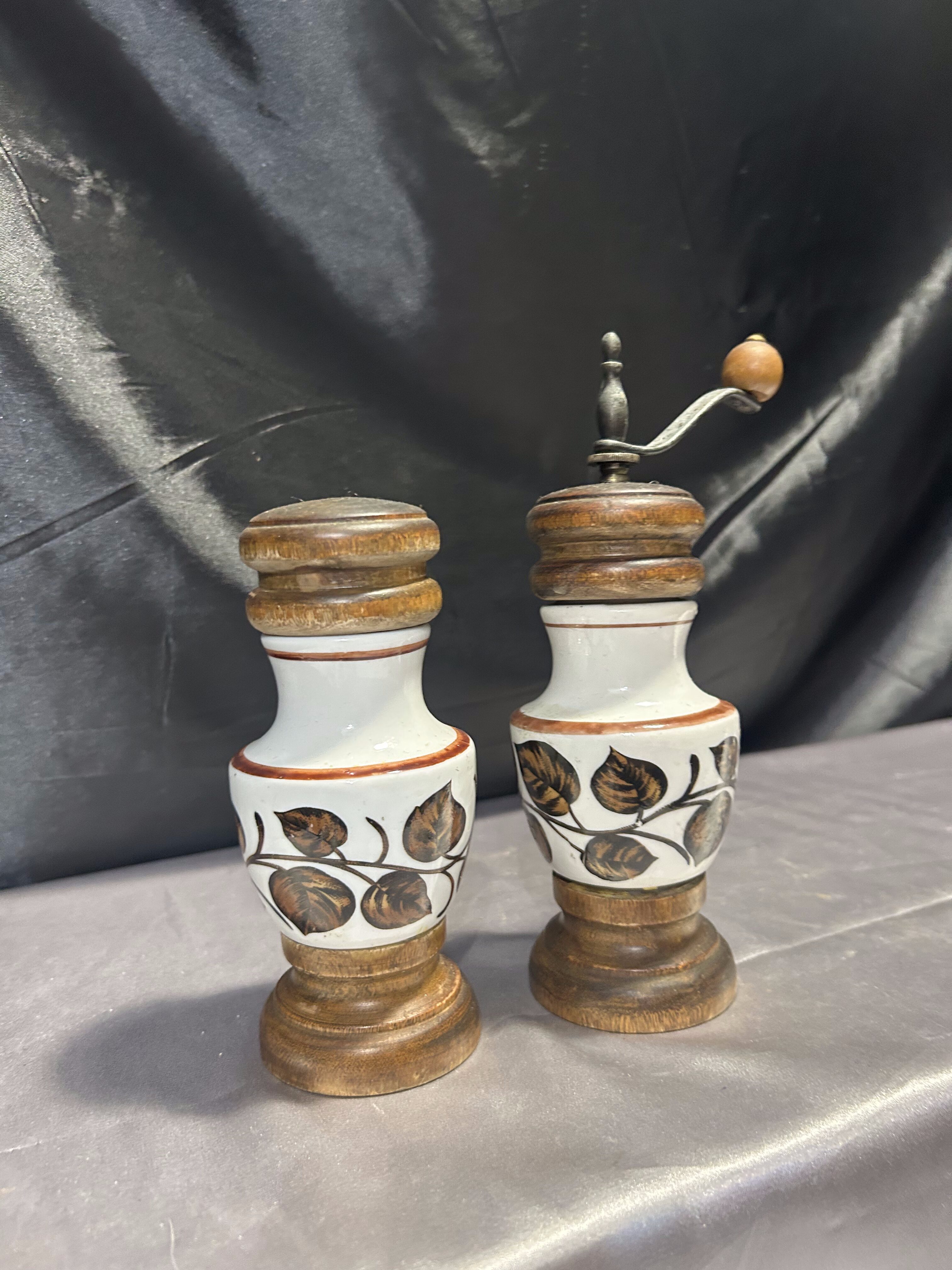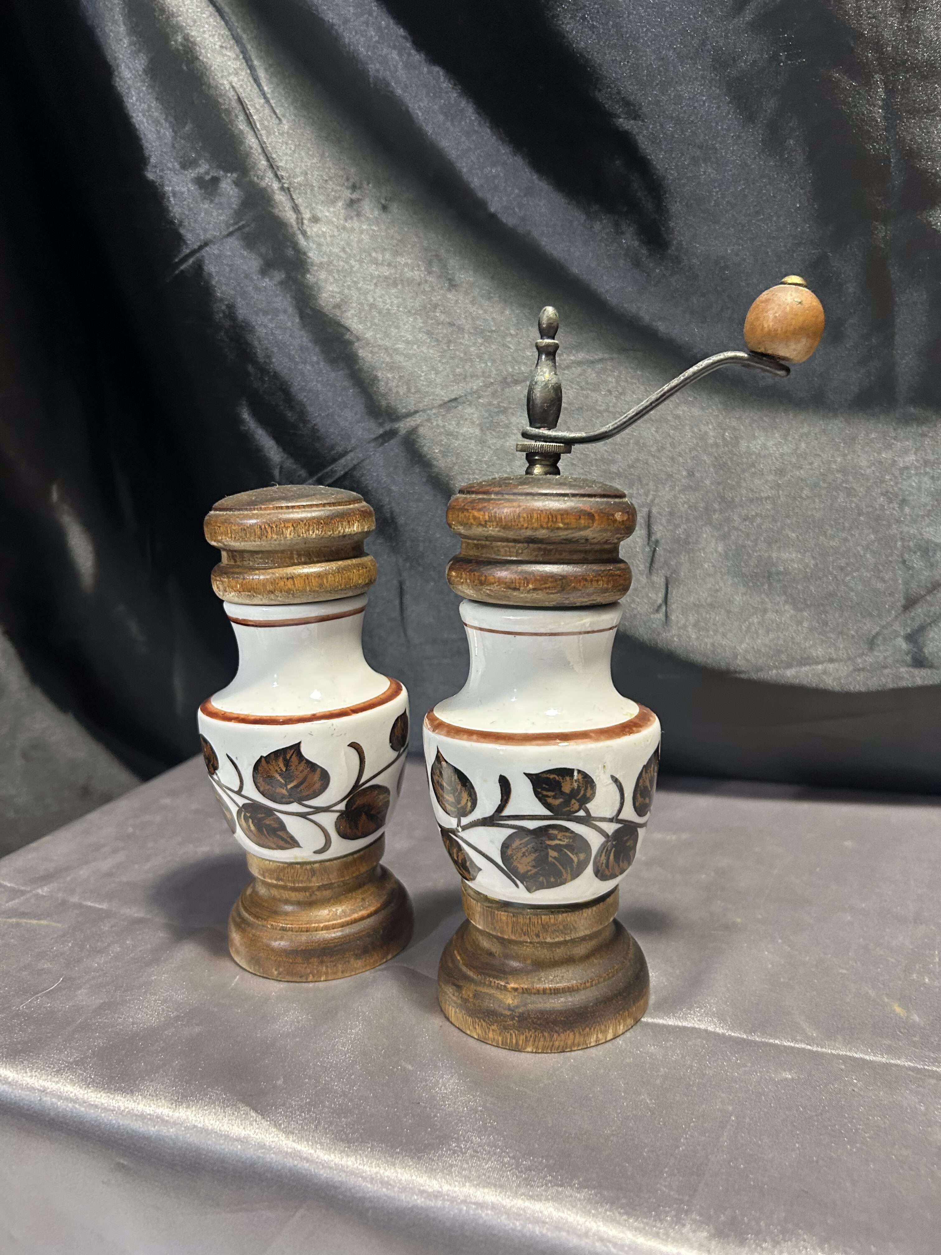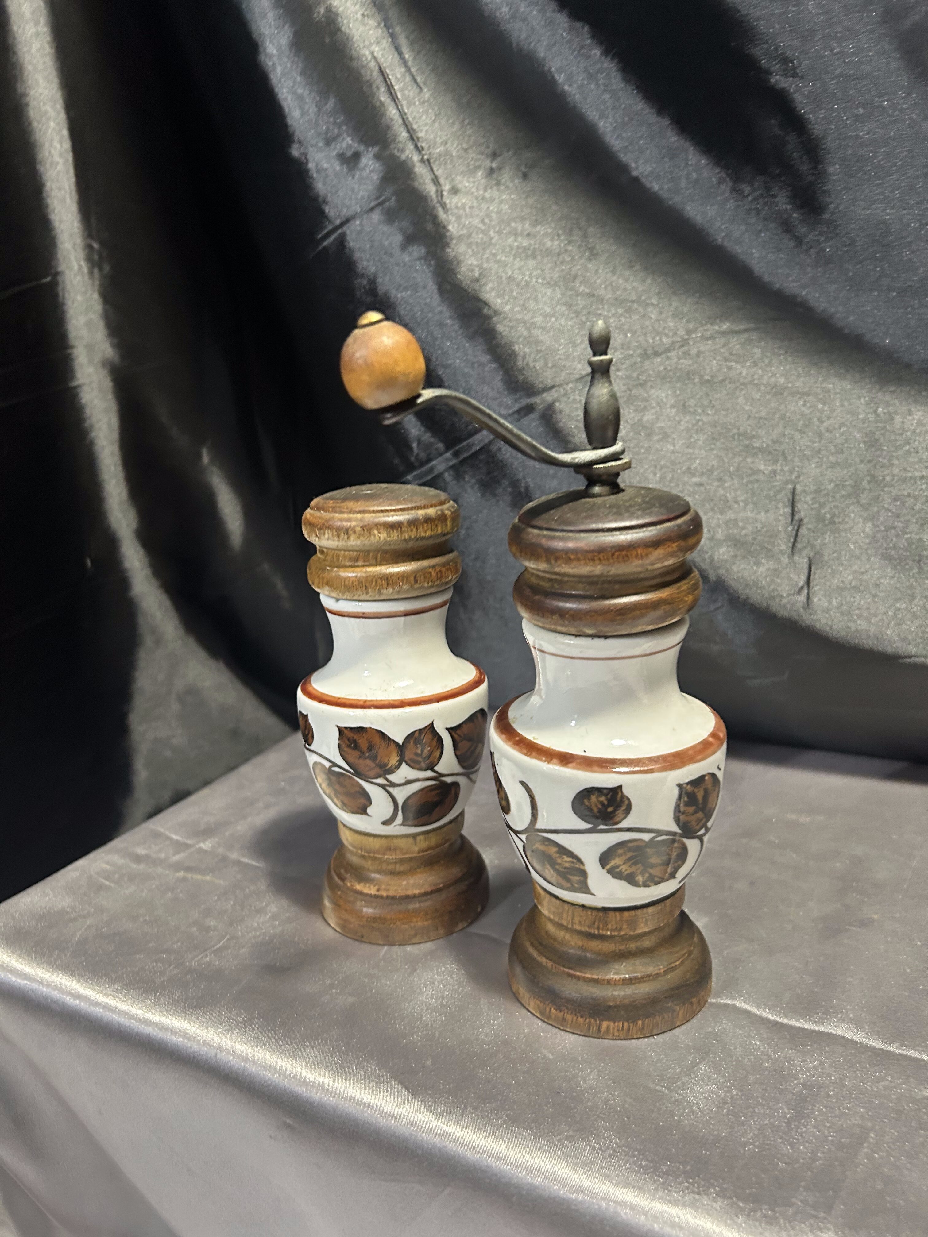 Solniczka i pieprzniczka – Drewniano-ceramiczny zestaw z młynkiem – Ręcznie malowany