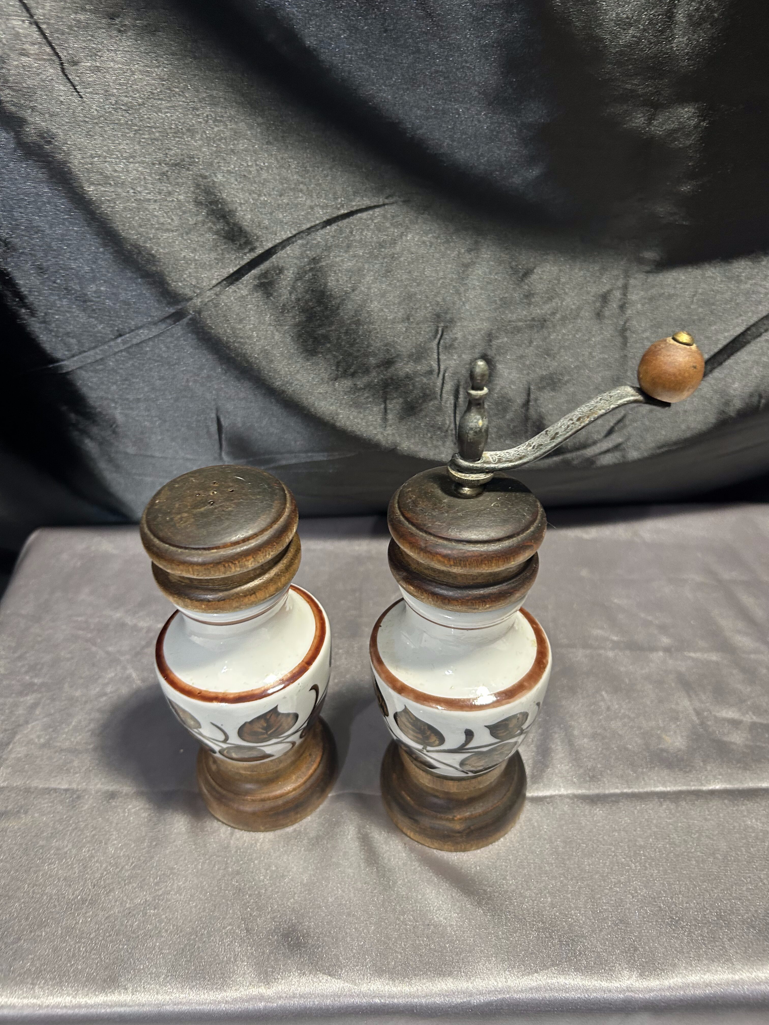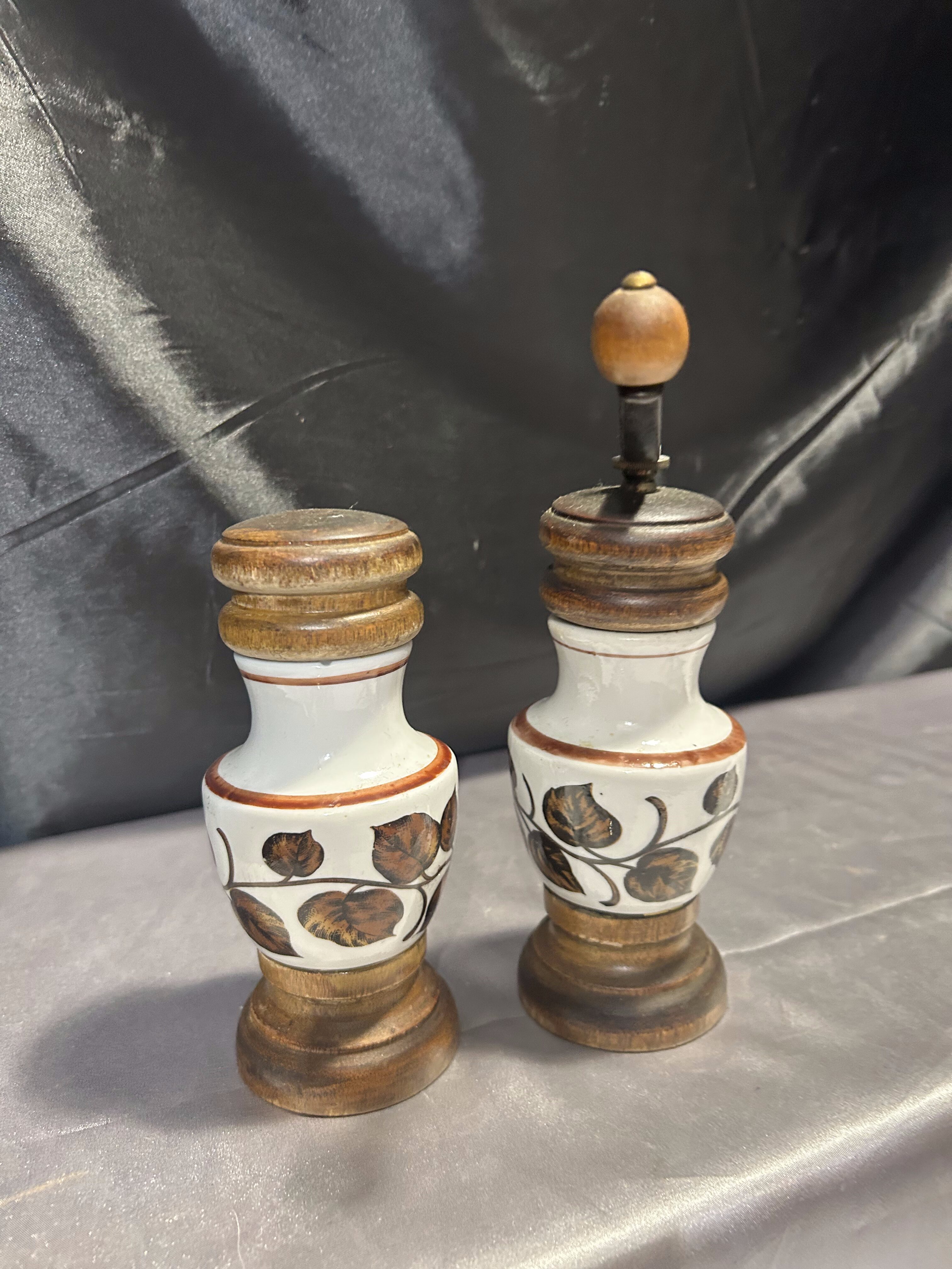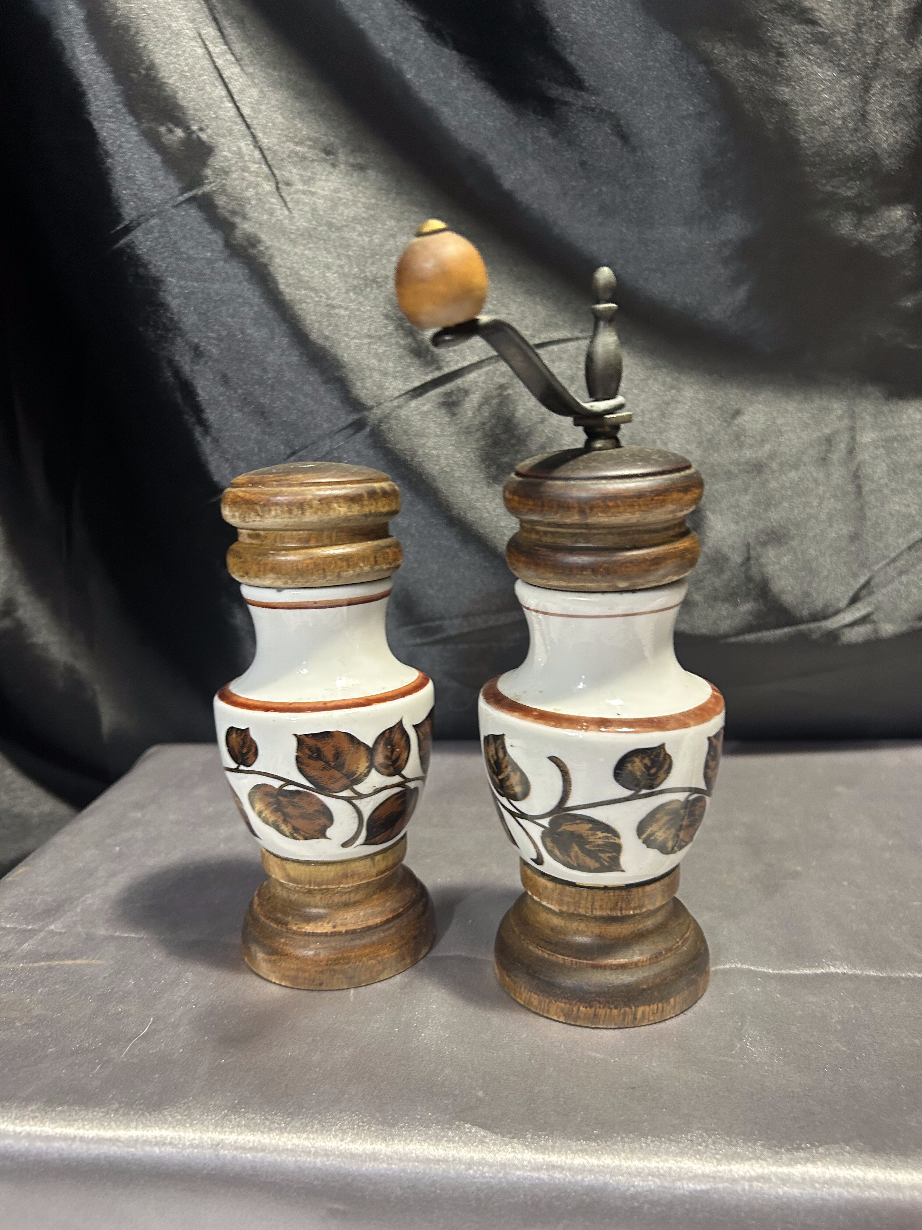 Solniczka i pieprzniczka – Drewniano-ceramiczny zestaw z młynkiem – Ręcznie malowany