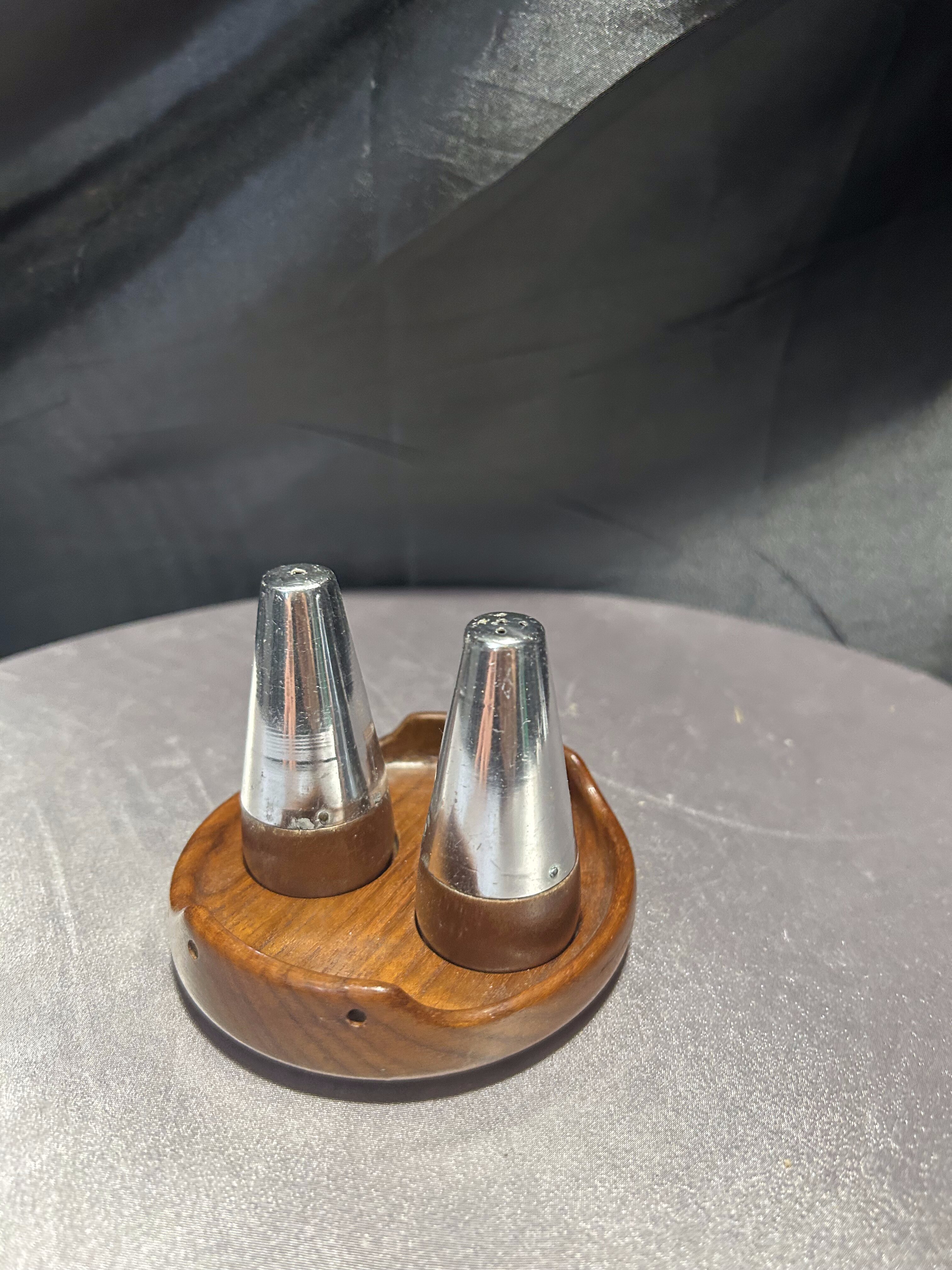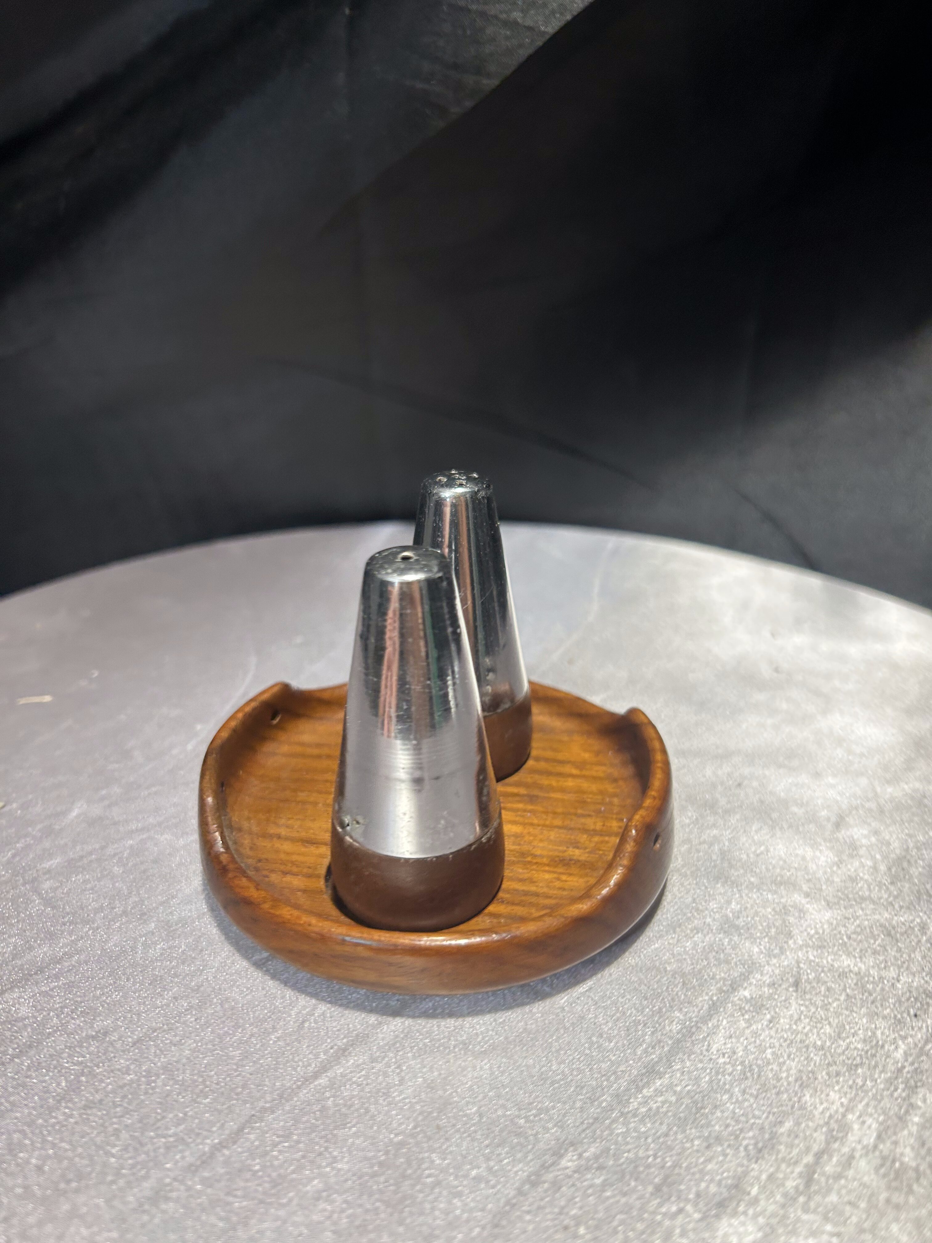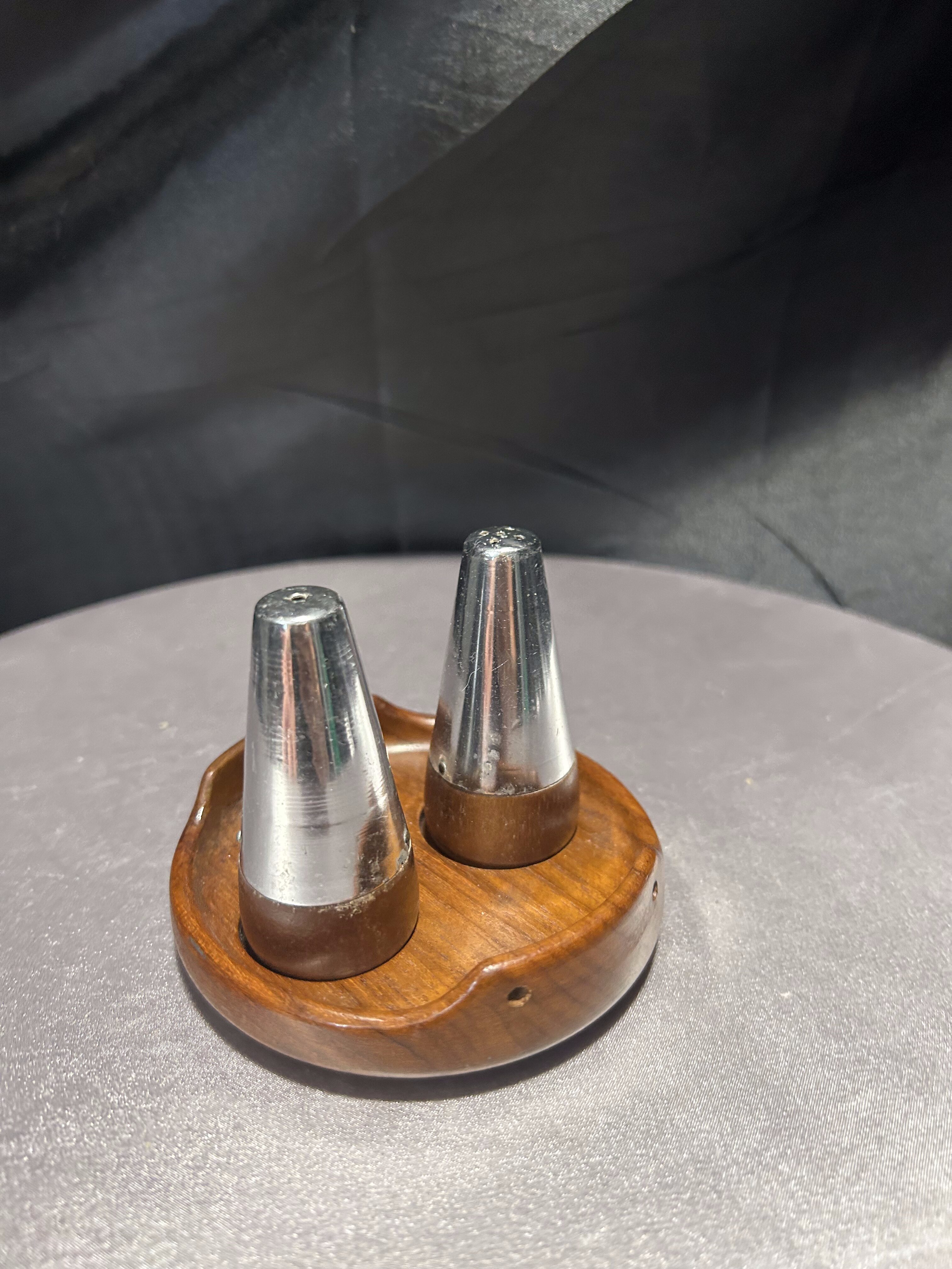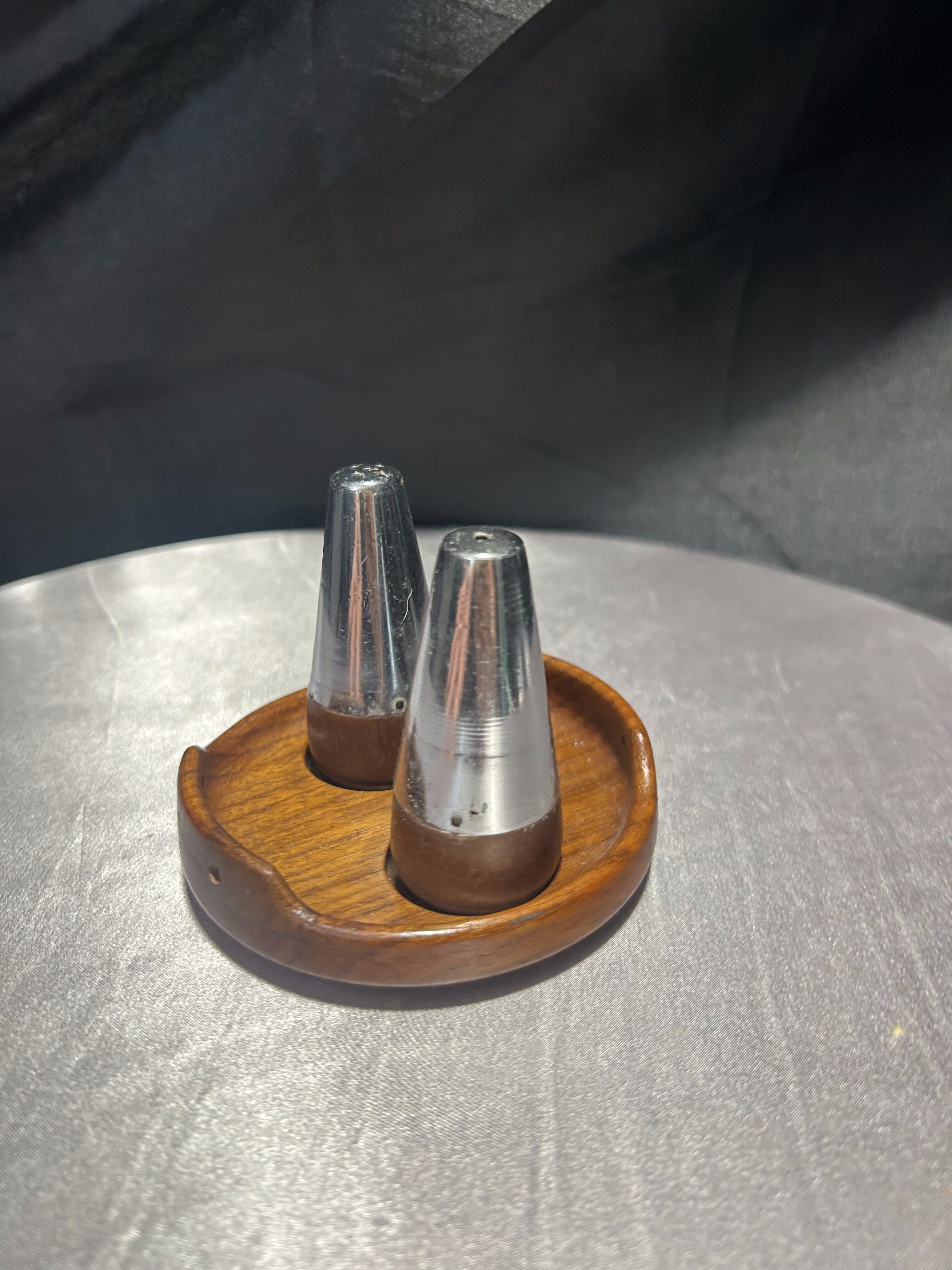 - Solniczka i pieprzniczka – metal i drewno – komplet z podstawką
