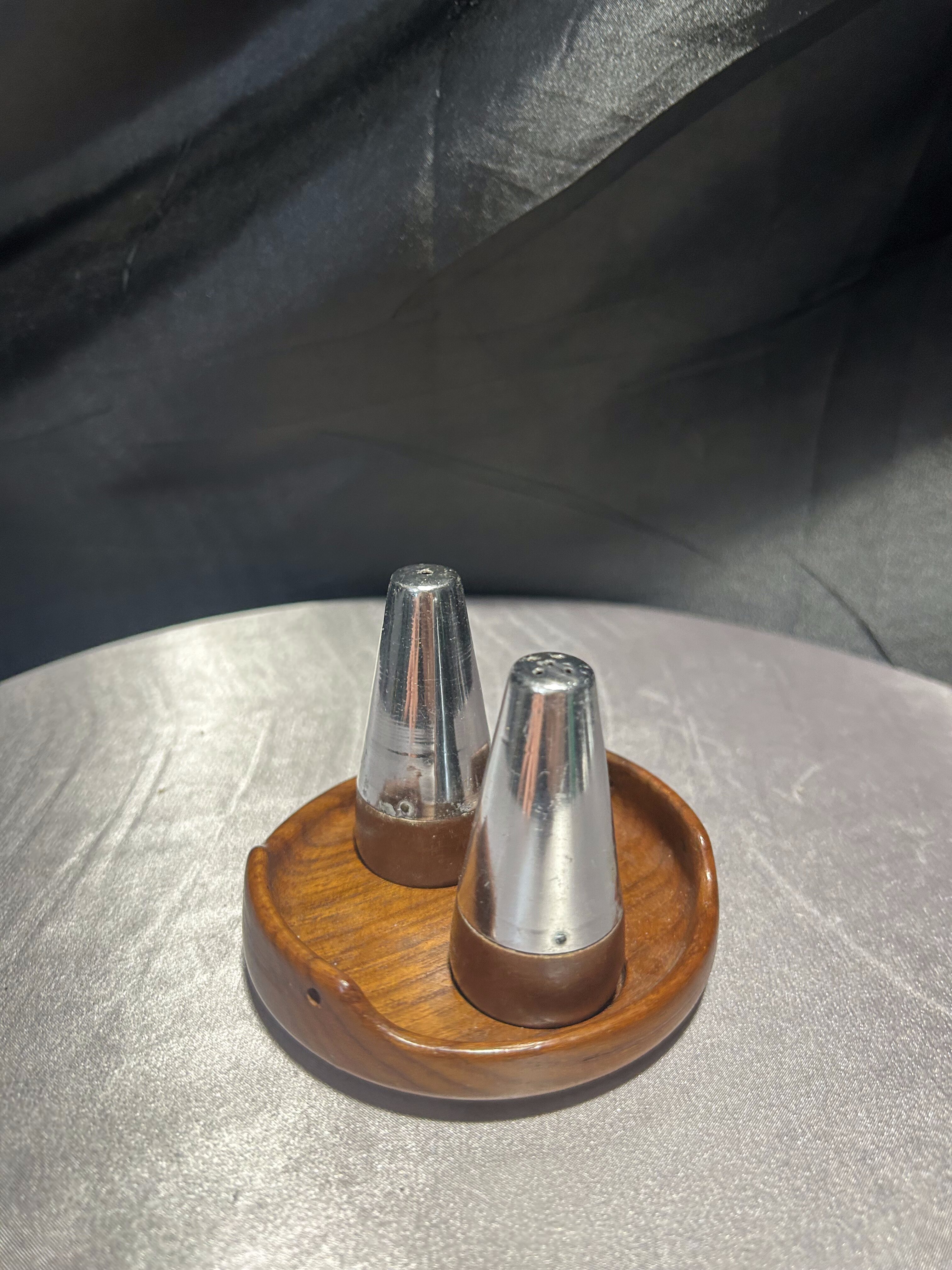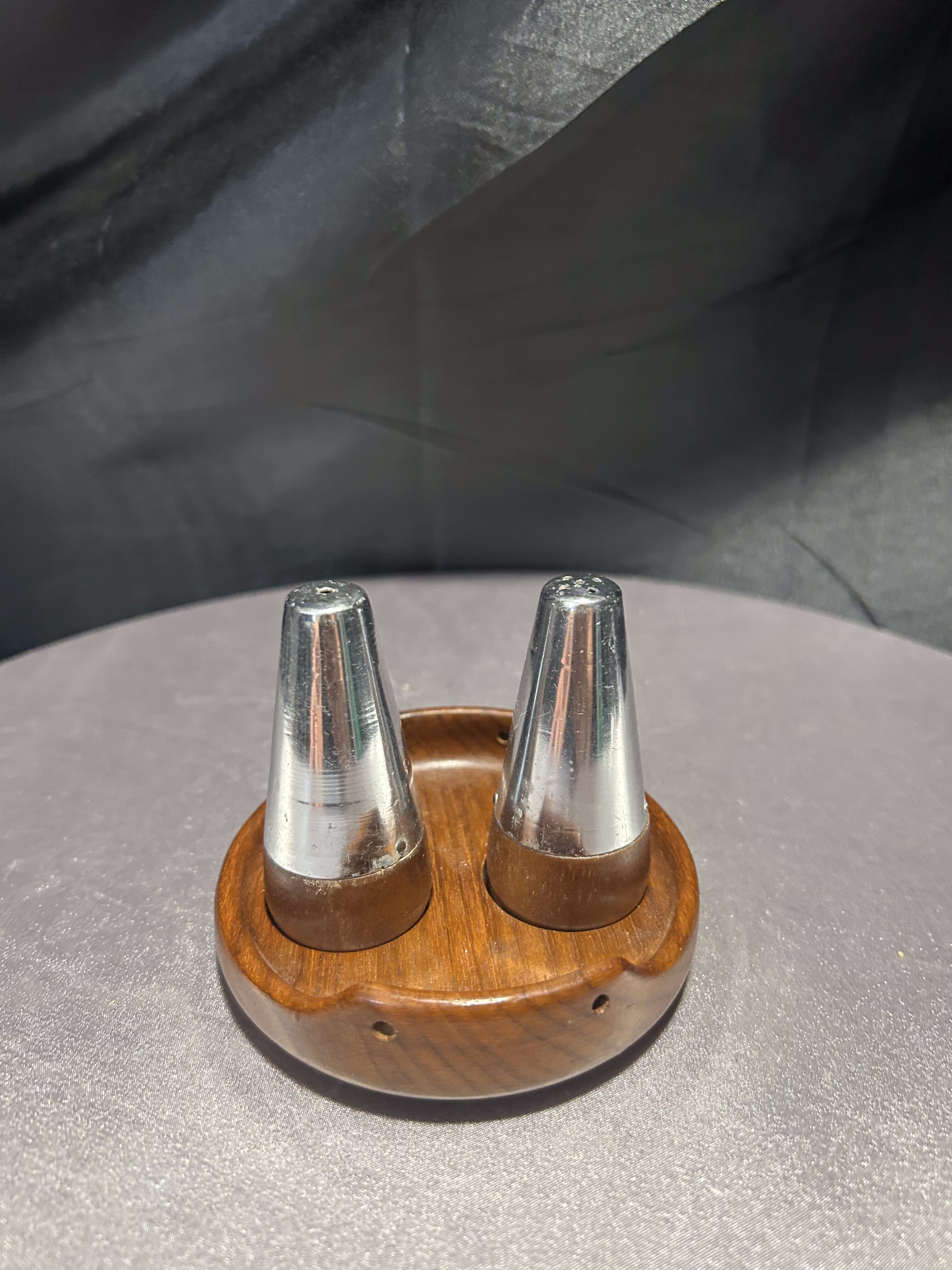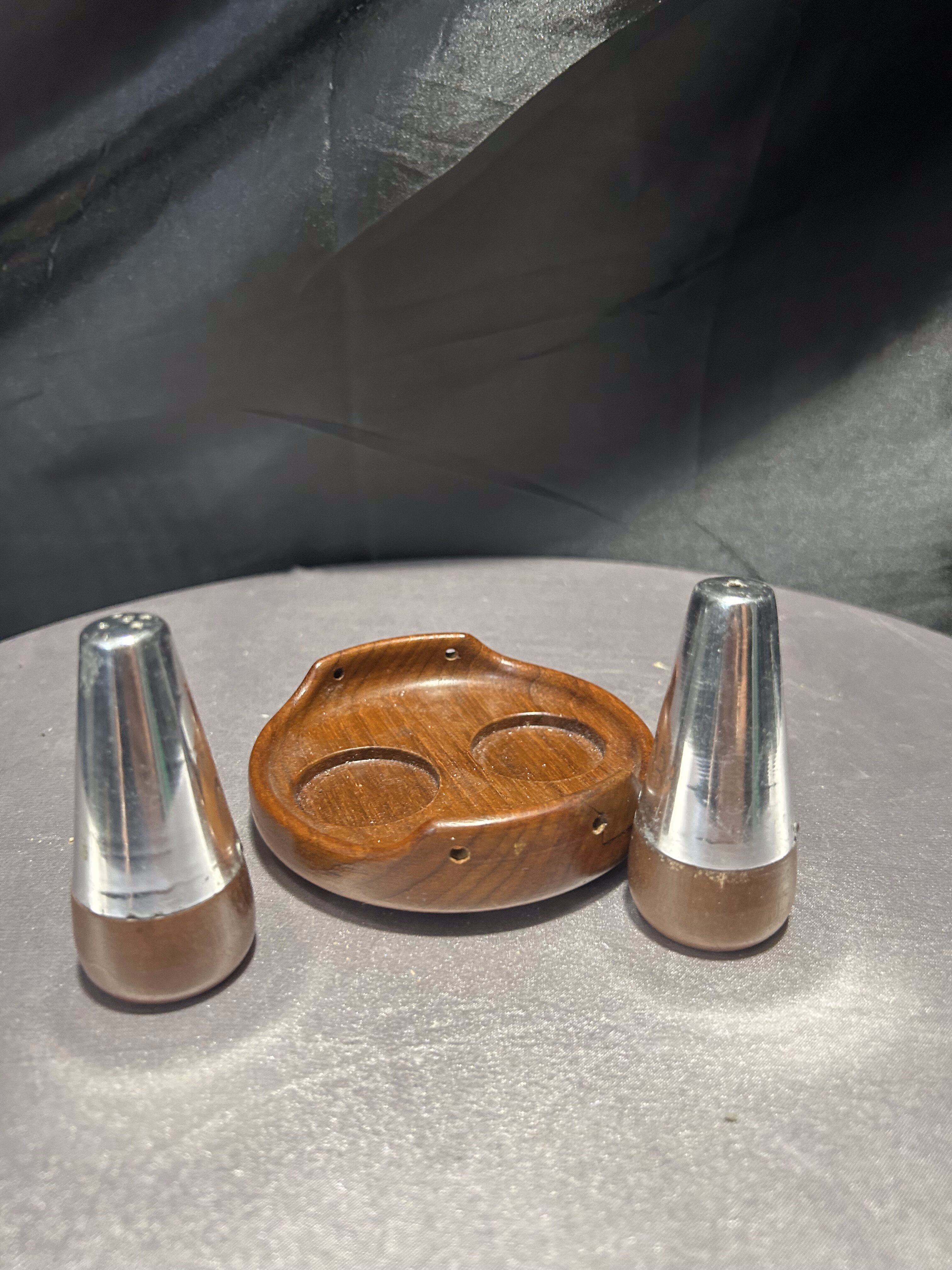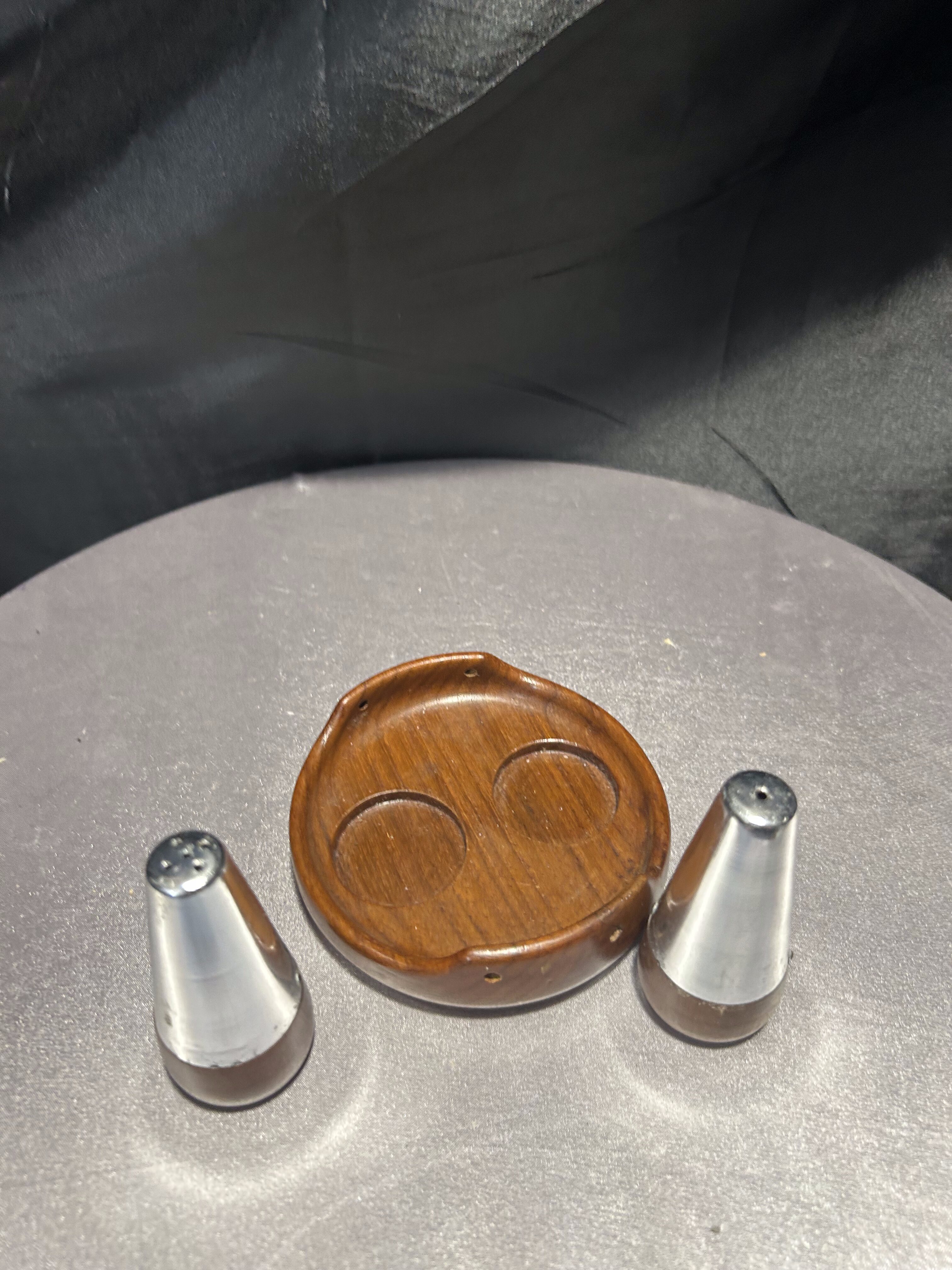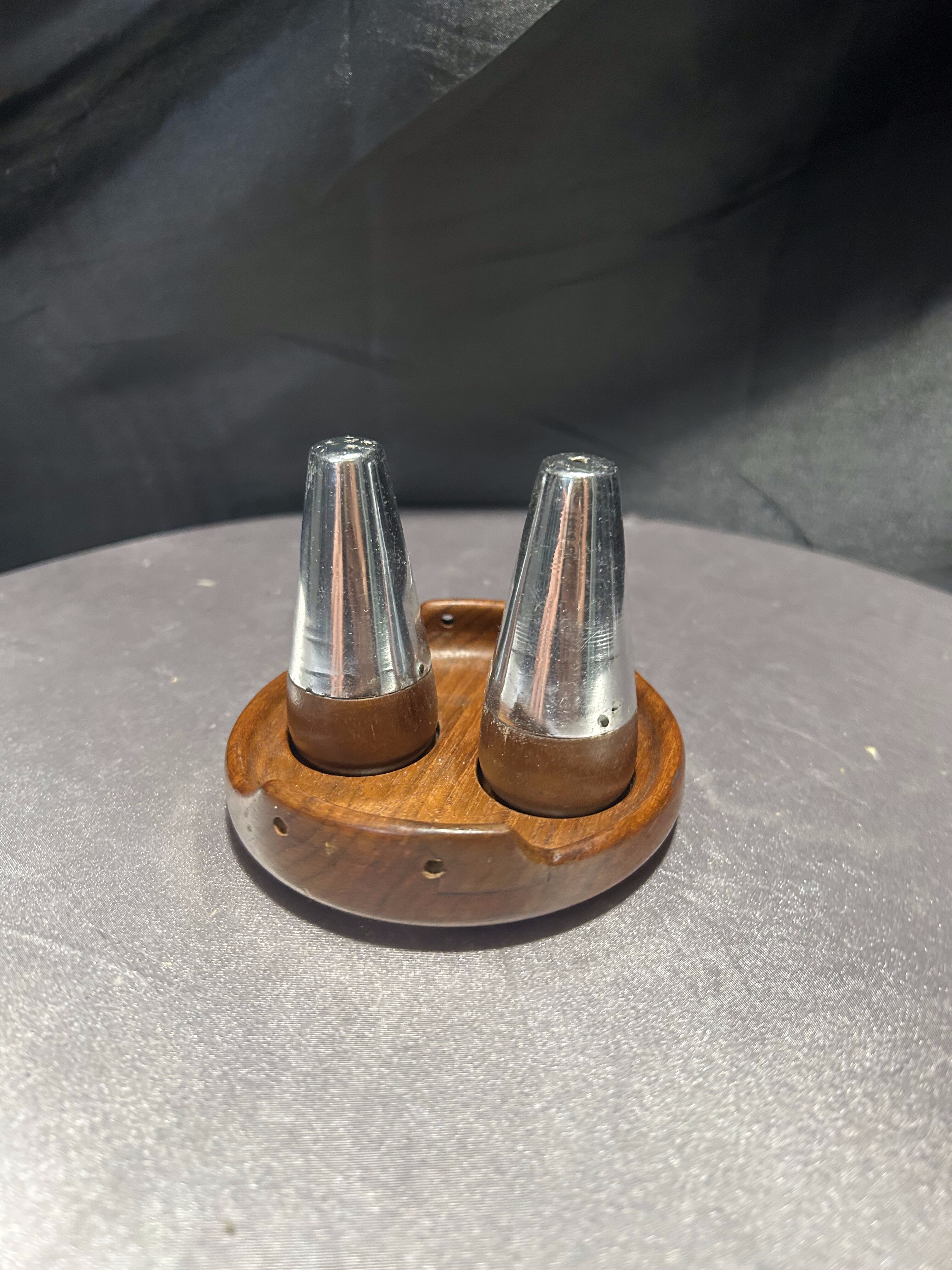 - Solniczka i pieprzniczka – metal i drewno – komplet z podstawką
