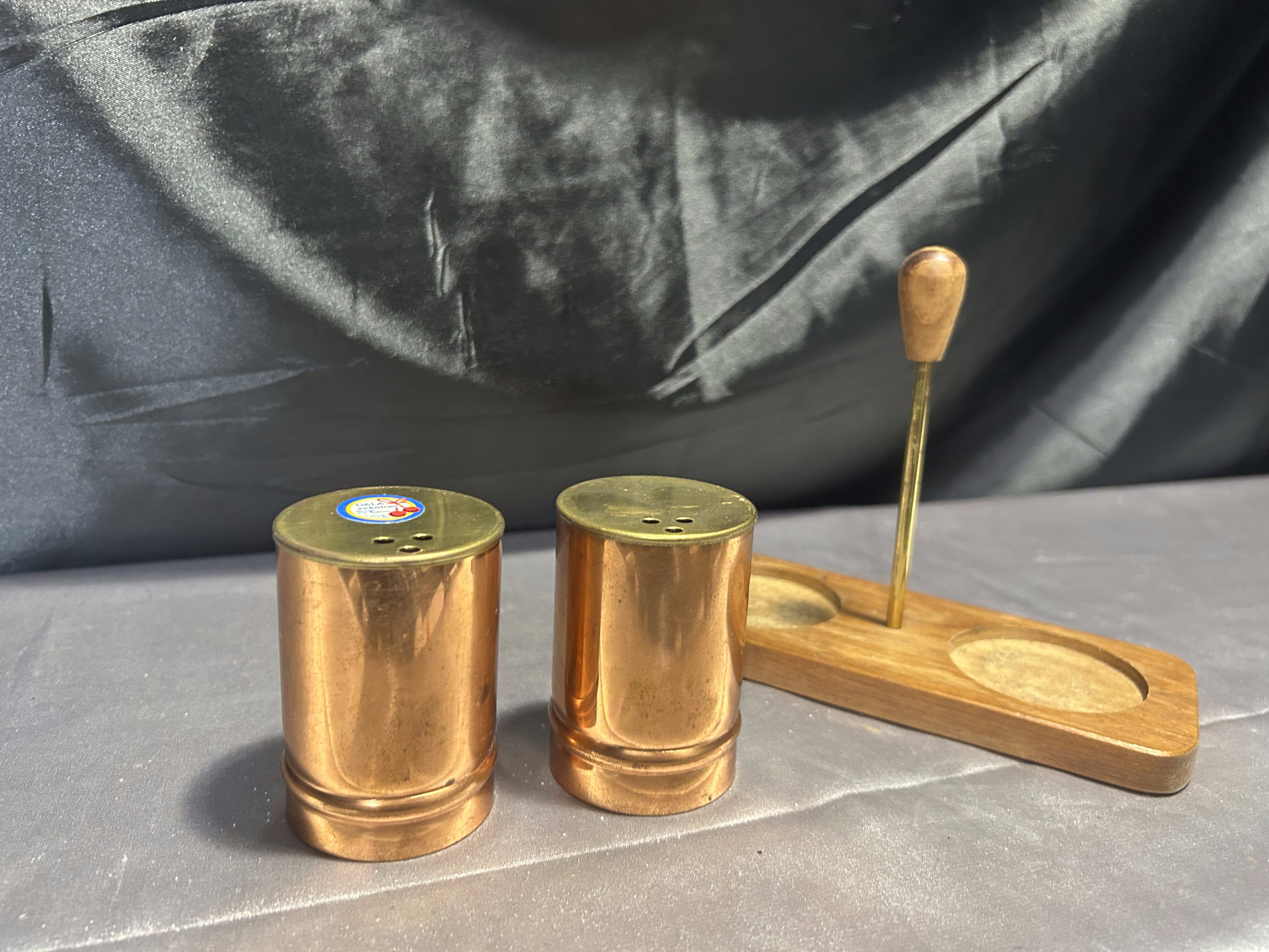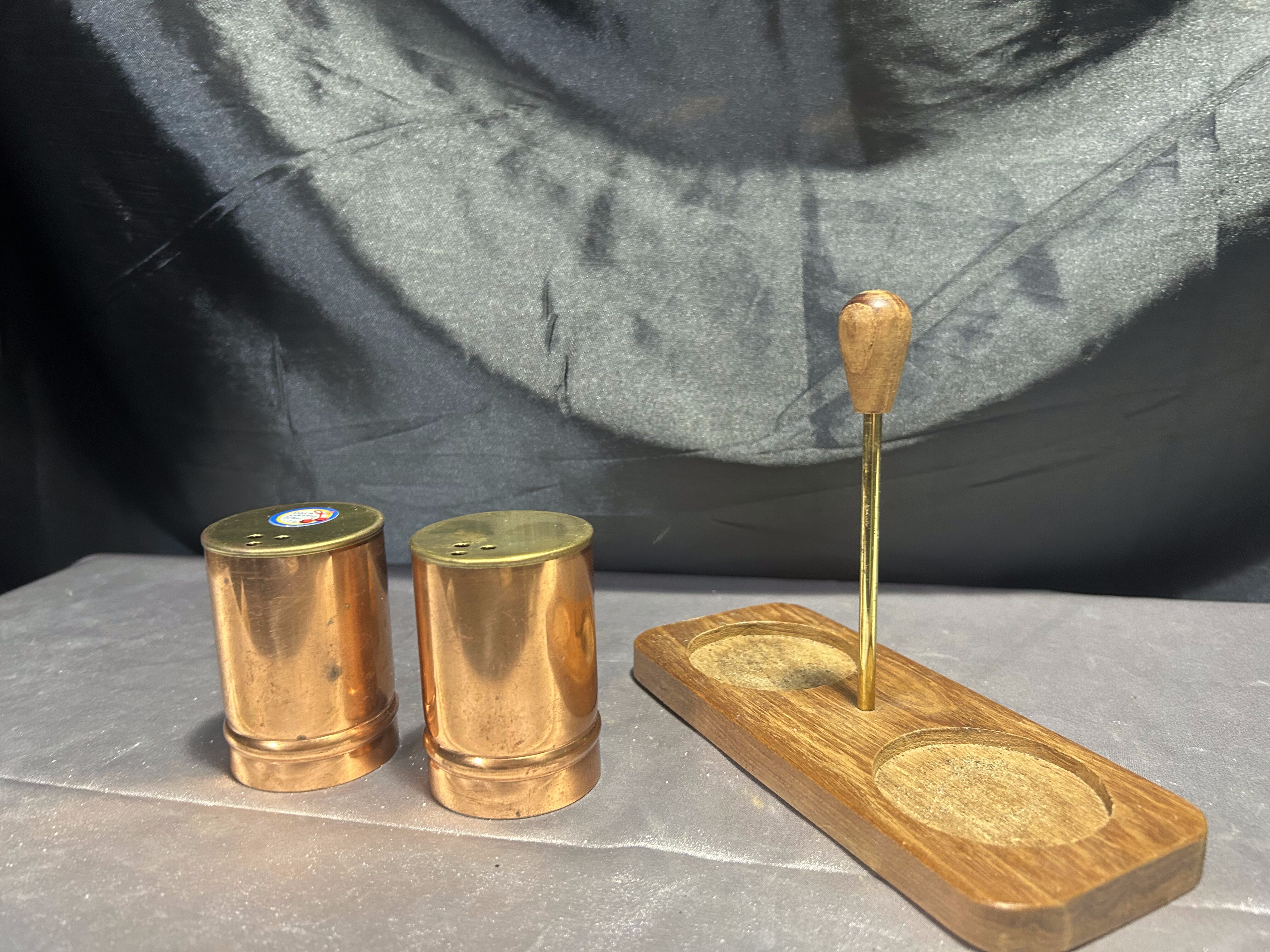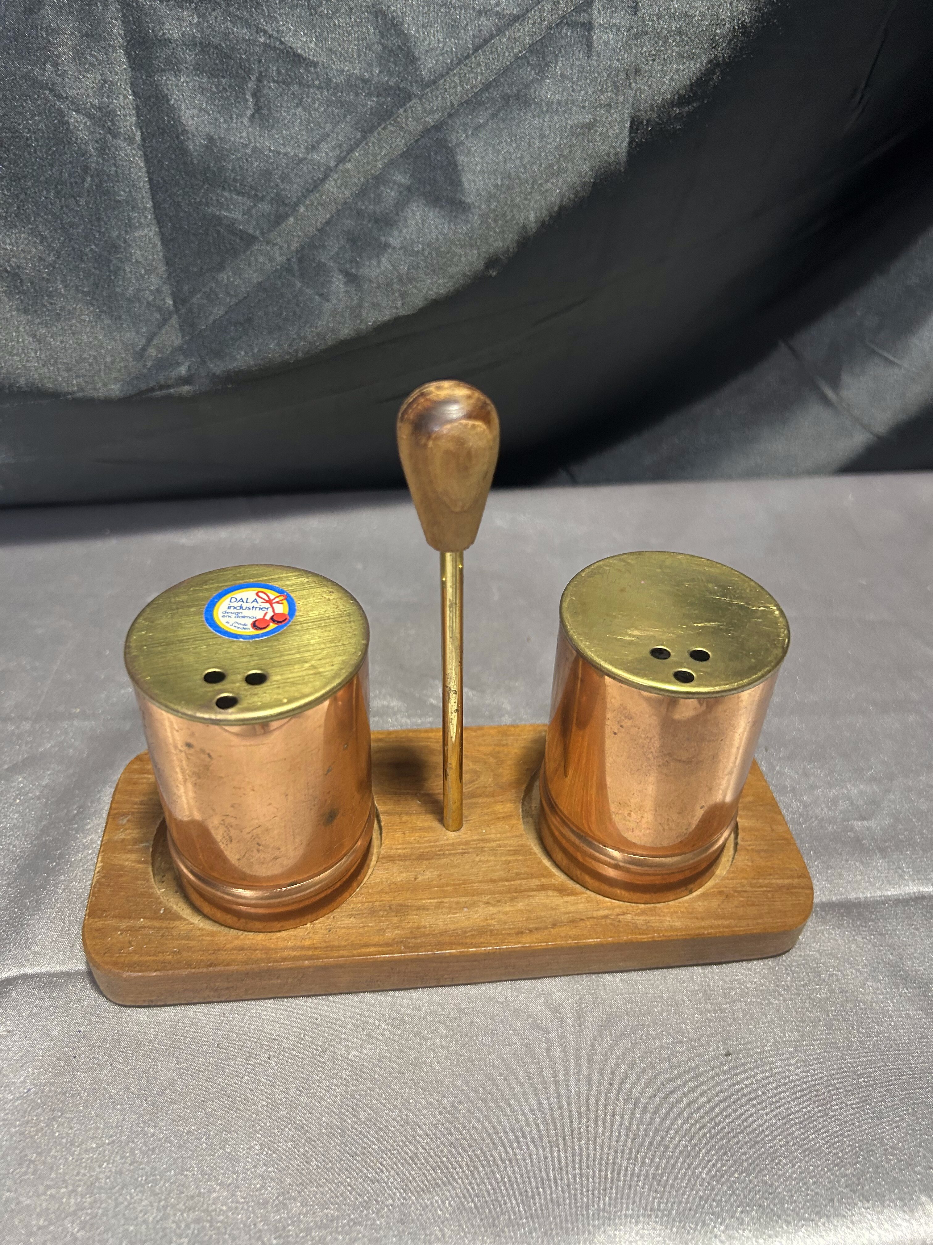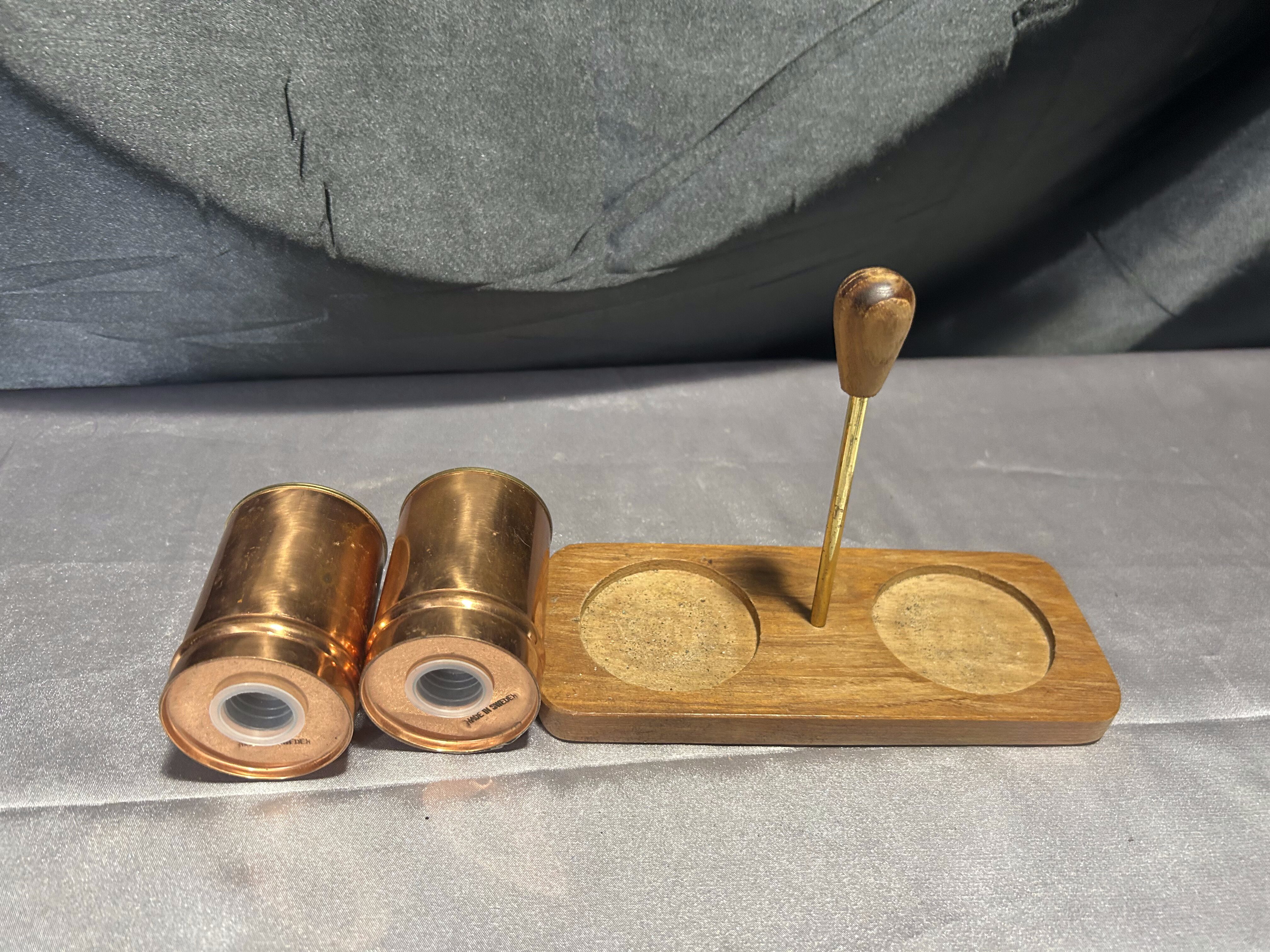 - Solniczka i pieprzniczka – Miedziane na drewnianej podstawie – Made in Sweden
