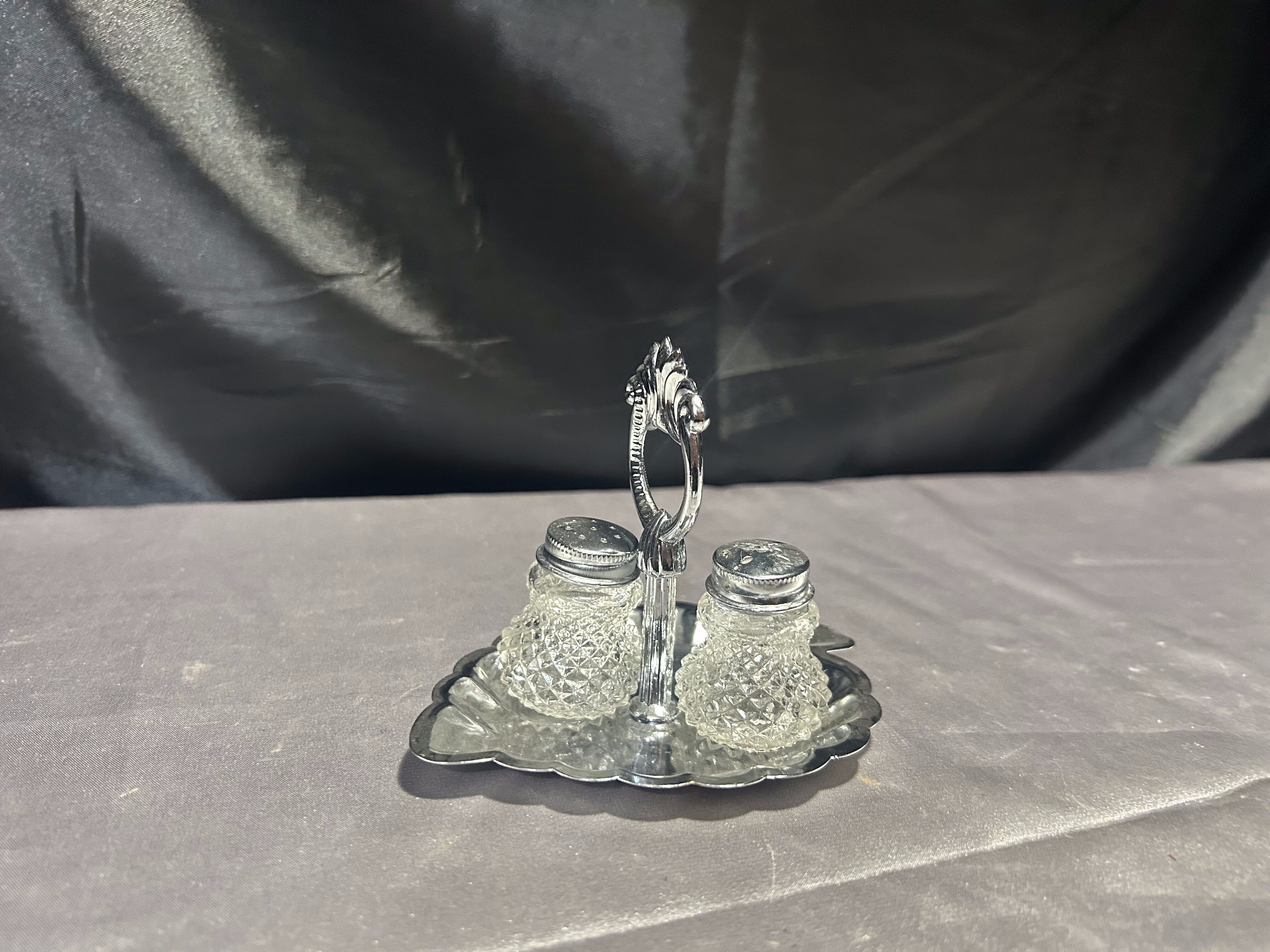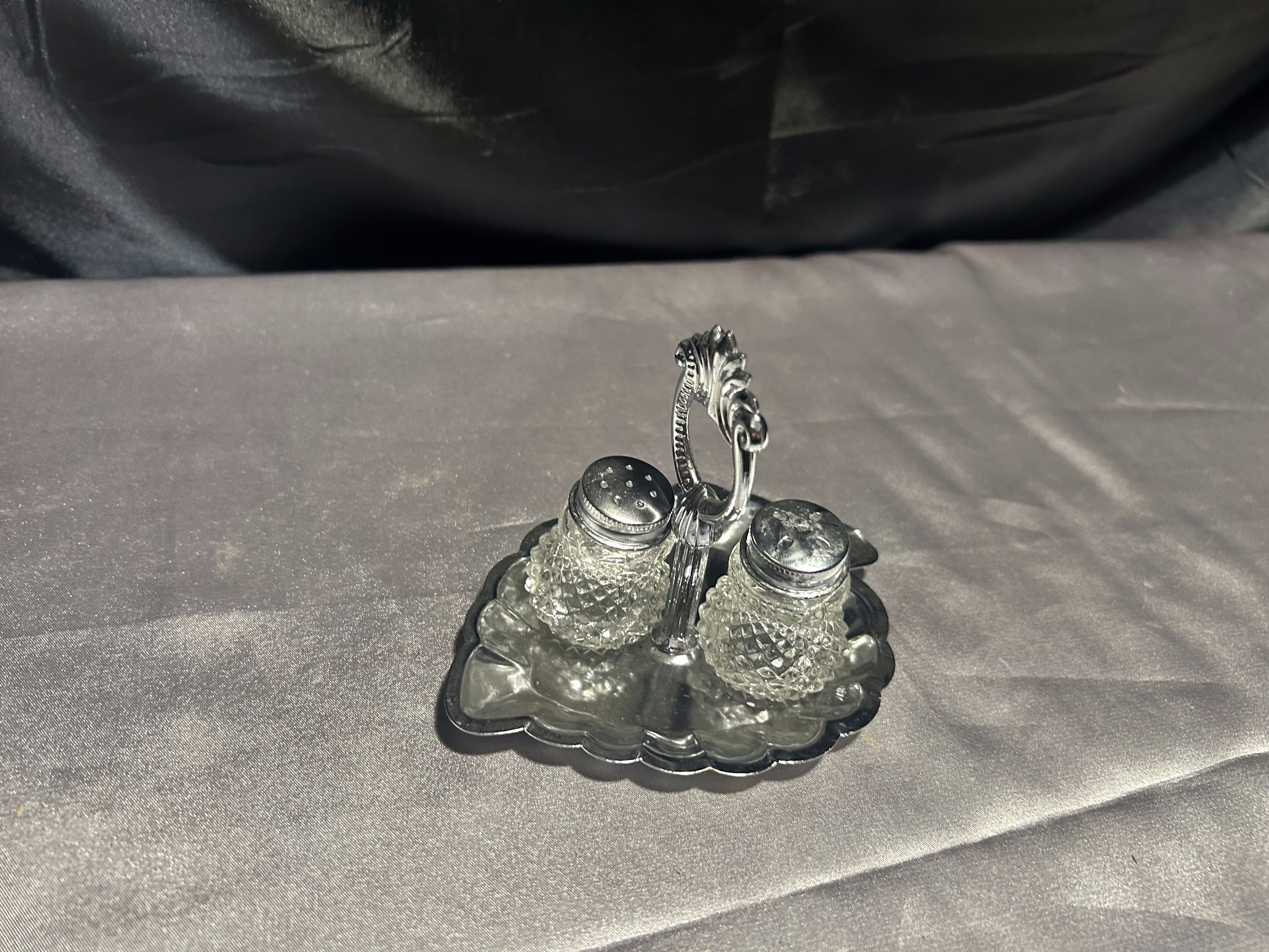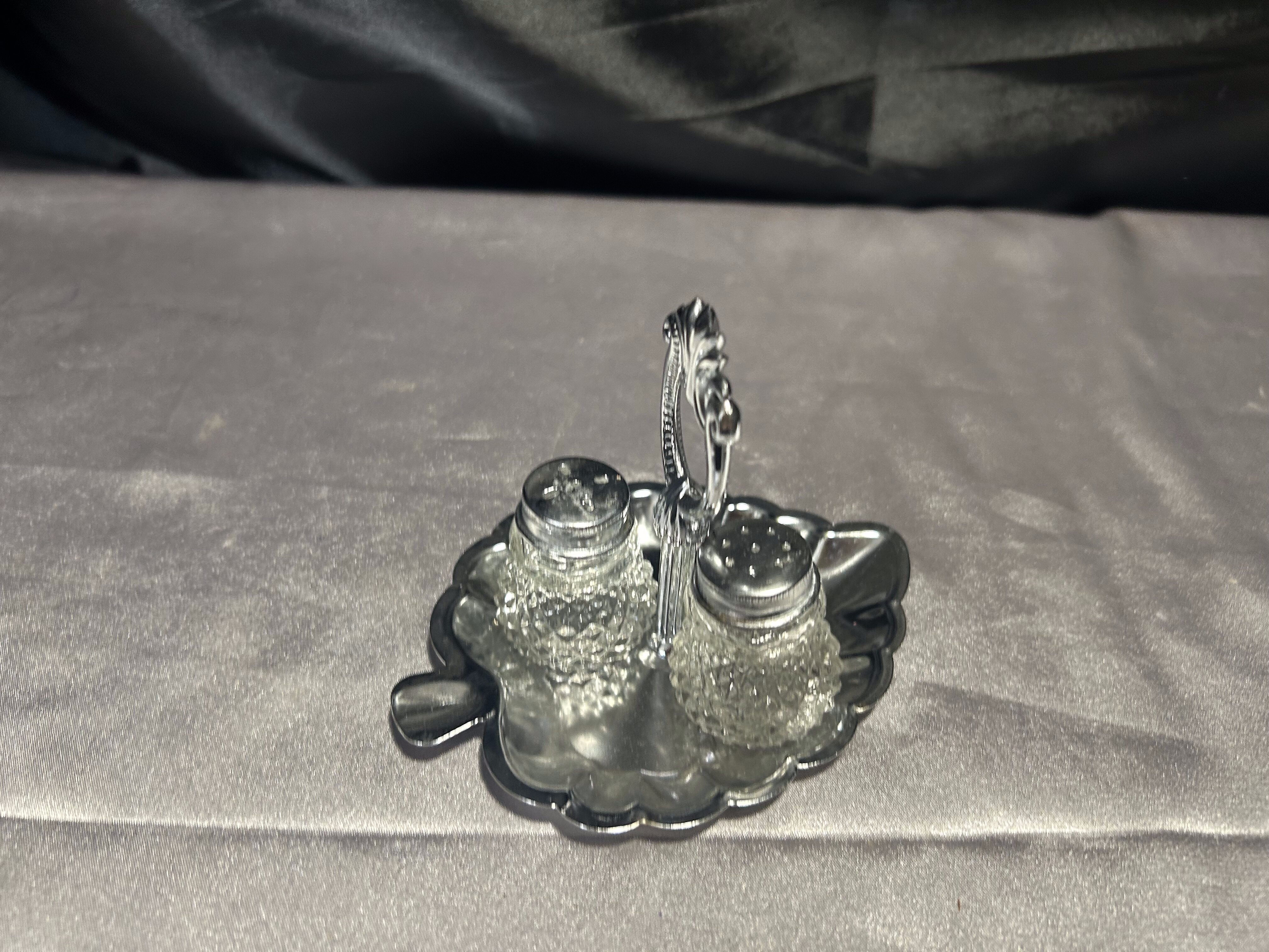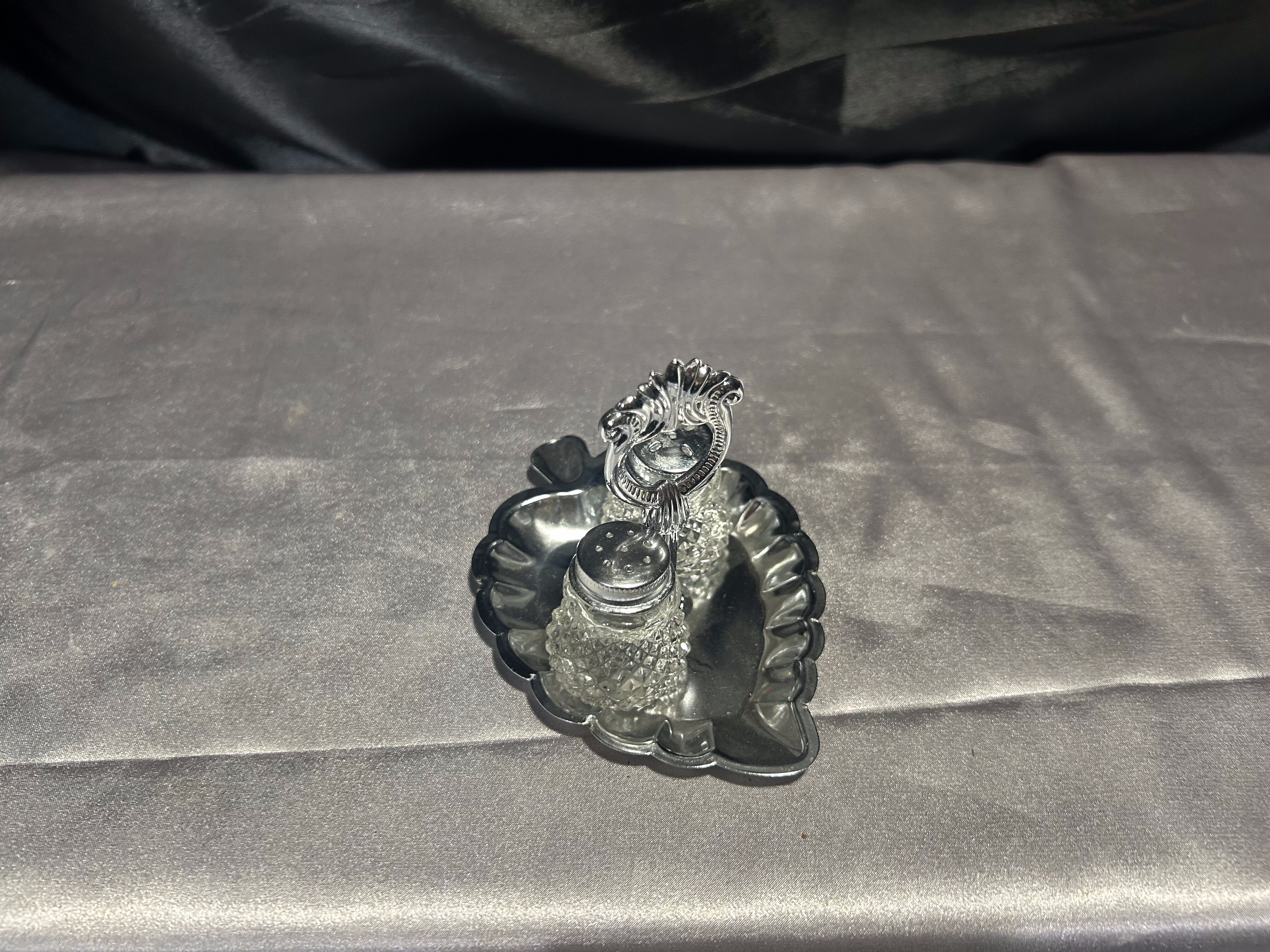 Solniczka i pieprzniczka – na talerzyku w kształcie liścia – srebrny kolor