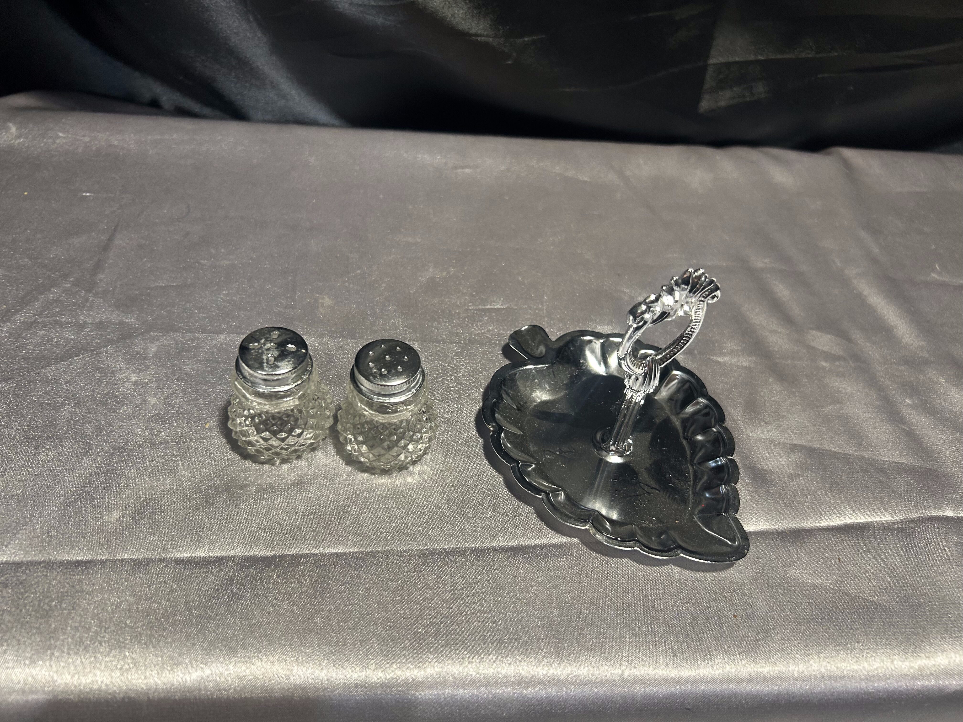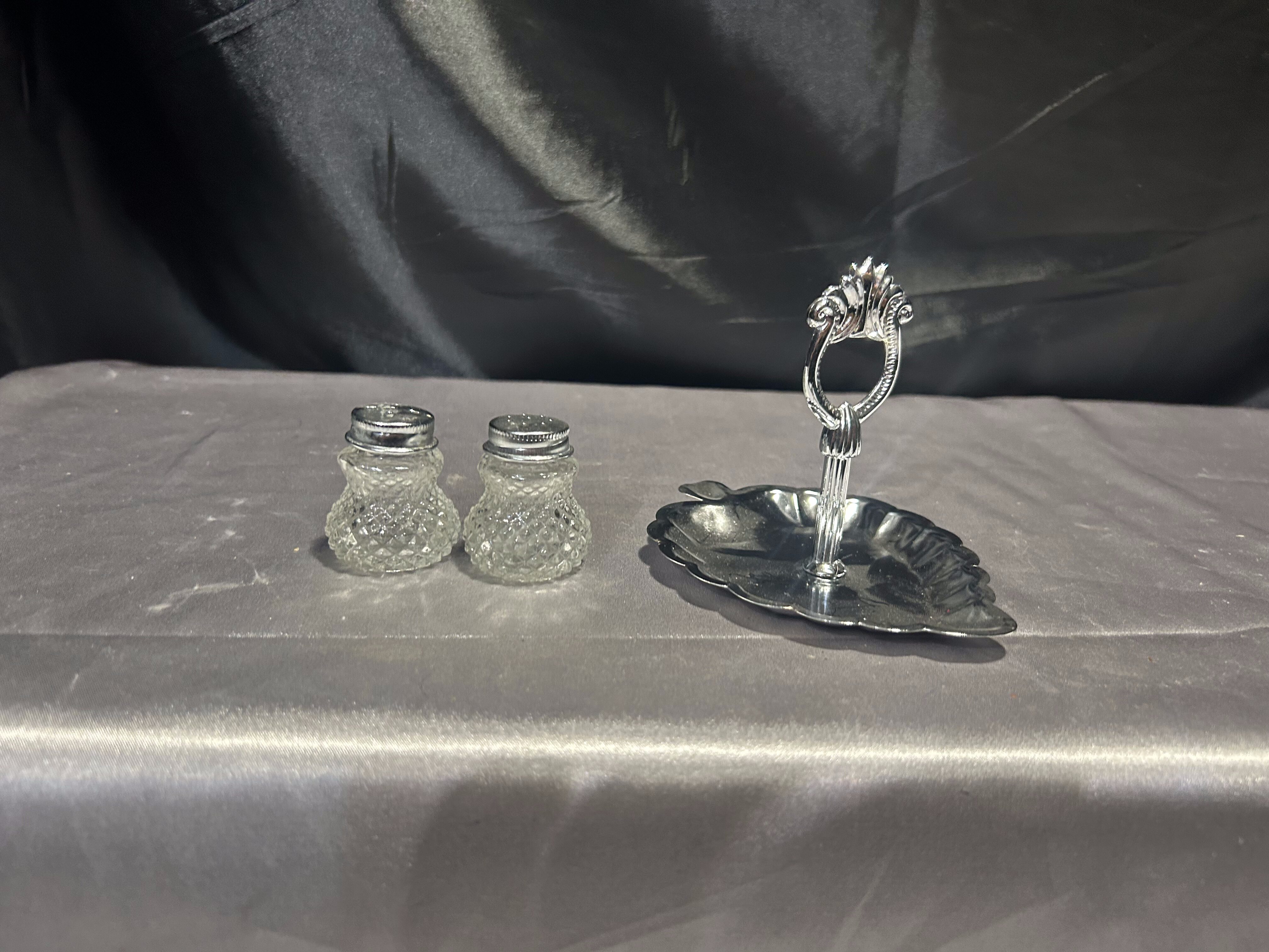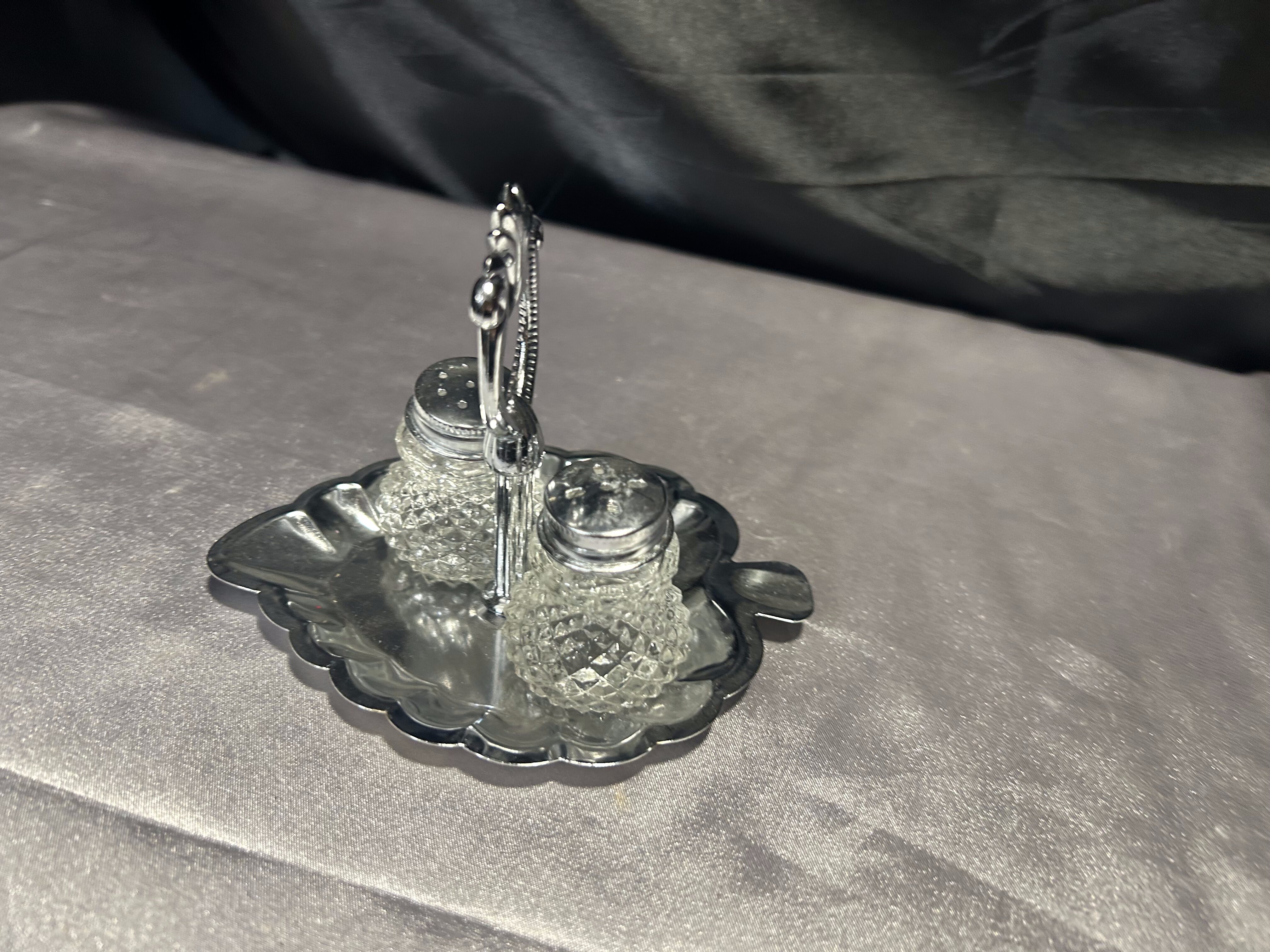 - Solniczka i pieprzniczka – na talerzyku w kształcie liścia – srebrny kolor