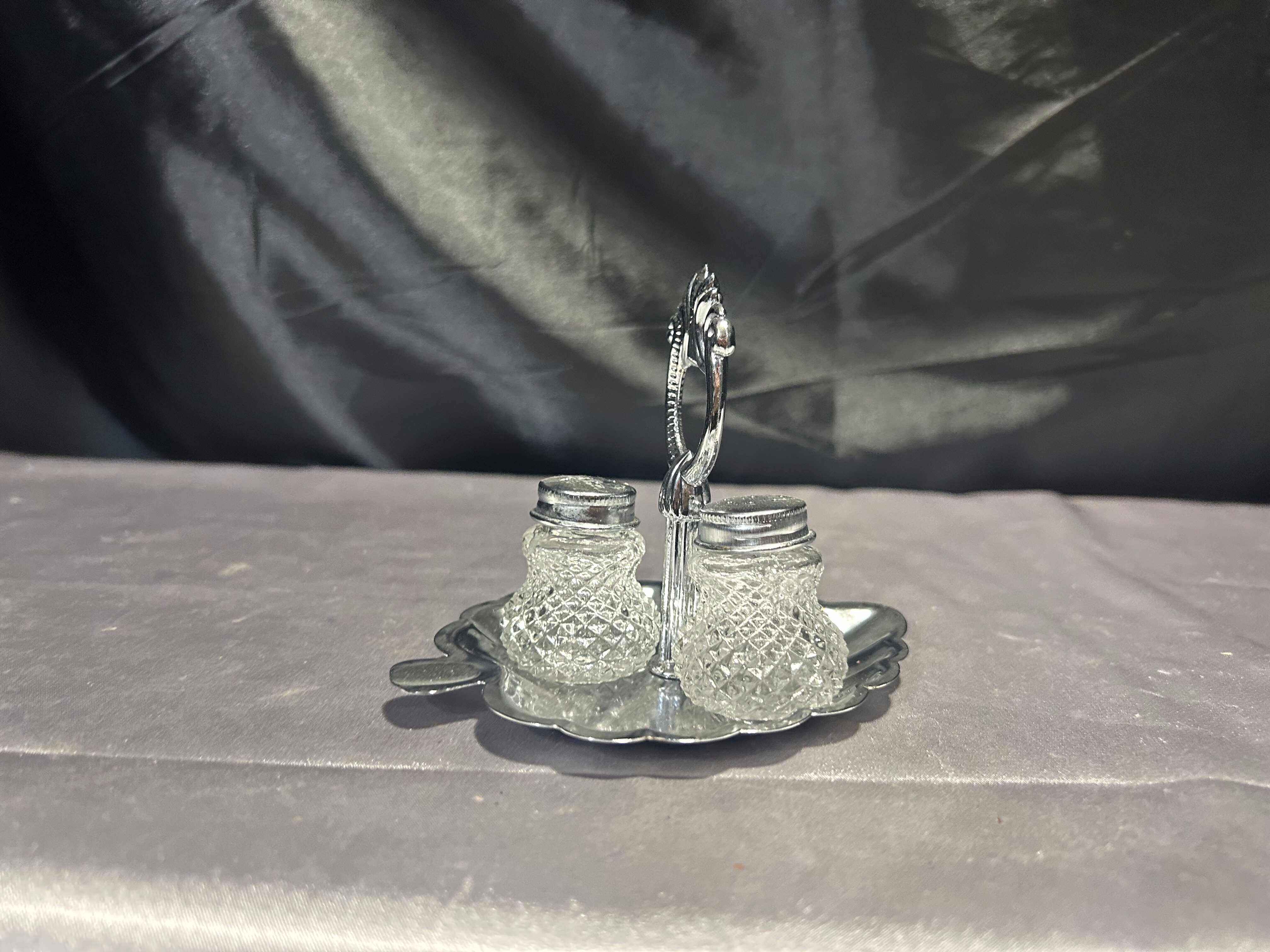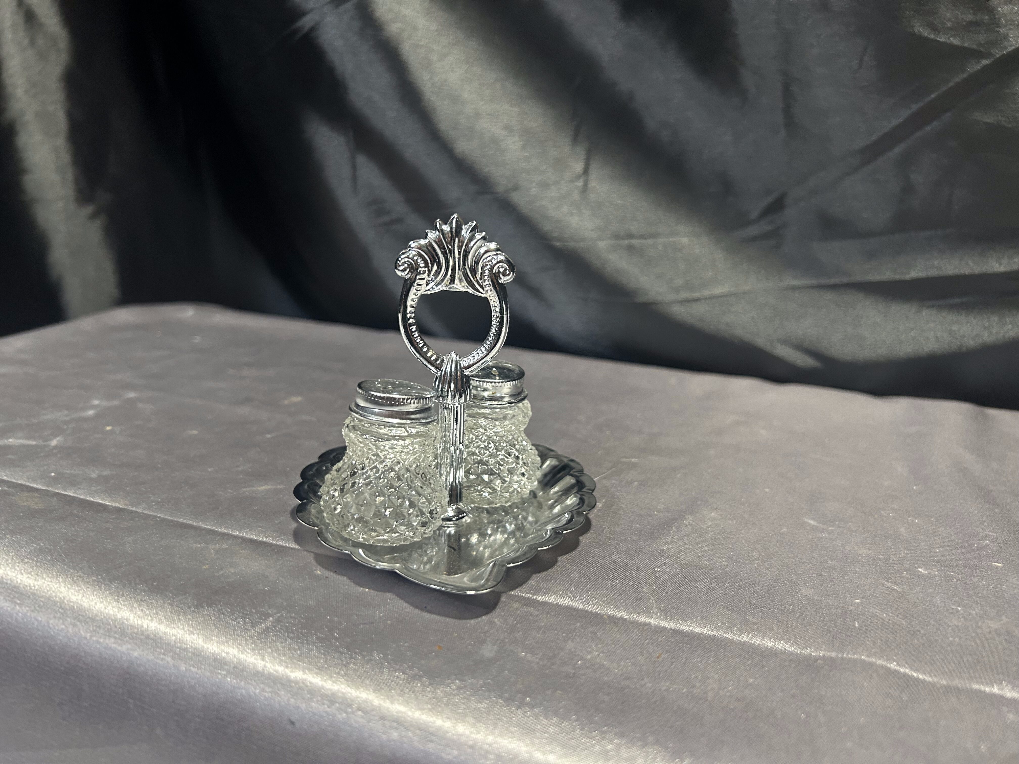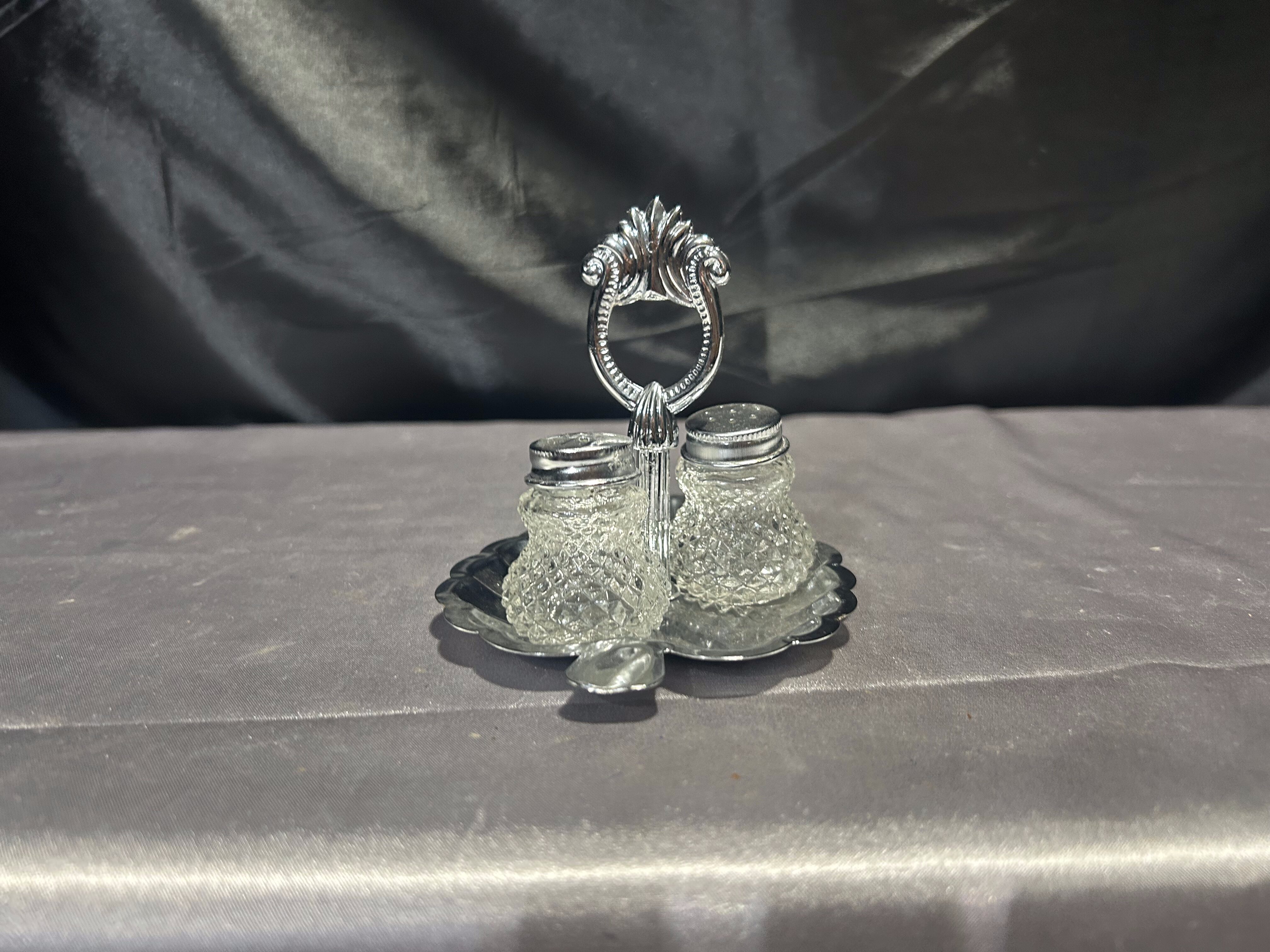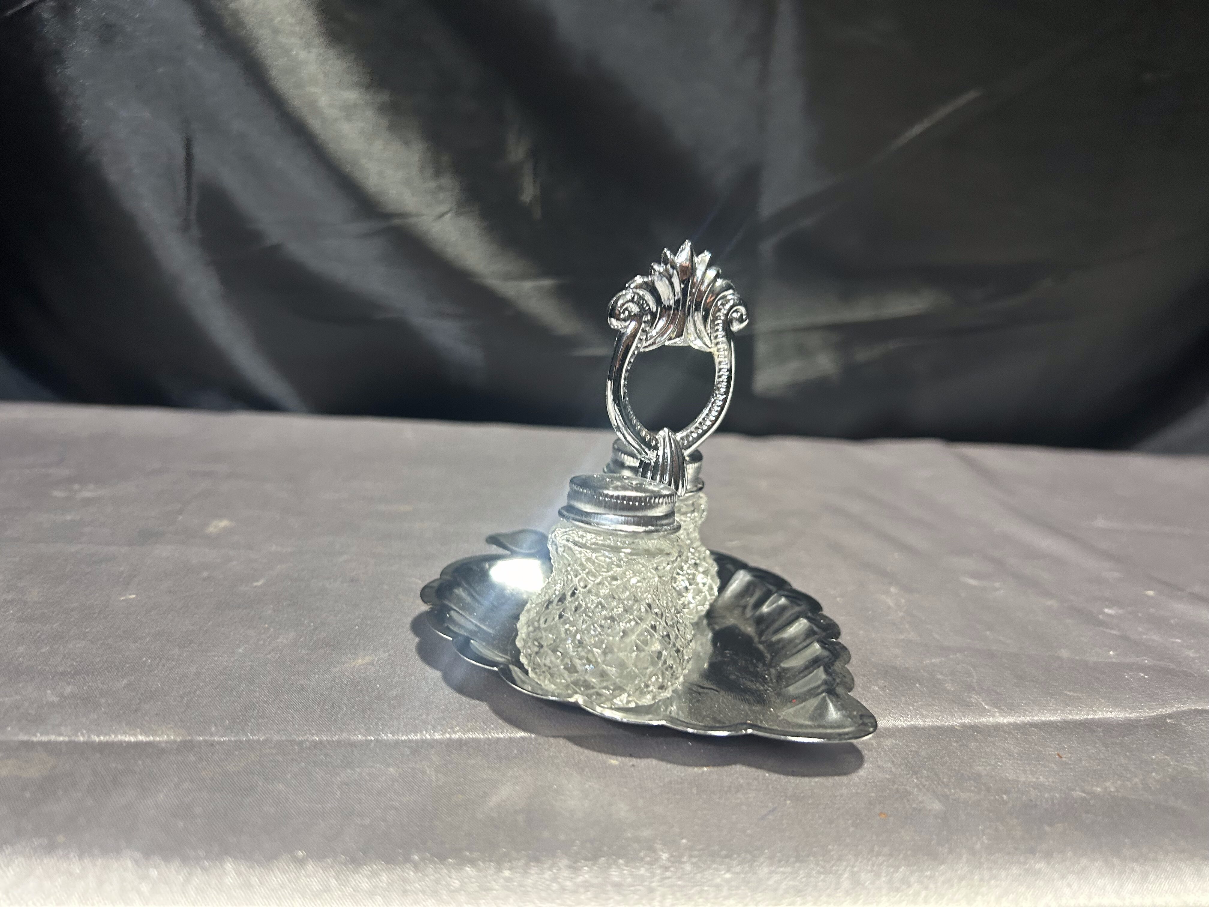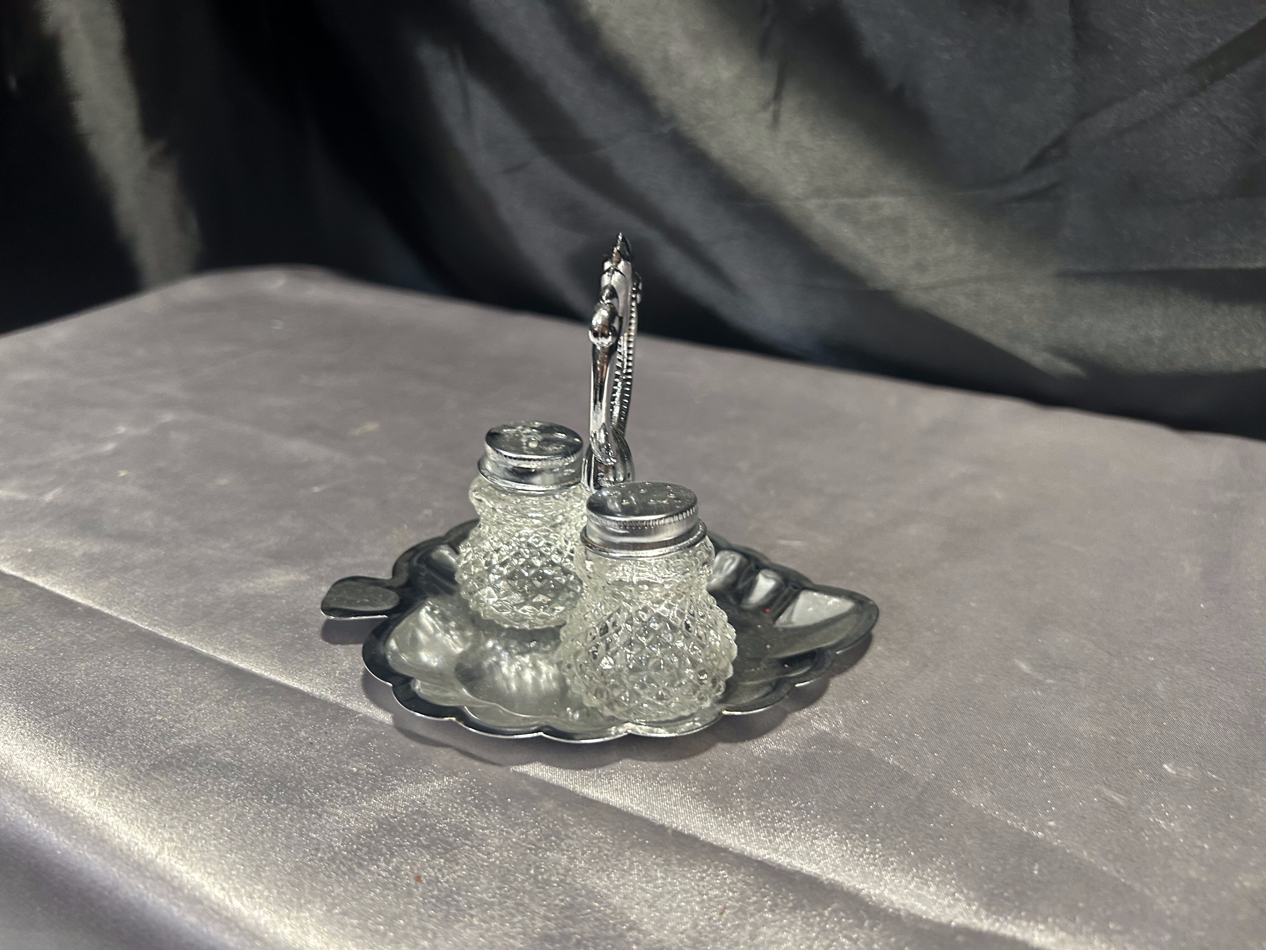 Elegancki zestaw składający się z dwóch szklanych pojemników na sól i pieprz, umieszczonych na dekoracyjnym talerzyku w kształcie liścia. Talerzyk w odcieniu srebra, wyposażony w ozdobny uchwyt do przenoszenia, doskonale sprawdzi się zarówno jako funkcjonalny dodatek na stół, jak i element dekoracyjny w stylowej kuchni czy jadalni.