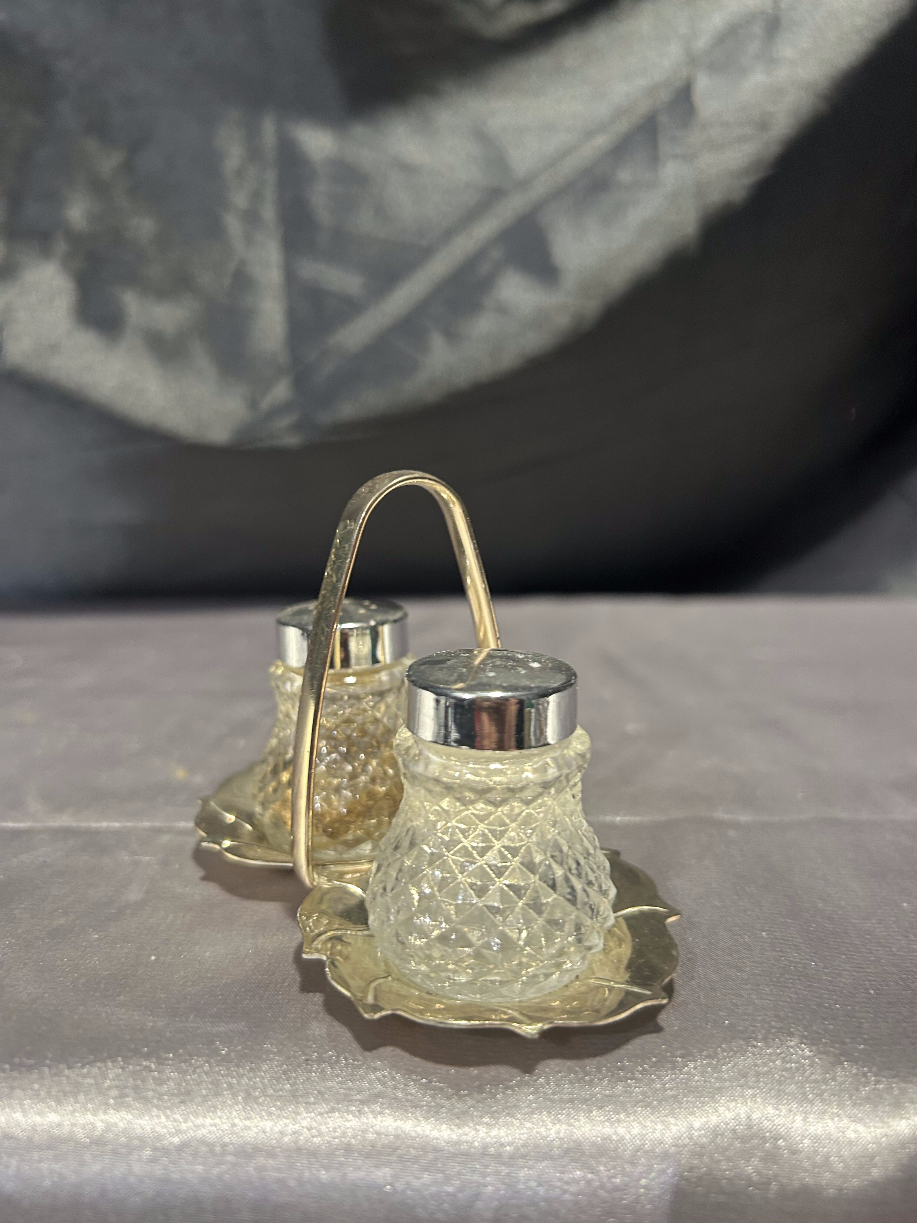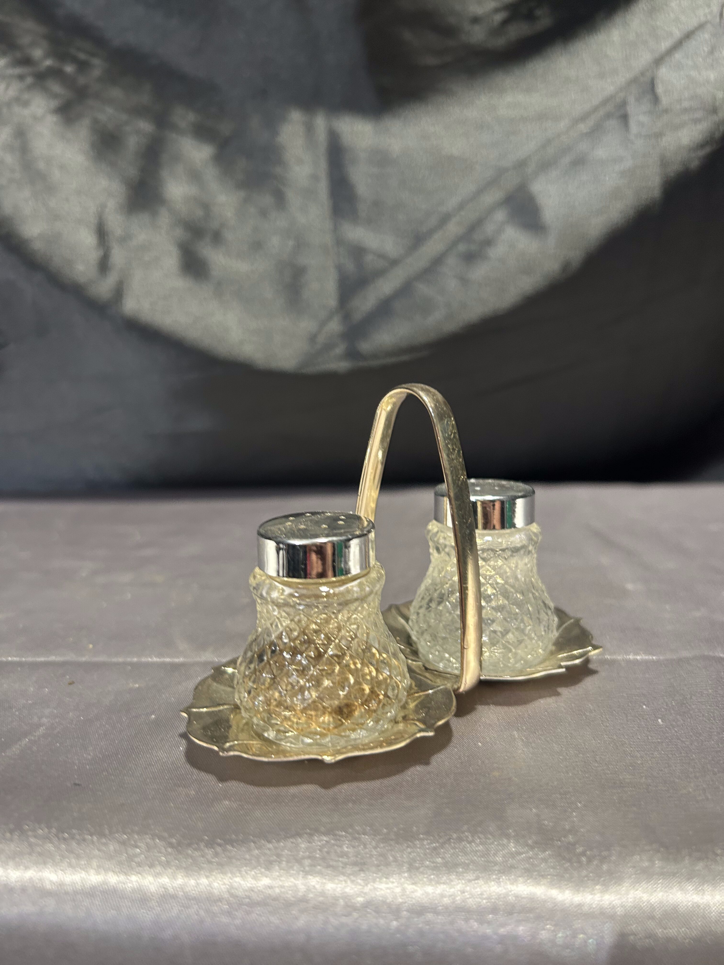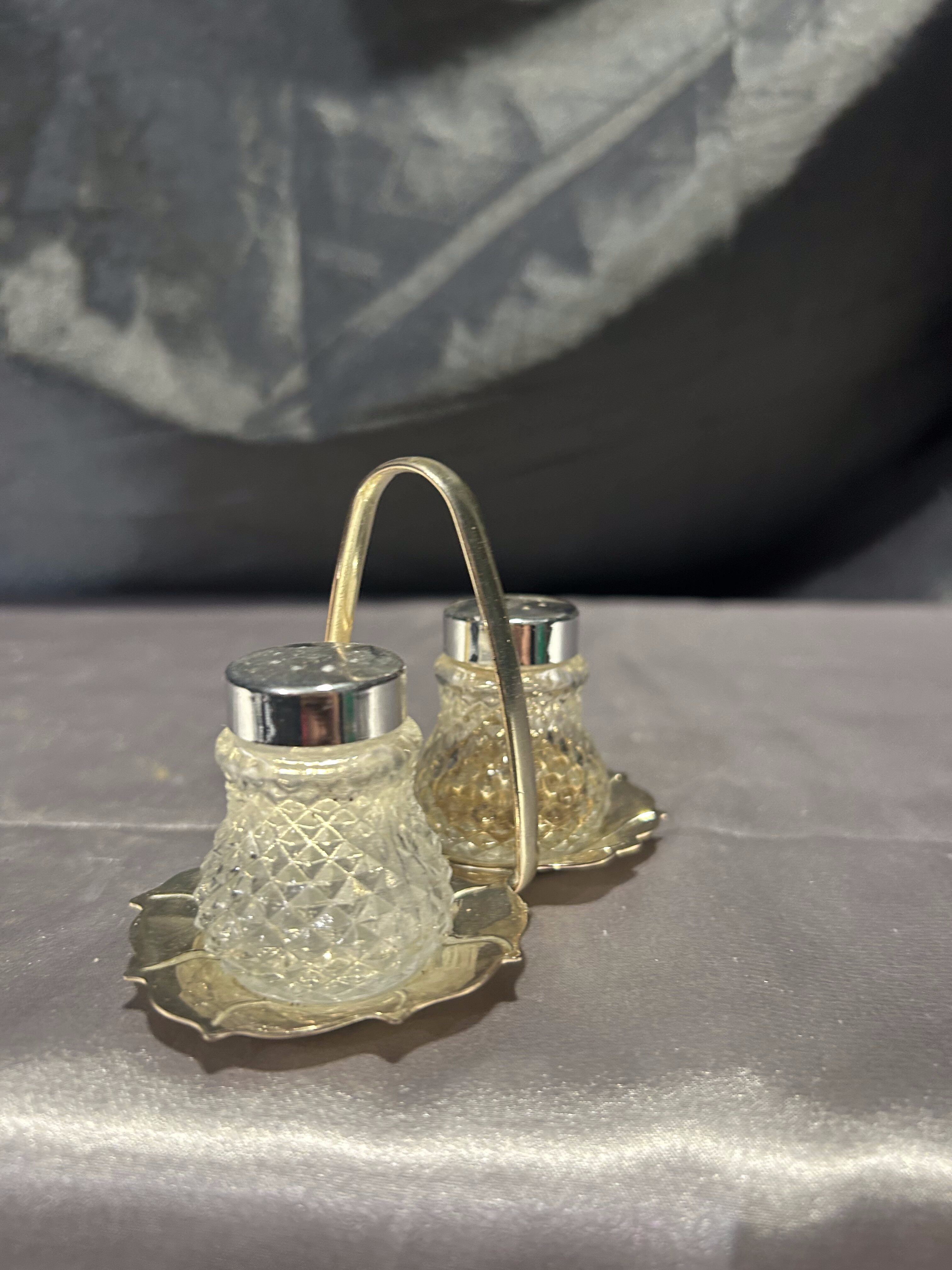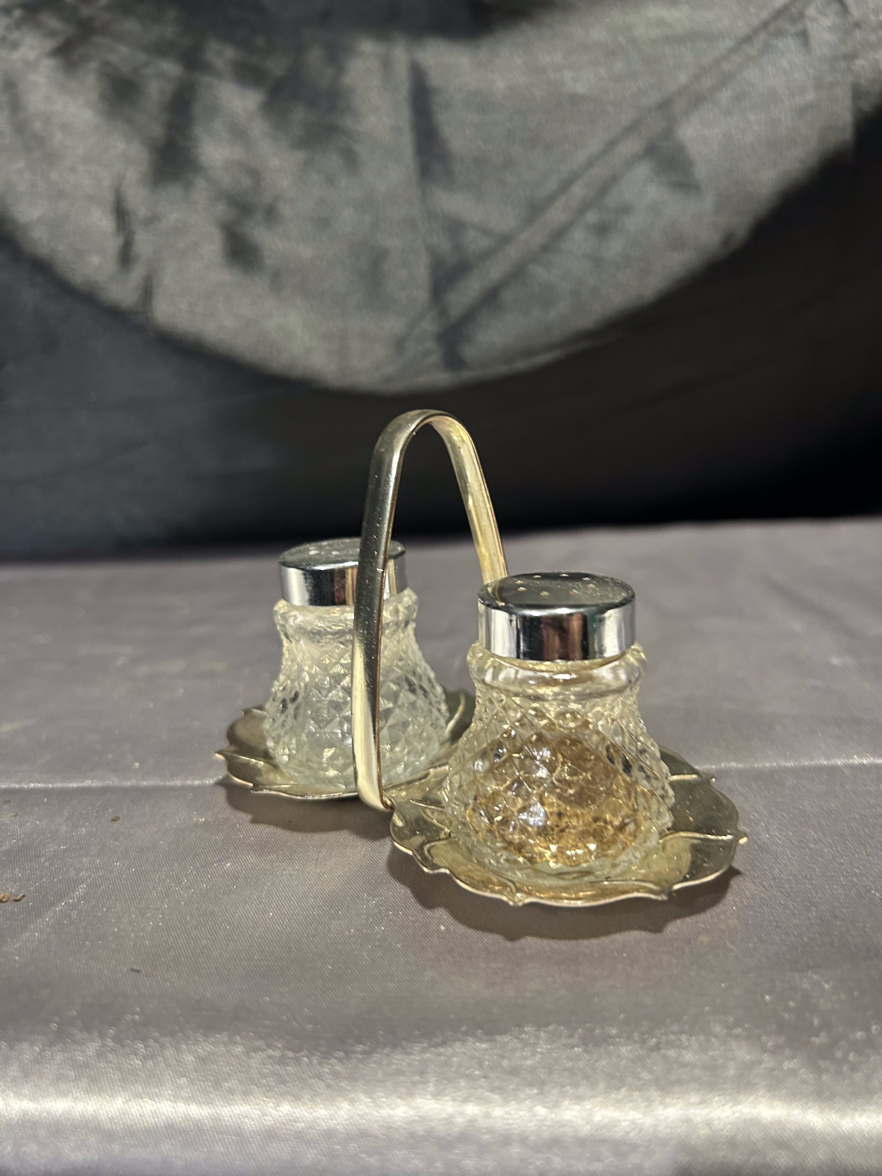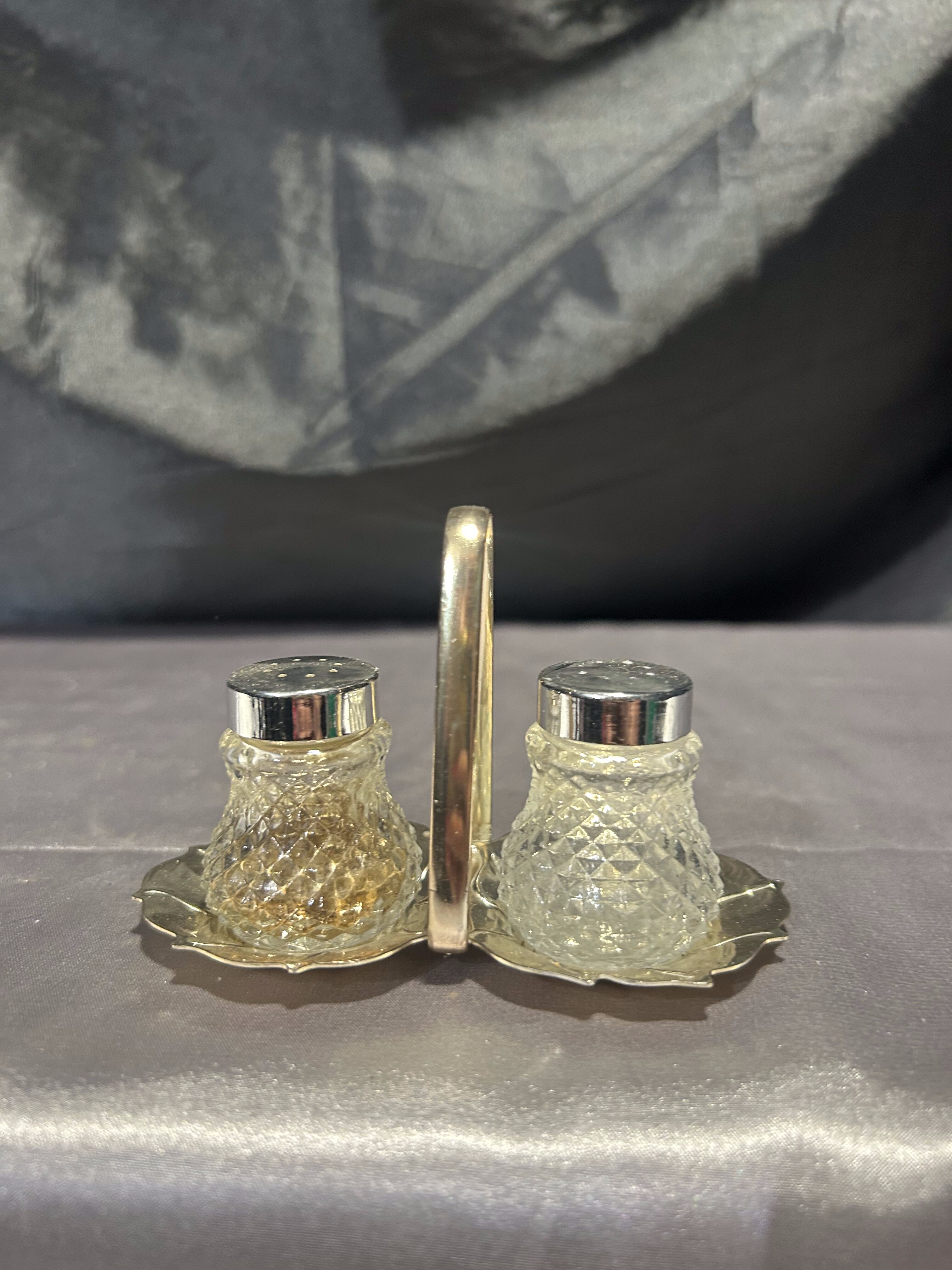 - Solniczka i pieprzniczka – Szklane na srebrnym talerzyku z uszkiem – Elegancki zestaw stołowy