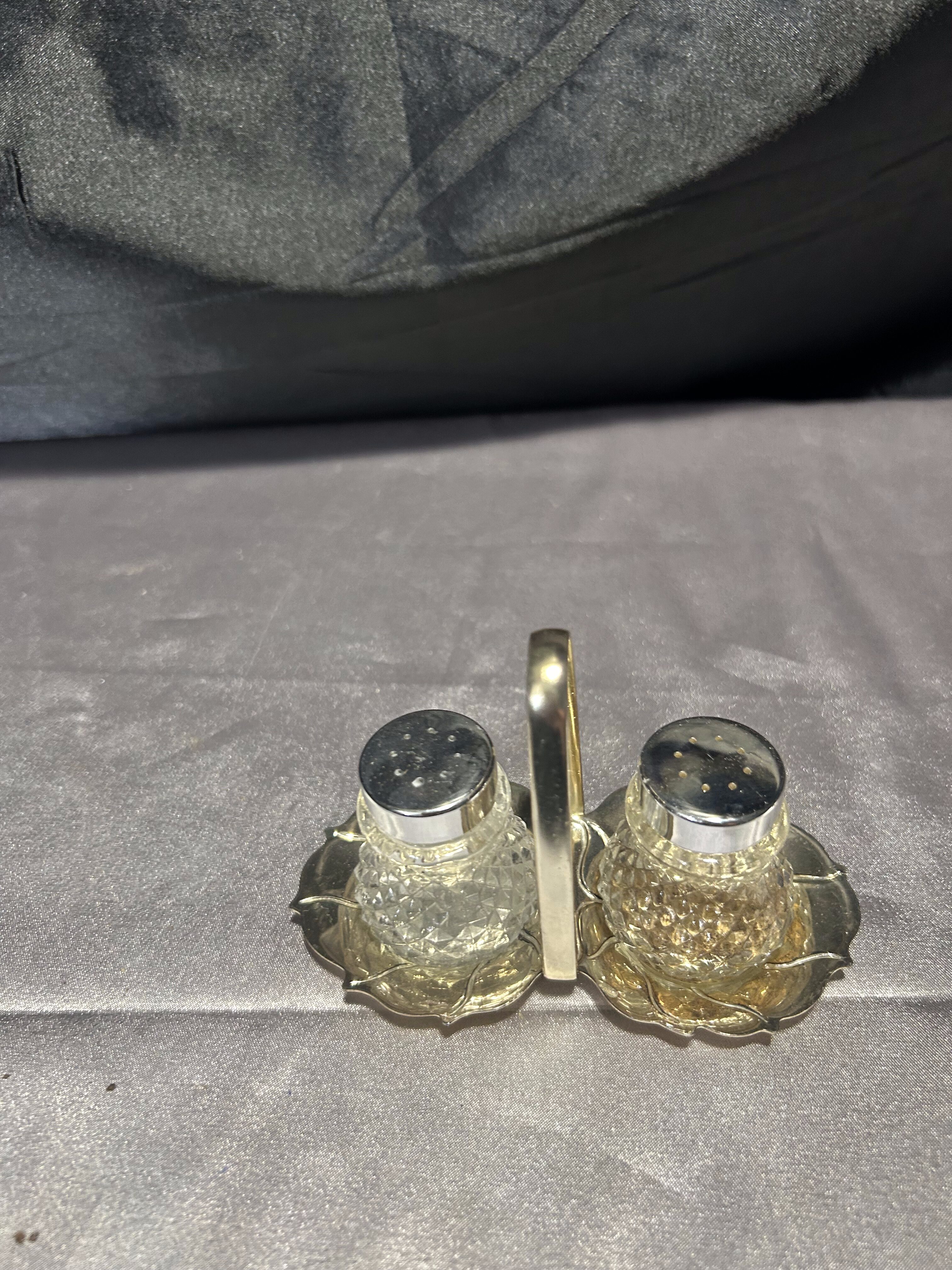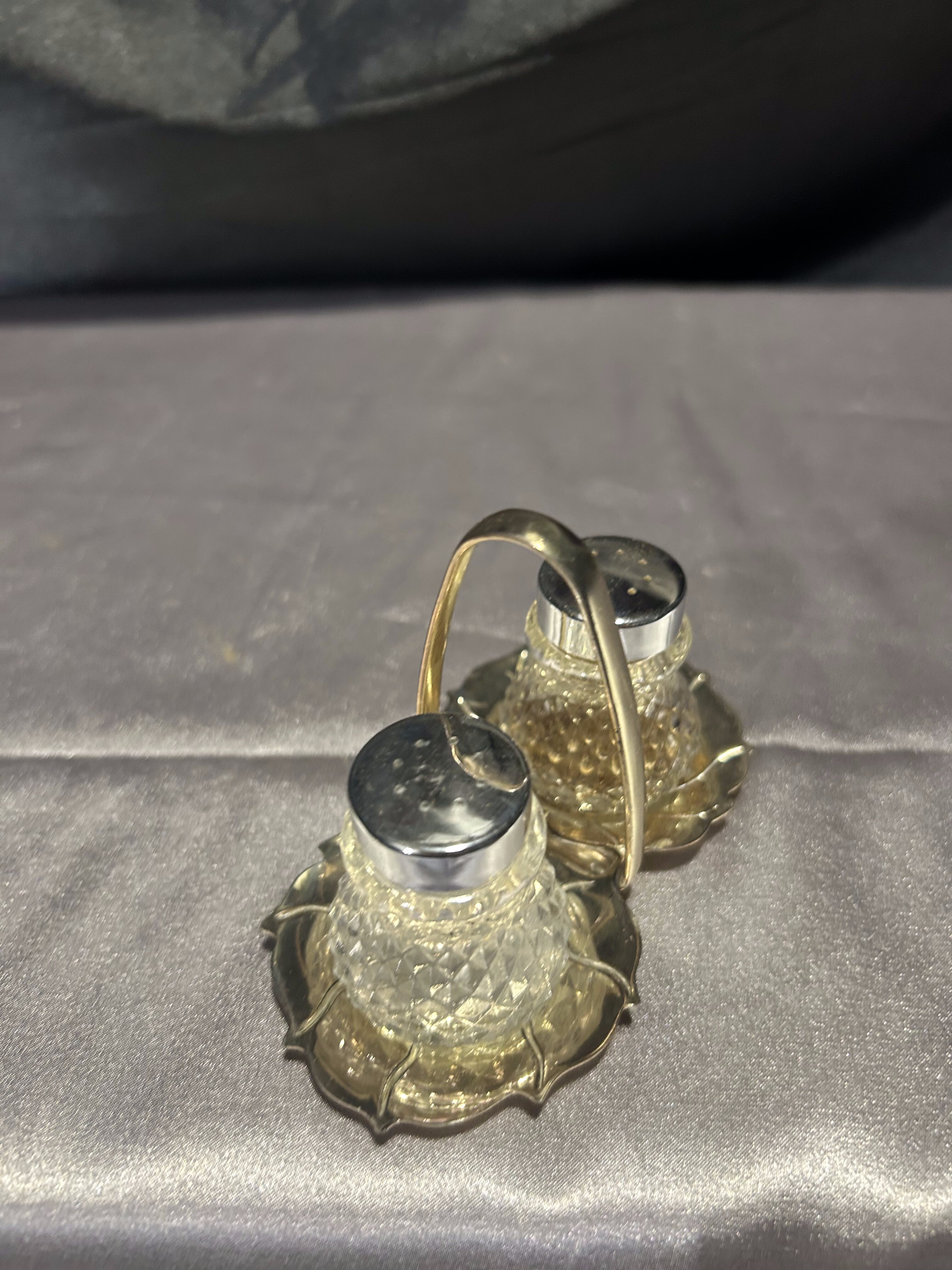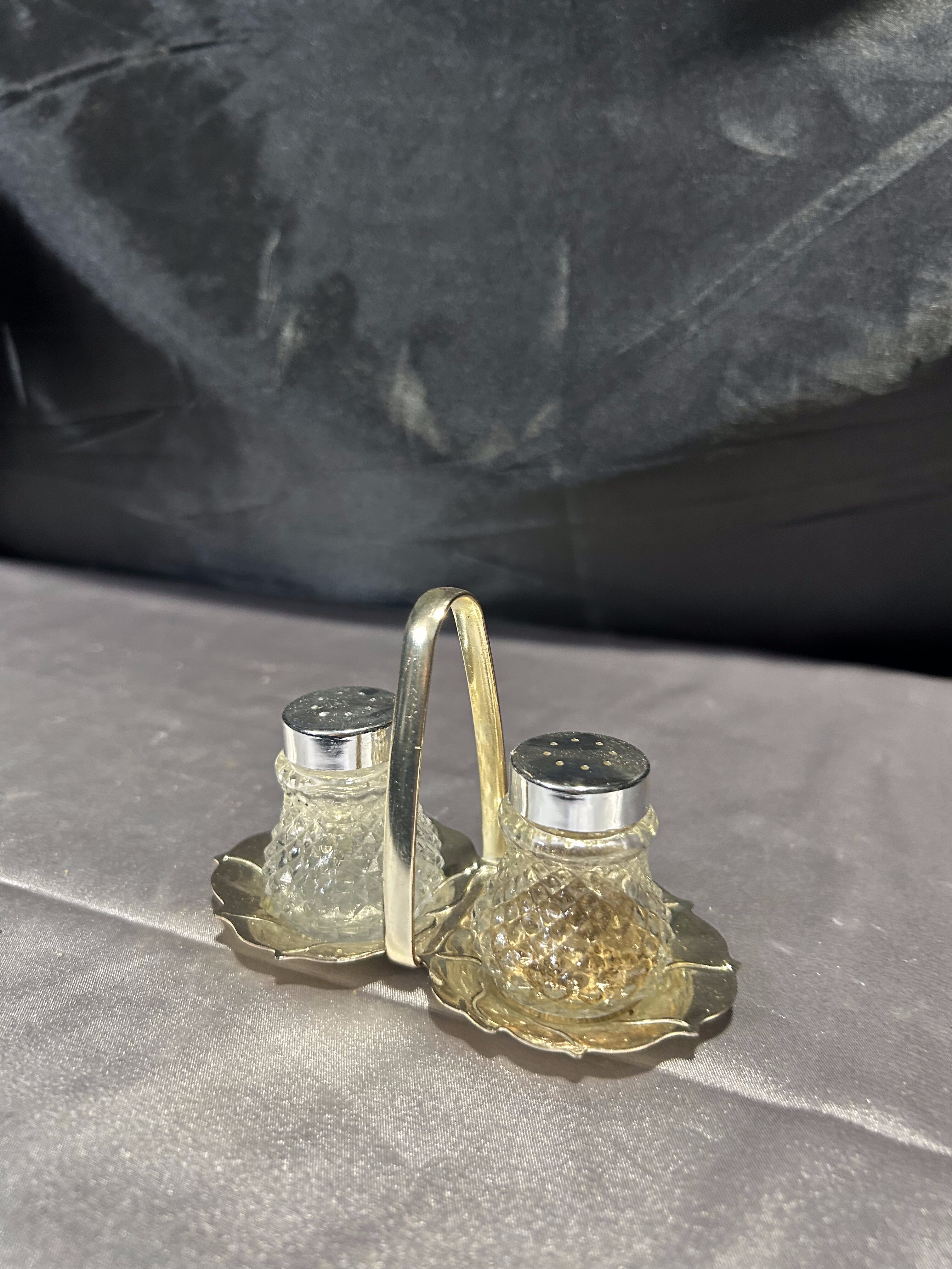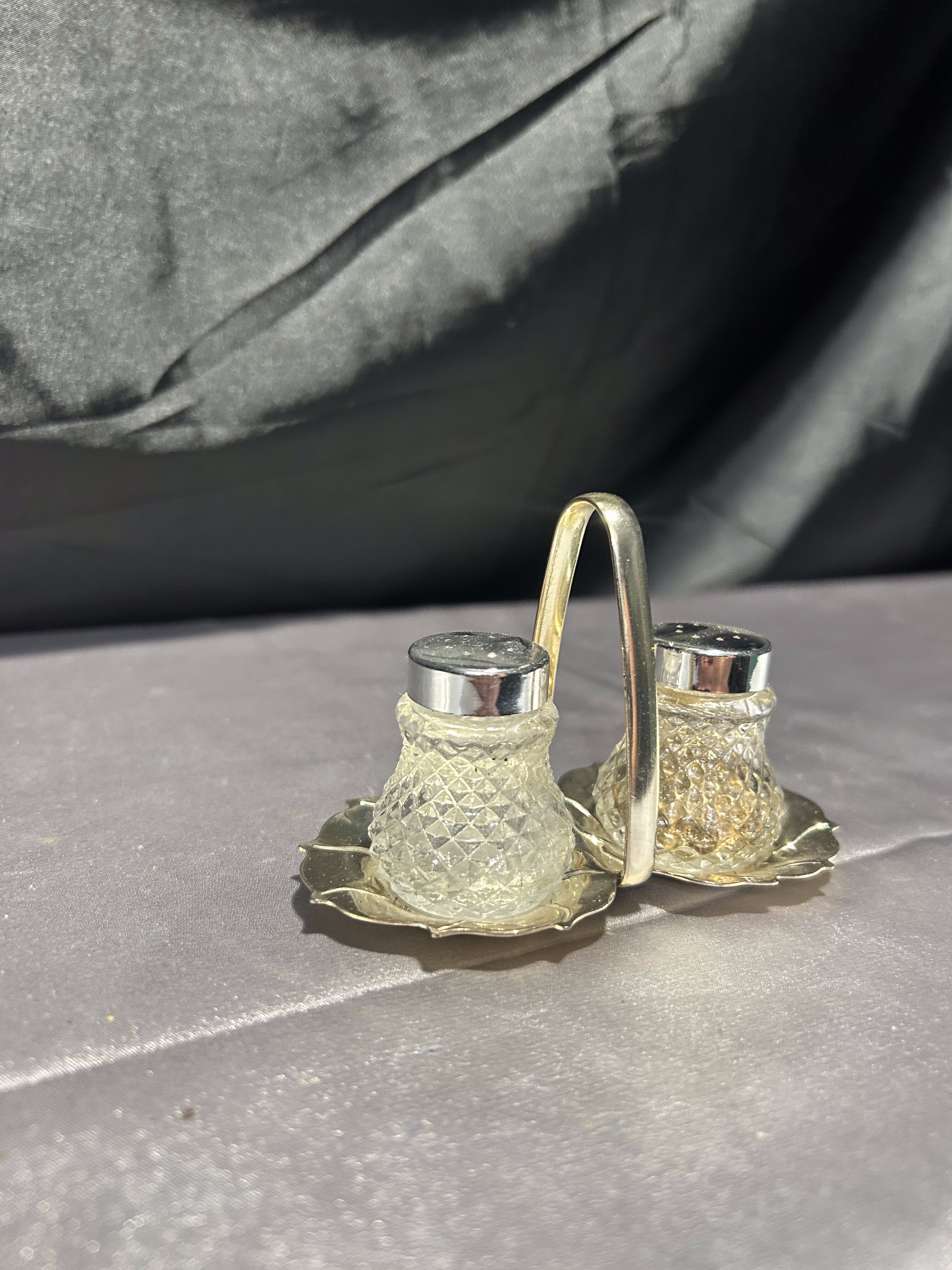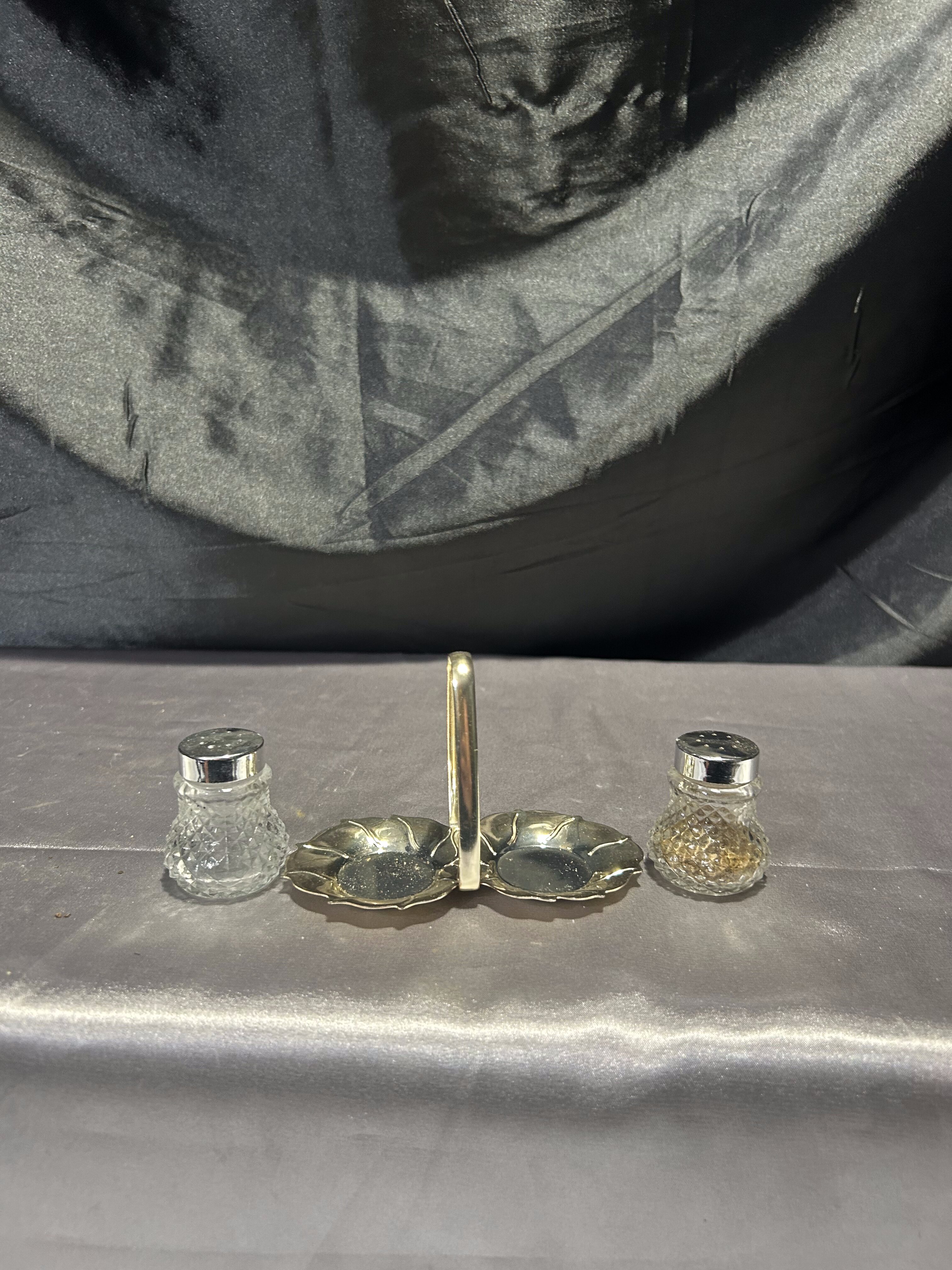 - Solniczka i pieprzniczka – Szklane na srebrnym talerzyku z uszkiem – Elegancki zestaw stołowy