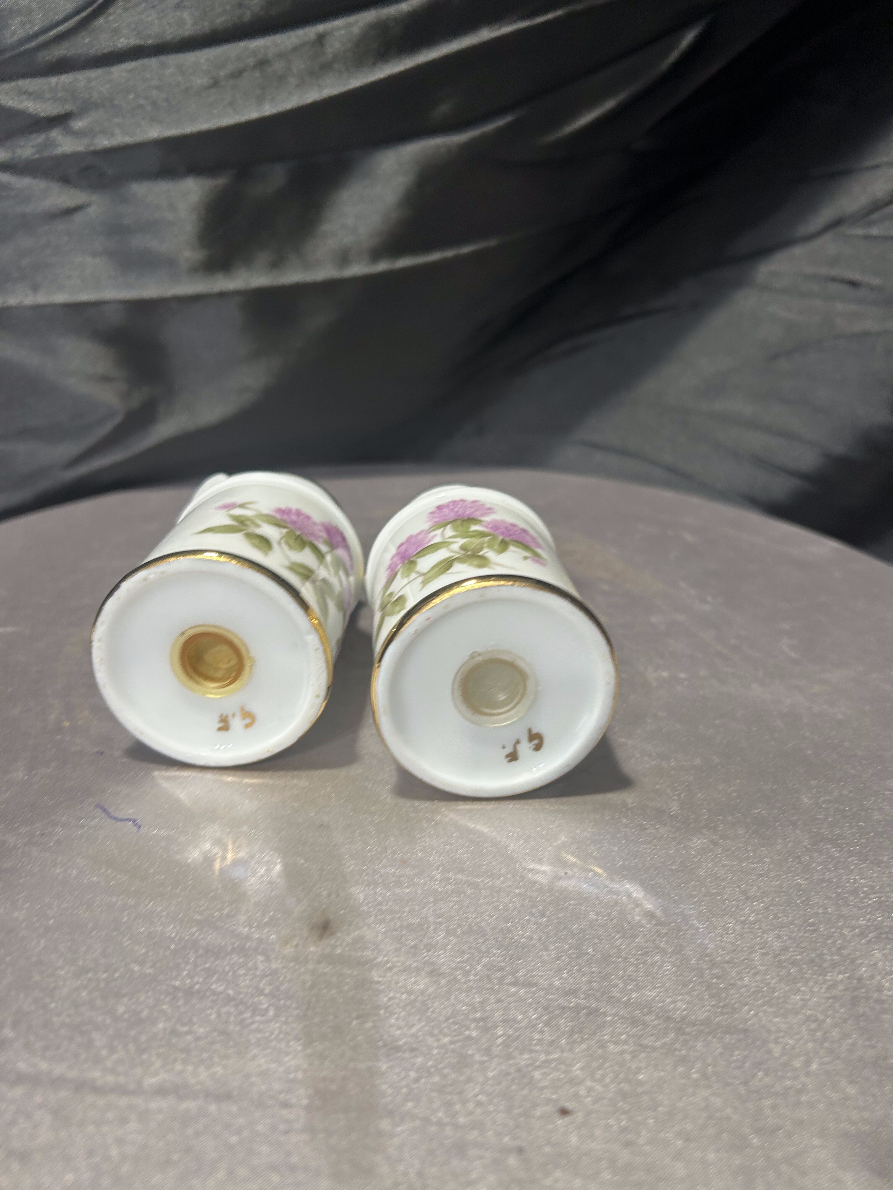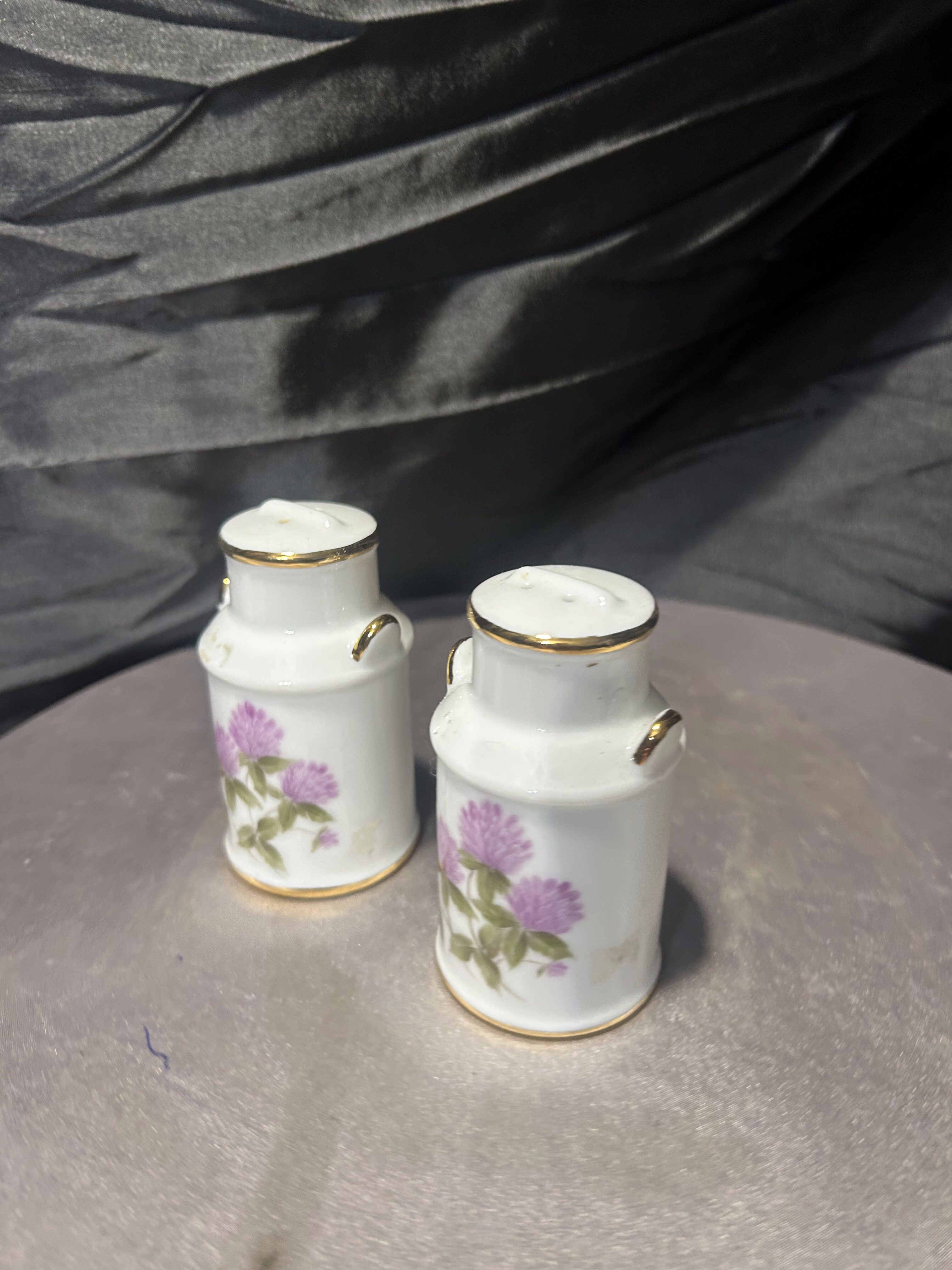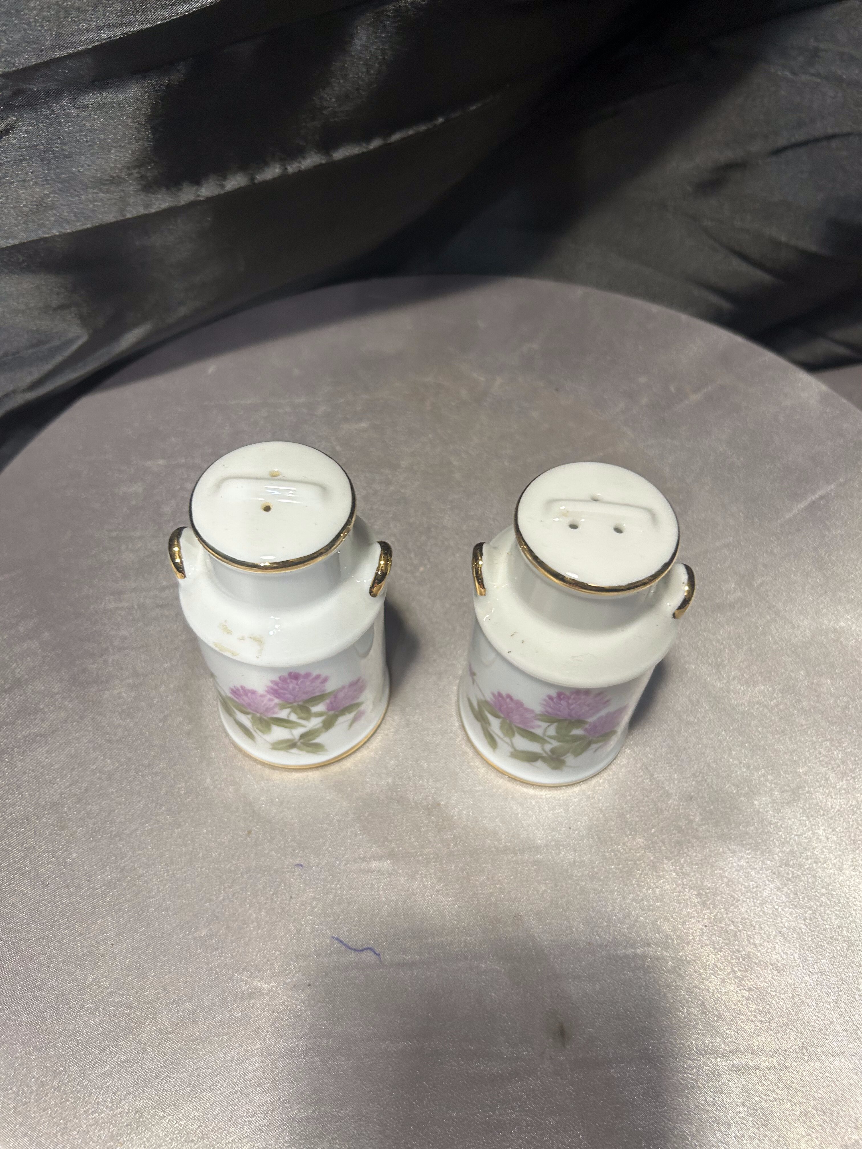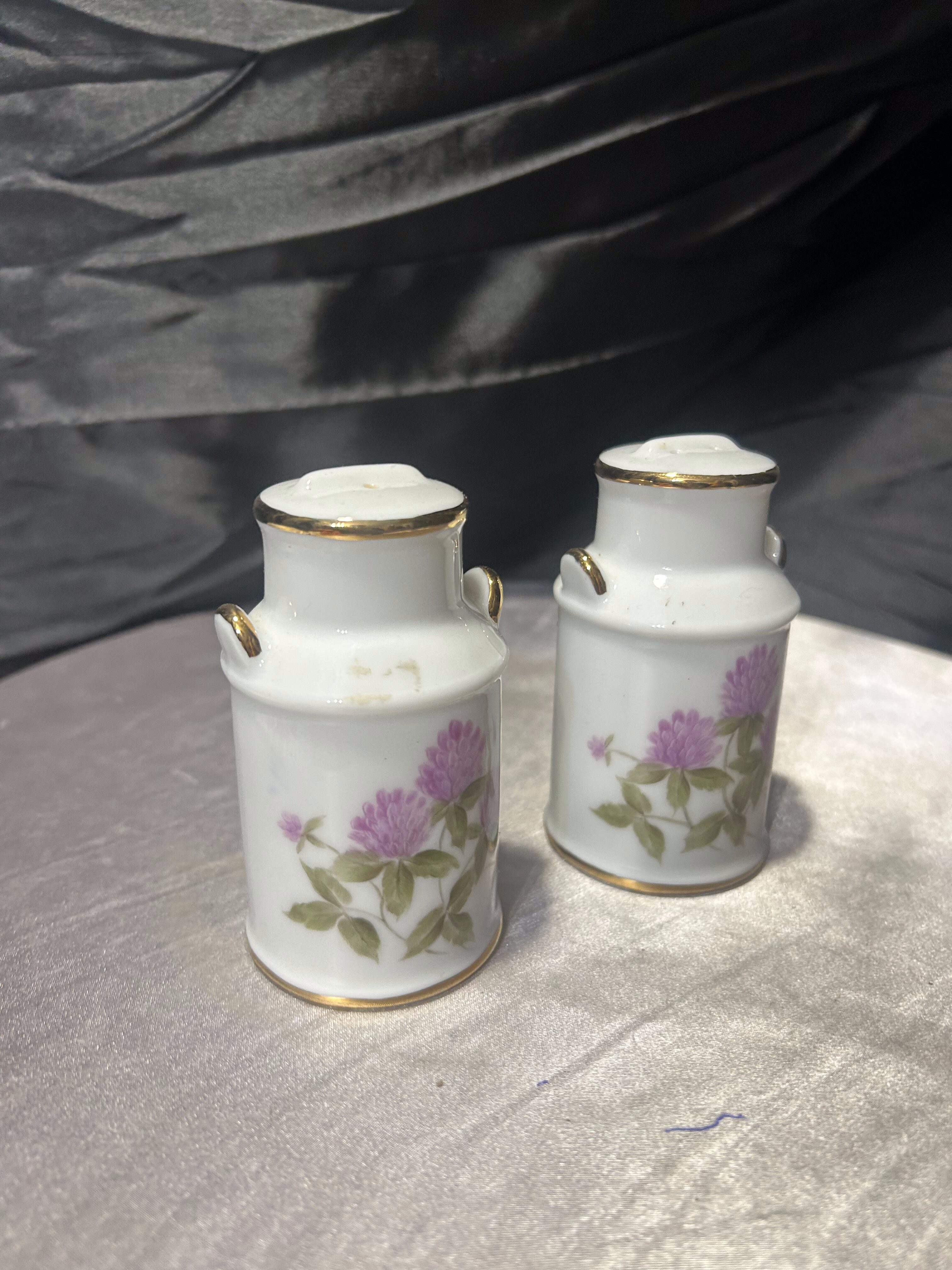 Uroczy zestaw solniczki i pieprzniczki wykonany z ceramiki, stylizowany na miniaturowe bańki na mleko. Naczynia zdobione są delikatnym, ręcznie malowanym motywem kwiatowym przedstawiającym koniczynę w subtelnym różowym odcieniu.