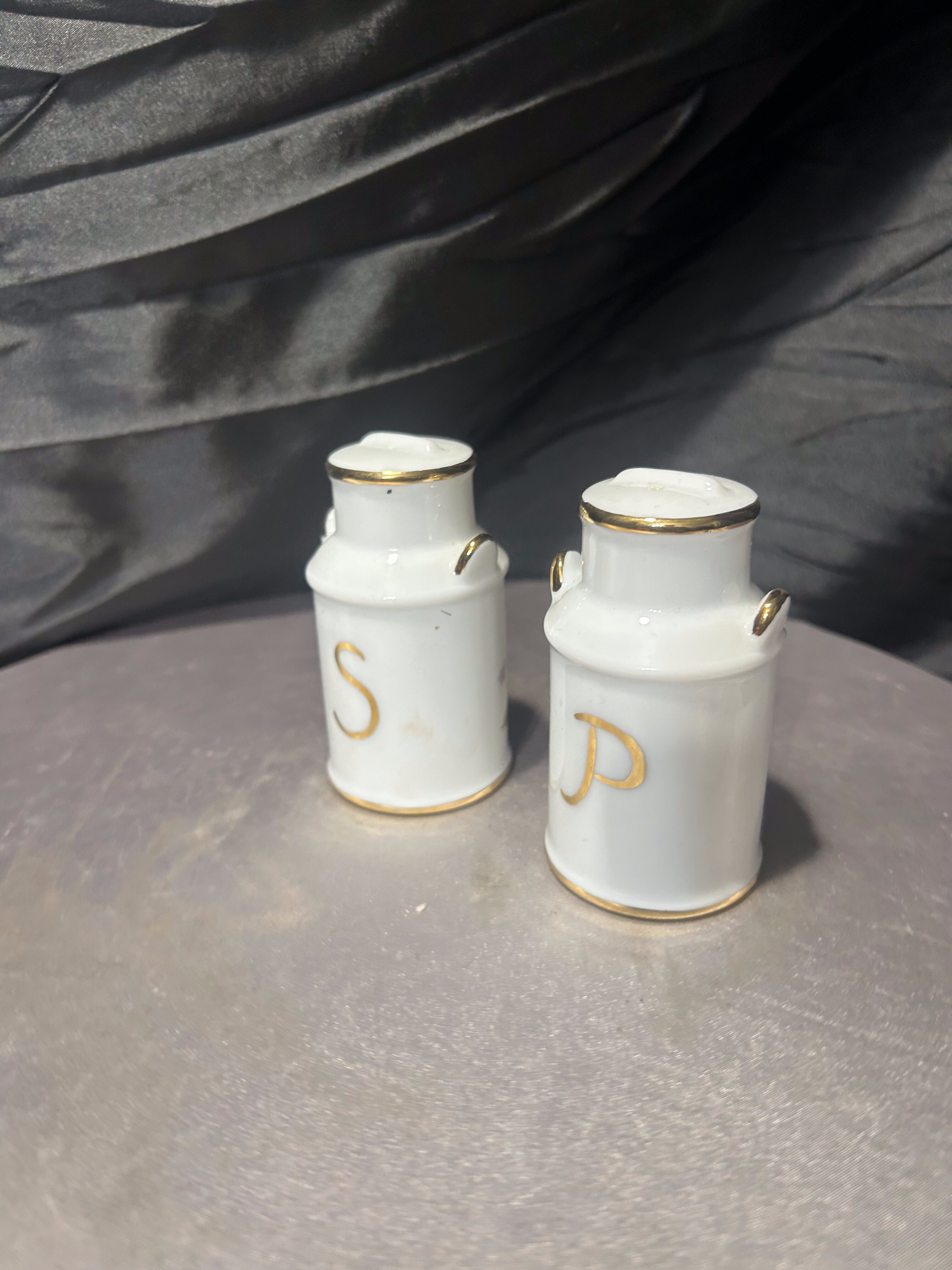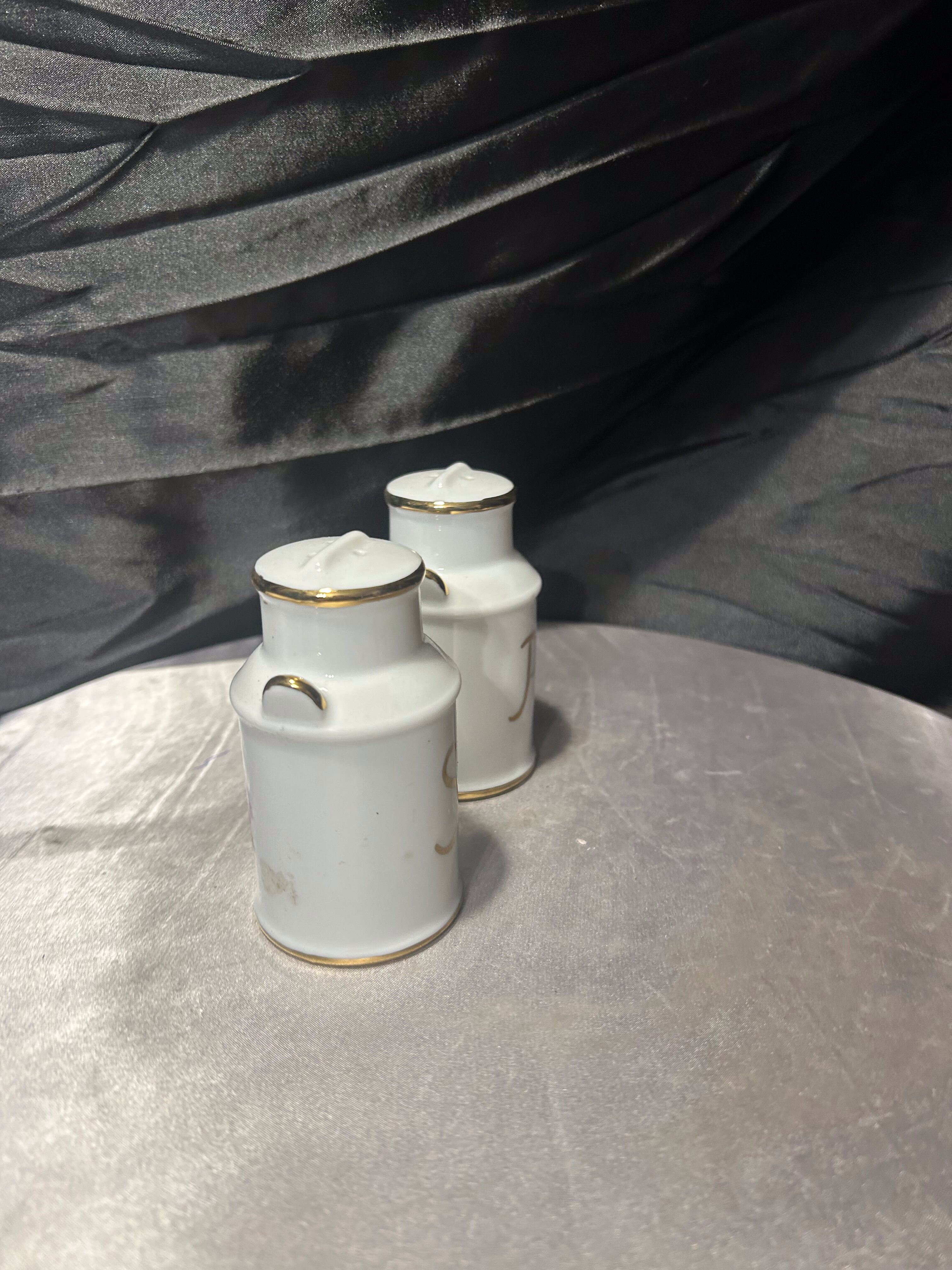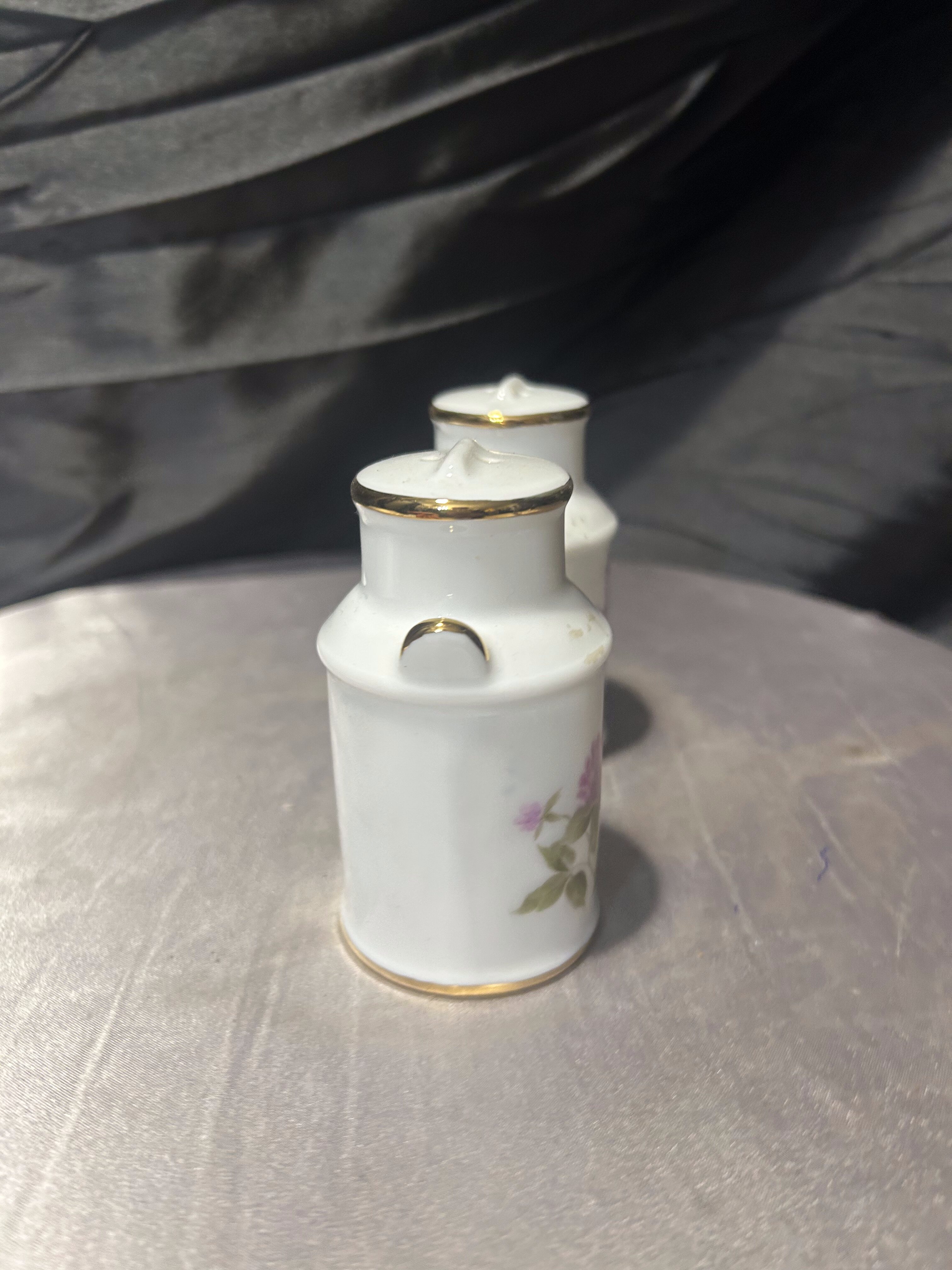 Dekoracyjny zestaw solniczki i pieprzniczki w formie miniaturek tradycyjnych kanek na mleko to uroczy element zastawy stołowej. Subtelny motyw kwiatowy i złocone detale nadają kompletowi elegancki i ponadczasowy charakter.