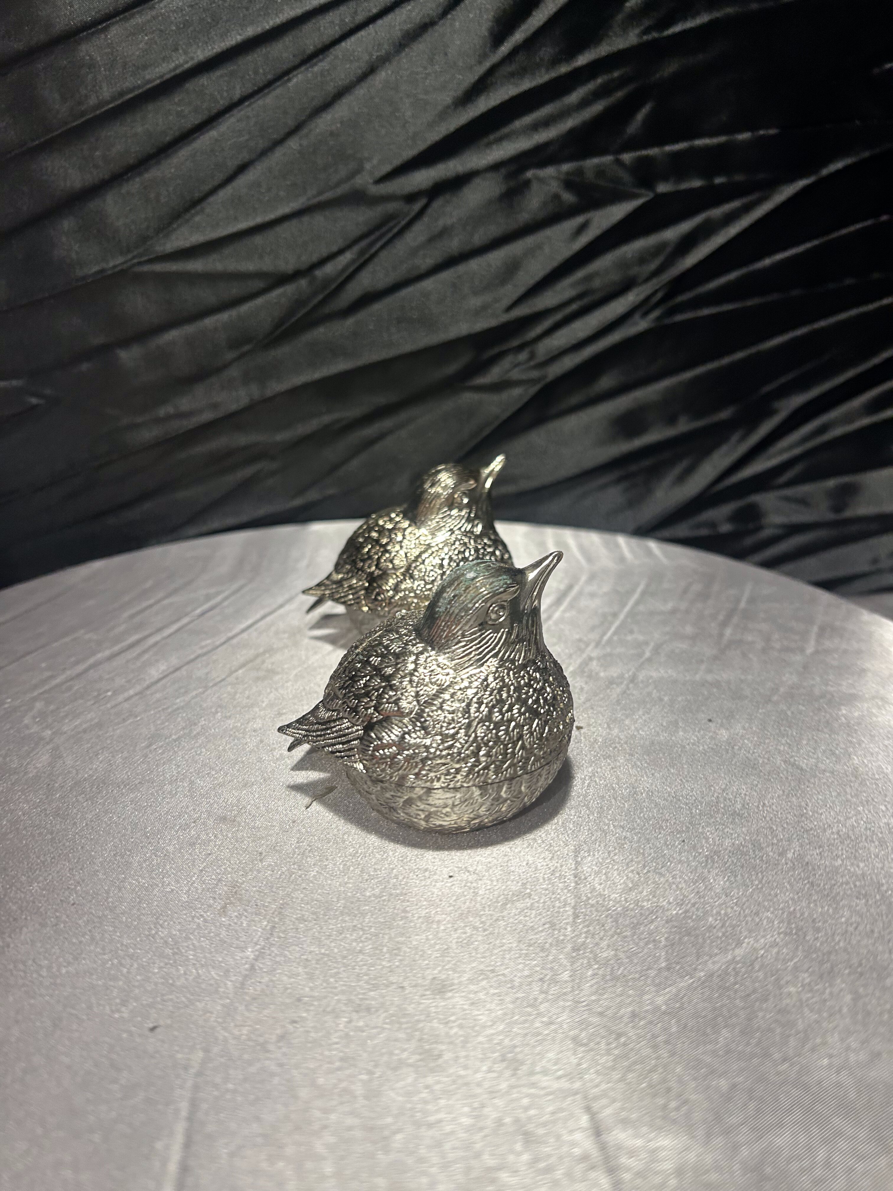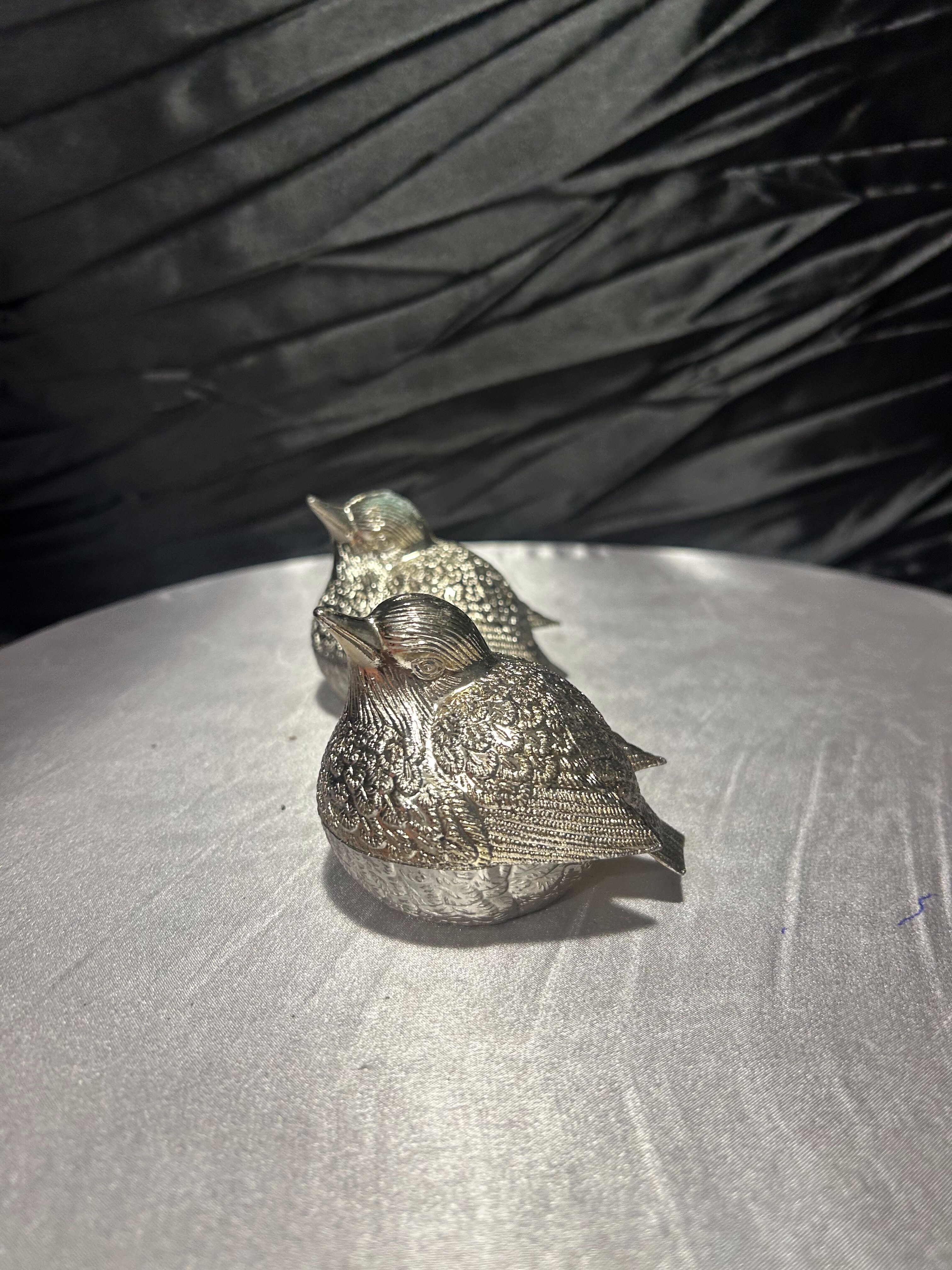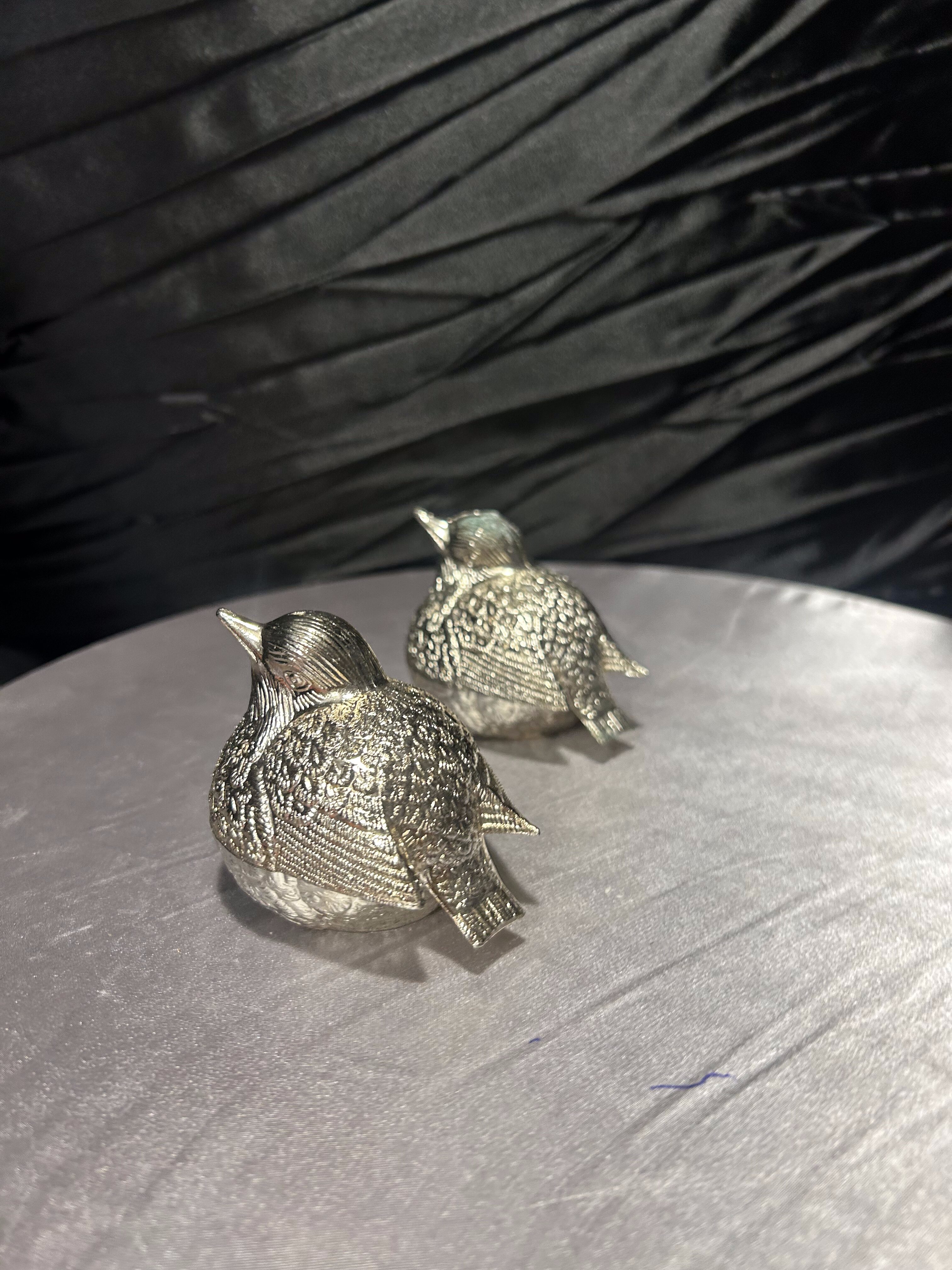 Urokliwy komplet solniczki i pieprzniczki w formie dwóch realistycznie odwzorowanych ptaszków. Wykonane z metalu w srebrnym kolorze, z misternie opracowaną fakturą piór, zachwycają detalami i eleganckim wykończeniem. Dzięki otwieraniu od dołu są praktyczne i łatwe w uzupełnianiu, a jednocześnie stanowią oryginalny element dekoracyjny na stole lub w witrynie.