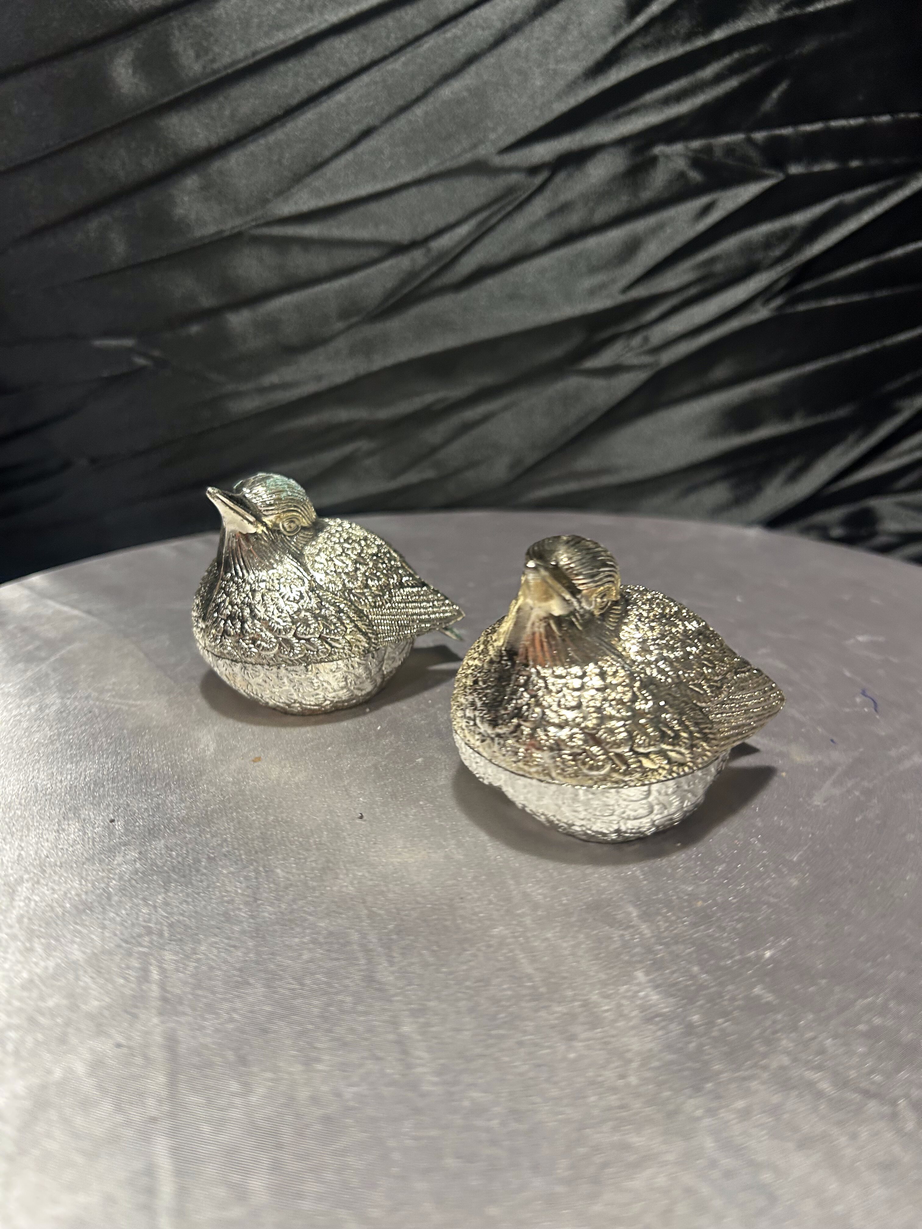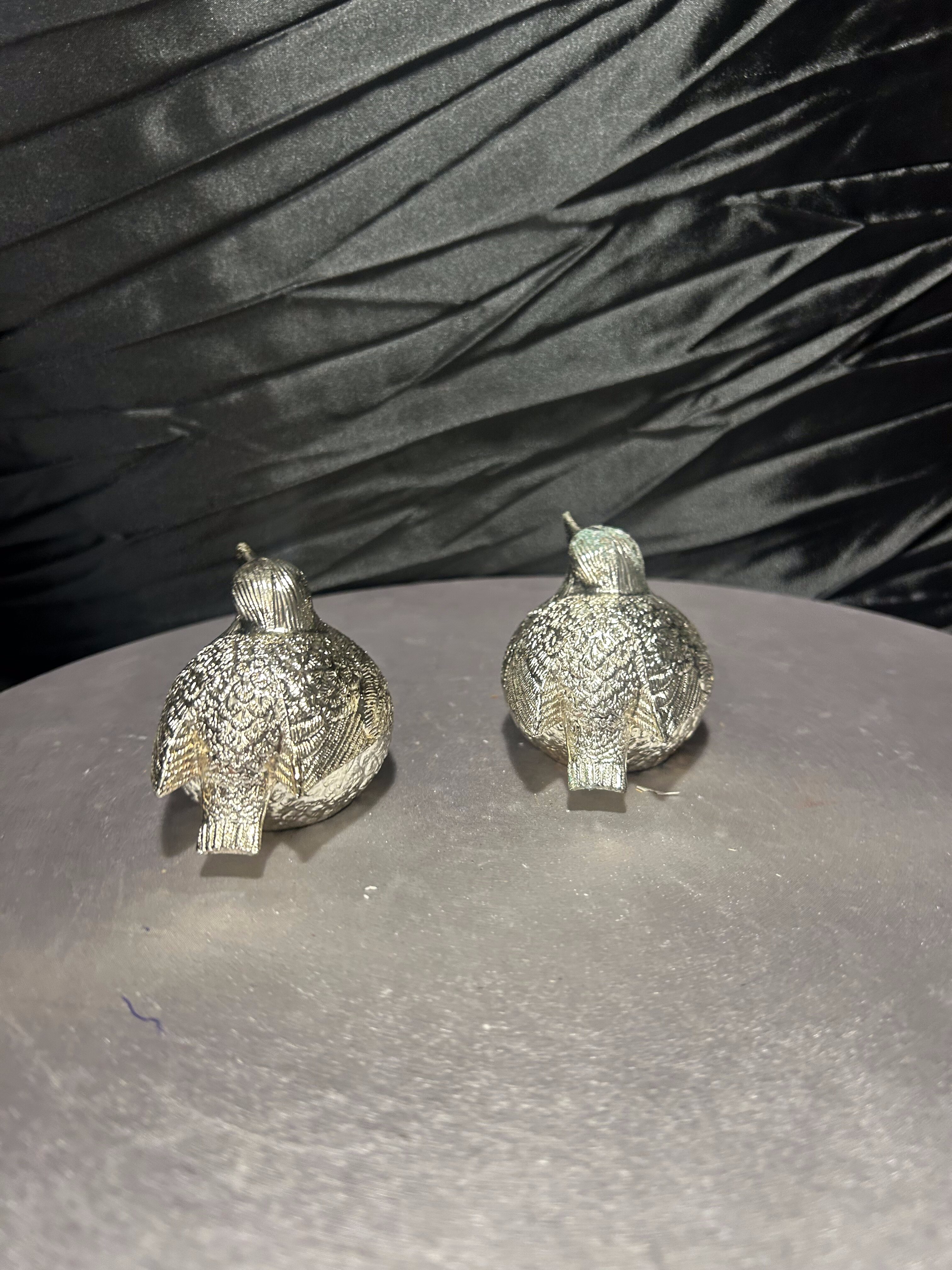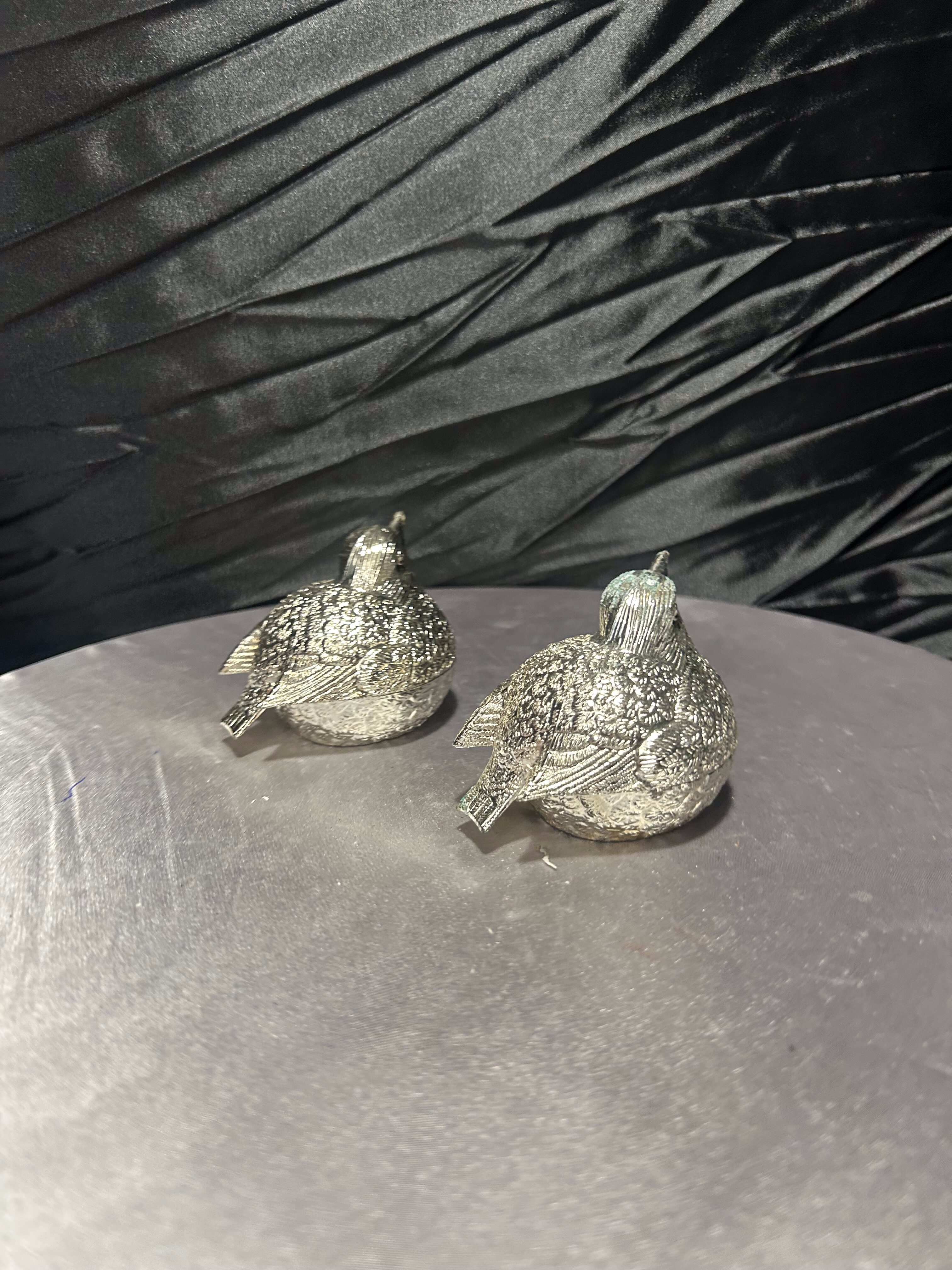 Urokliwy komplet solniczki i pieprzniczki w formie dwóch realistycznie odwzorowanych ptaszków. Wykonane z metalu w srebrnym kolorze, z misternie opracowaną fakturą piór, zachwycają detalami i eleganckim wykończeniem. Dzięki otwieraniu od dołu są praktyczne i łatwe w uzupełnianiu, a jednocześnie stanowią oryginalny element dekoracyjny na stole lub w witrynie.