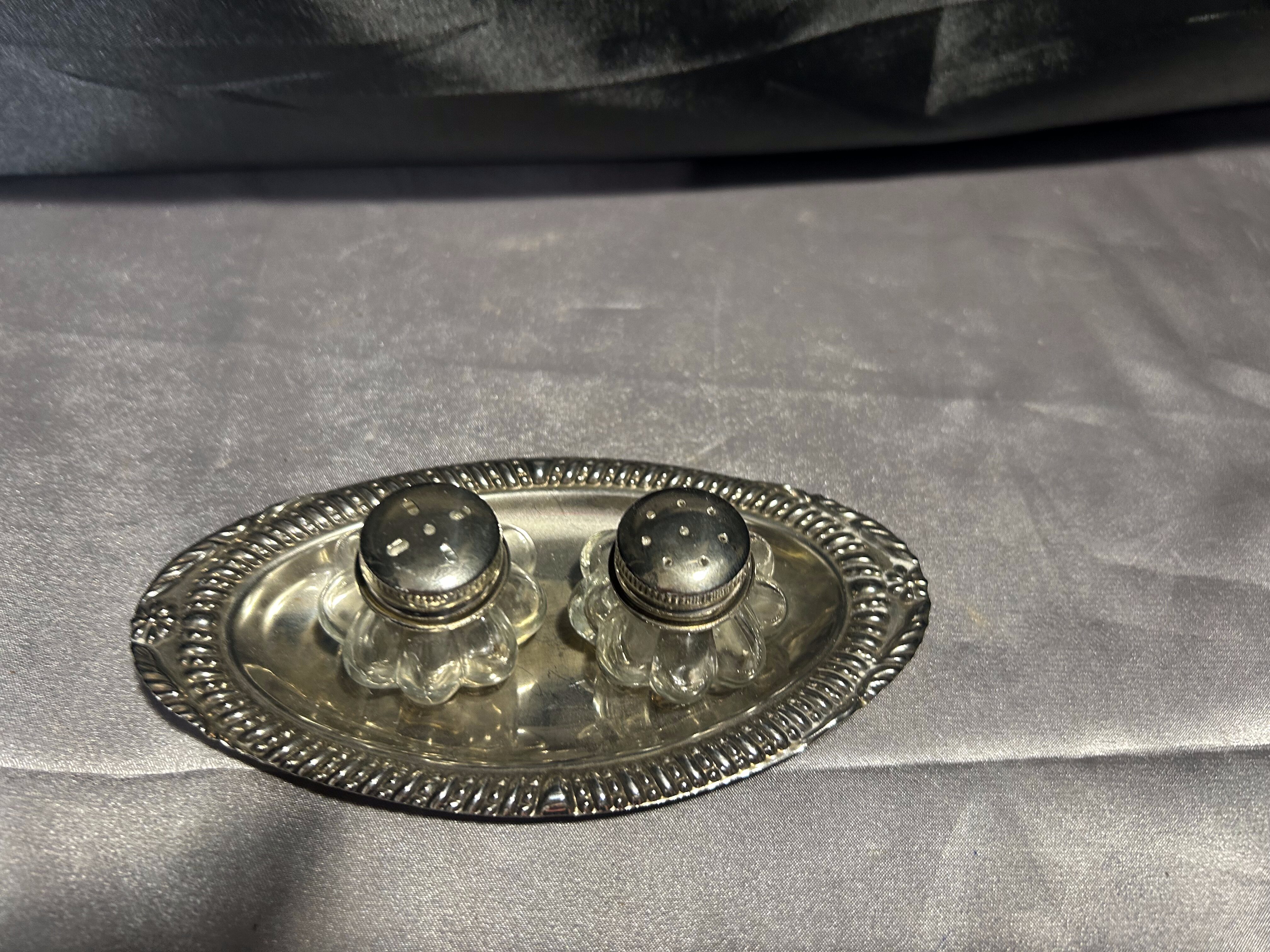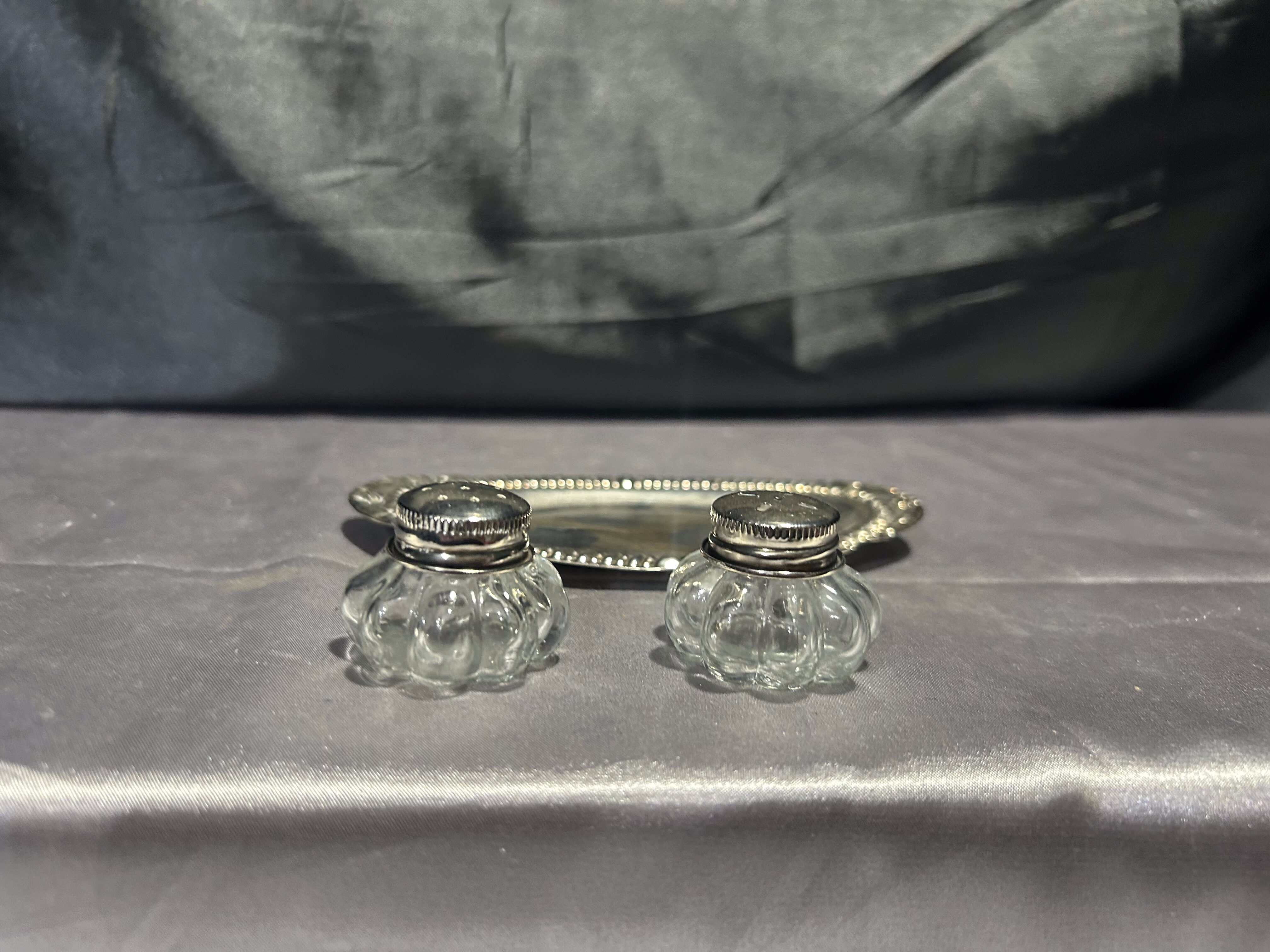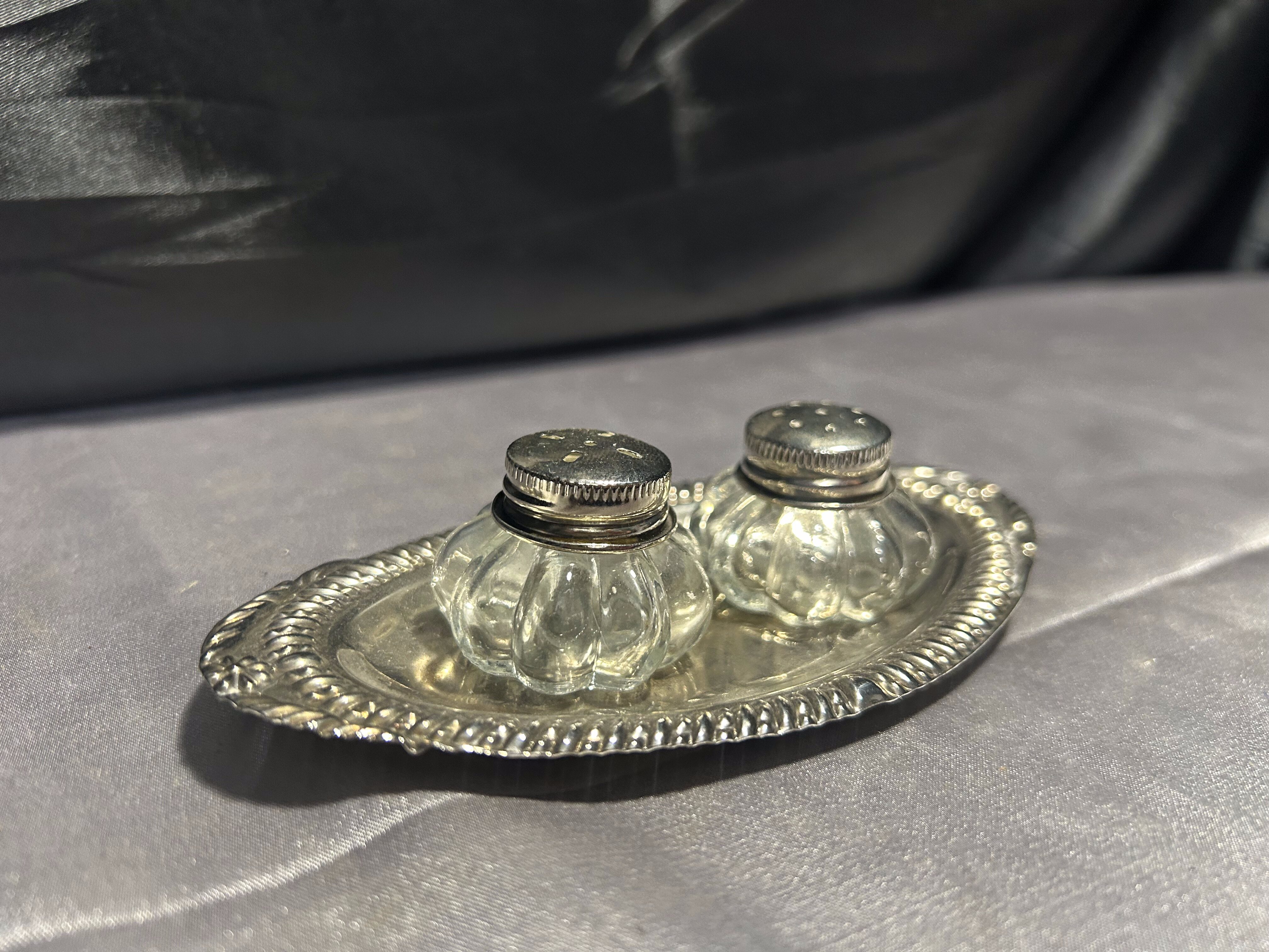 Solniczka i pieprzniczka – Zestaw na srebrnym talerzyku – Styl vintage