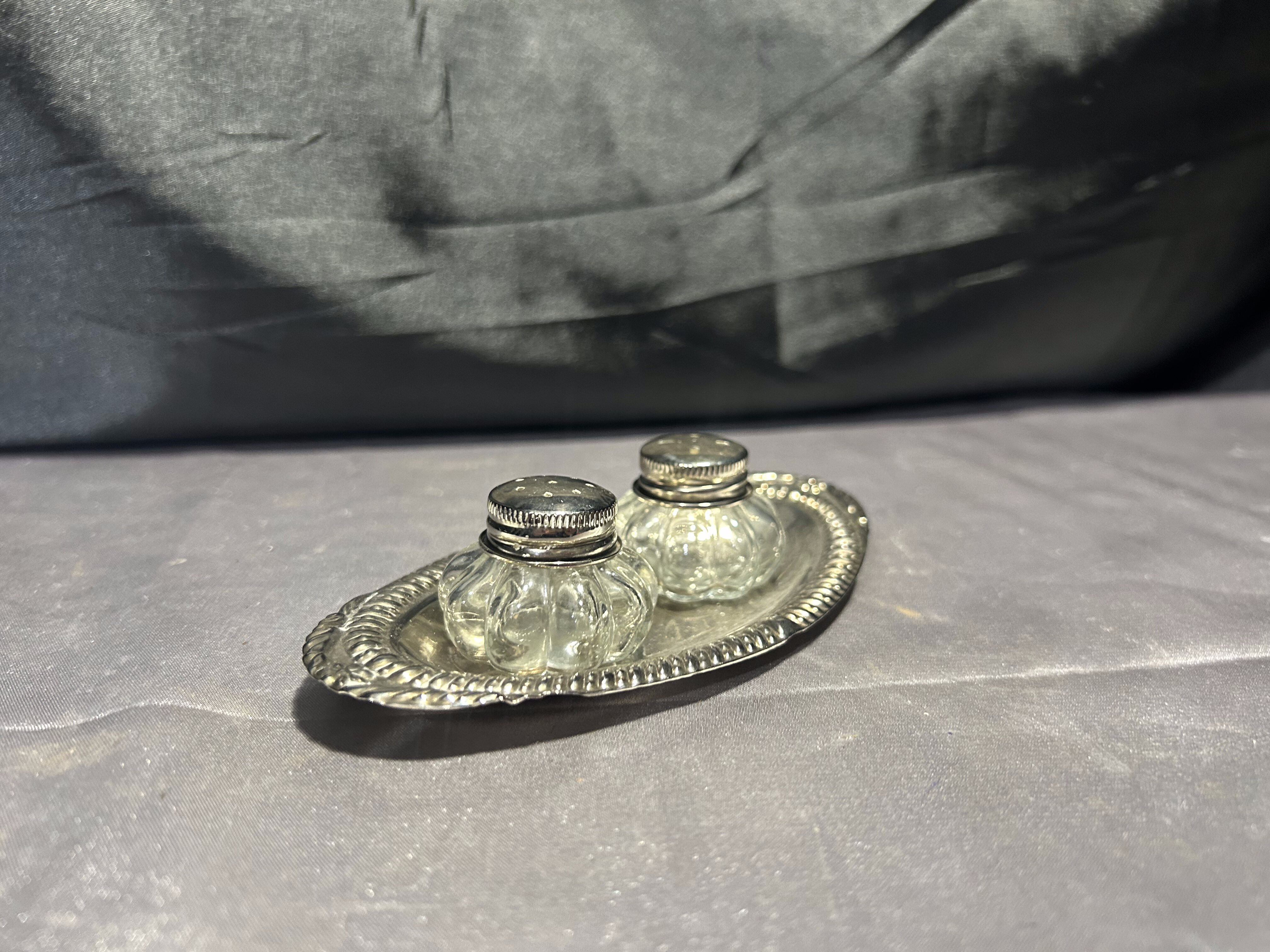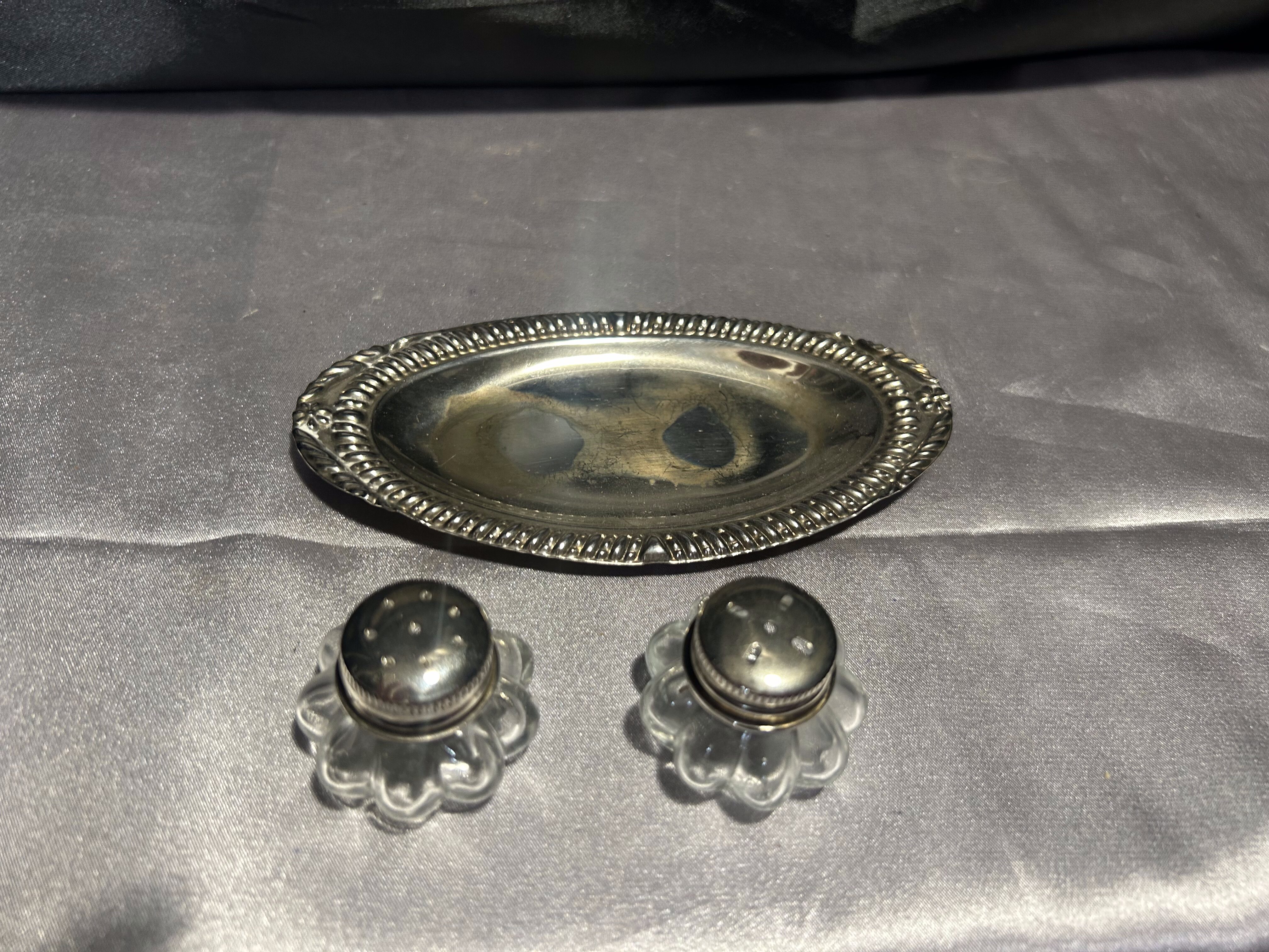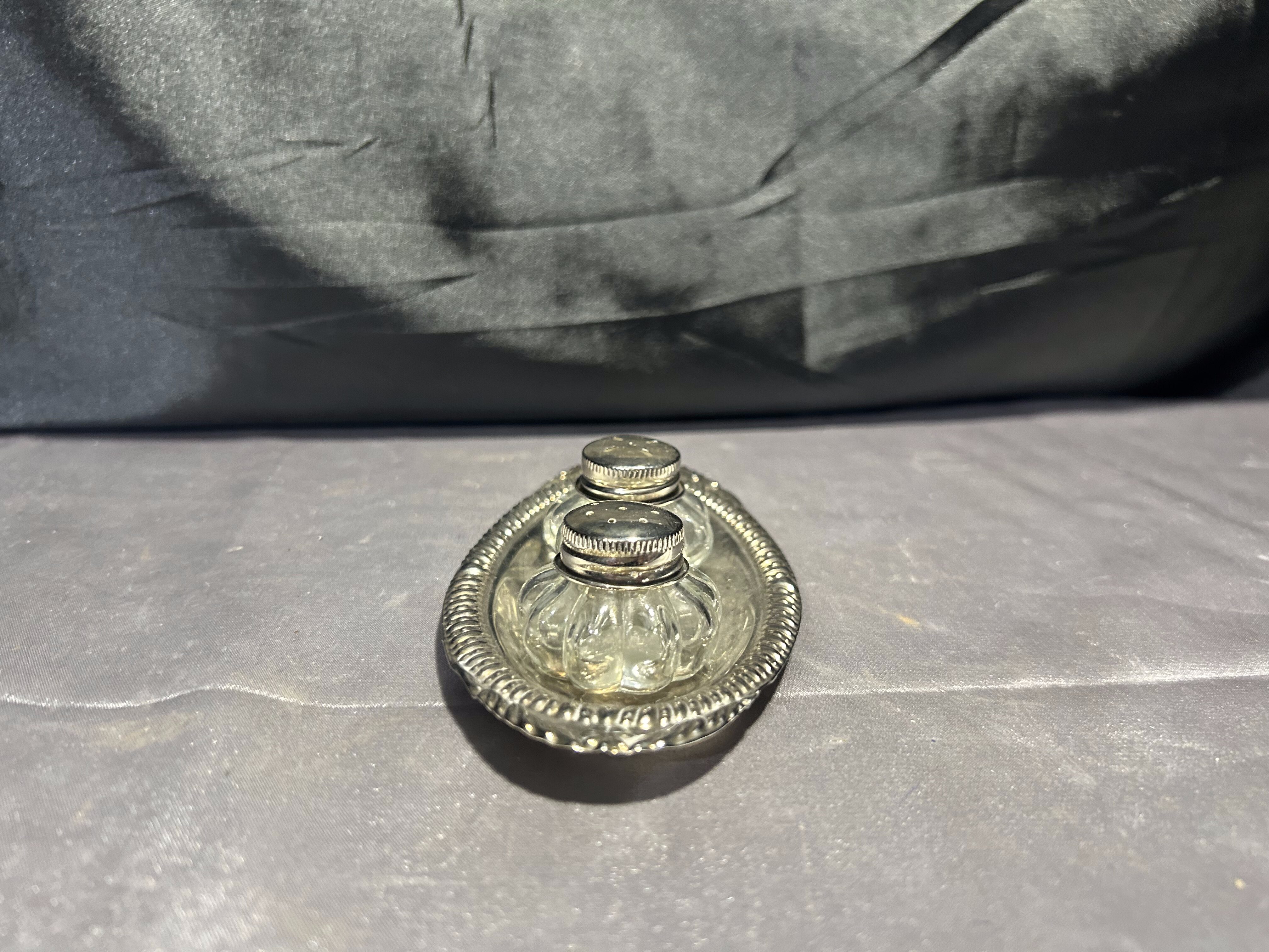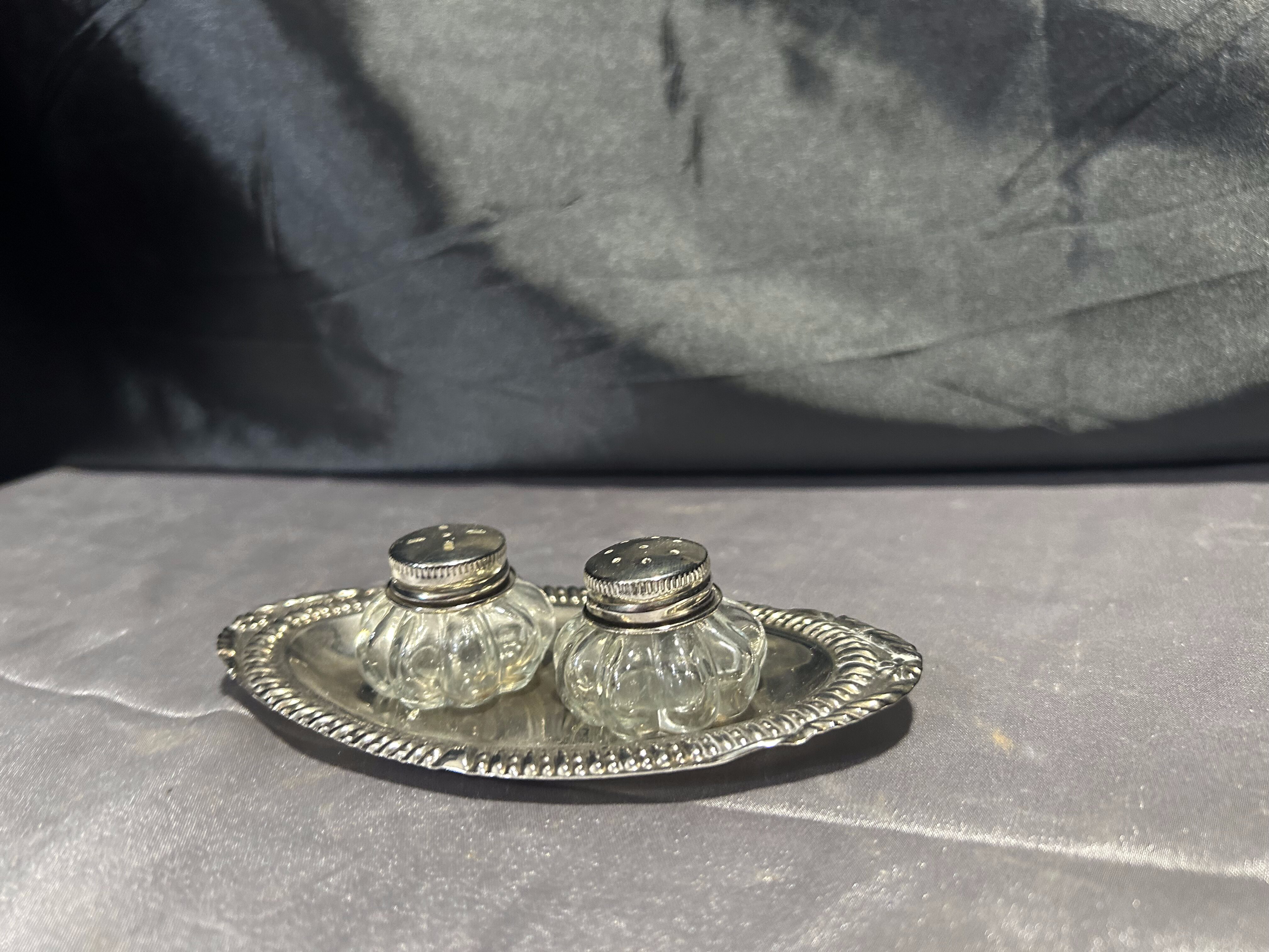 Solniczka i pieprzniczka – Zestaw na srebrnym talerzyku – Styl vintage