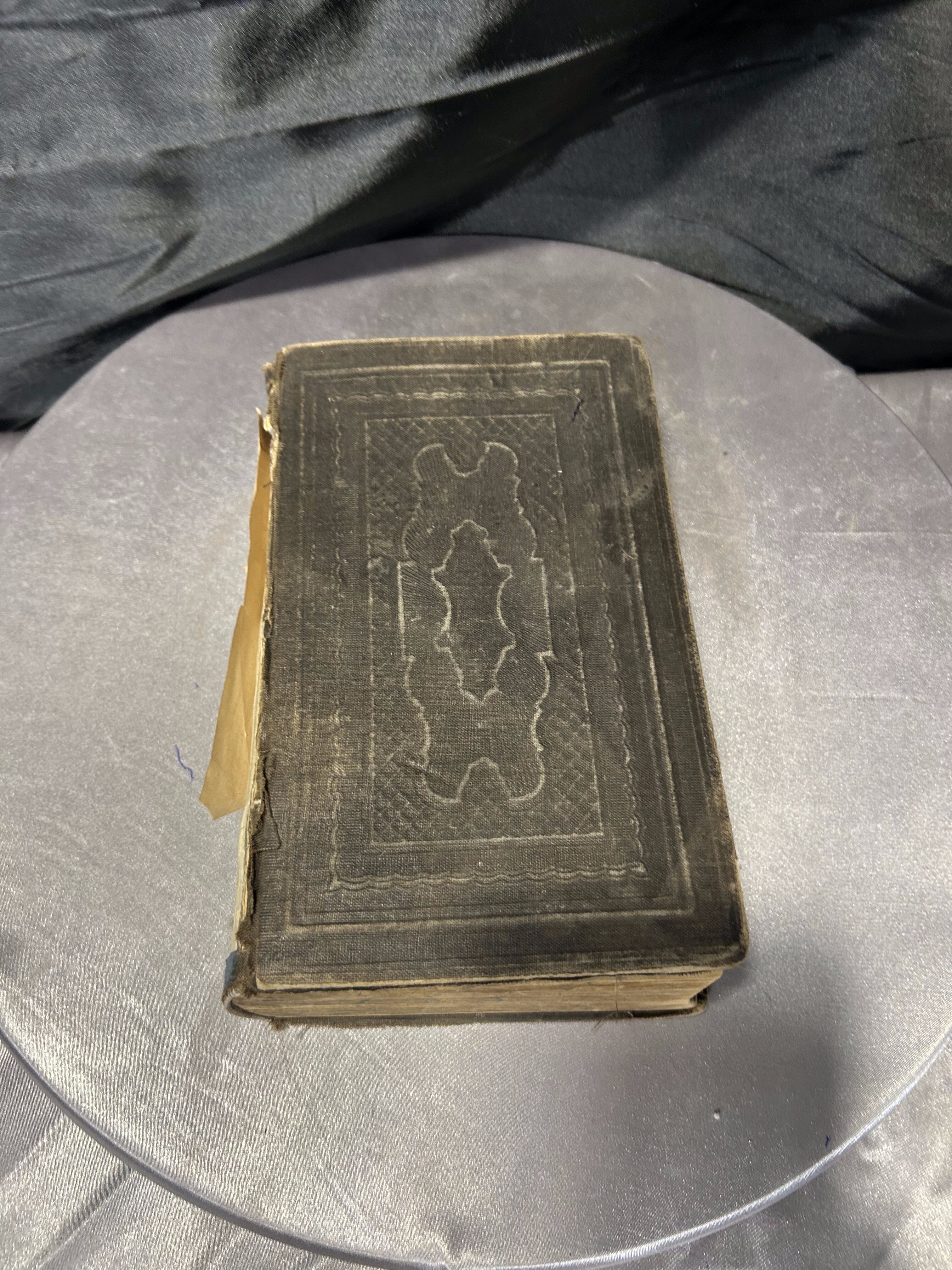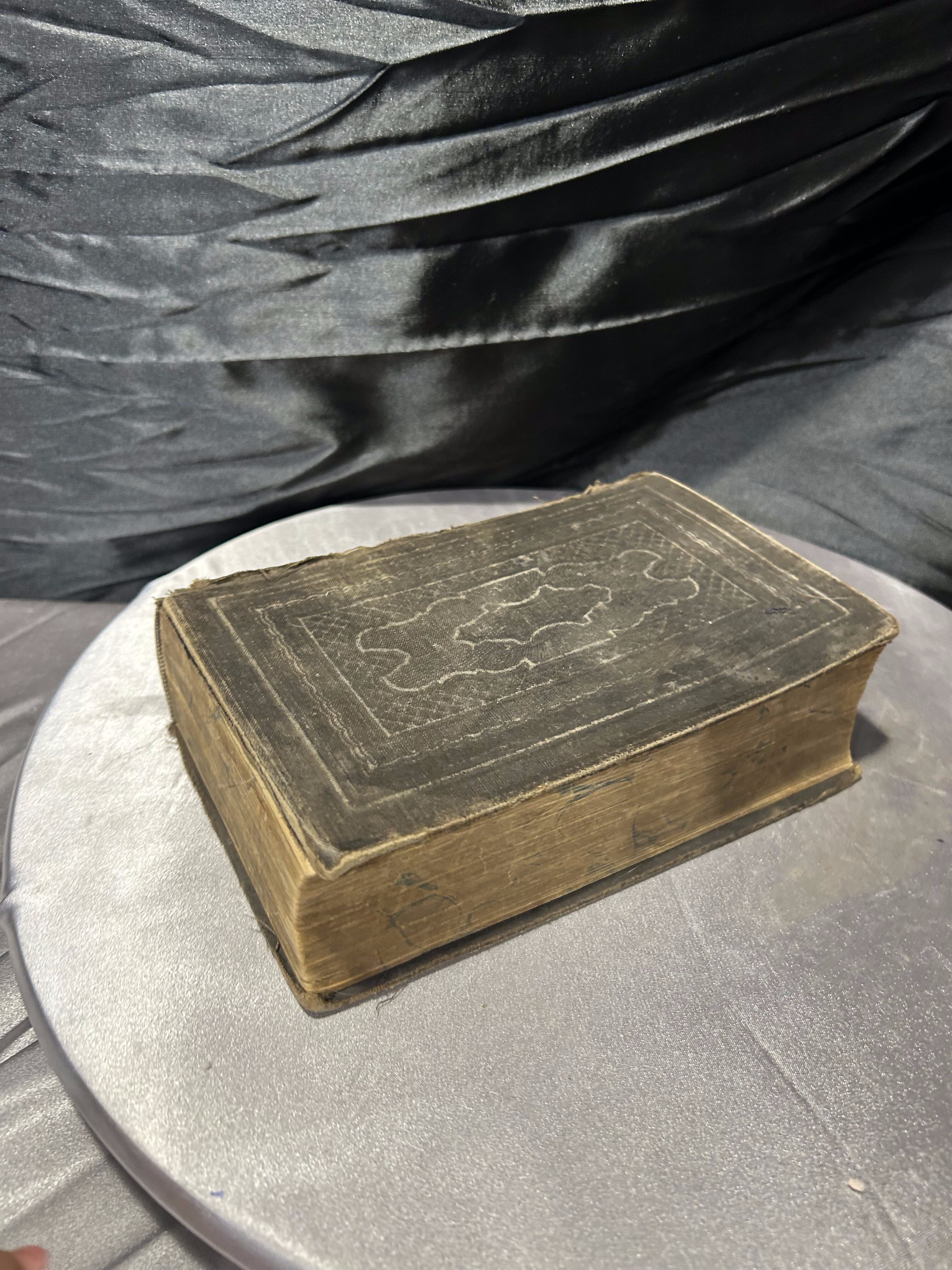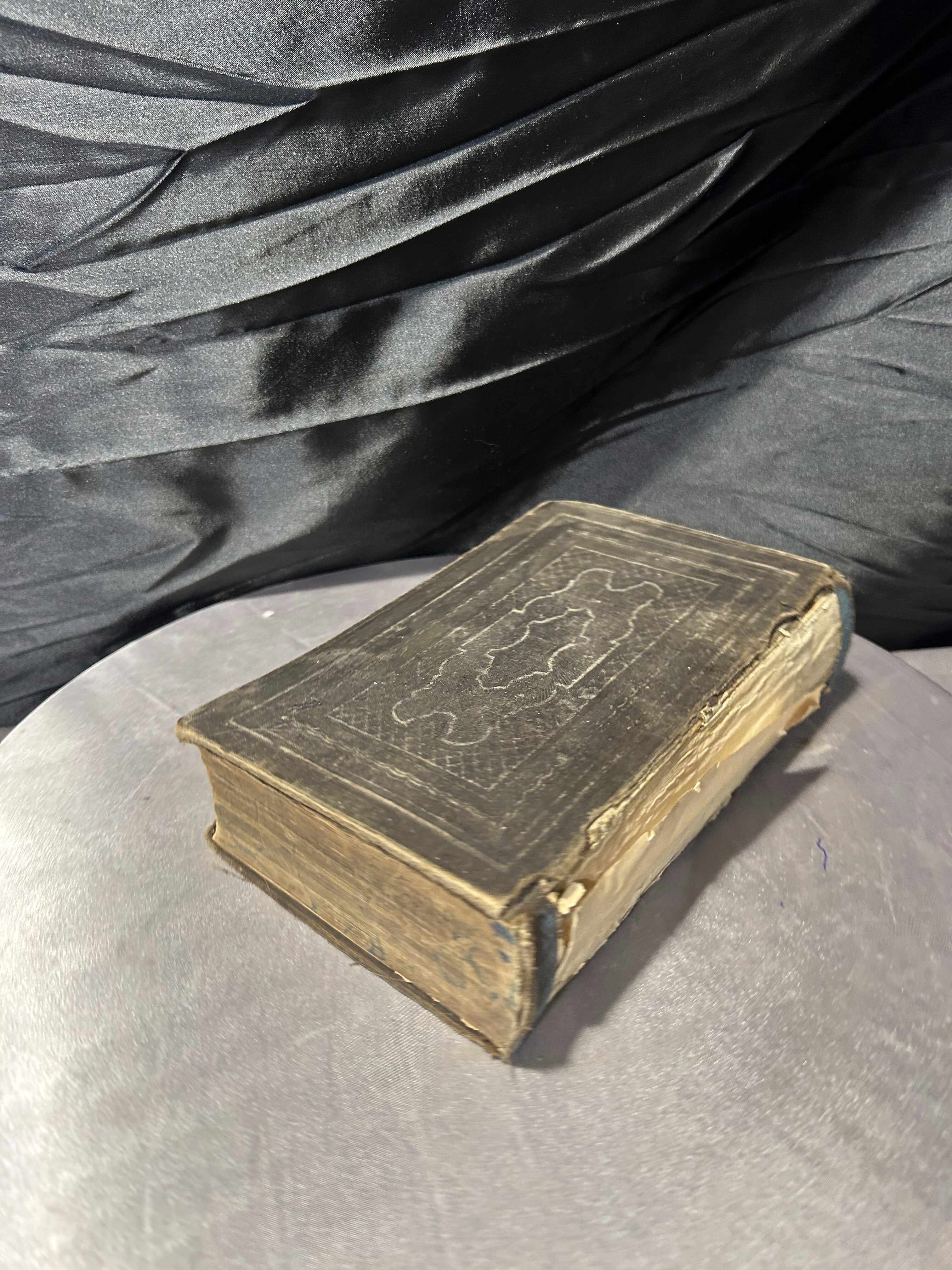 Egzemplarz posiada twardą, ozdobną okładkę typową dla XIX-wiecznych wydań. Widoczne są naturalne ślady upływu czasu, które podkreślają autentyczność i wiek książki. Brak grzbietu świadczy o długiej historii użytkowania, co jest częste w przypadku tak starych ksiąg.