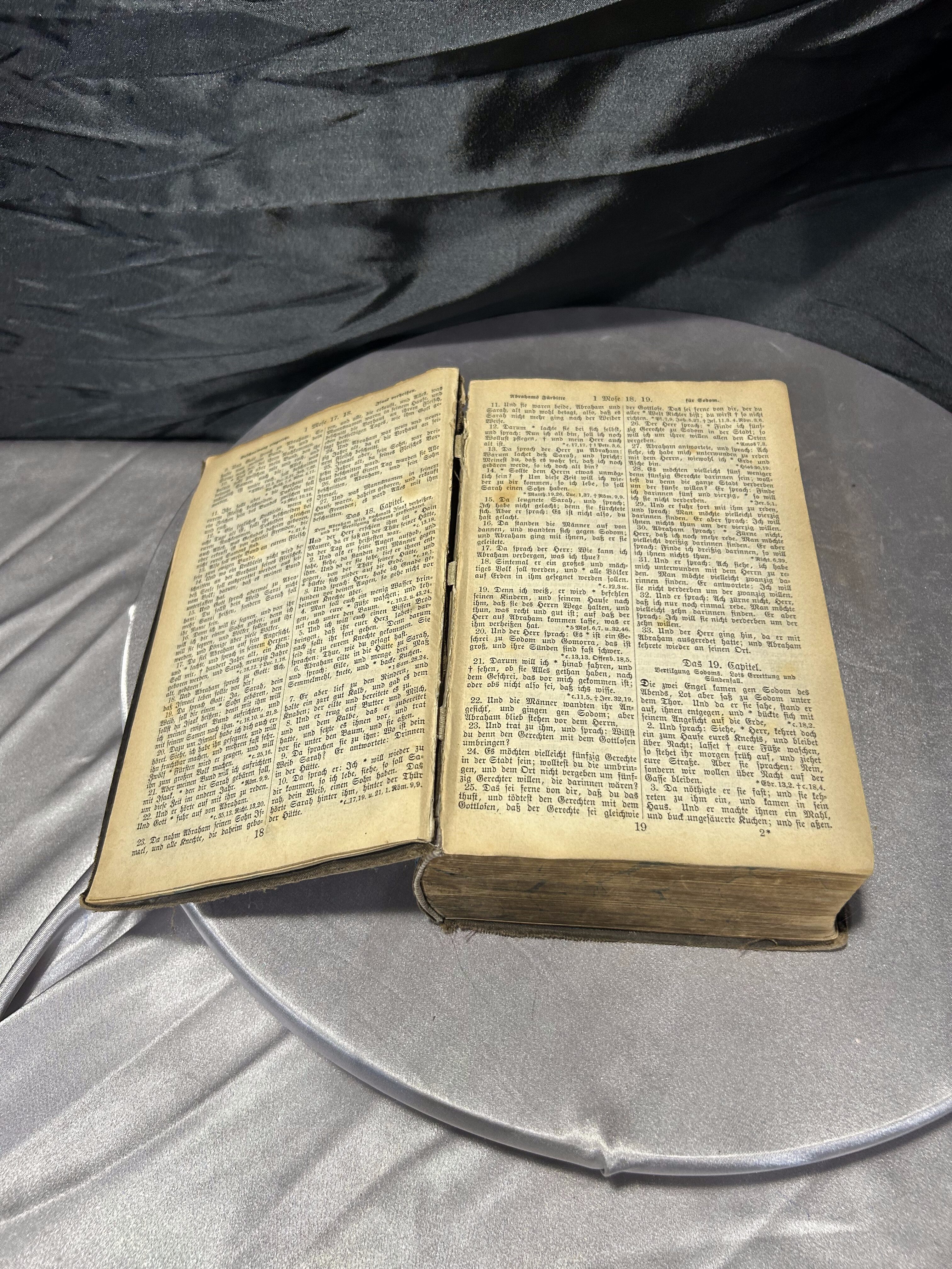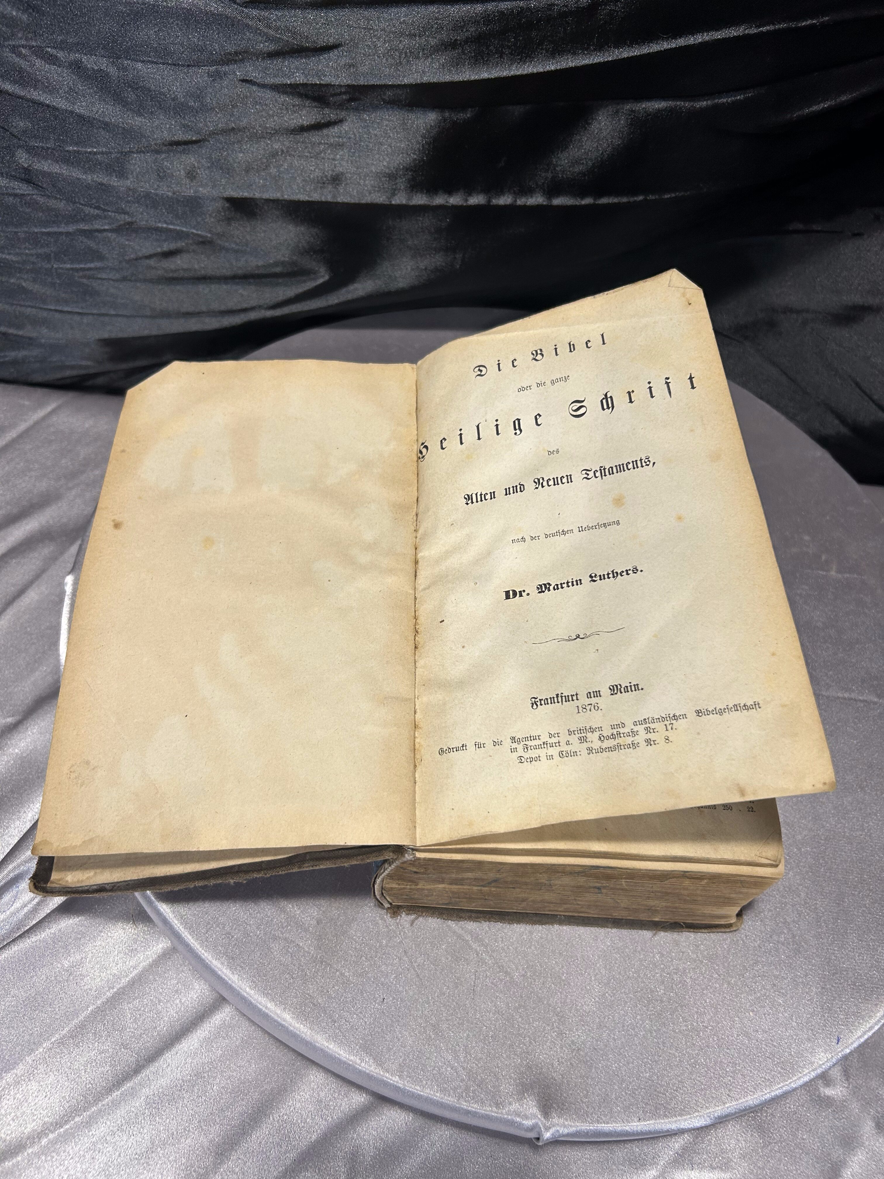 Oryginalne XIX-wieczne wydanie Biblii w tłumaczeniu doktora Marcina Lutra. Księga została wydana w 1876 roku we Frankfurcie nad Menem i zawiera pełne Pismo Święte – Stary oraz Nowy Testament.