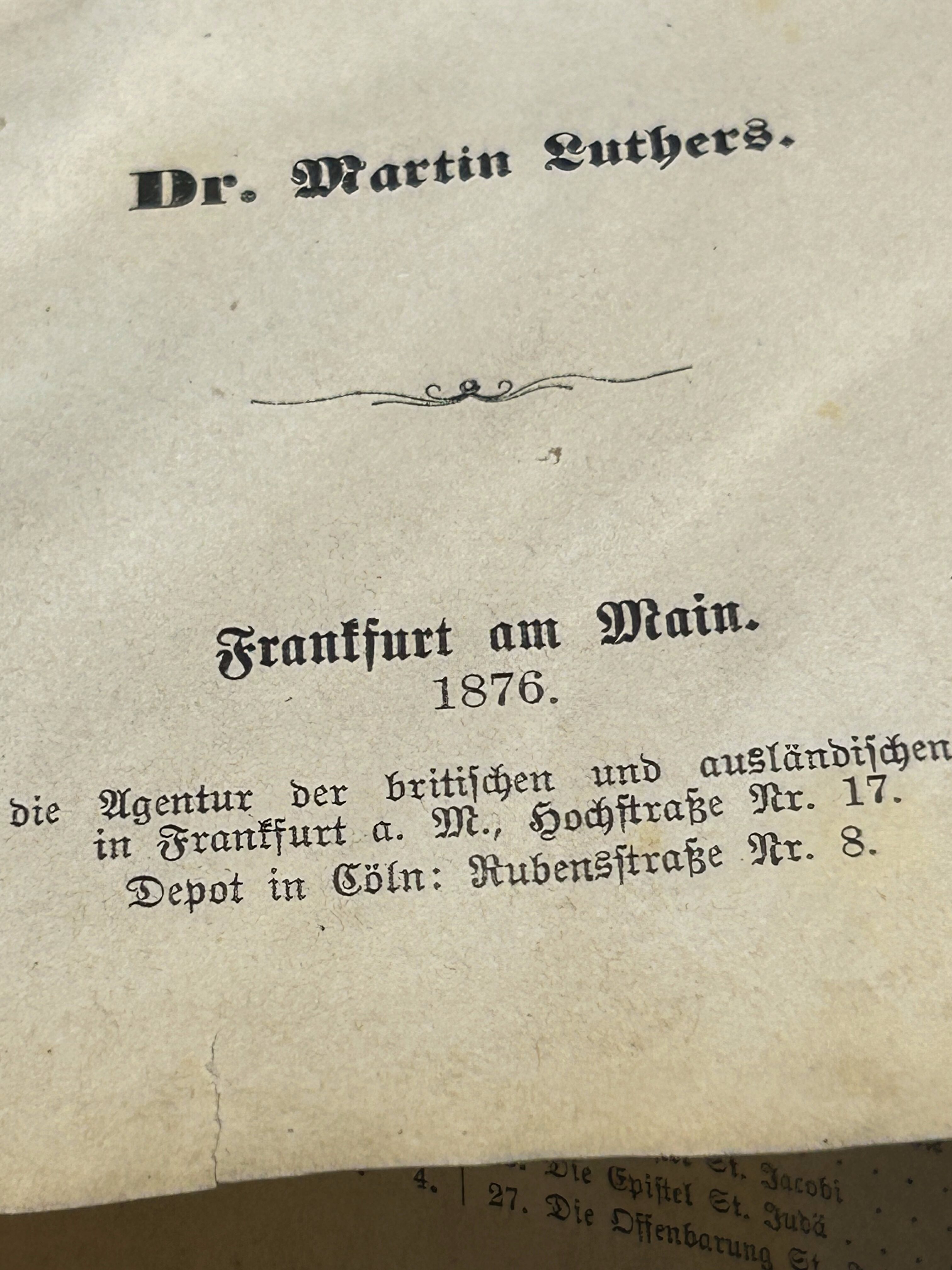 Stara Biblia z 1876 roku – tłumaczenie Marcina Lutra – Frankfurt