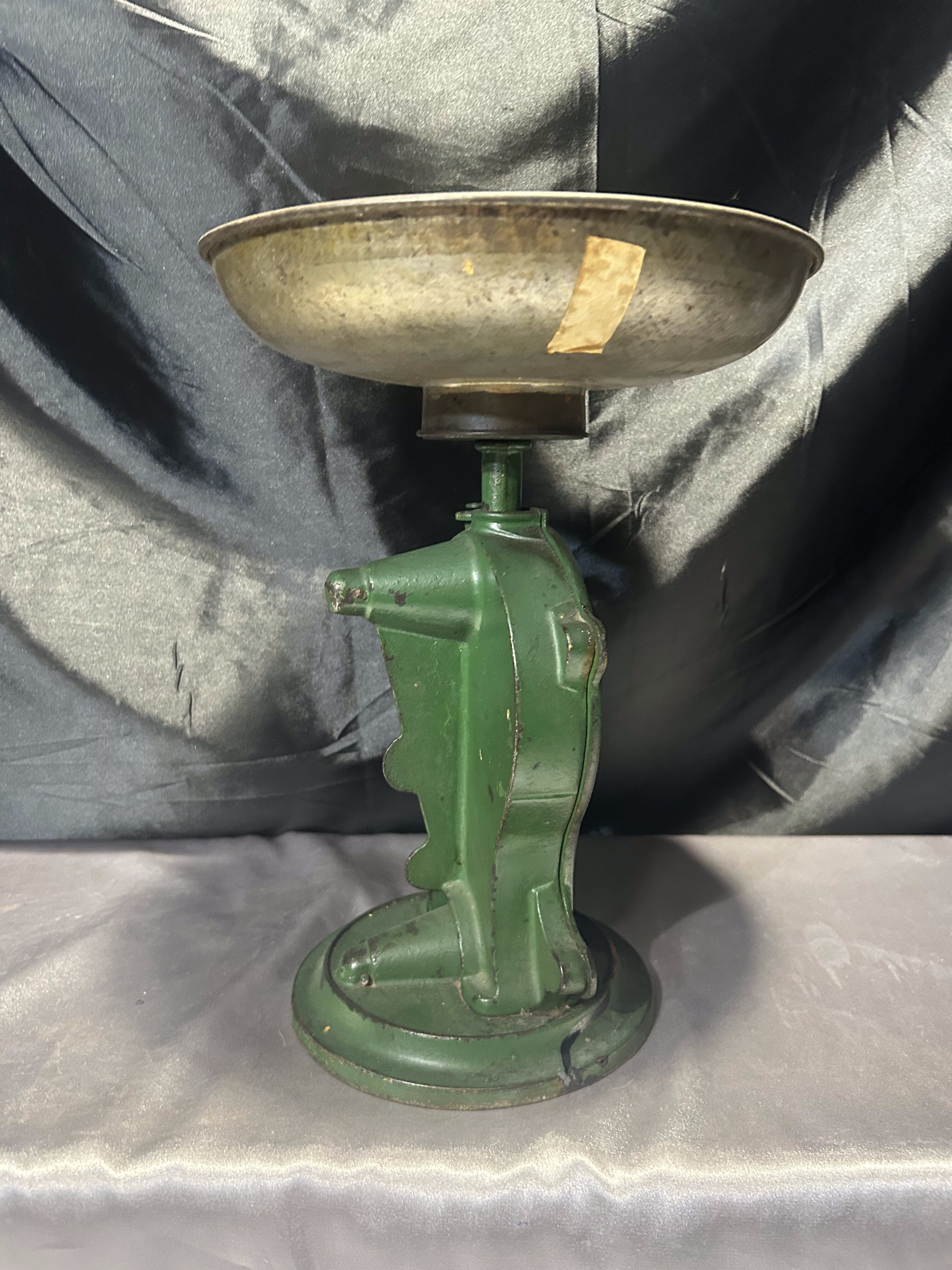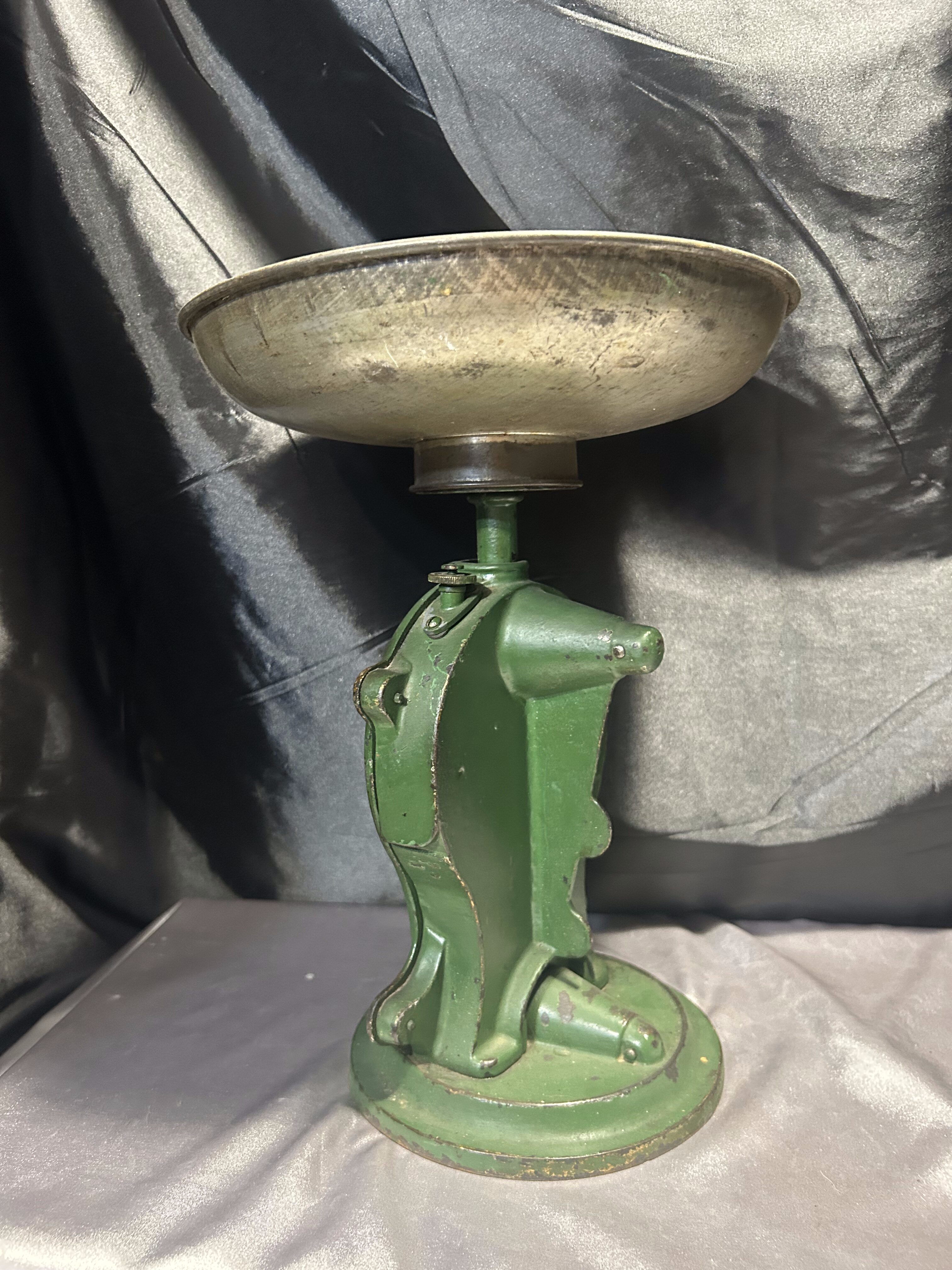 Na sprzedaż oryginalna, stara waga kuchenna w kolorze zielonym, wyposażona w duży, okrągły talerz i czytelną podziałkę do 10 kg. Masywna konstrukcja oraz klasyczny design czynią ją zarówno funkcjonalnym narzędziem, jak i dekoracyjnym elementem wnętrza w stylu vintage lub retro.