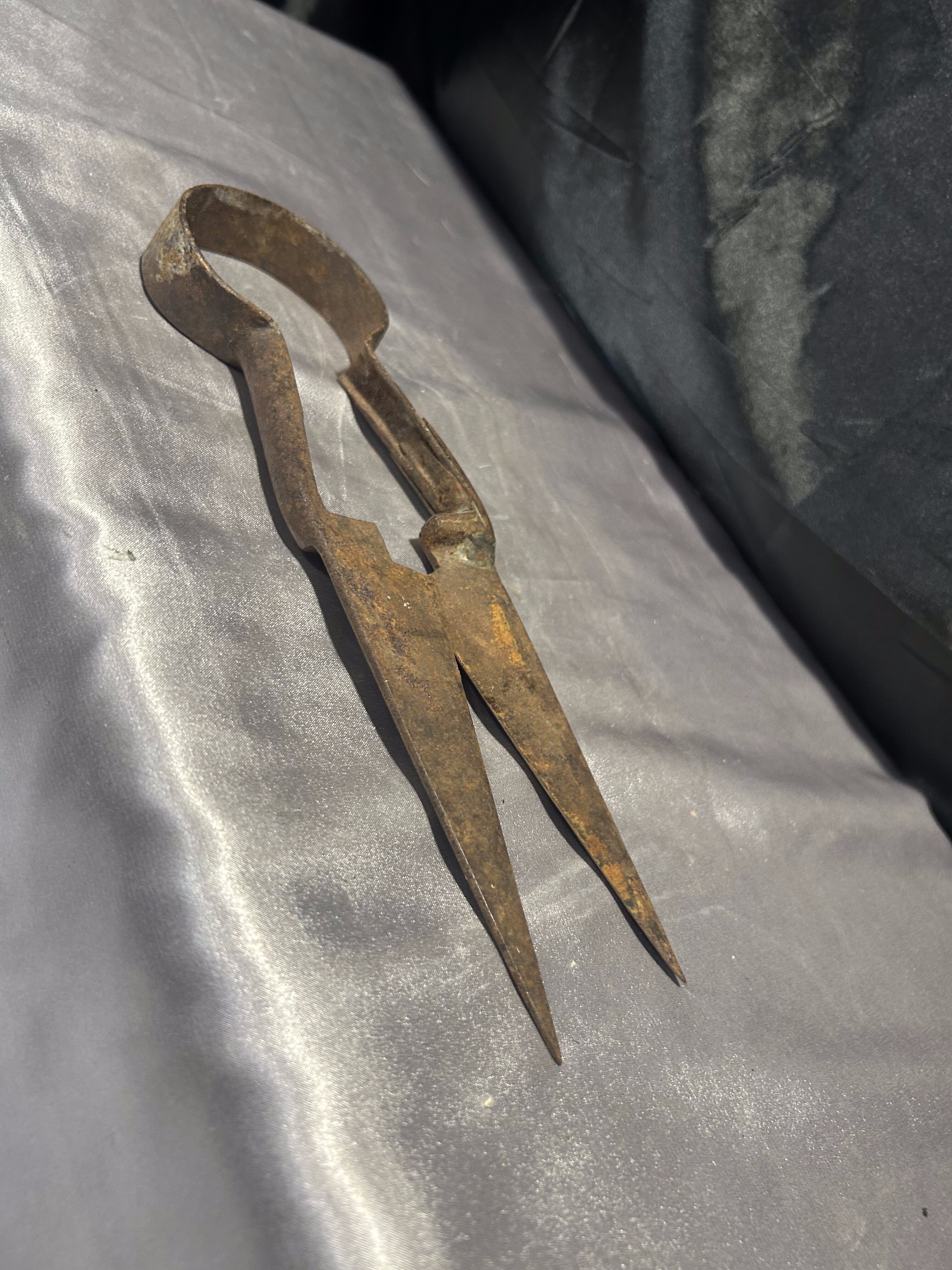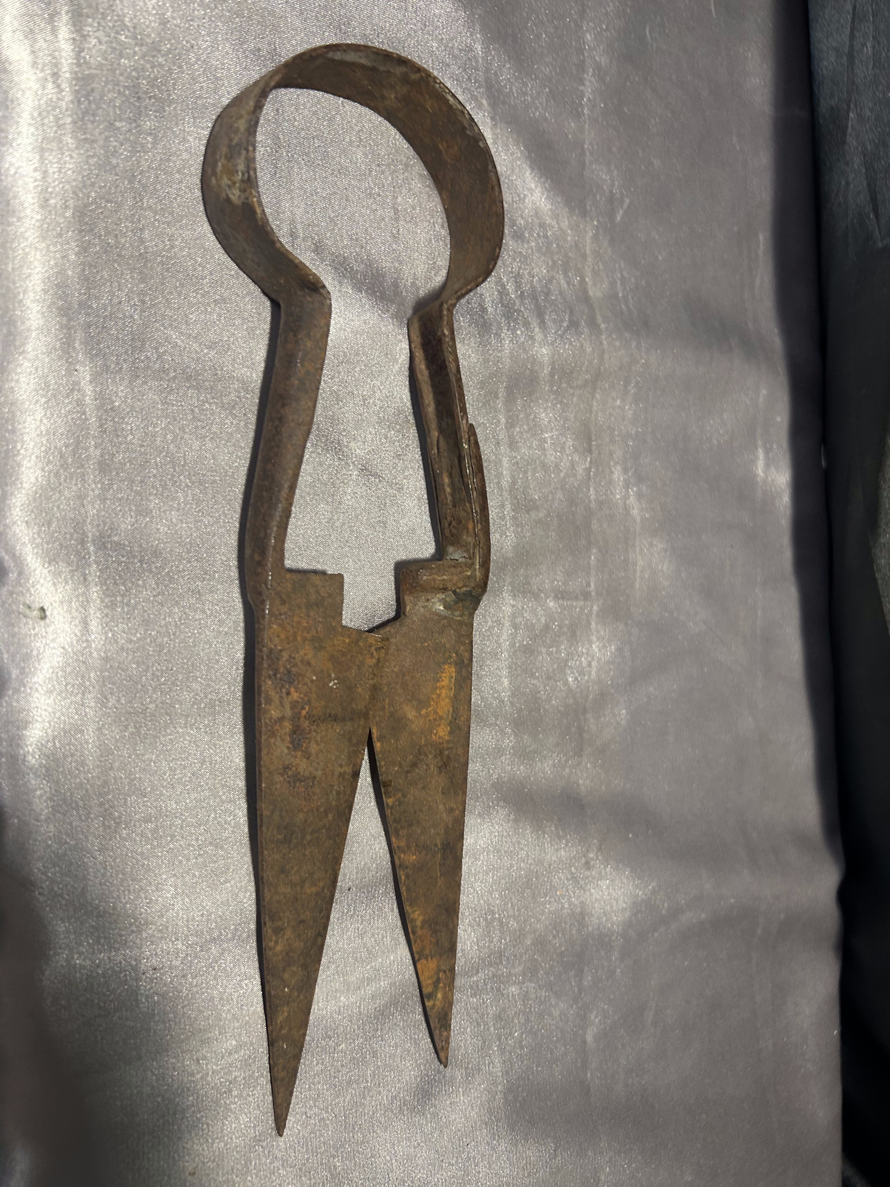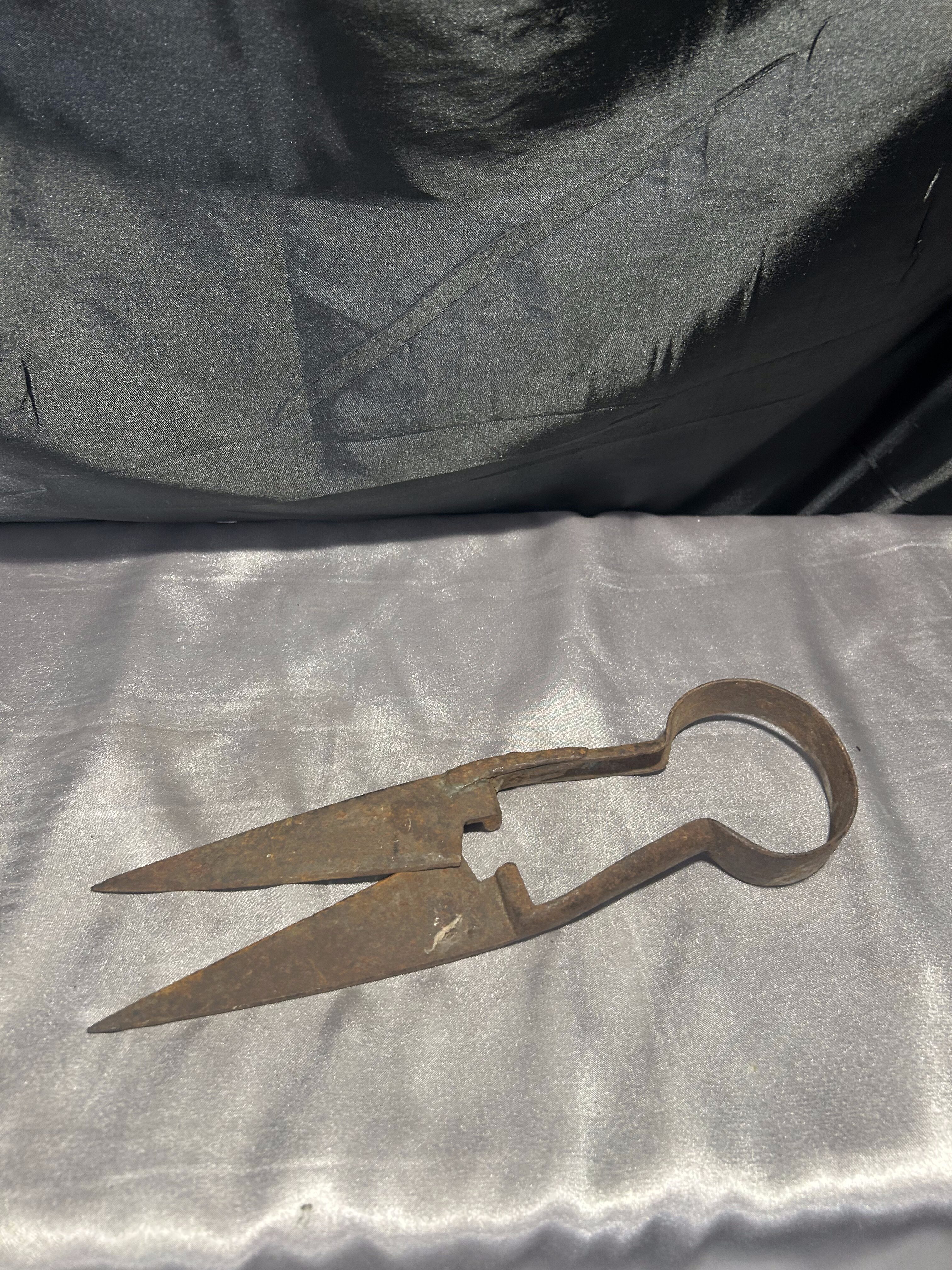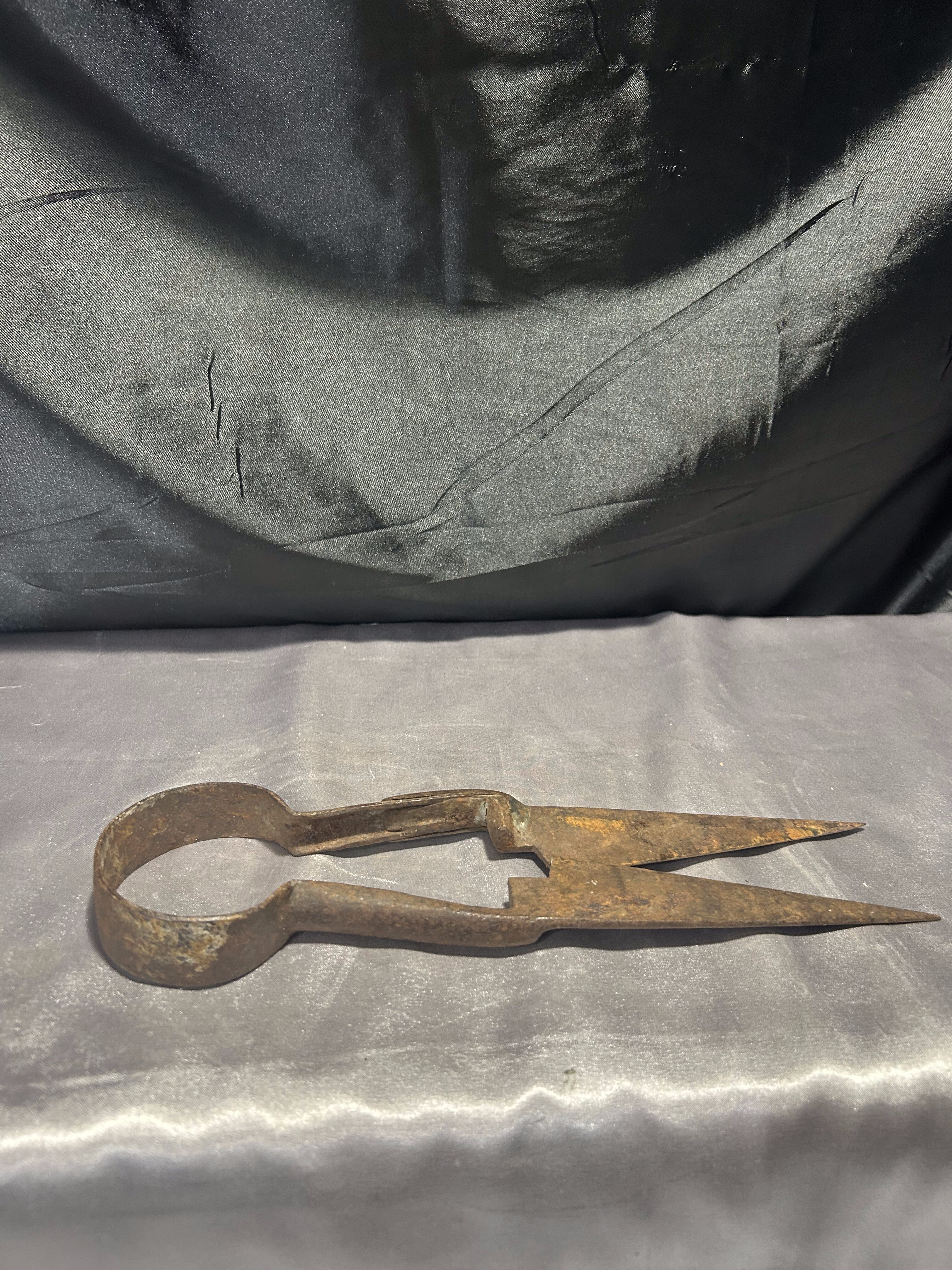 Autentyczne, stare nożyce do strzyżenia owiec, wykonane z masywnej stali. Zachowane w oryginalnym, zardzewiałym stanie, który podkreśla ich wiek oraz historyczny charakter.