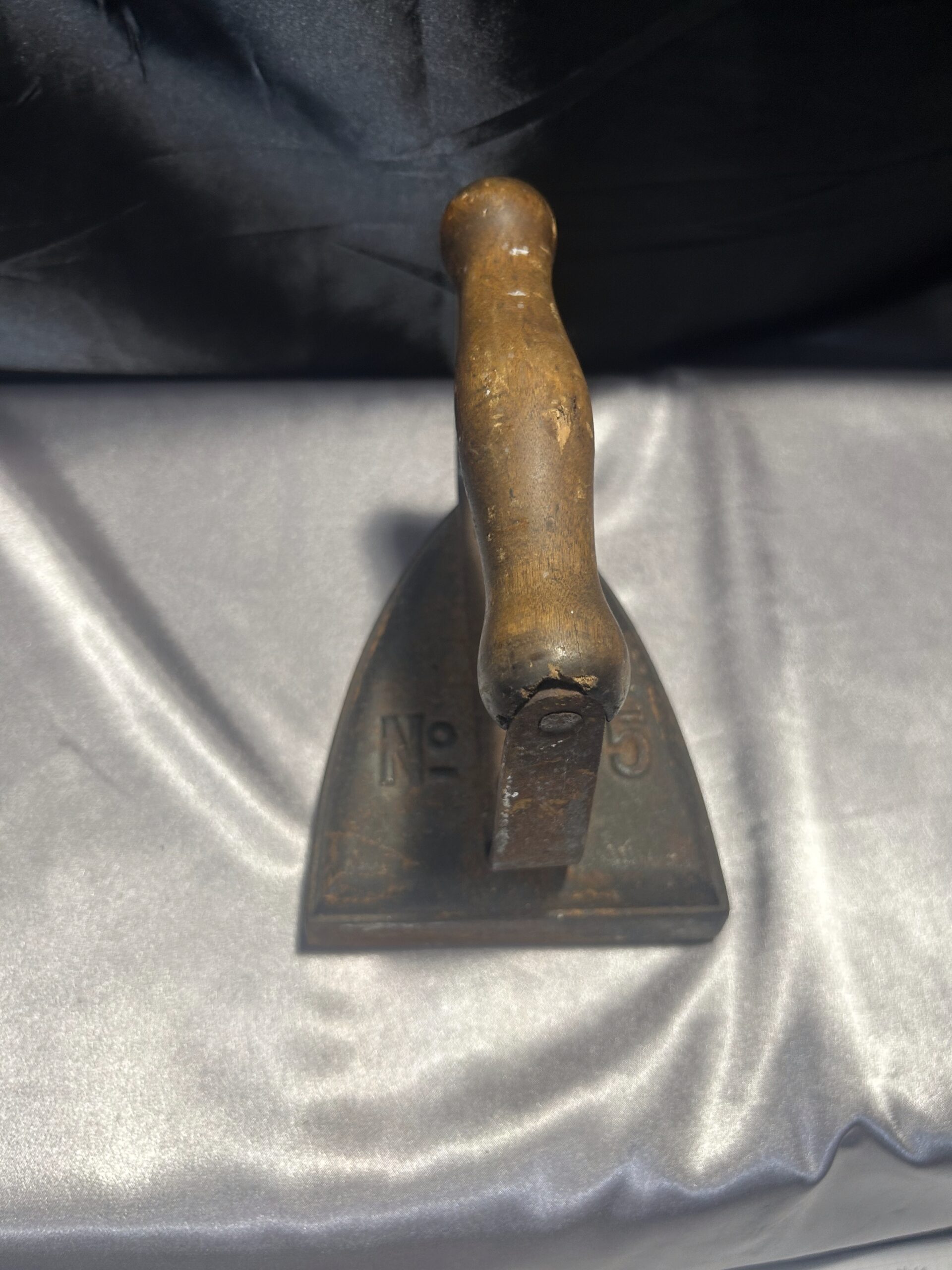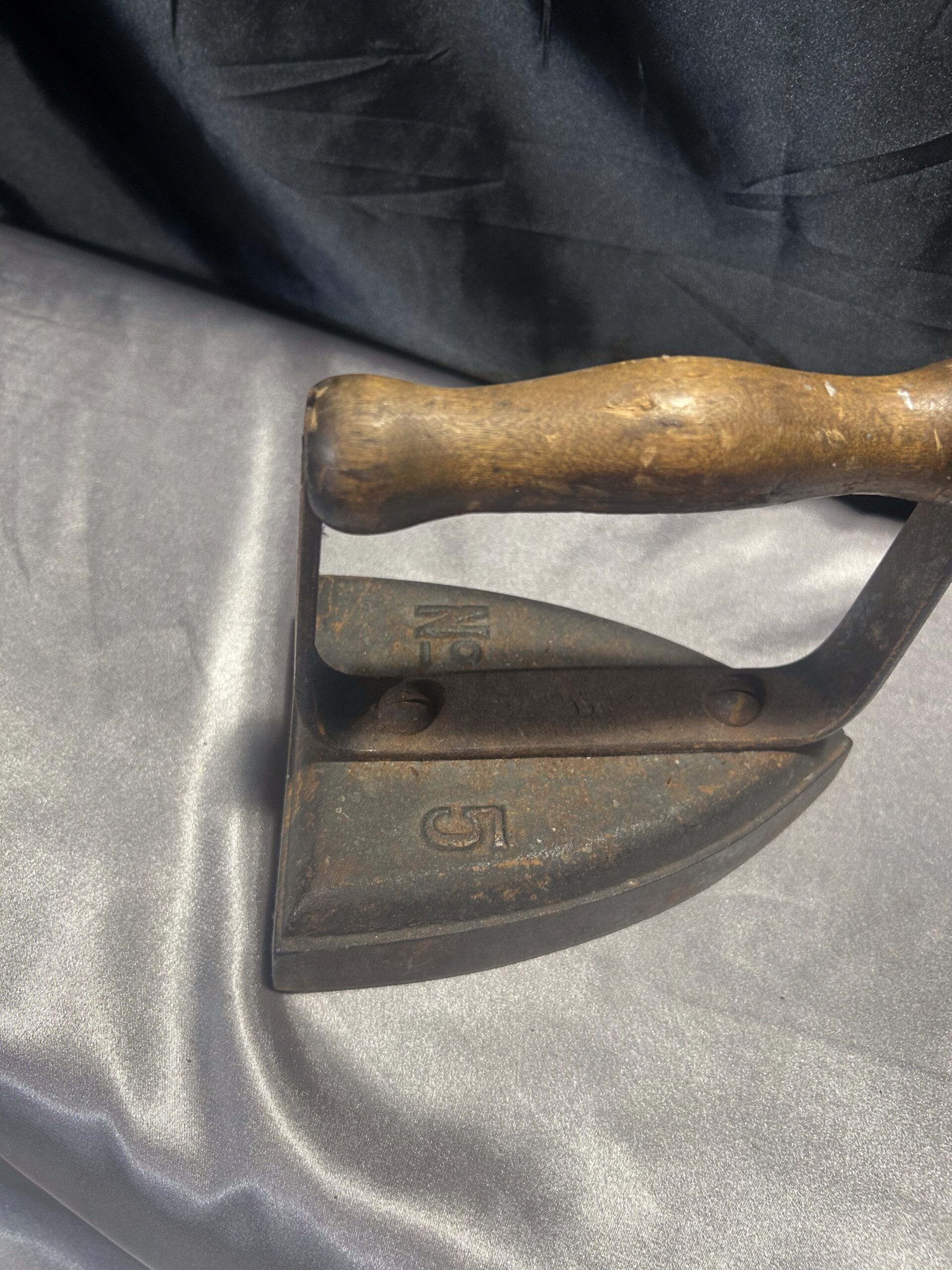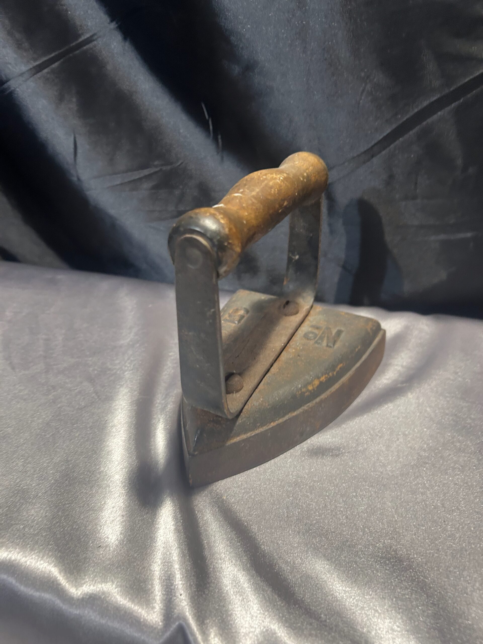 Solidne i eleganckie stare żelazko wykonane z żeliwa, z drewnianą rączką dodającą klasycznego uroku. Sygnowane NR 5, jest idealnym dodatkiem dla miłośników stylu vintage i retro dekoracji.