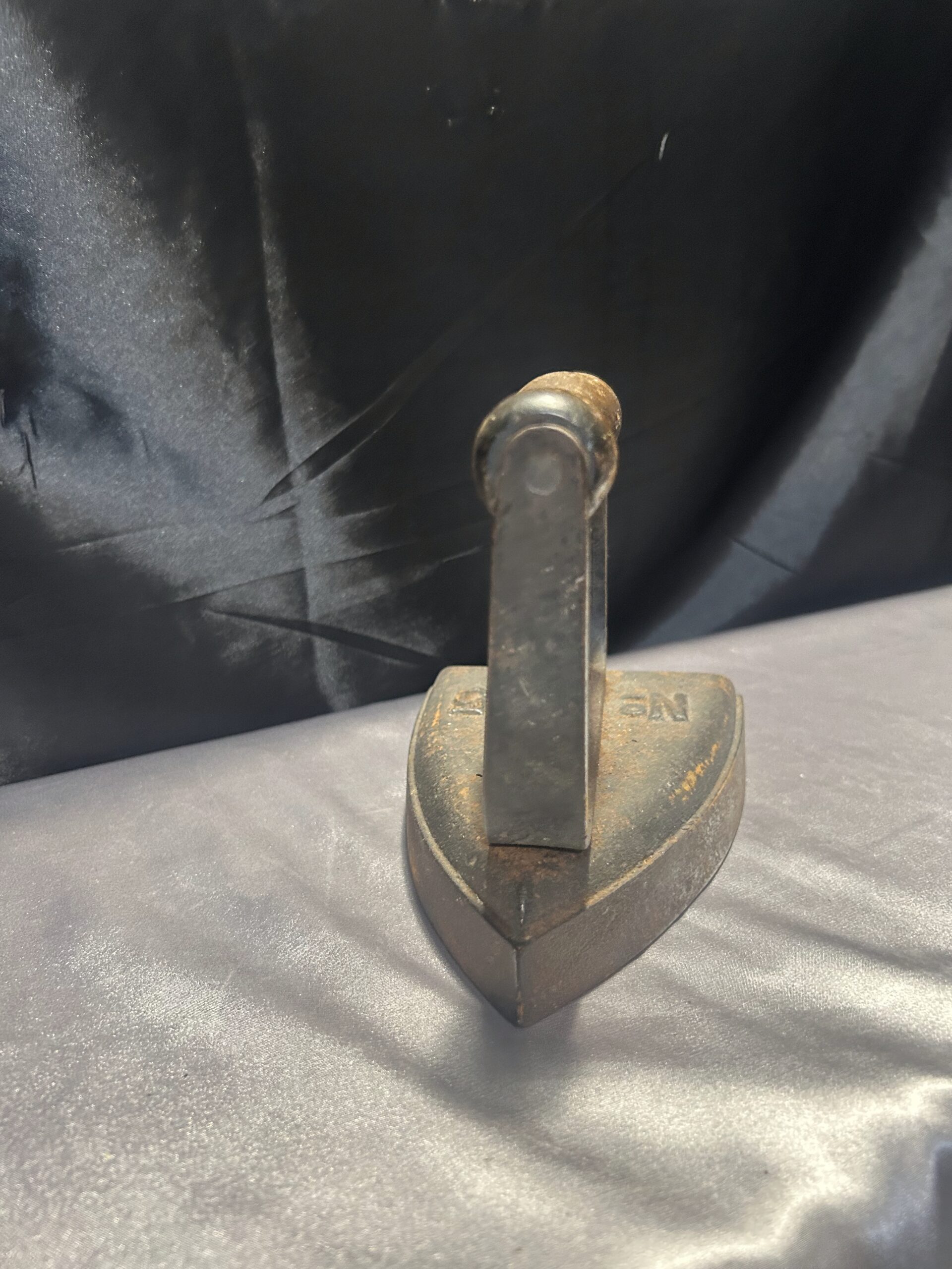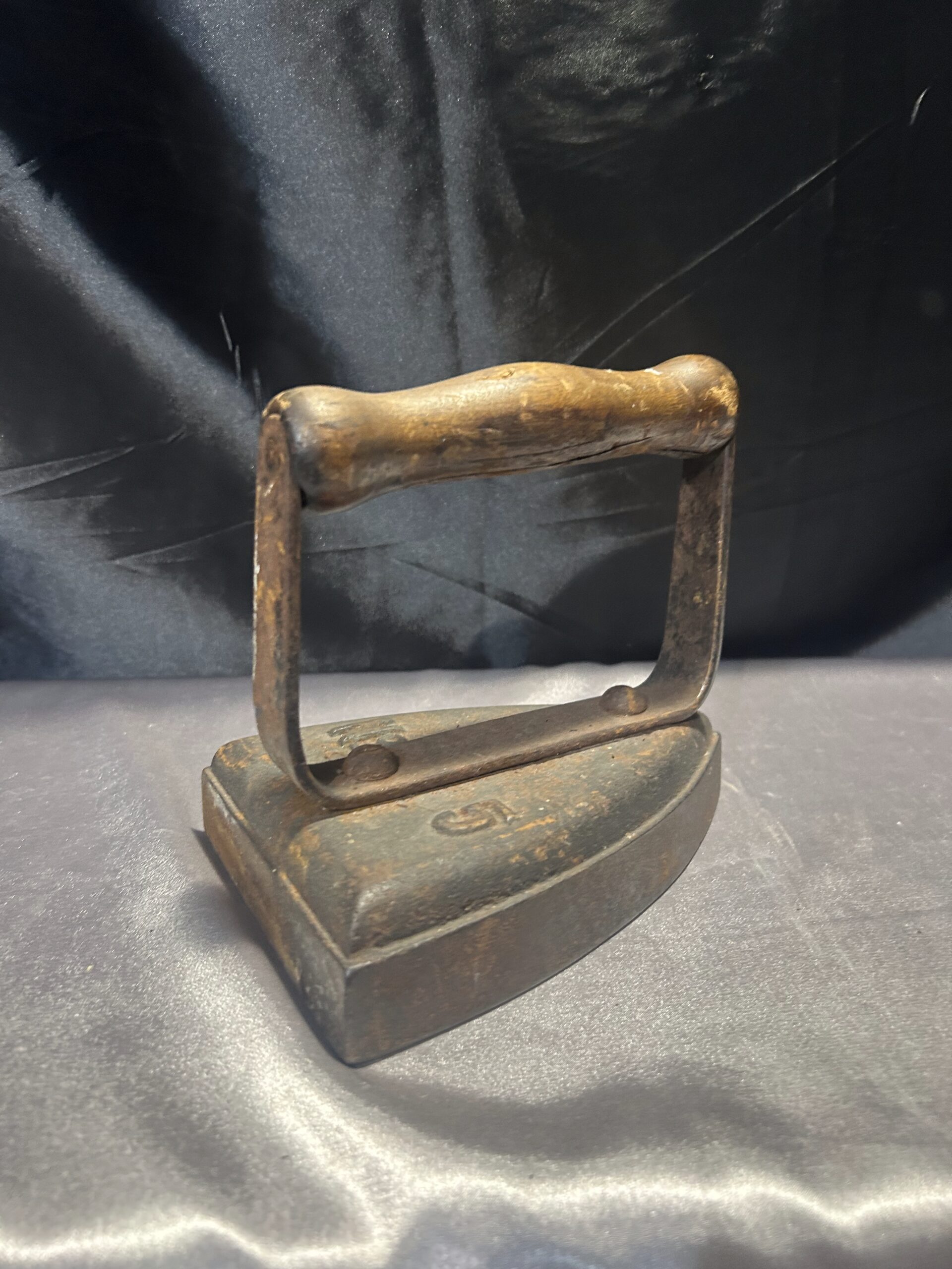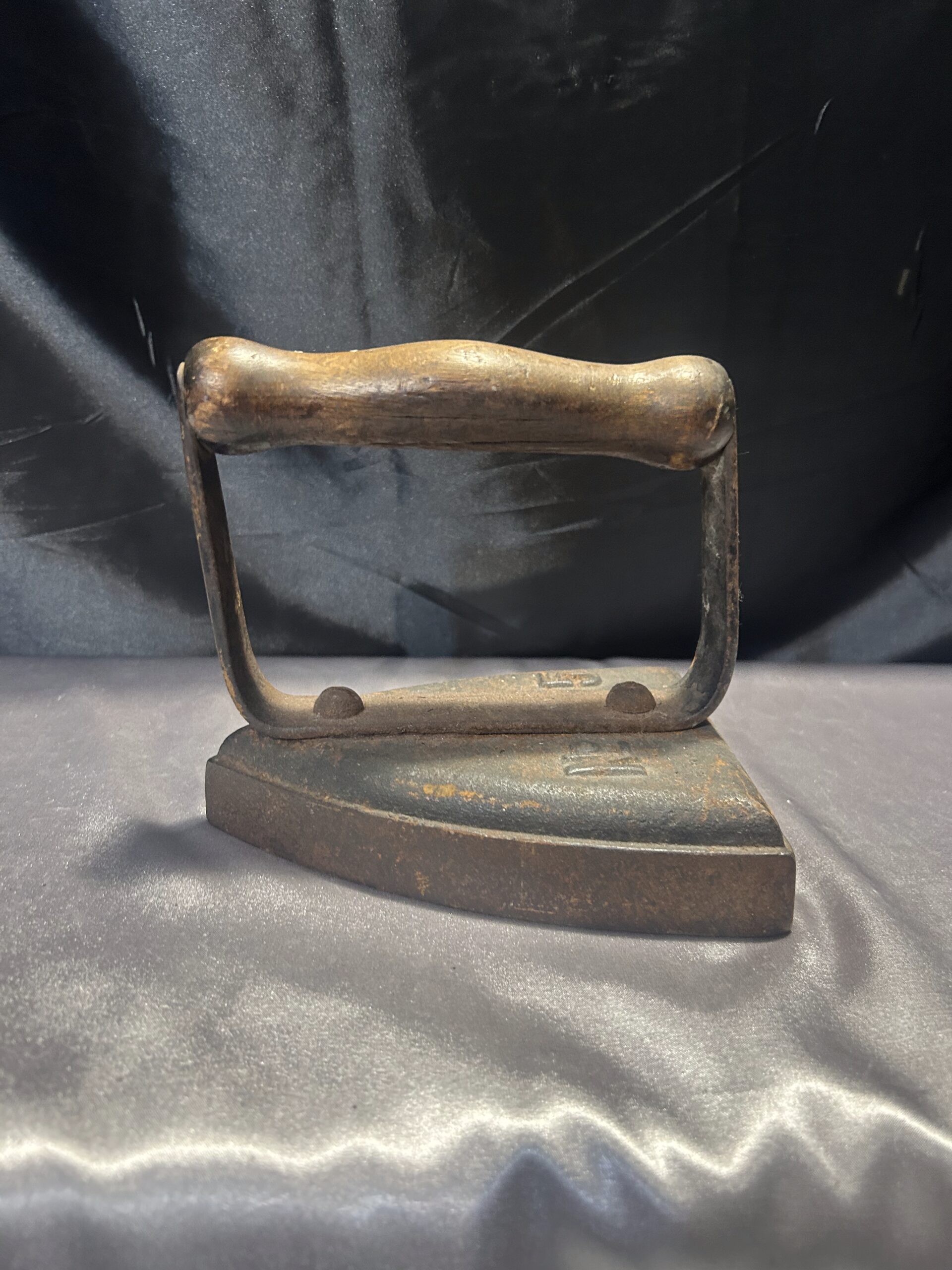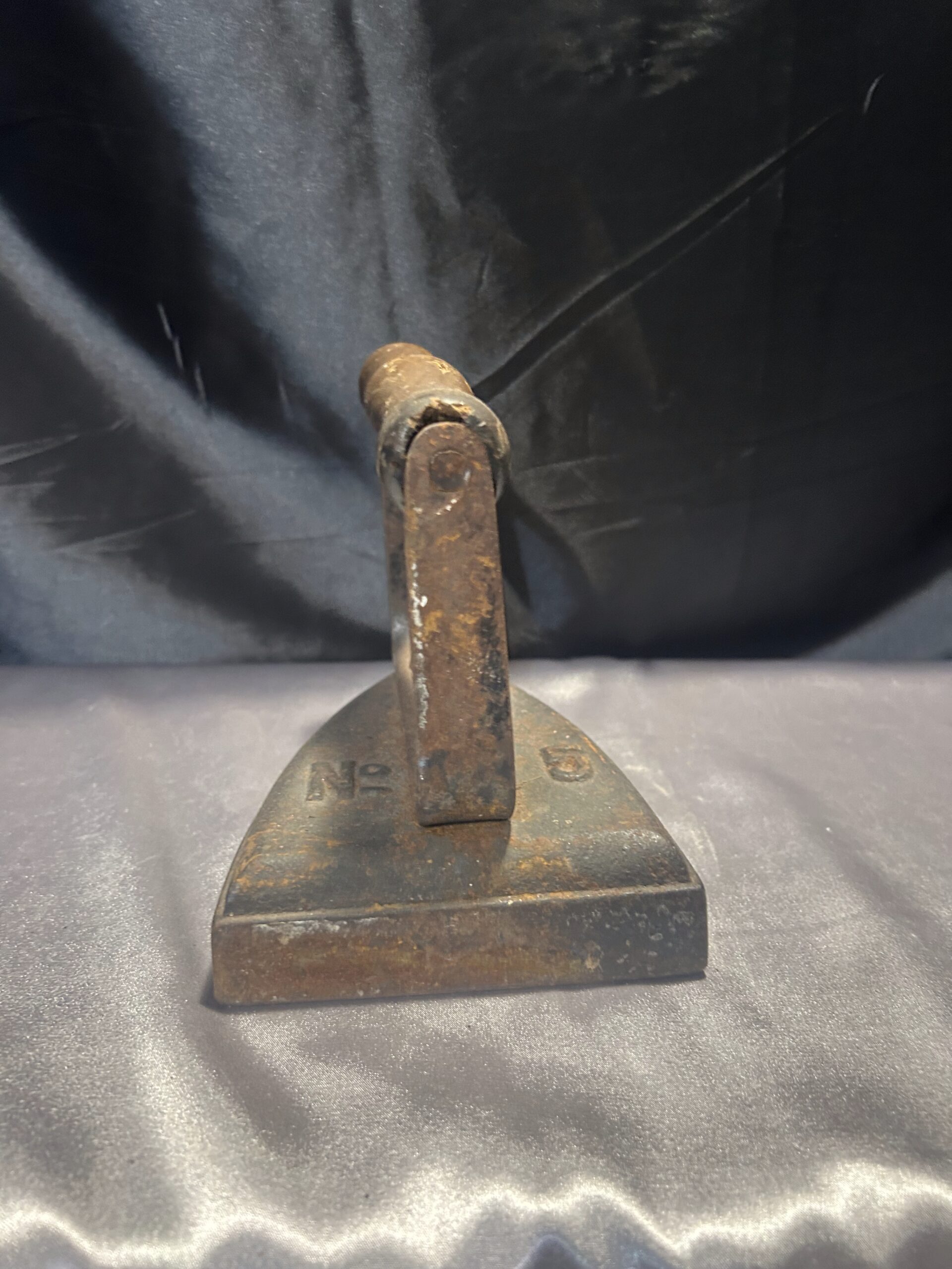Solidne i eleganckie stare żelazko wykonane z żeliwa, z drewnianą rączką dodającą klasycznego uroku. Sygnowane NR 5, jest idealnym dodatkiem dla miłośników stylu vintage i retro dekoracji.