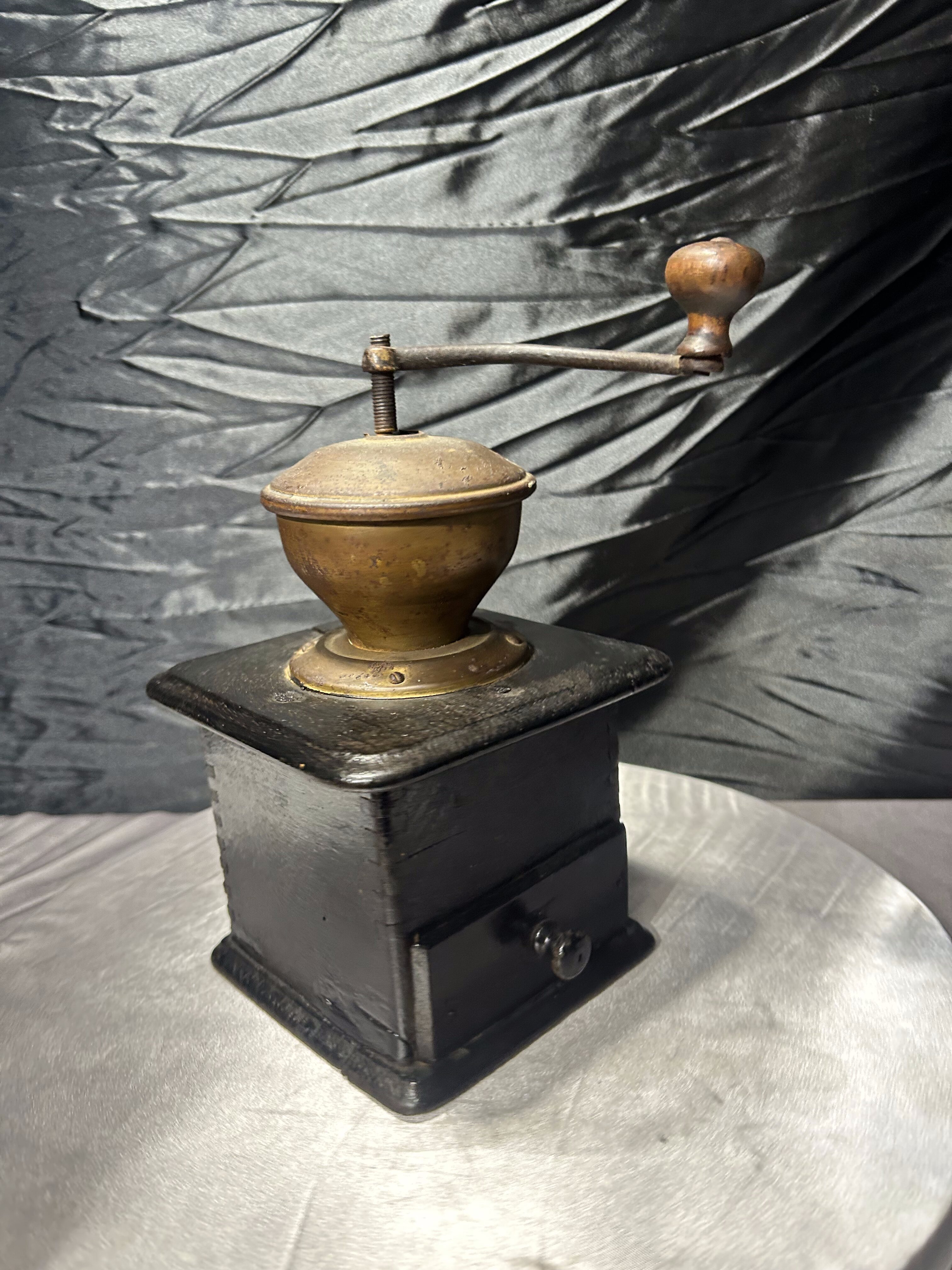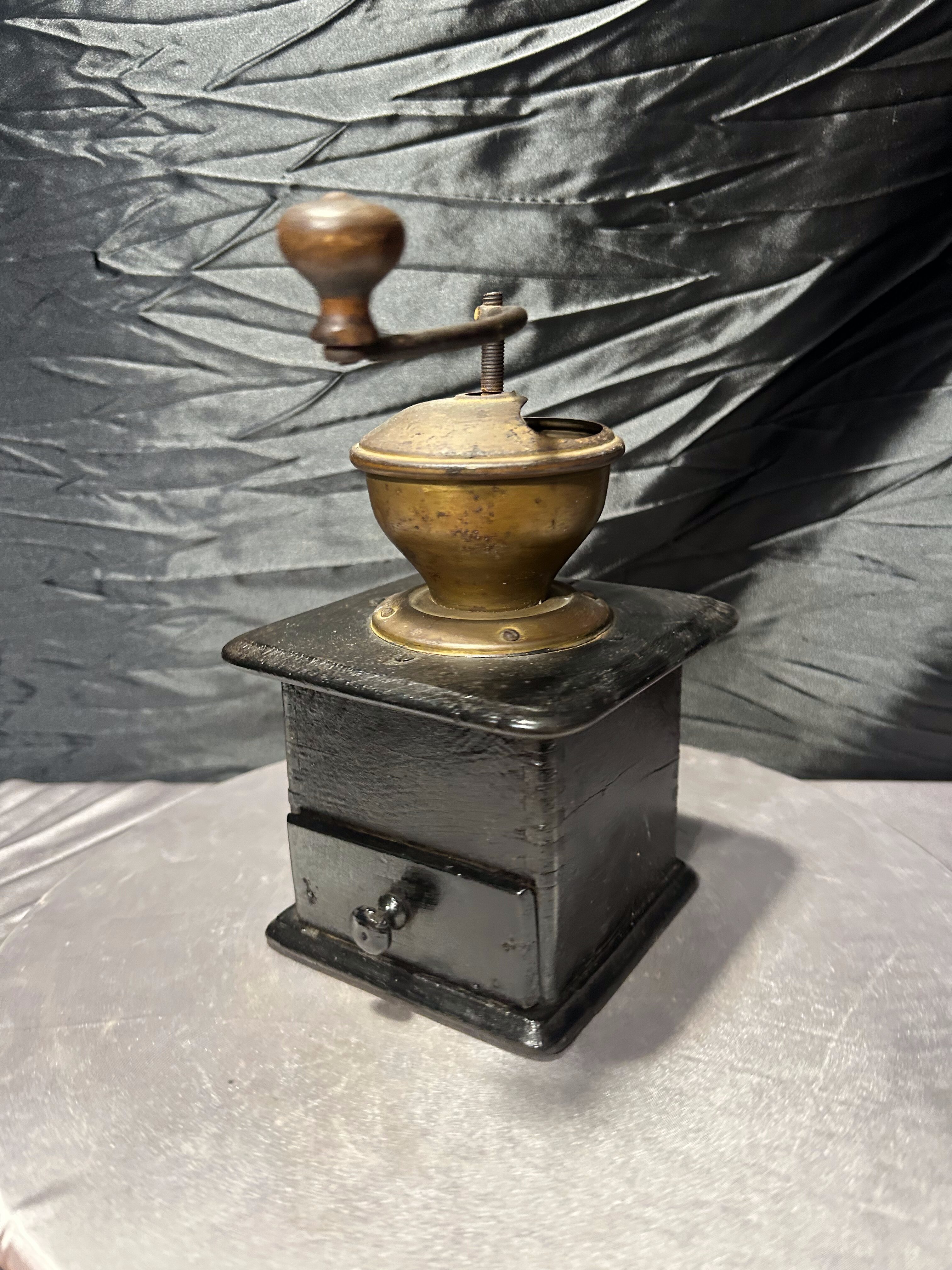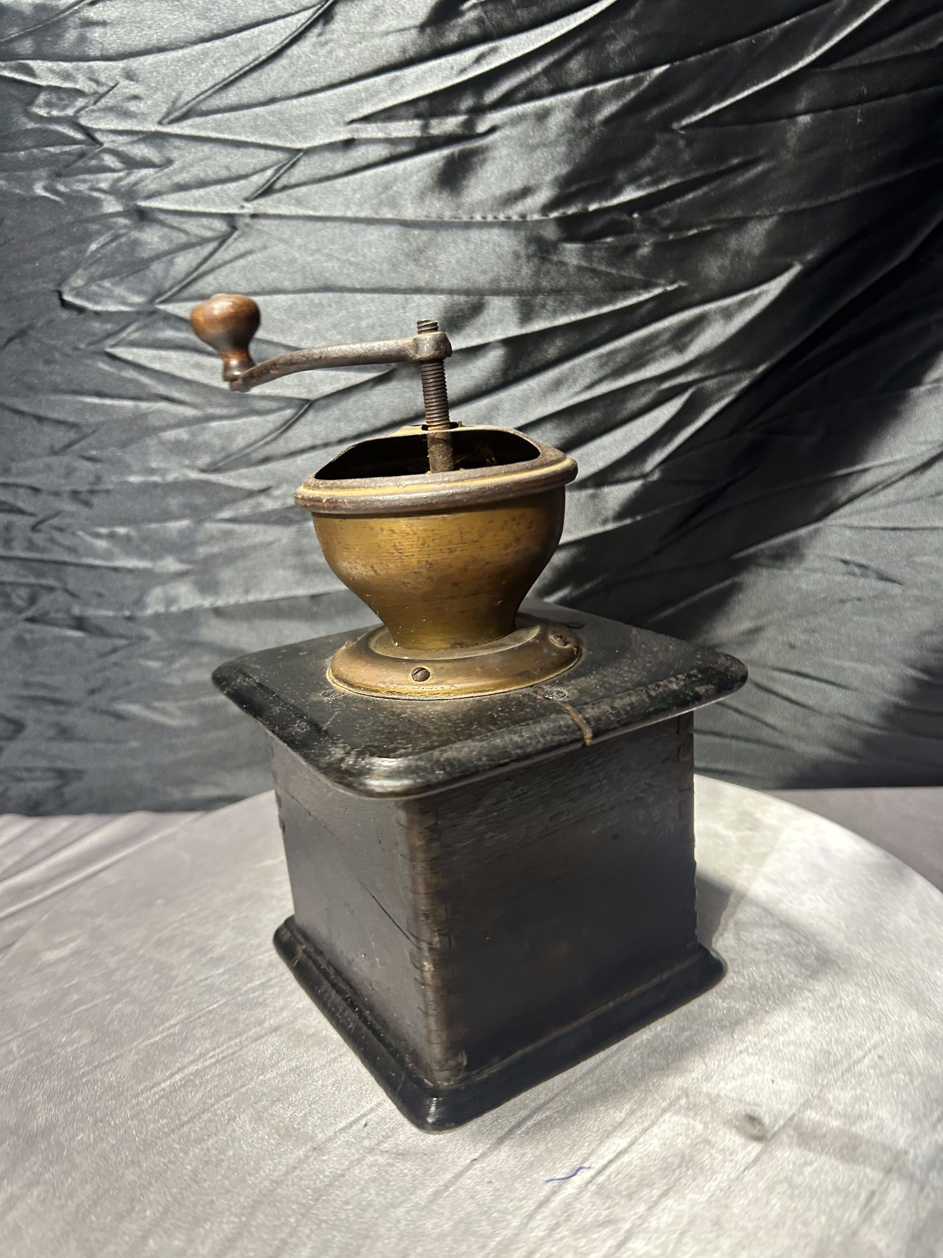 Stary, ręczny młynek do kawyzadla kawy wykonany z drewna, o klasycznej, ponadczasowej formie. Zasypywany od góry, wyposażony w metalowy mechanizm mielący oraz praktyczną wysuwaną szufladkę na zmieloną kawę. Prosta, solidna konstrukcja i naturalna patyna użytkowania podkreślają jego autentyczny, vintage’owy charakter.