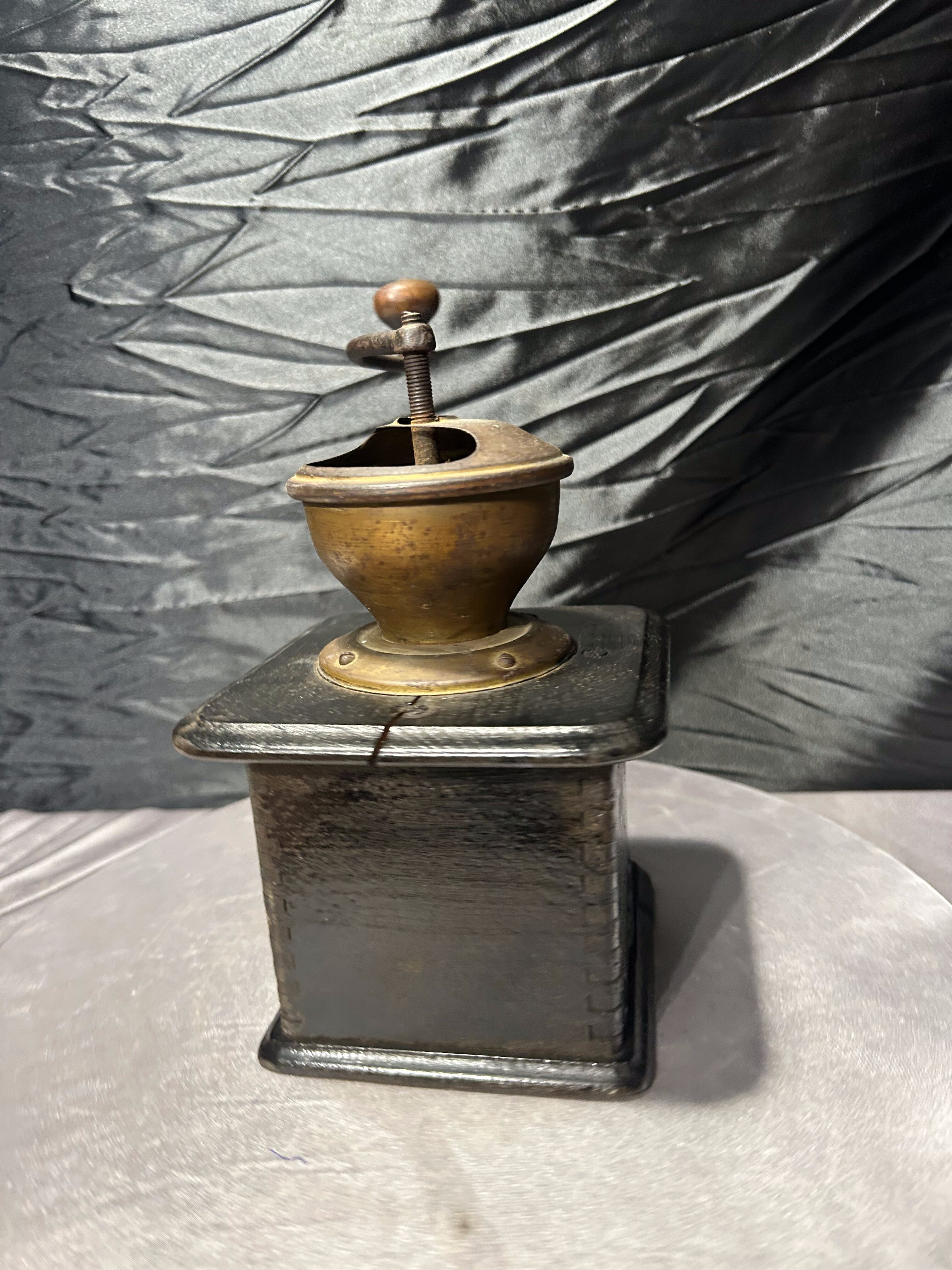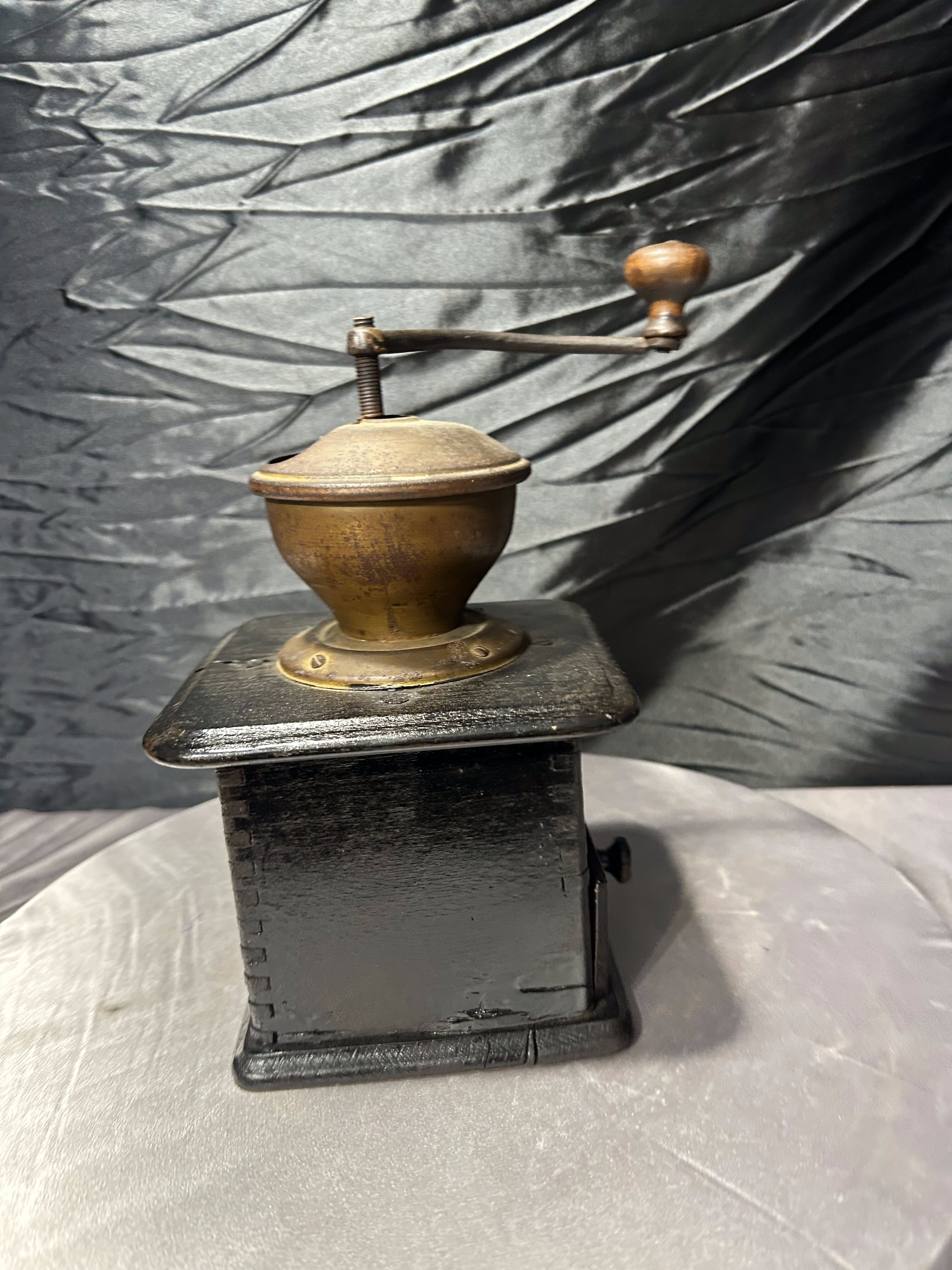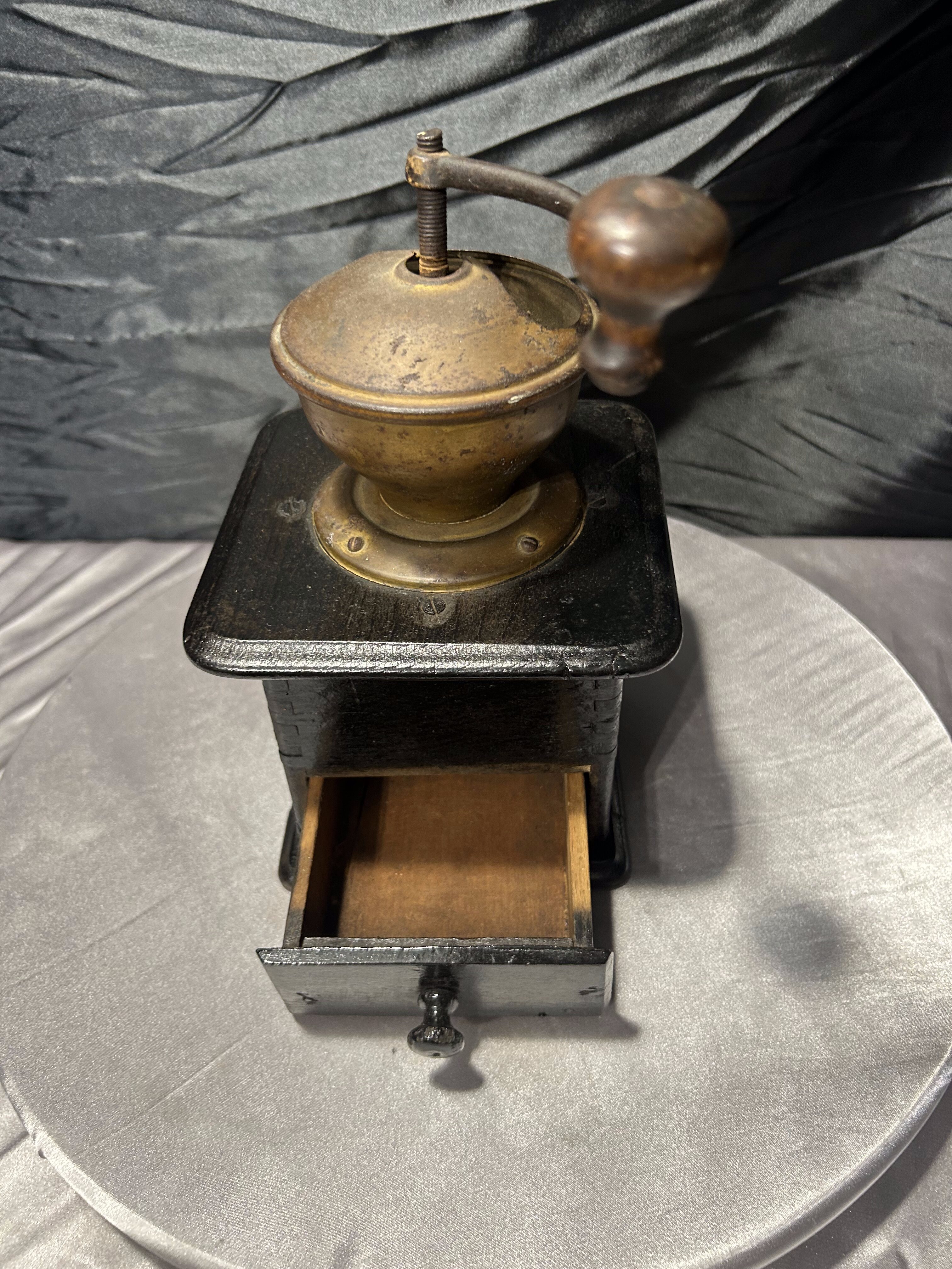 Stary, ręczny młynek do kawyzadla kawy wykonany z drewna, o klasycznej, ponadczasowej formie. Zasypywany od góry, wyposażony w metalowy mechanizm mielący oraz praktyczną wysuwaną szufladkę na zmieloną kawę. Prosta, solidna konstrukcja i naturalna patyna użytkowania podkreślają jego autentyczny, vintage’owy charakter.