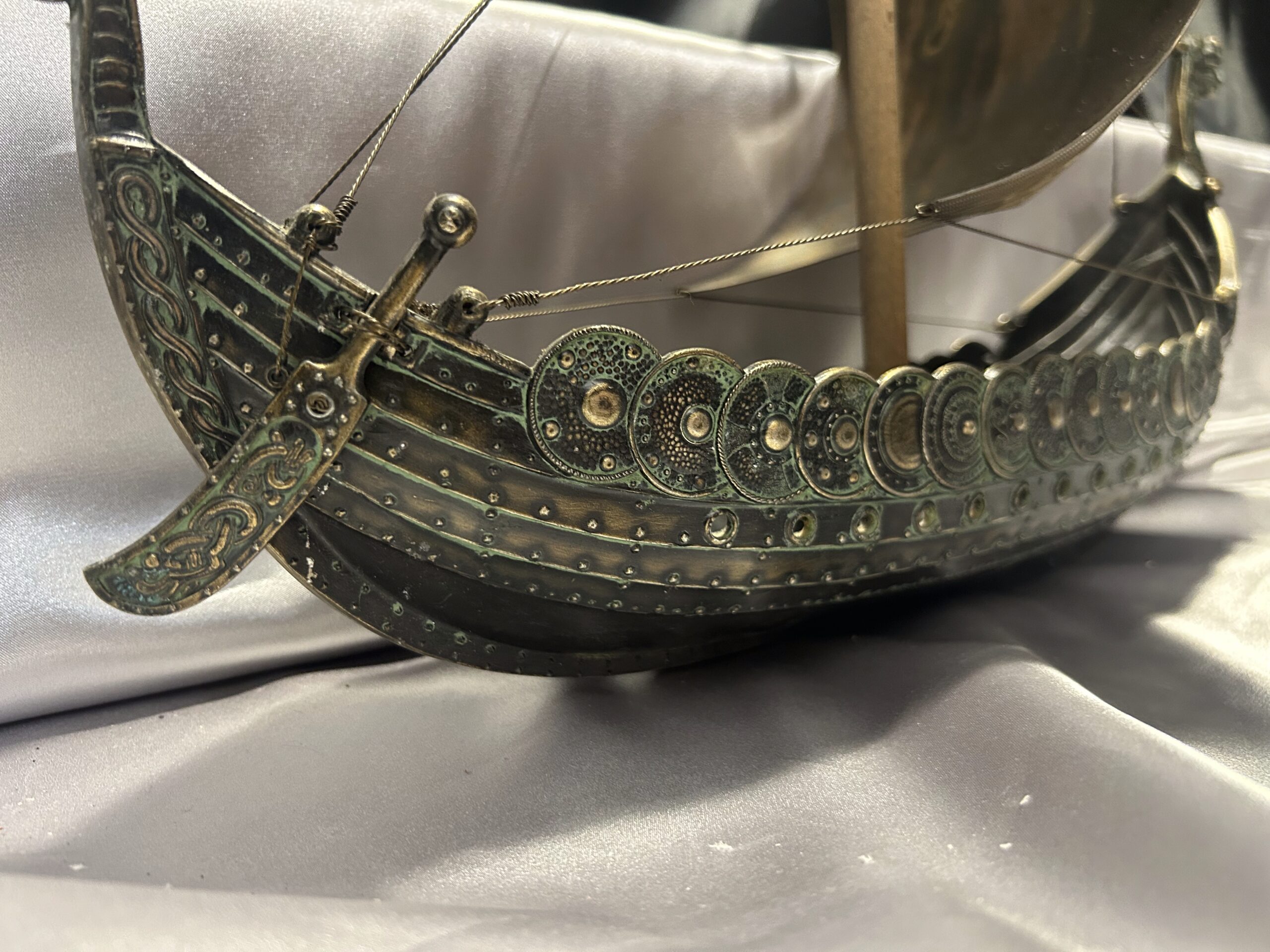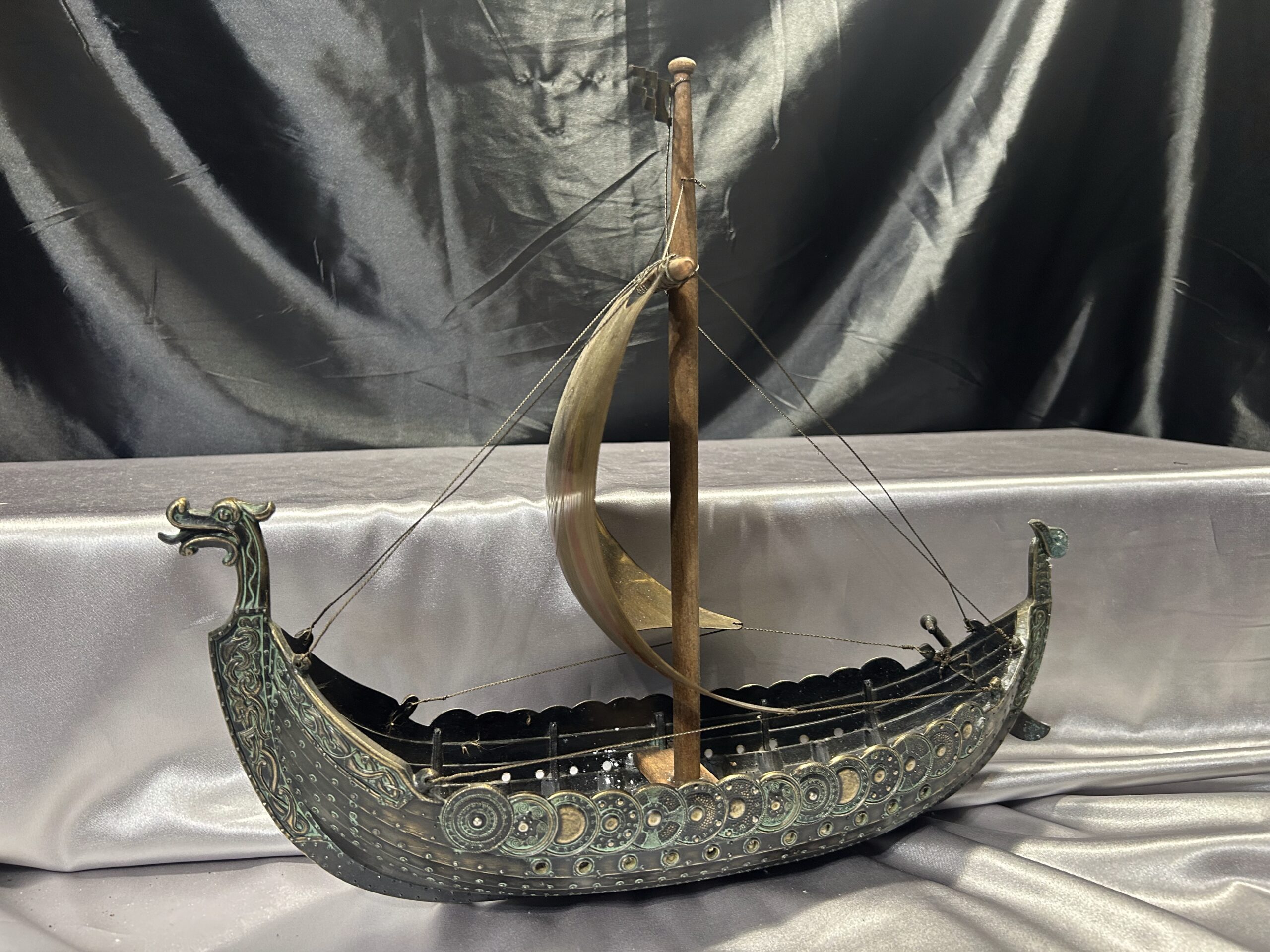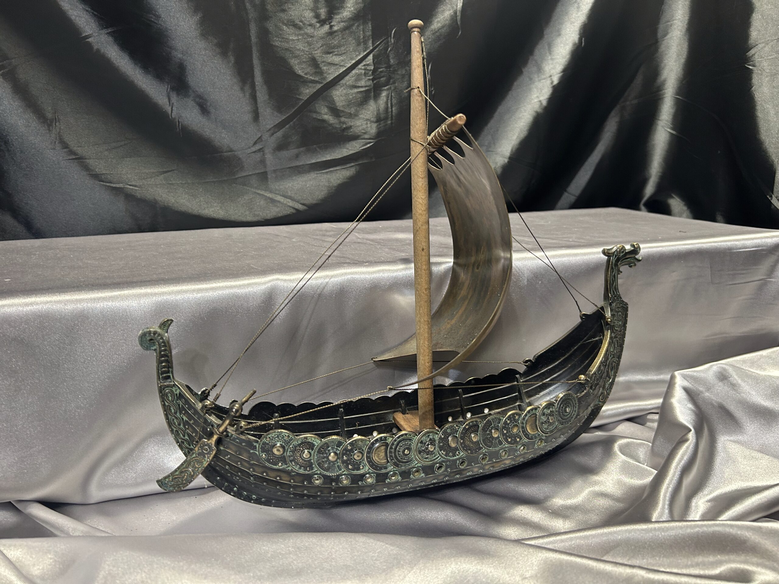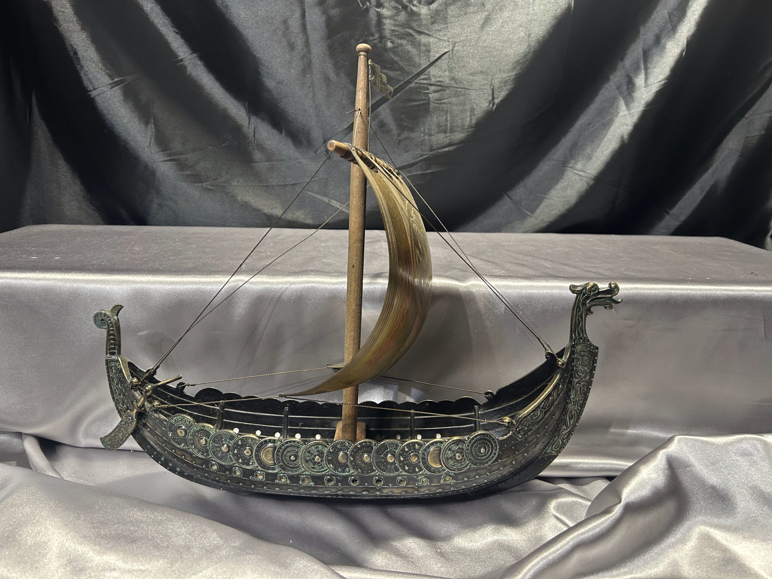 Statek wikinga z głową smoka – metalowy model na drewnianej podstawie