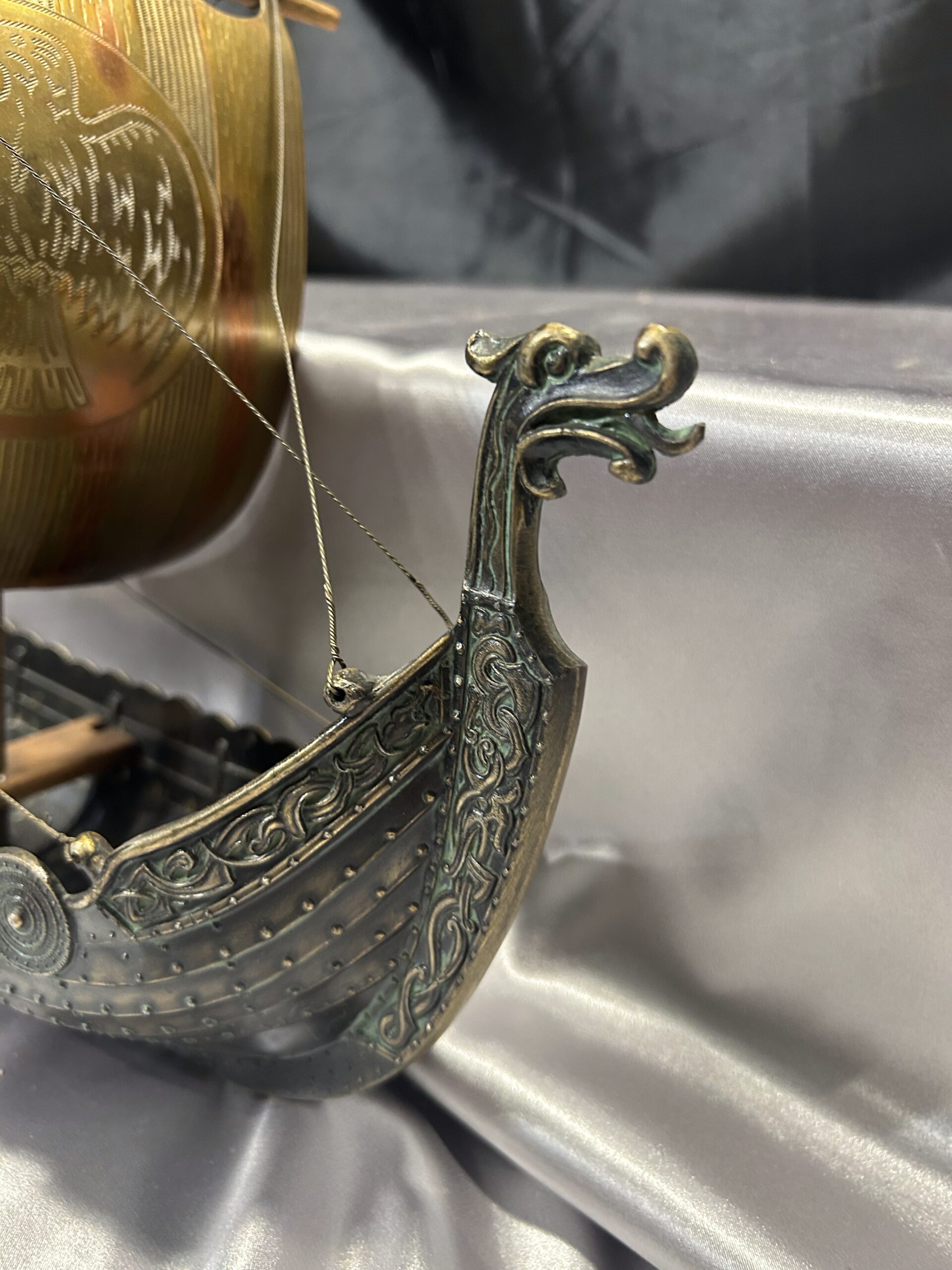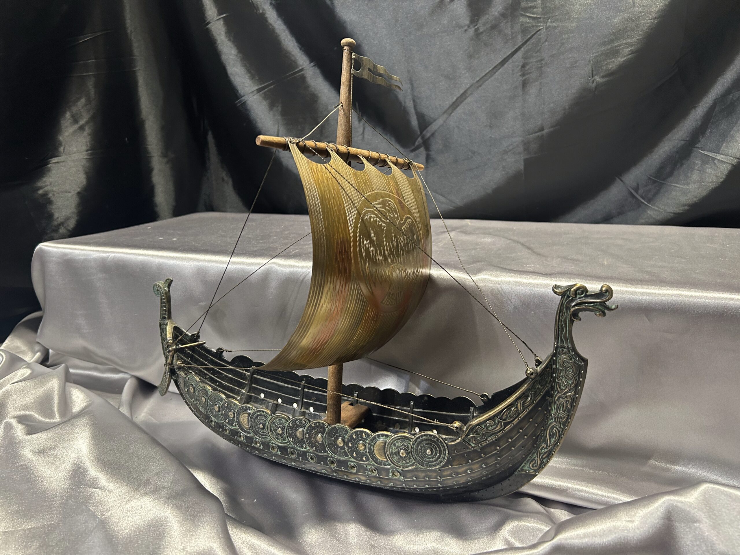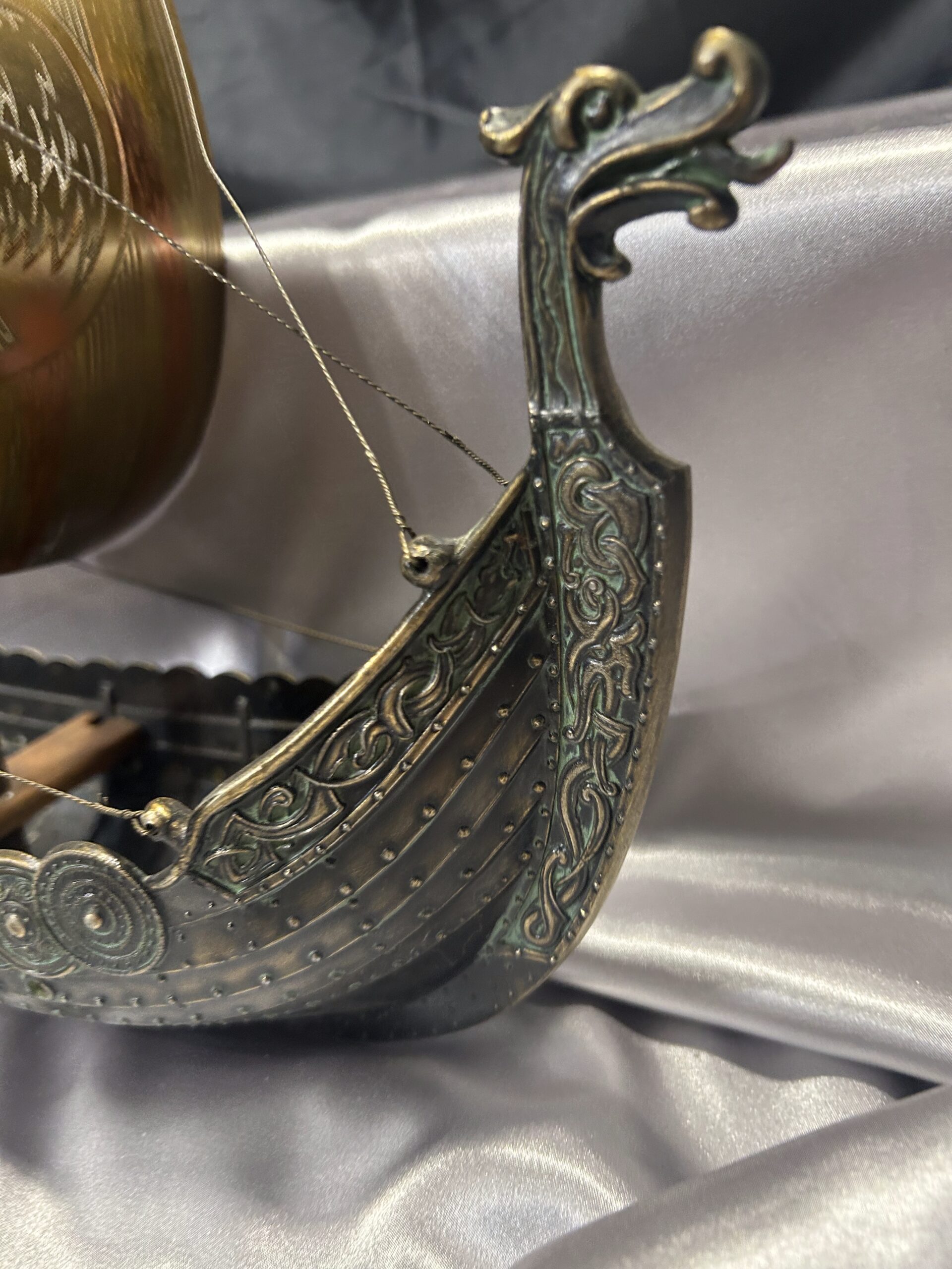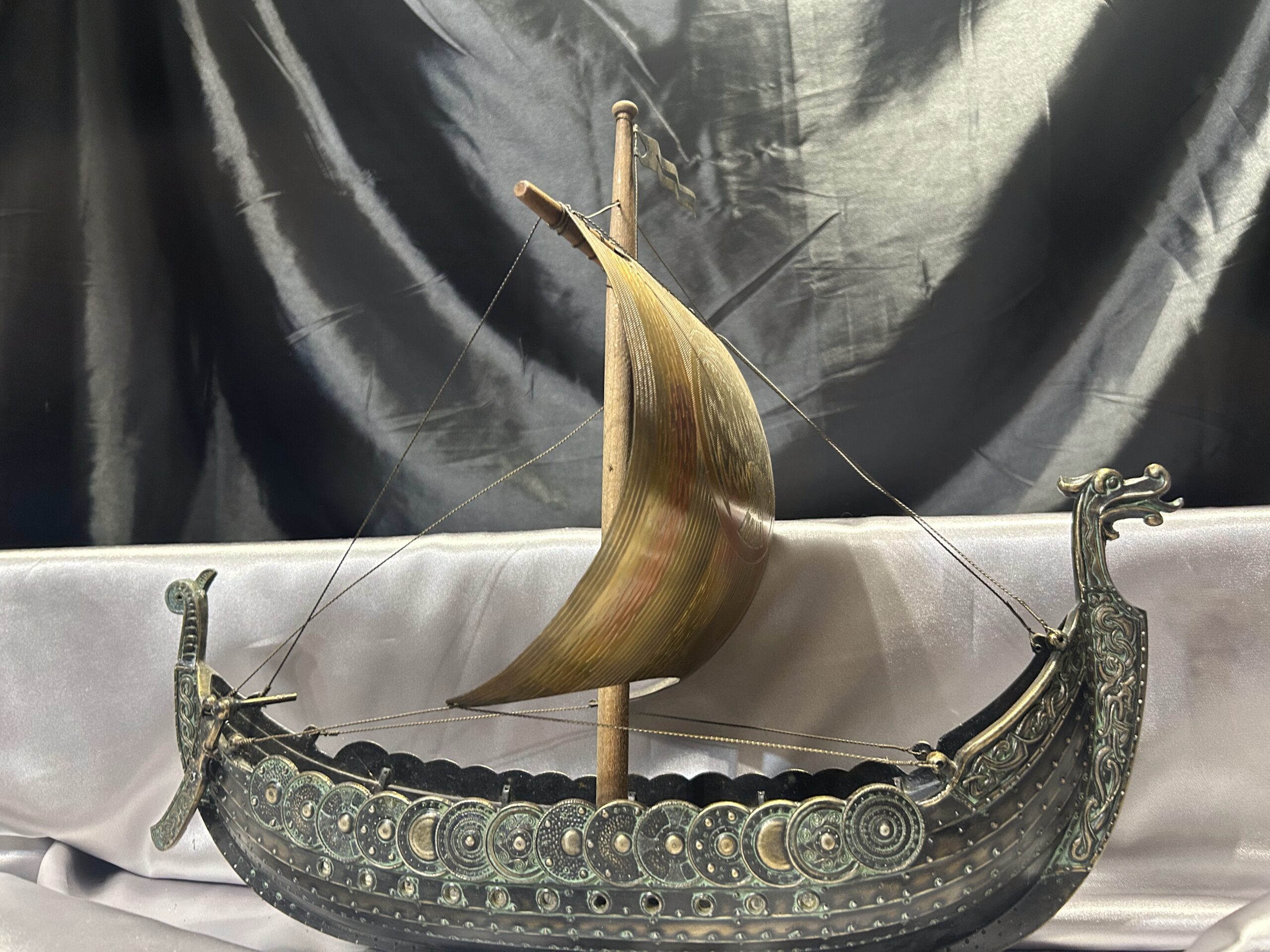 Statek wikinga z głową smoka – metalowy model na drewnianej podstawie