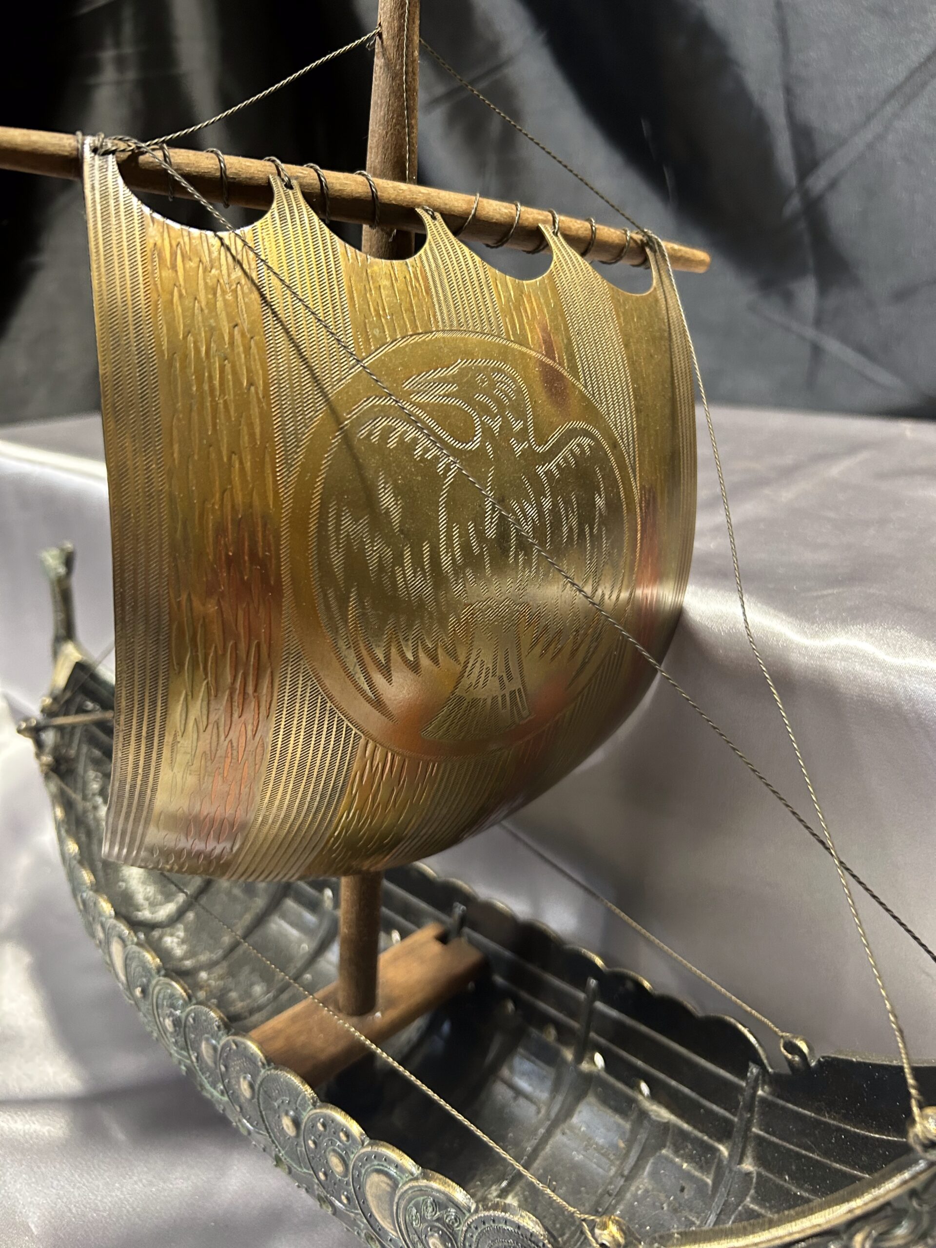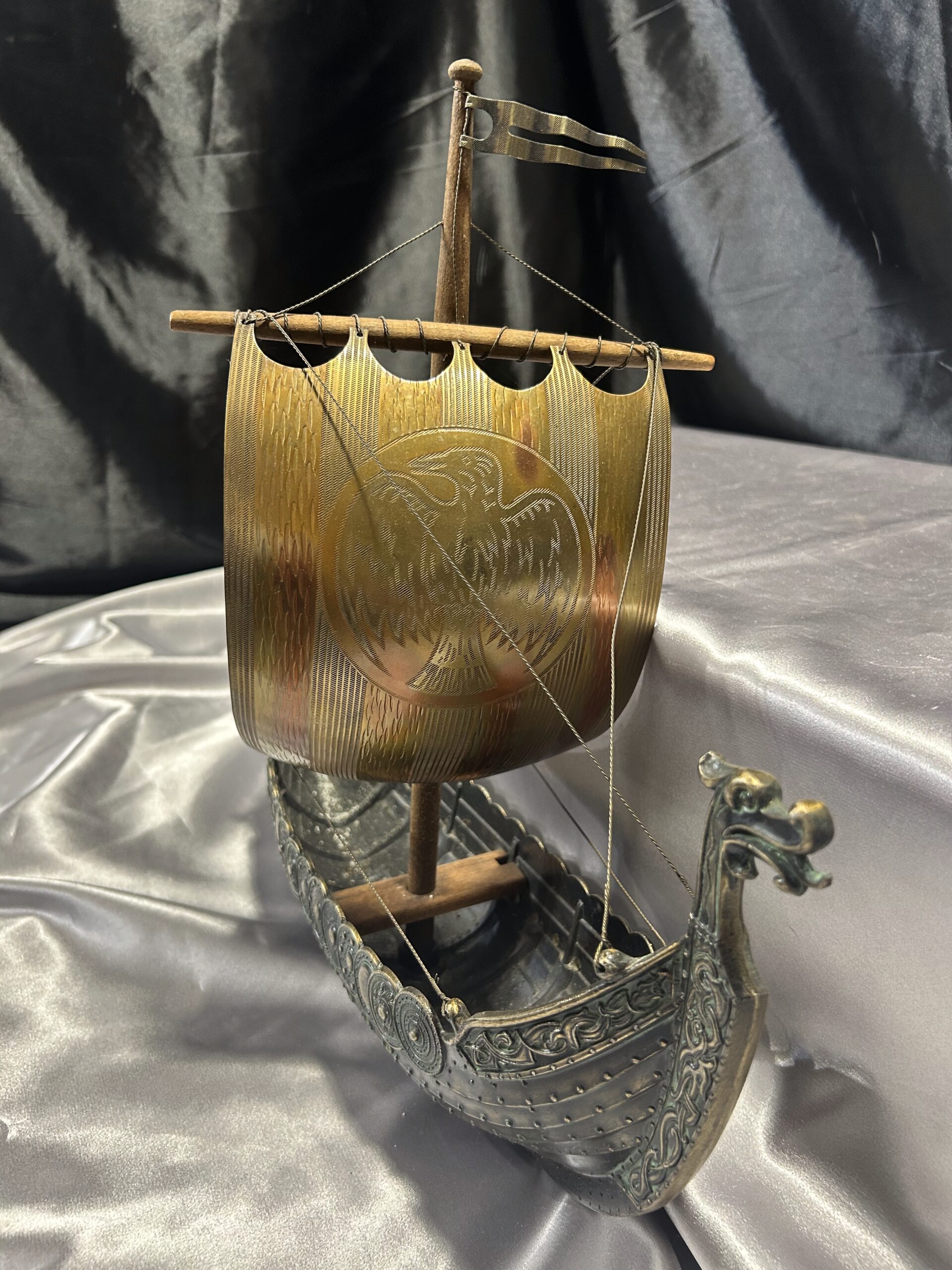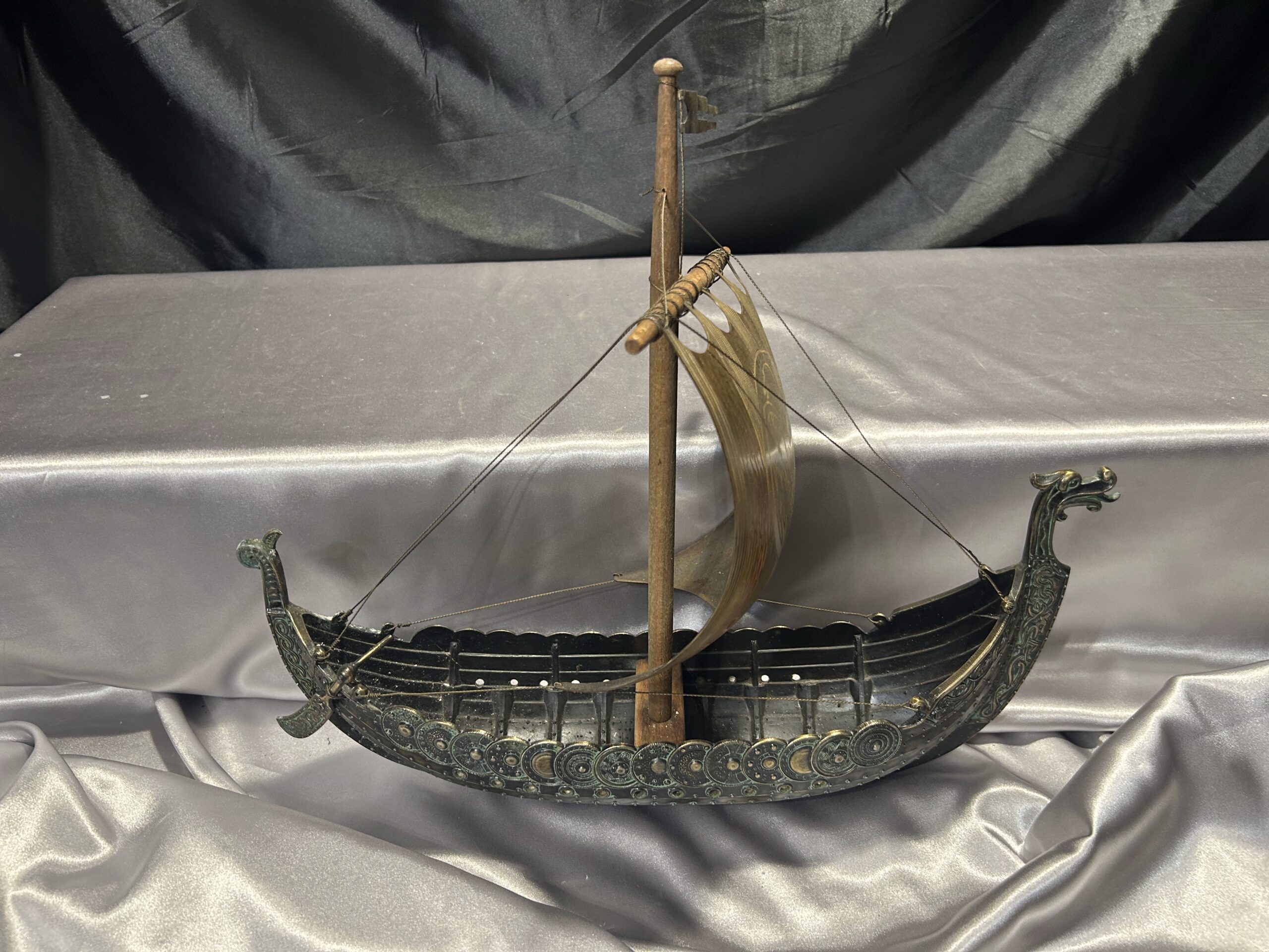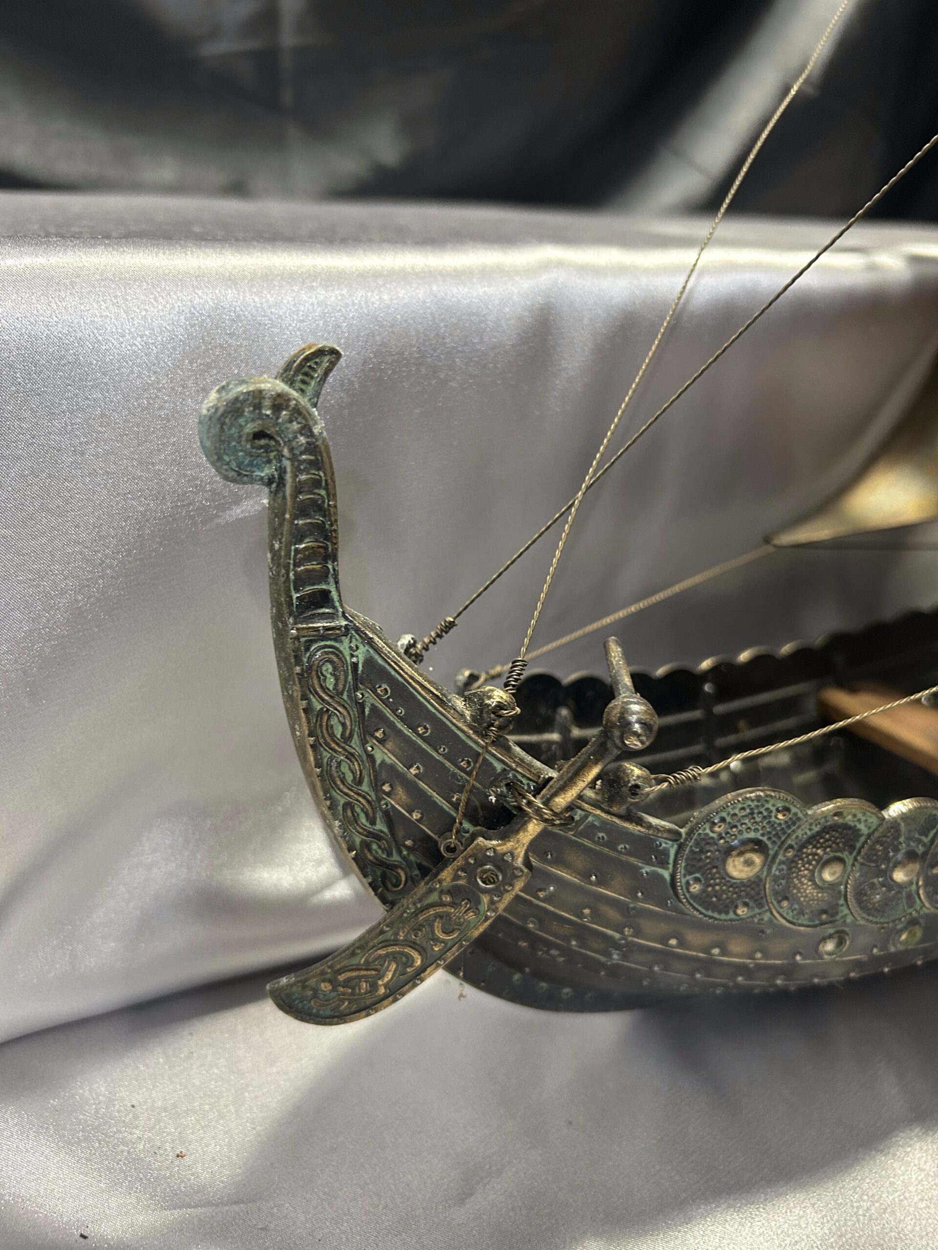 Statek wikinga z głową smoka – metalowy model na drewnianej podstawie