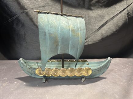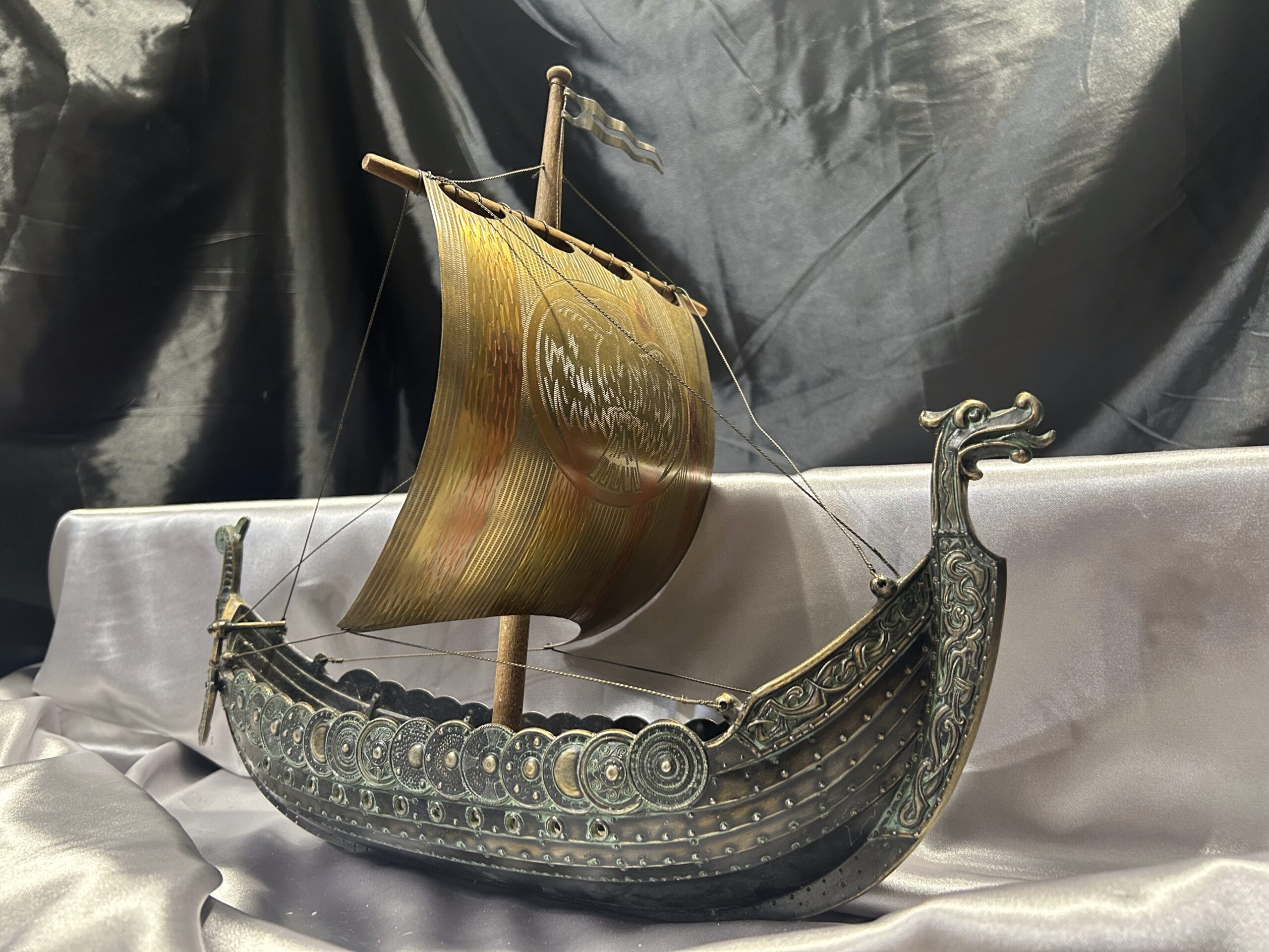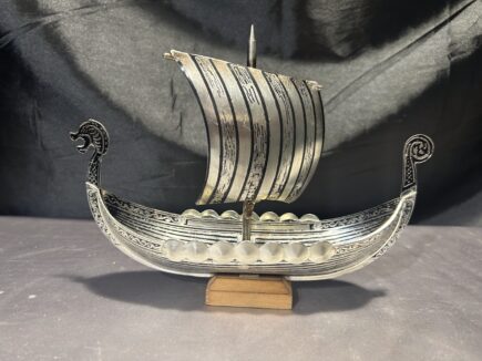 Imponujący model statku Wikinga wykonany z metalu i drewna, który zachwyca precyzją wykonania i dbałością o szczegóły. Charakterystyczna głowa smoka na dziobie, metalowy żagiel z podobizną ptaka oraz okrągłe tarcze zawieszone po bokach nadają mu autentyczny, nordycki charakter. Drewniany maszt i ster z tyłu statku dopełniają całości, czyniąc go wyjątkowym elementem dekoracyjnym.