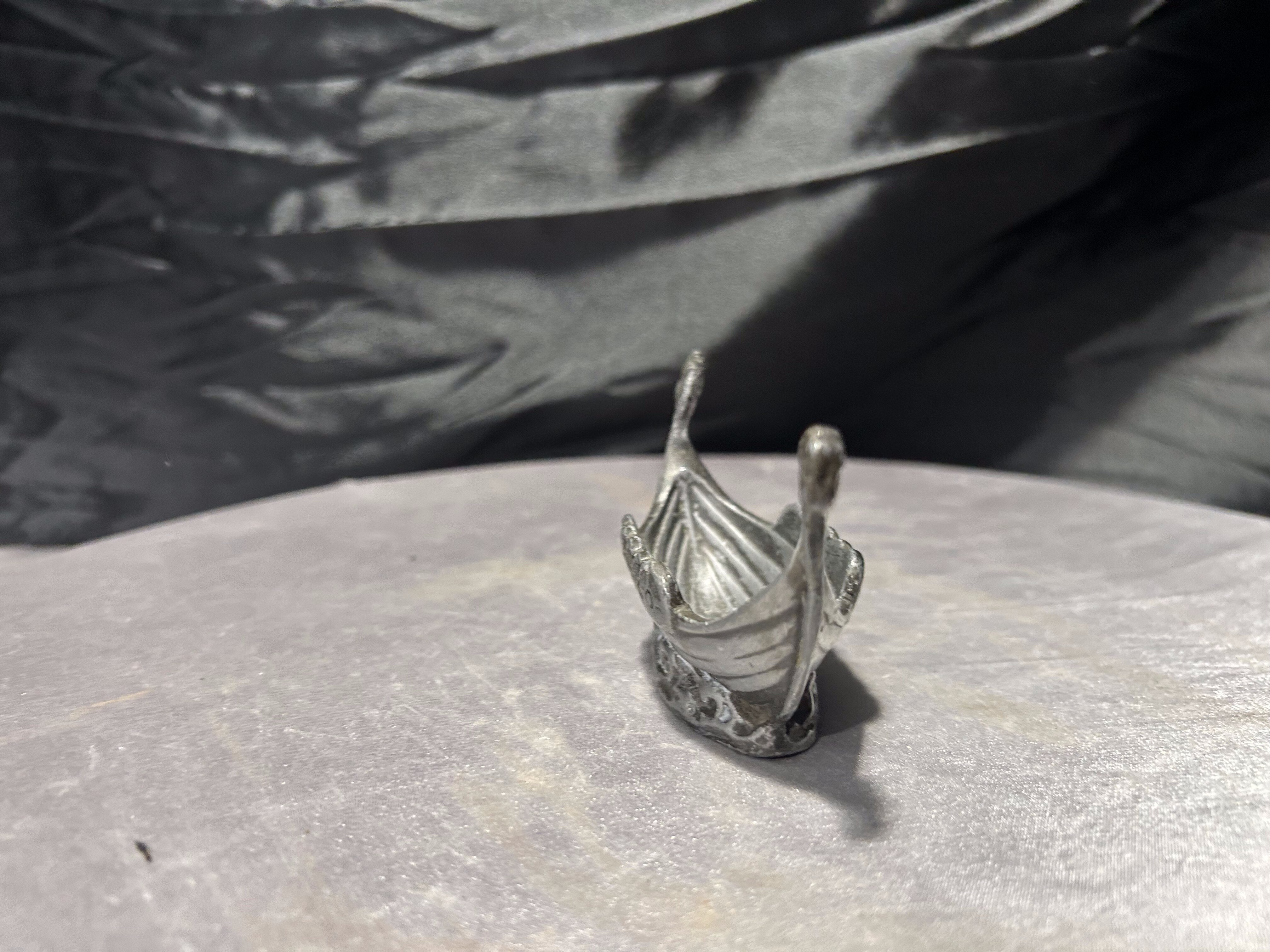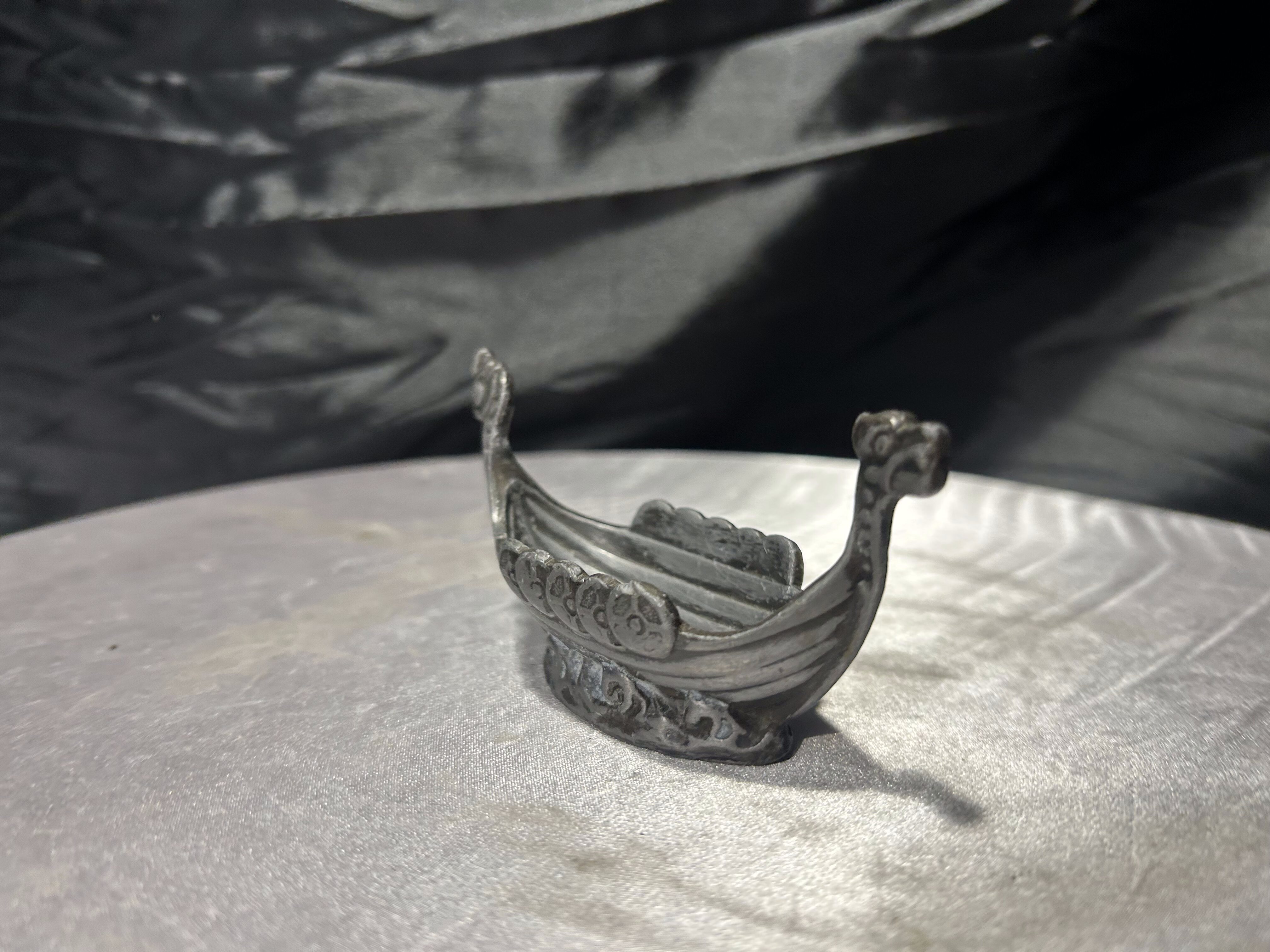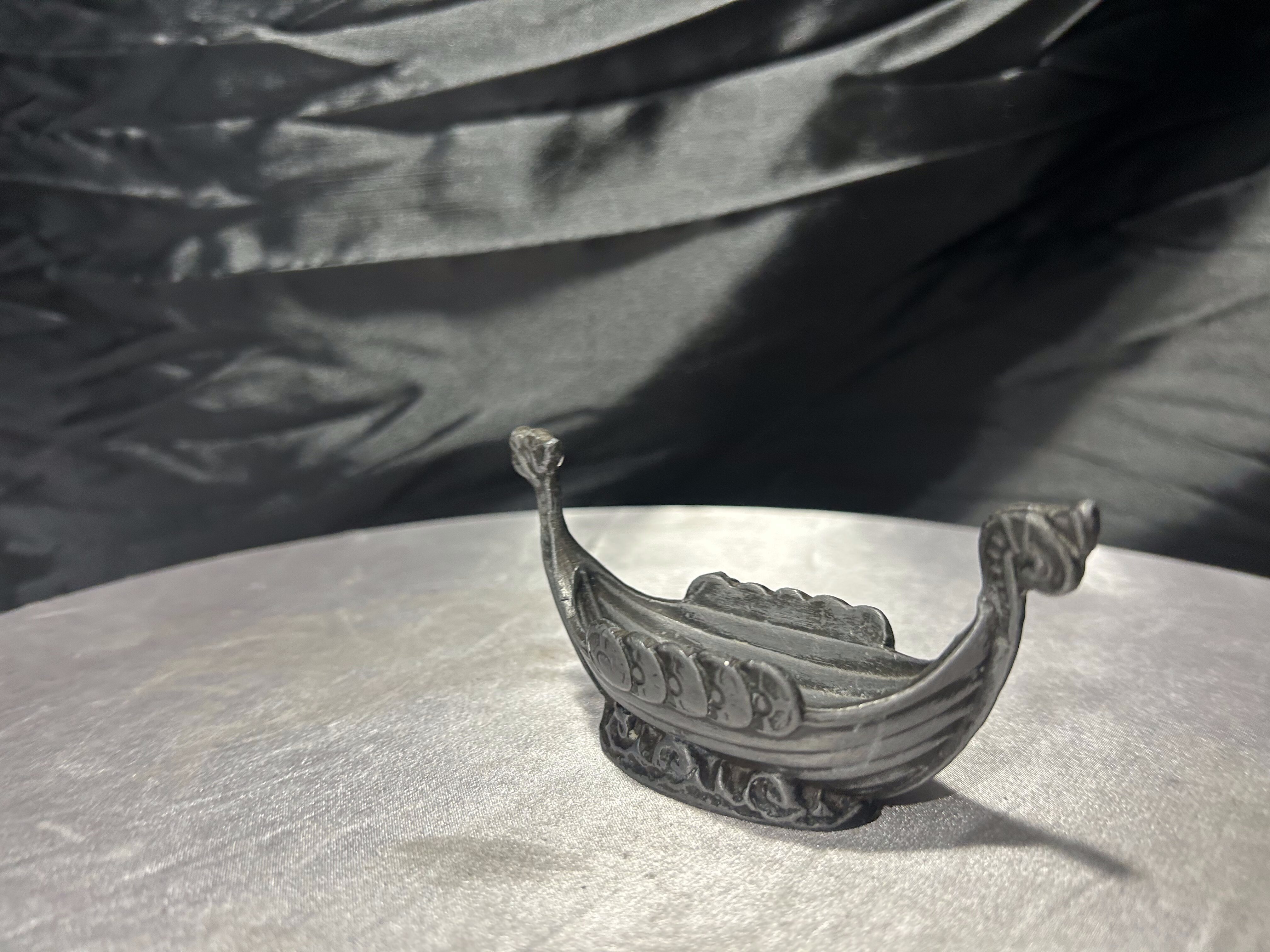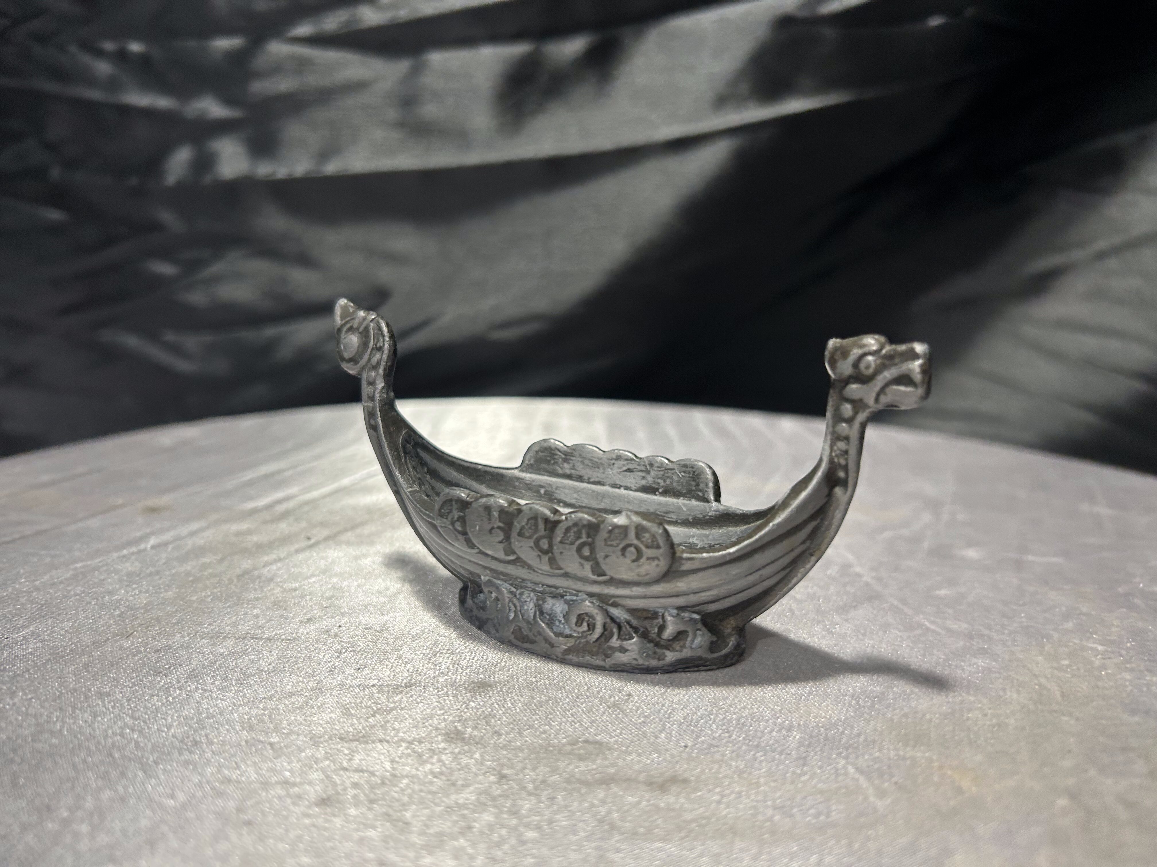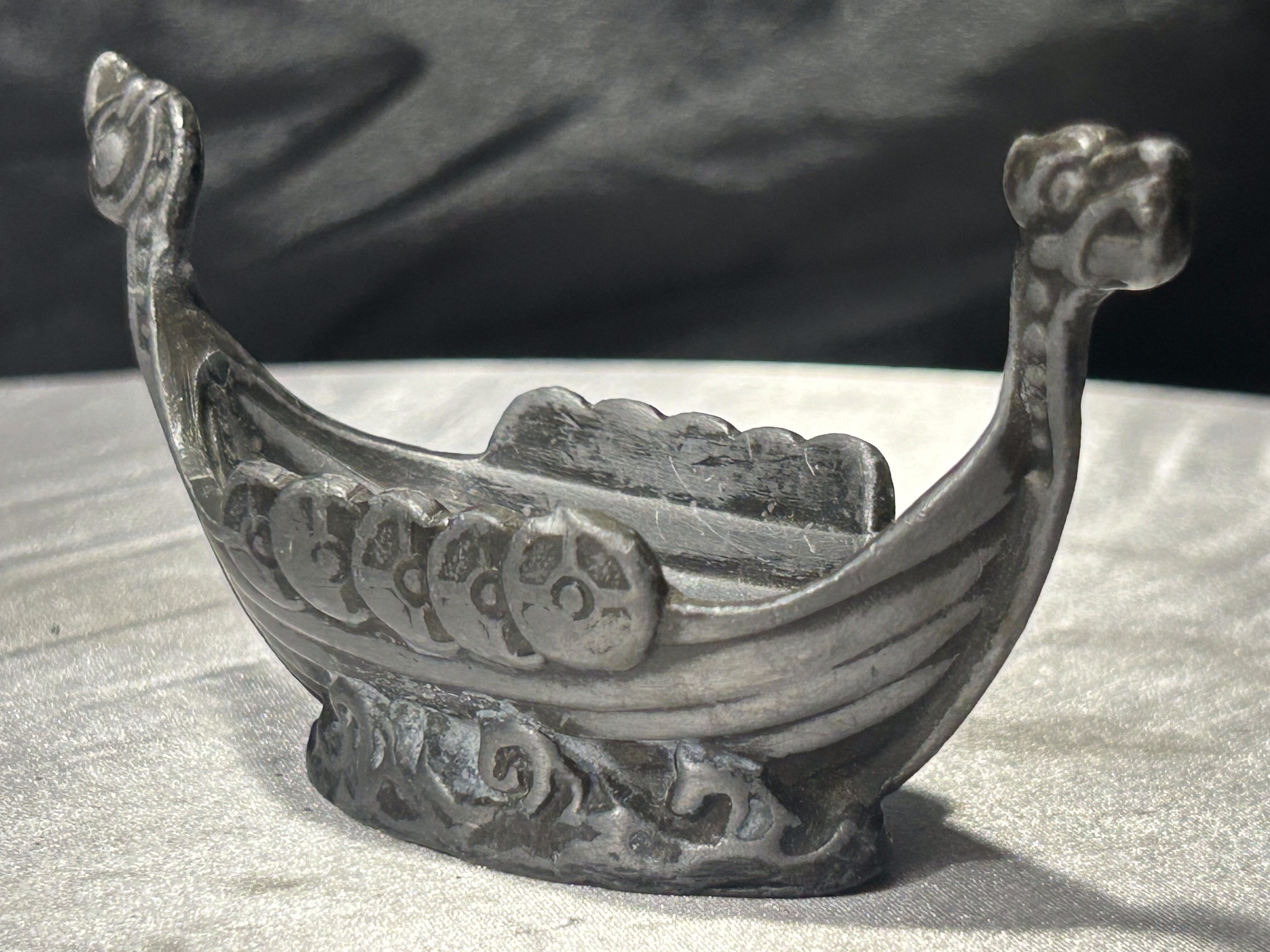 Niewielka, ale bardzo wyrazista figurka przedstawiająca statek wikingów z charakterystycznymi głowami smoków na dziobie i rufie. Boki zdobione są reliefowymi tarczami, co nadaje całości autentycznego, nordyckiego charakteru.