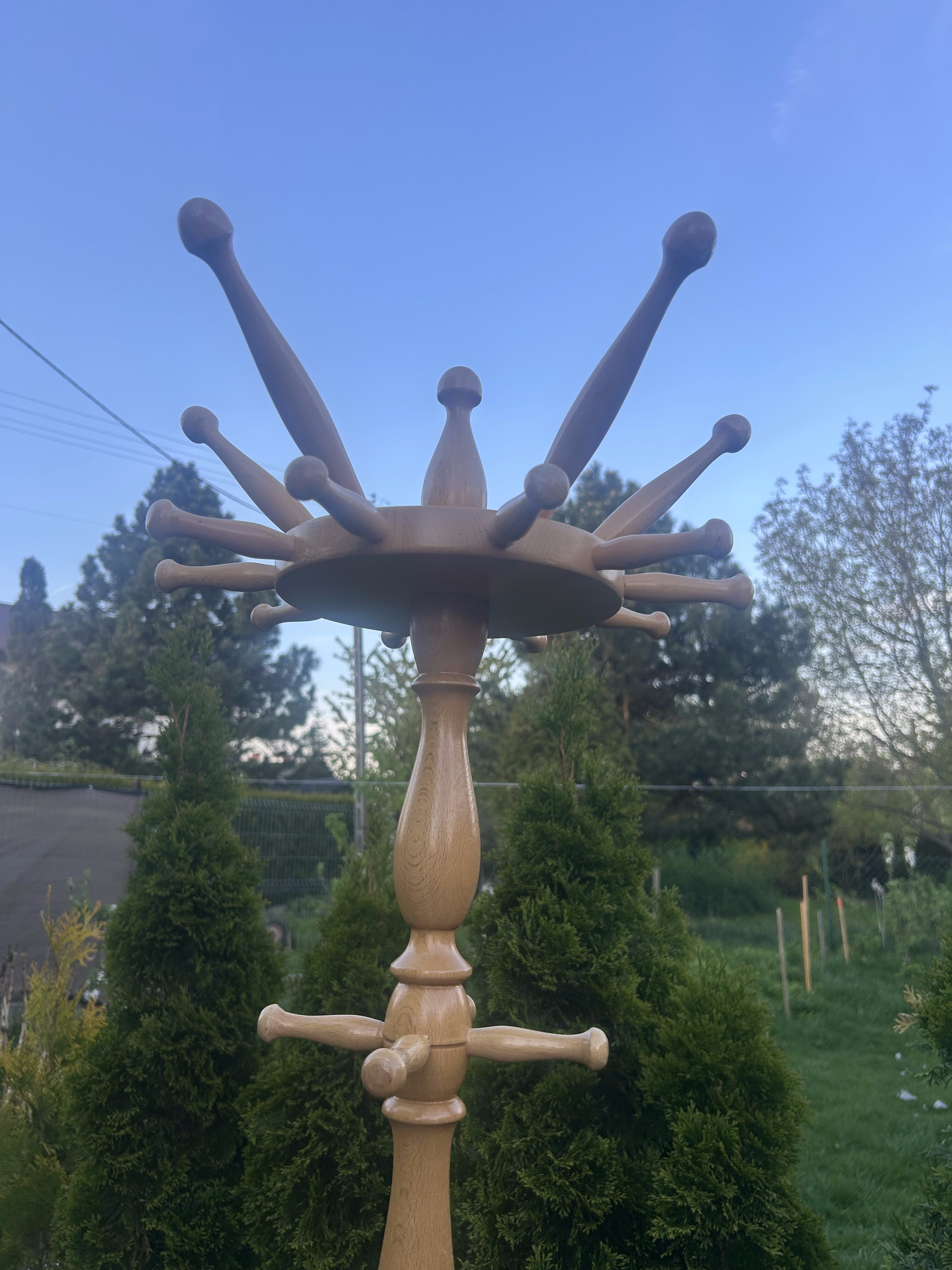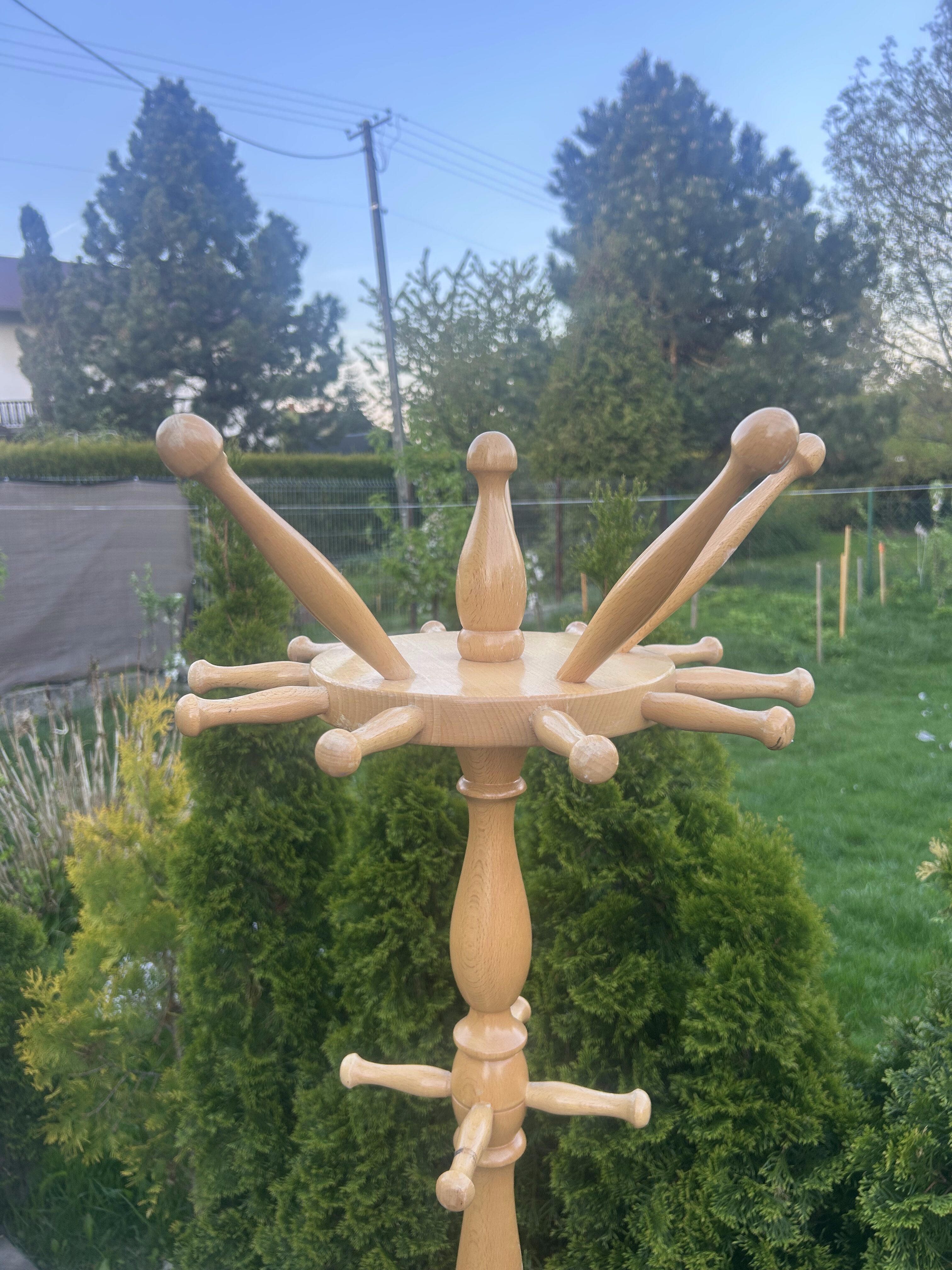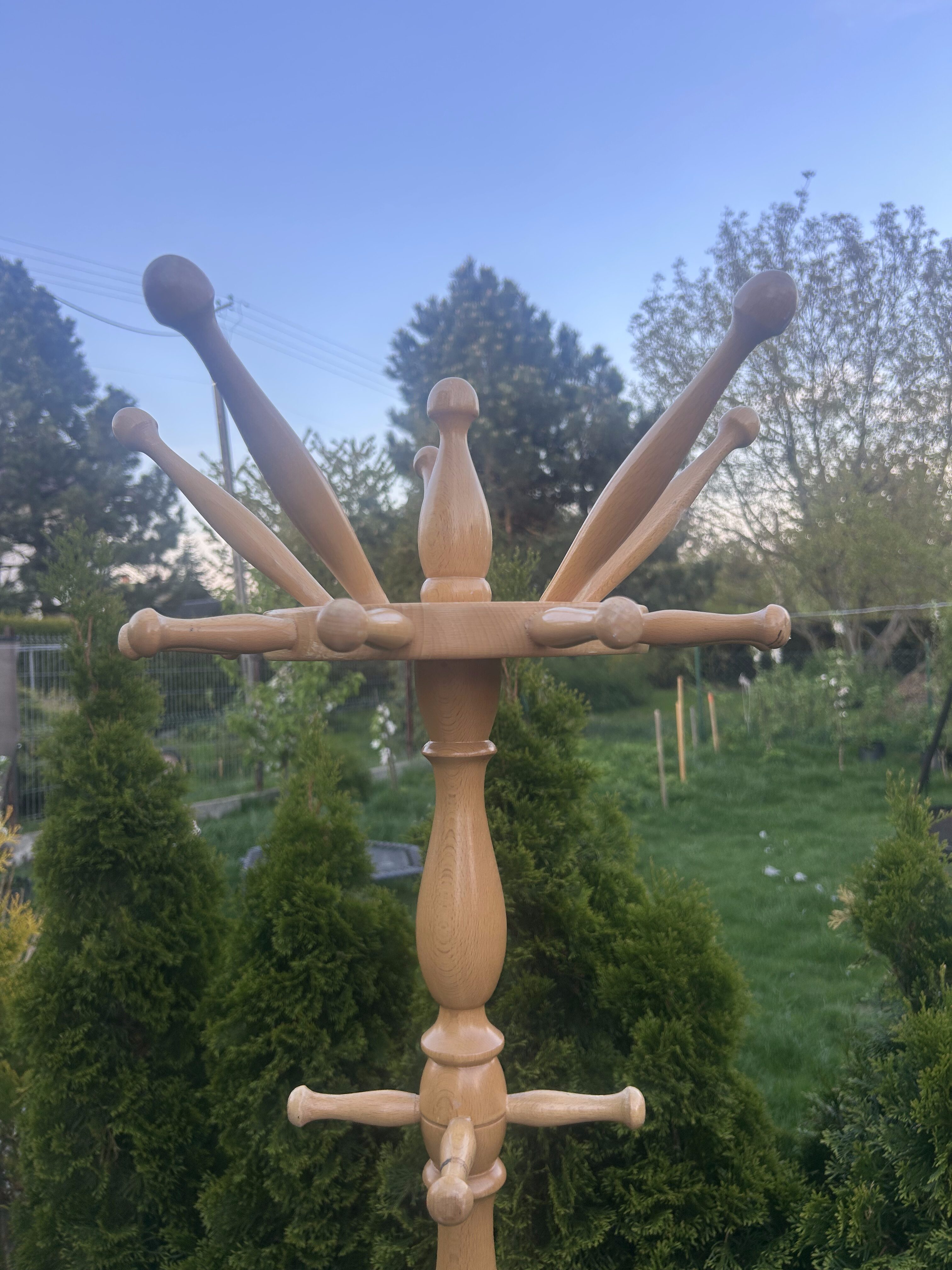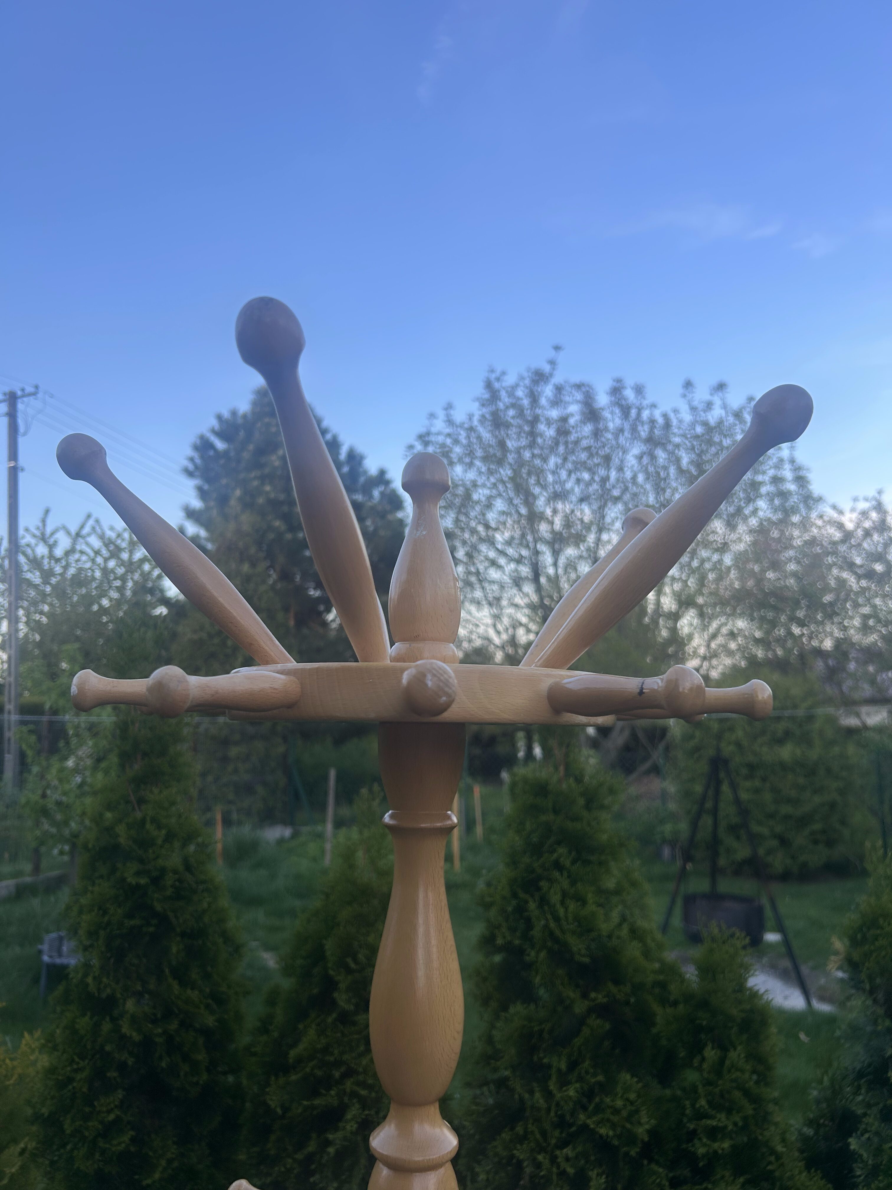 Funkcjonalny i estetyczny stojak na ubrania wykonany z jasnego drewna. Klasyczna forma oparta na trójnogu, z aż 19 haczykami na różnych poziomach – idealny zarówno do przedpokoju, jak i do garderoby, pracowni czy sklepu. Stabilna konstrukcja gwarantuje wygodne użytkowanie przez długi czas.