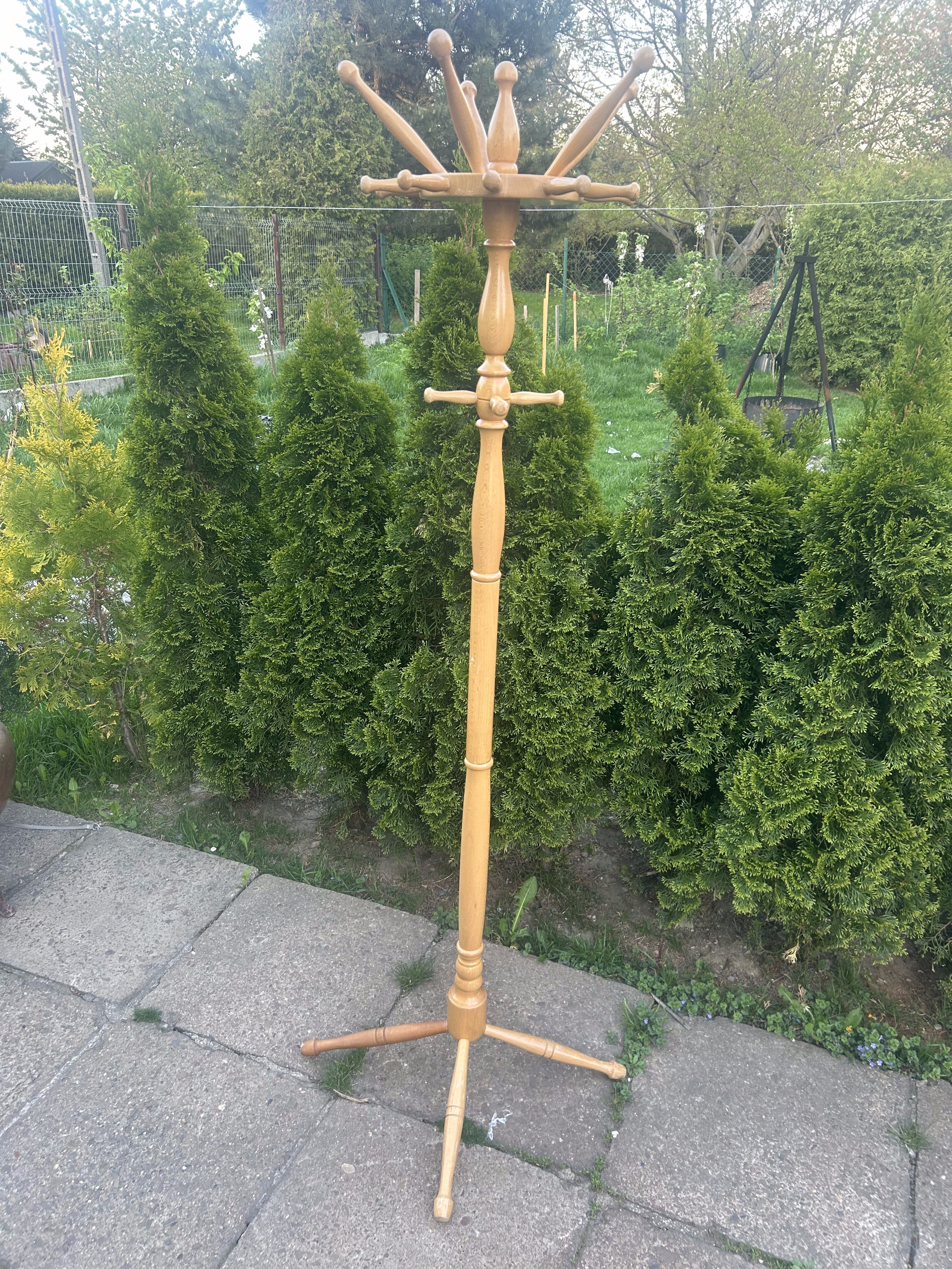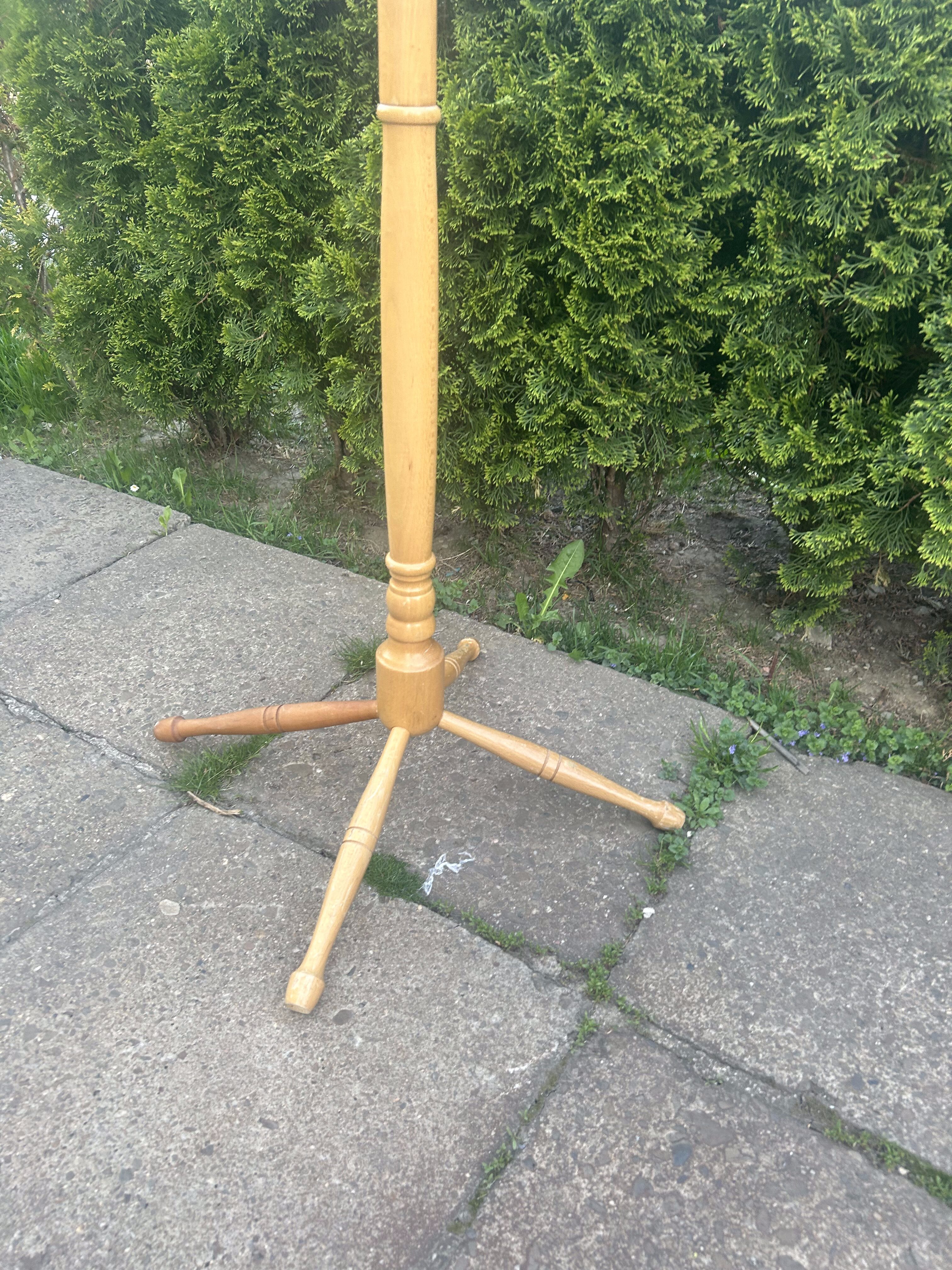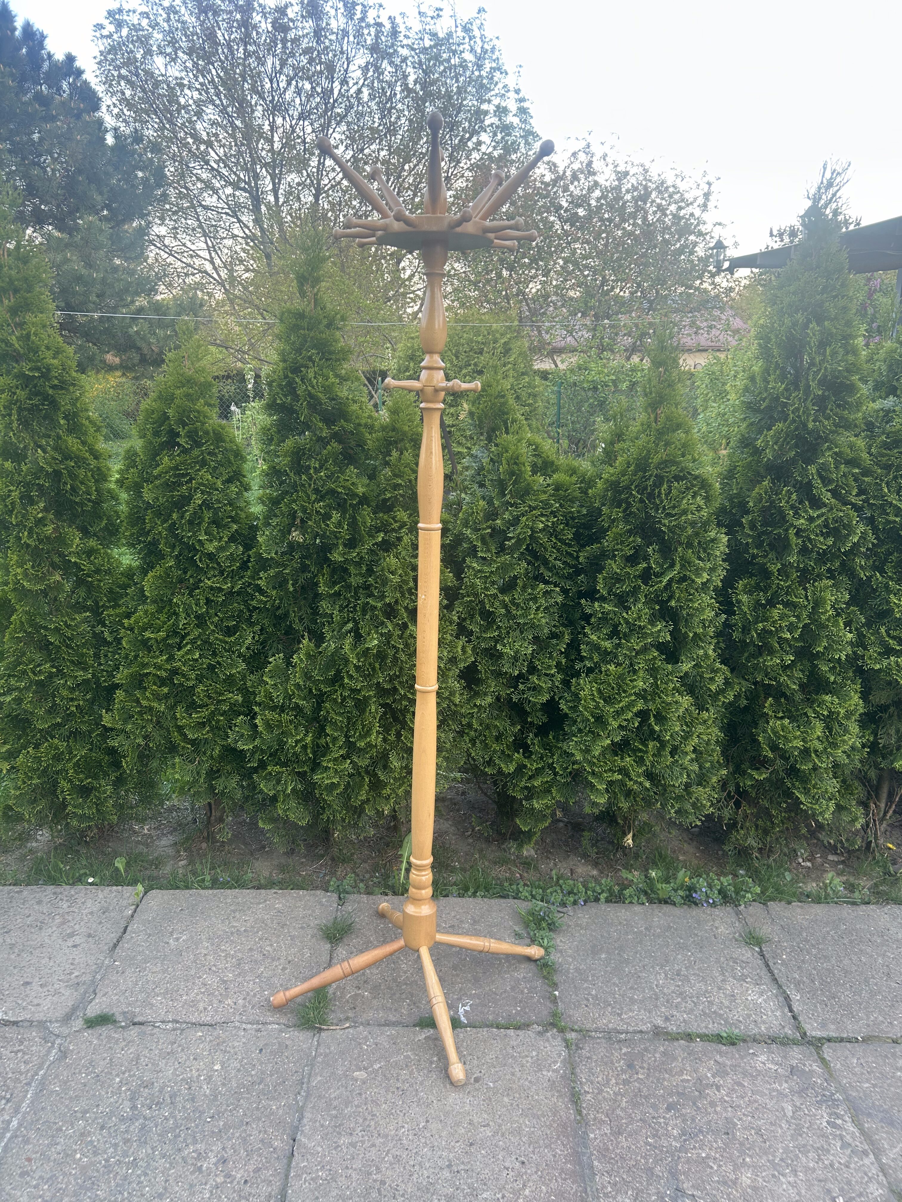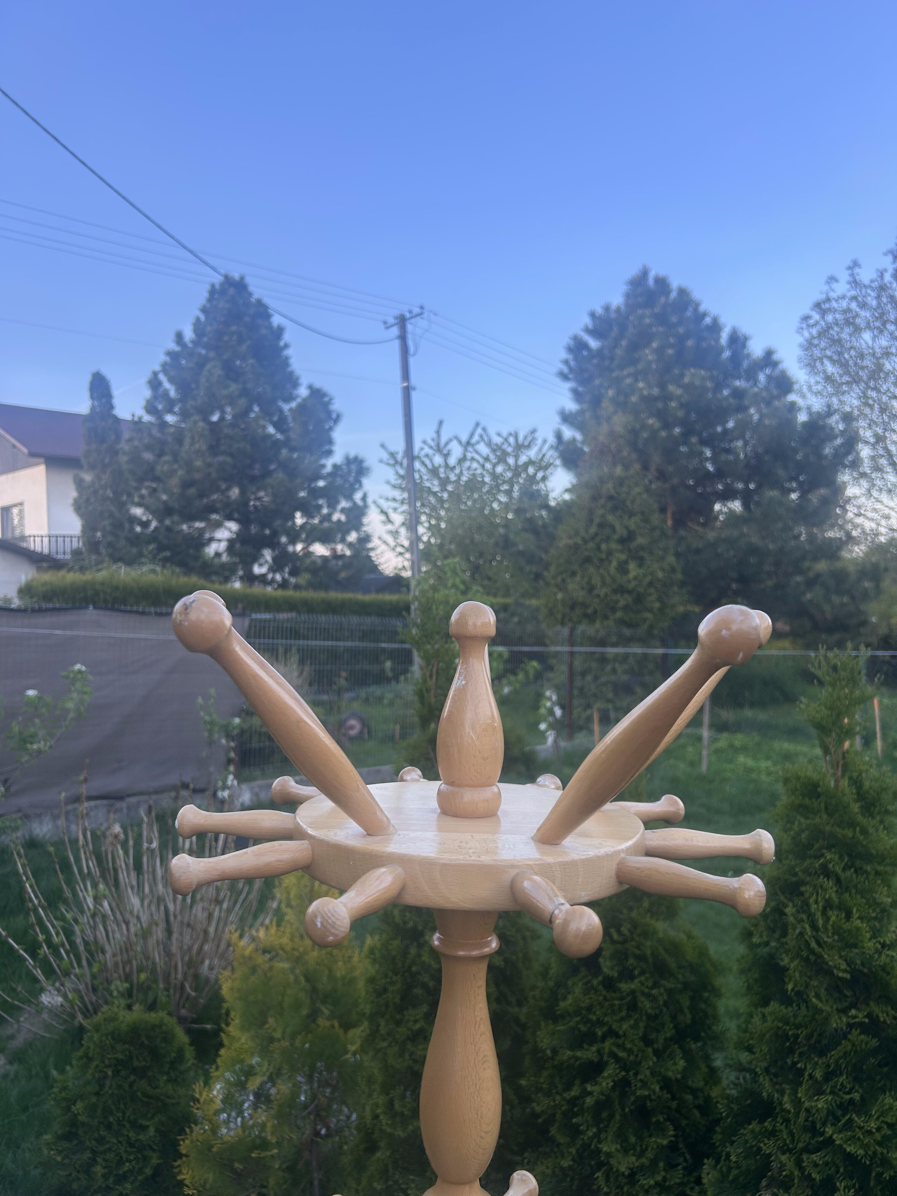 Funkcjonalny i estetyczny stojak na ubrania wykonany z jasnego drewna. Klasyczna forma oparta na trójnogu, z aż 19 haczykami na różnych poziomach – idealny zarówno do przedpokoju, jak i do garderoby, pracowni czy sklepu. Stabilna konstrukcja gwarantuje wygodne użytkowanie przez długi czas.