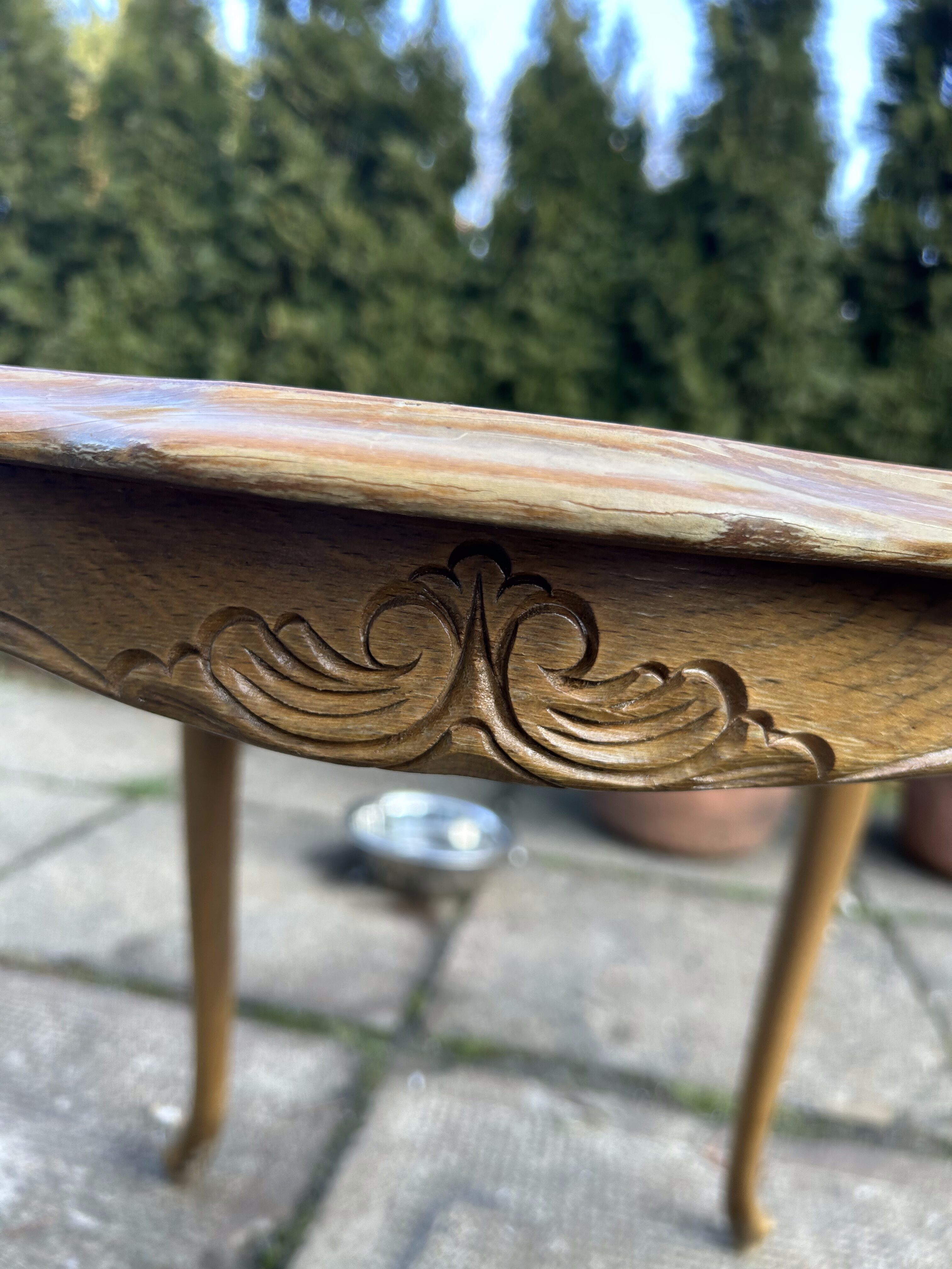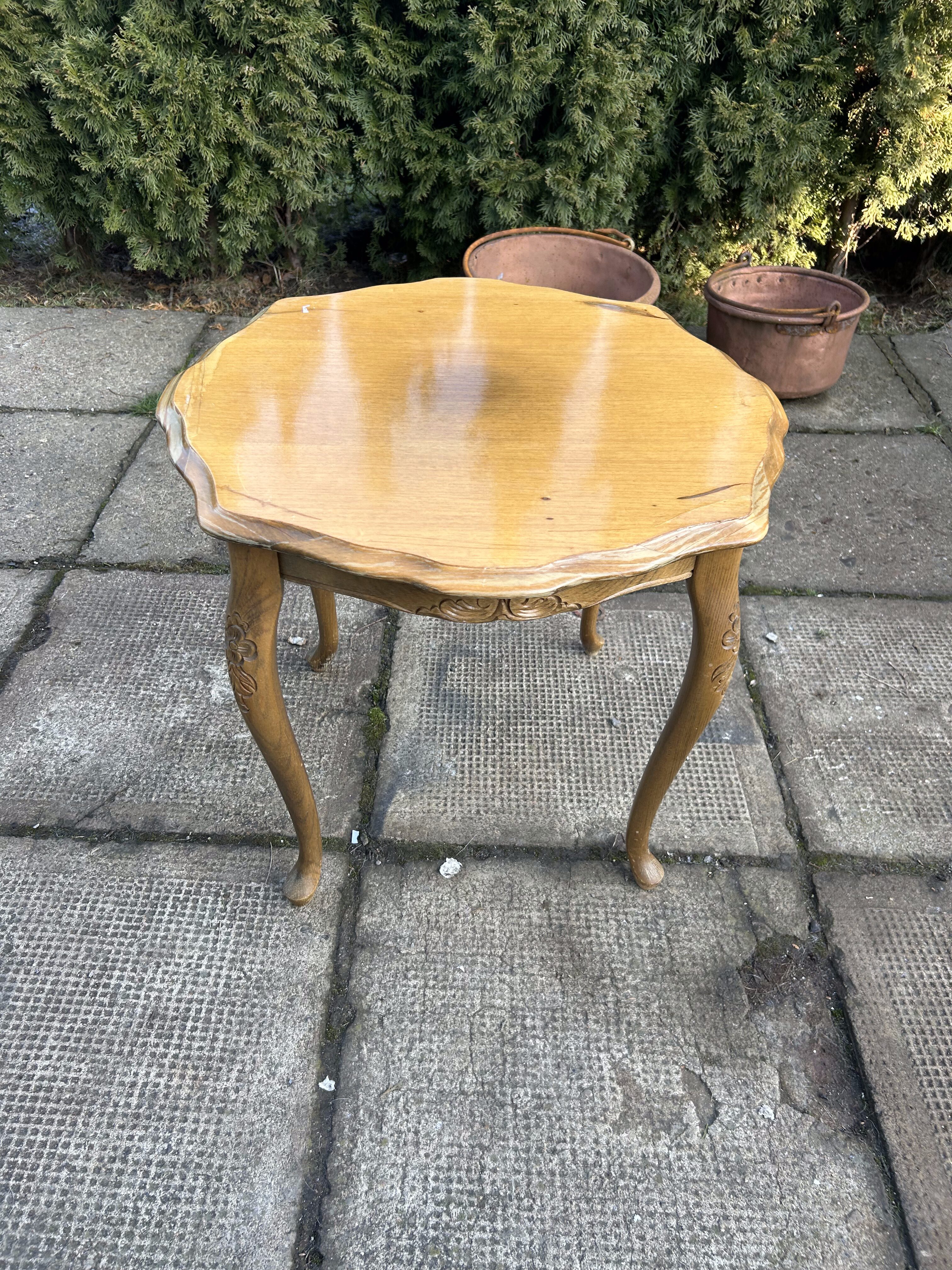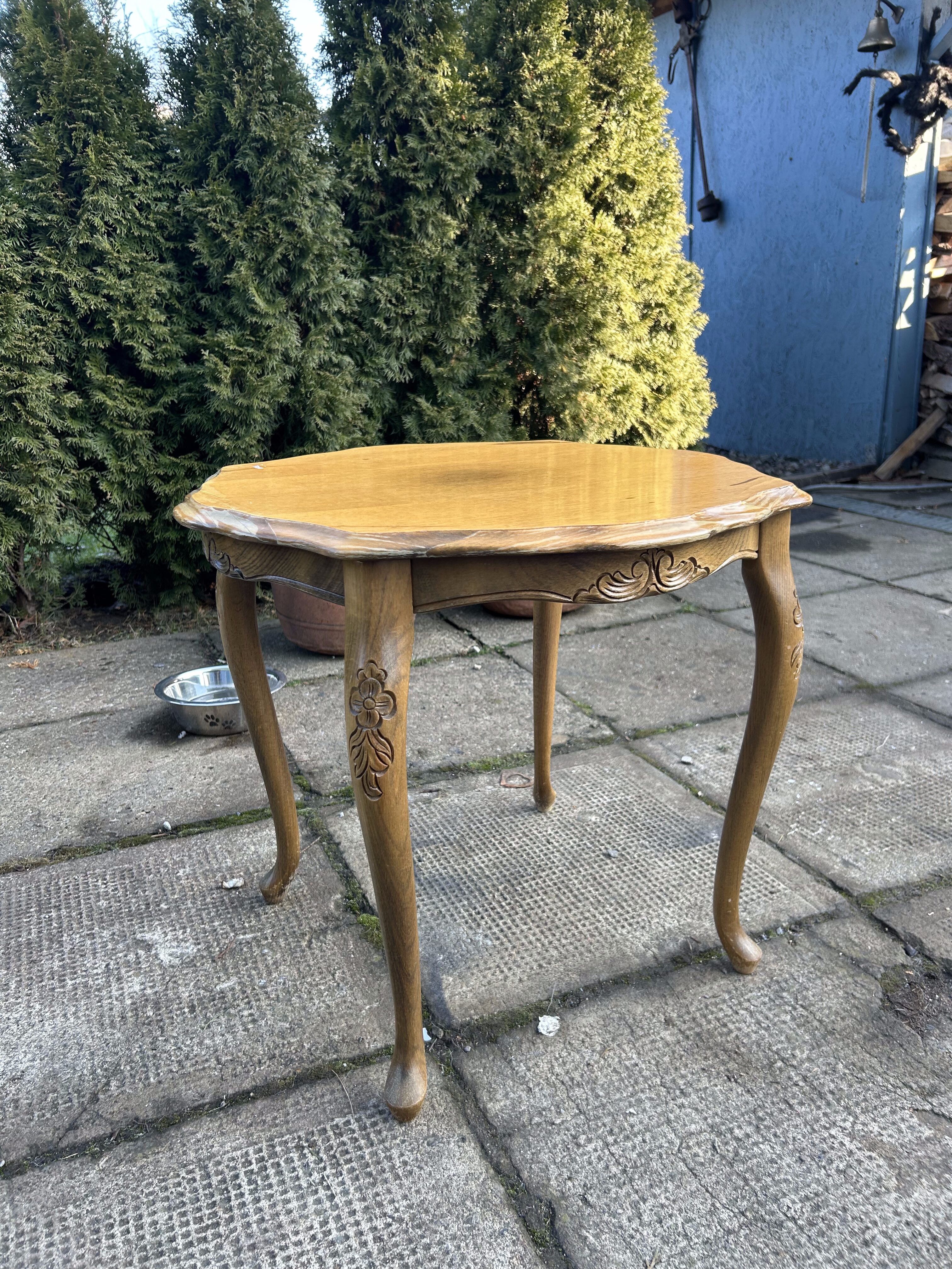 Urokliwy, drewniany stolik o okrągłym blacie z delikatnie nieregularnym obrysem. Całość osadzona na czterech smukłych, dekoracyjnie rzeźbionych nogach. Zarówno nogi, jak i boczne elementy konstrukcji zostały ozdobione subtelnym snycerstwem, co nadaje stolikowi lekki, klasyczny charakter.
