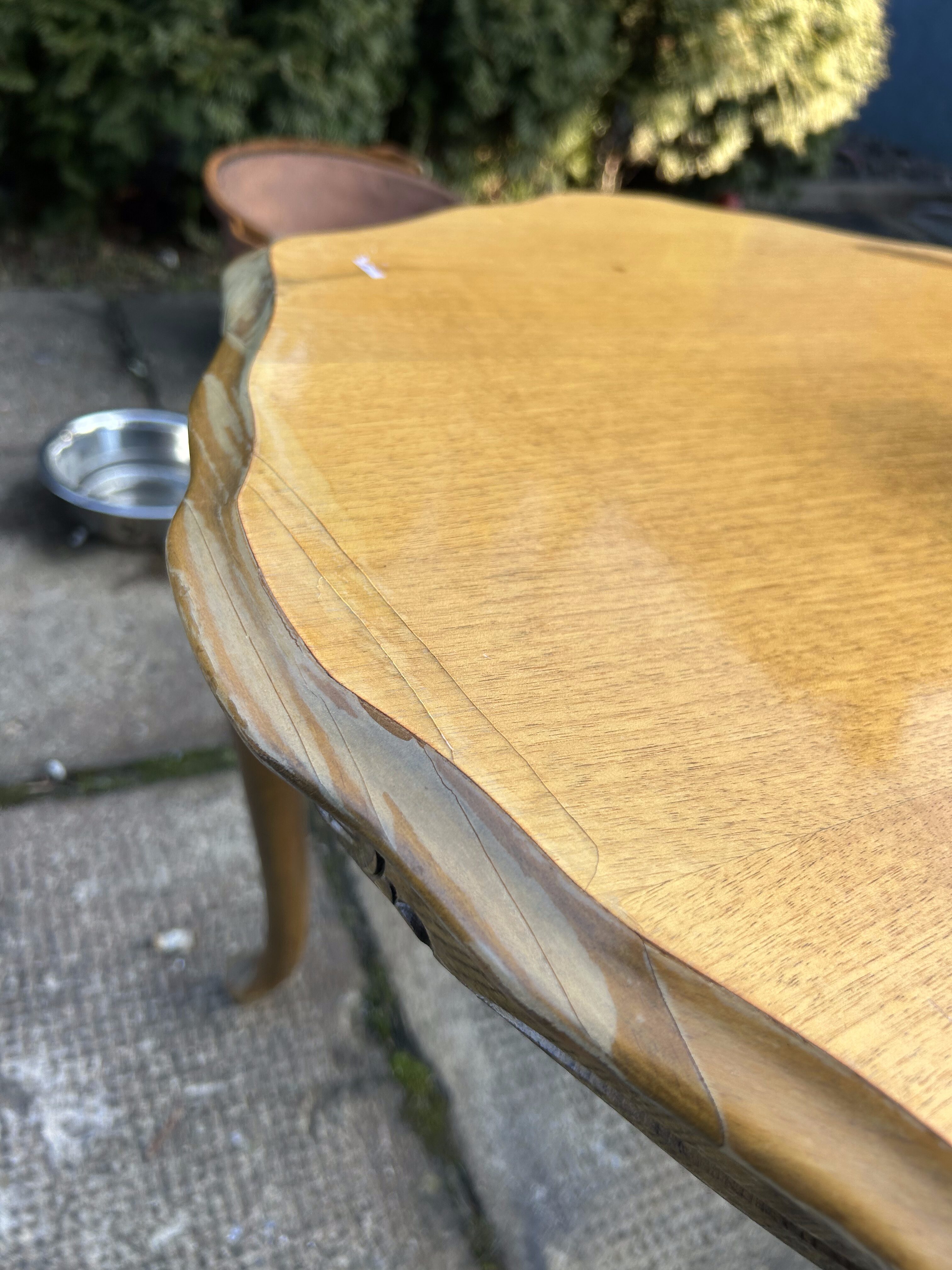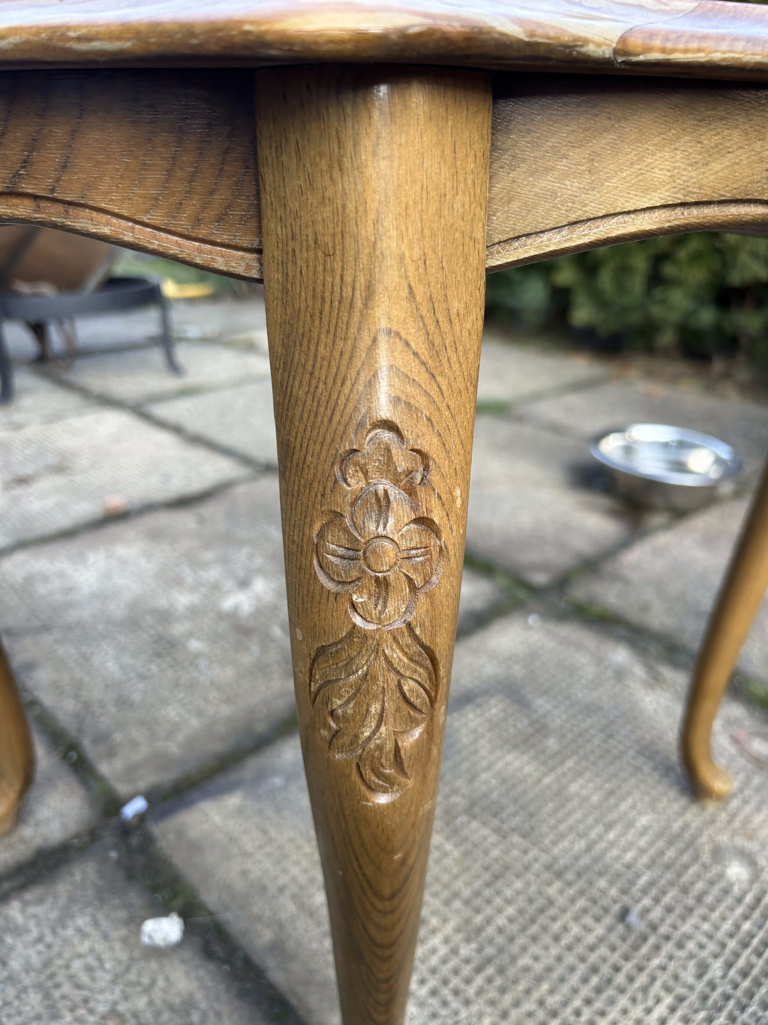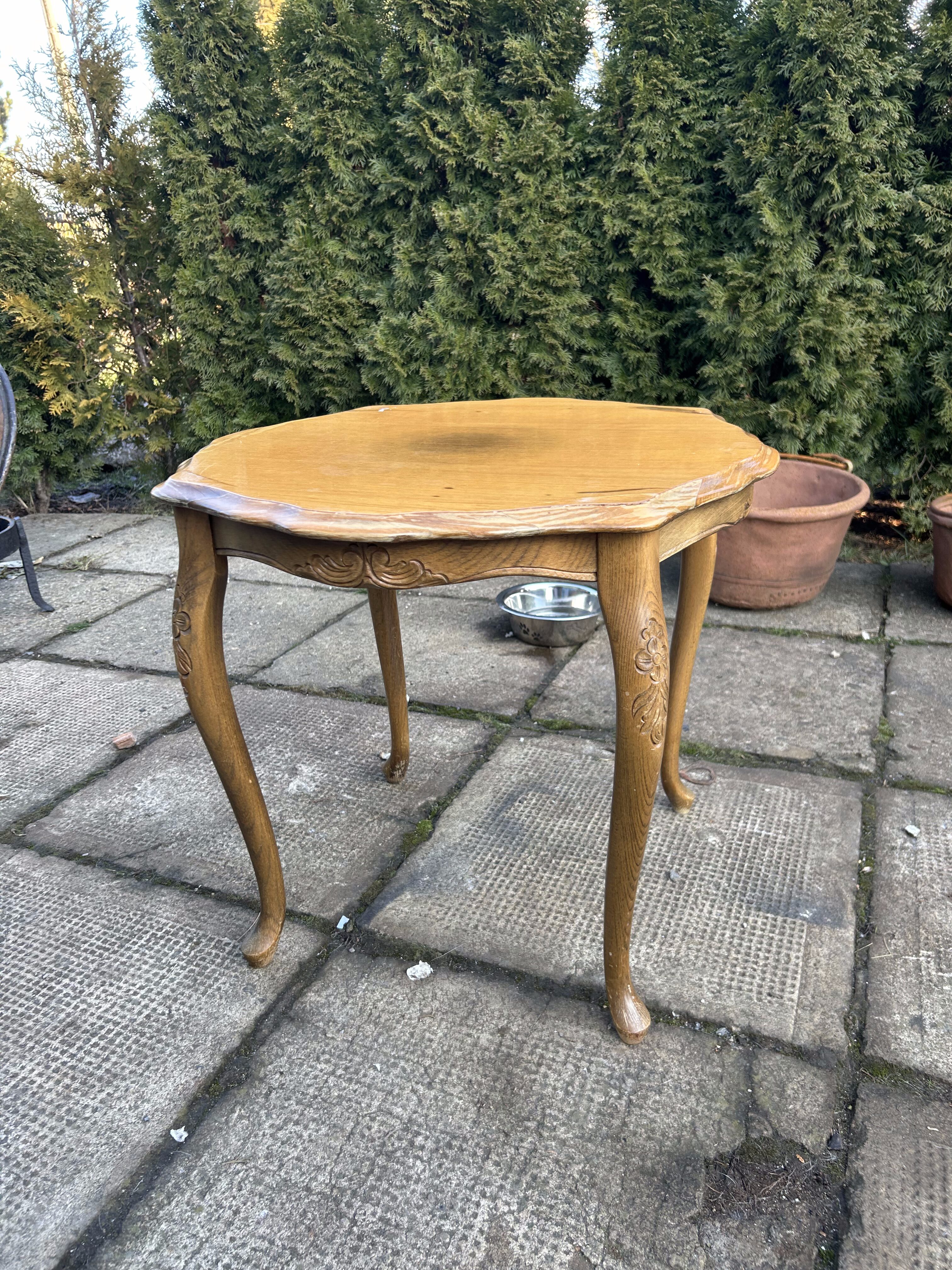 Urokliwy, drewniany stolik o okrągłym blacie z delikatnie nieregularnym obrysem. Całość osadzona na czterech smukłych, dekoracyjnie rzeźbionych nogach. Zarówno nogi, jak i boczne elementy konstrukcji zostały ozdobione subtelnym snycerstwem, co nadaje stolikowi lekki, klasyczny charakter.