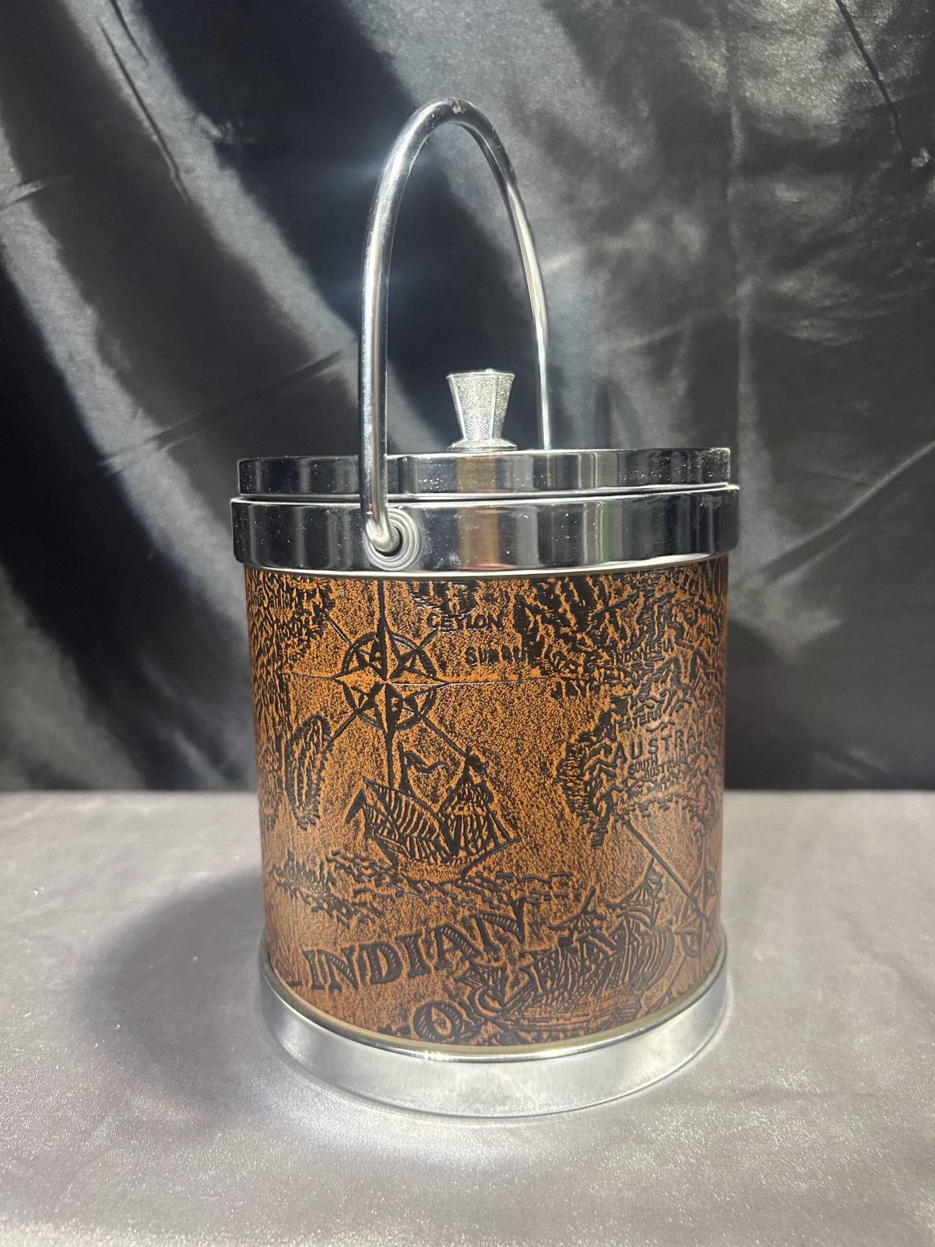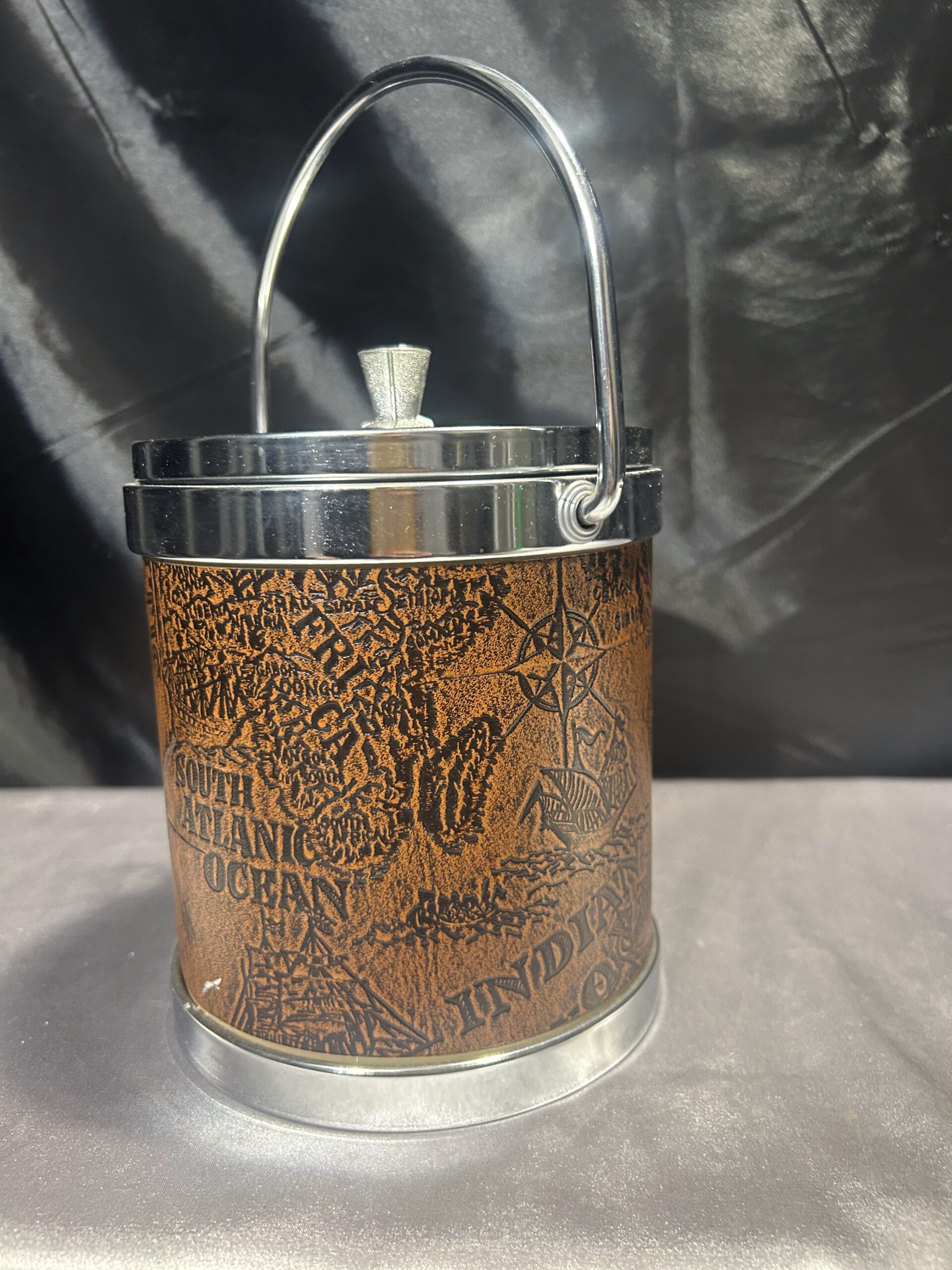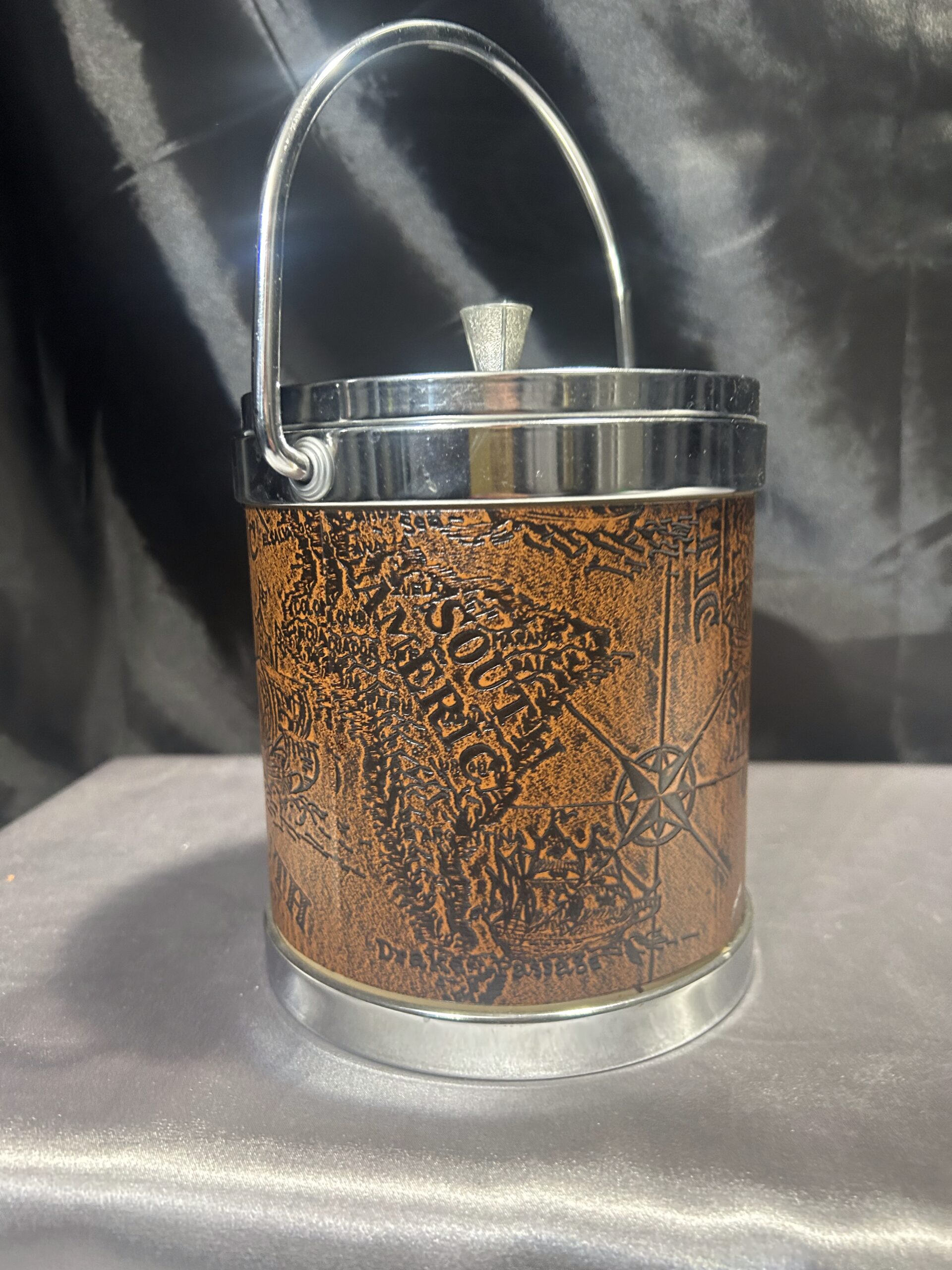 Elegancki i funkcjonalny pojemnik na lód, który łączy klasyczny styl z nowoczesnym designem. Jego unikalny wygląd podkreśla brązowa ekoskóra z tłoczoną mapą, a srebrne metalowe zwieńczenie i uchwyt dodają mu wyrafinowanego charakteru. Idealny do eleganckich wnętrz oraz dla miłośników stylu vintage.