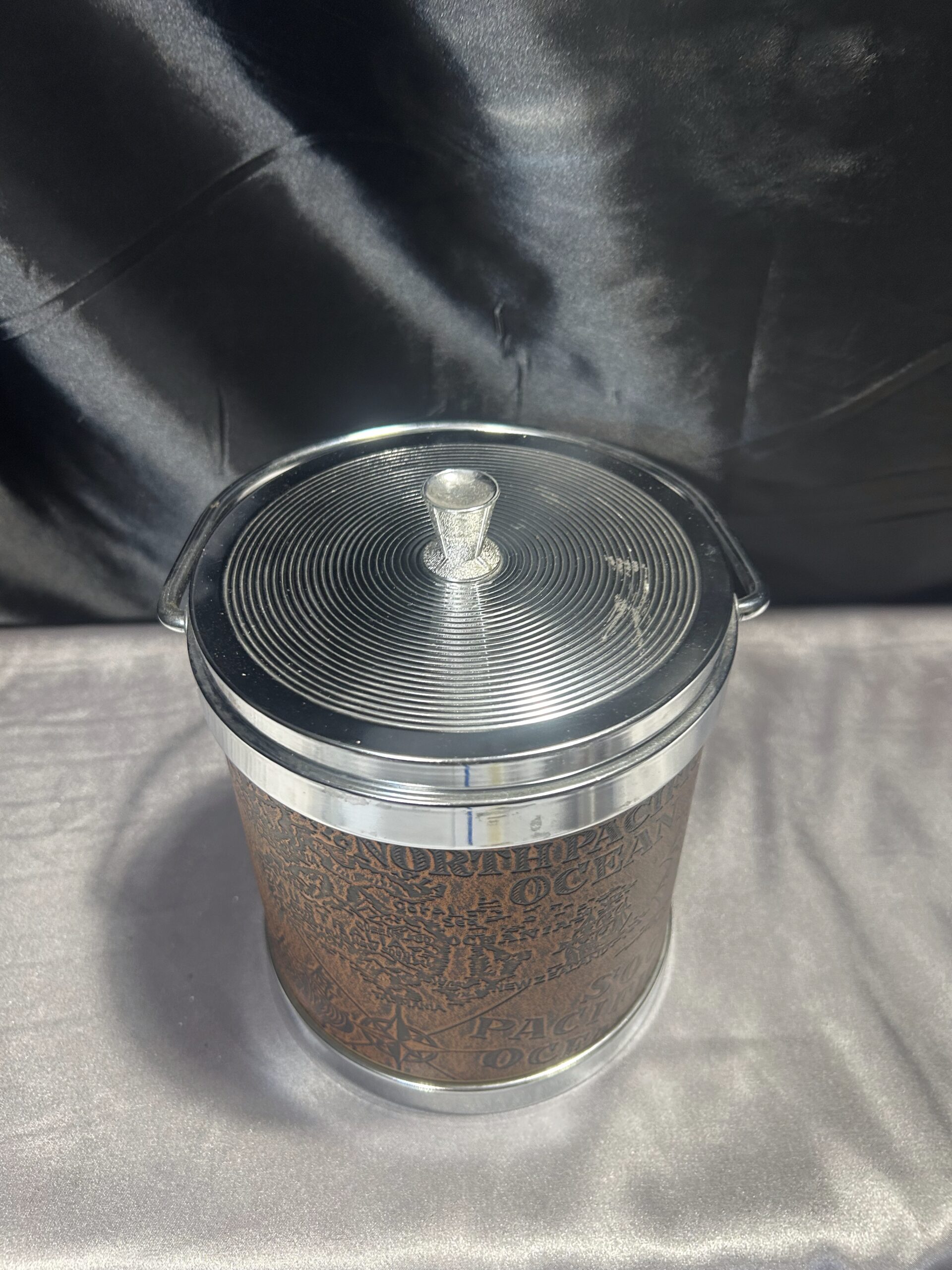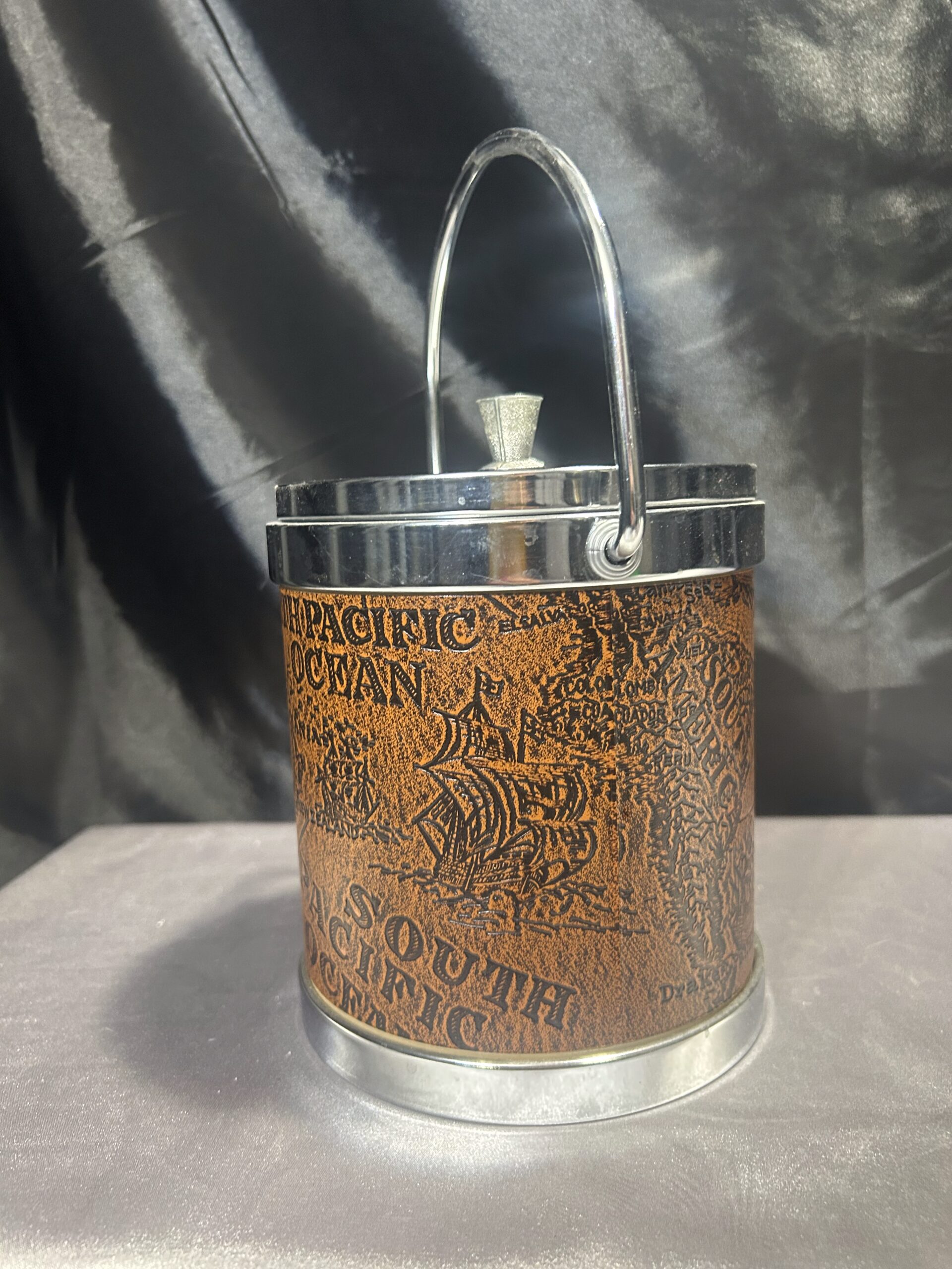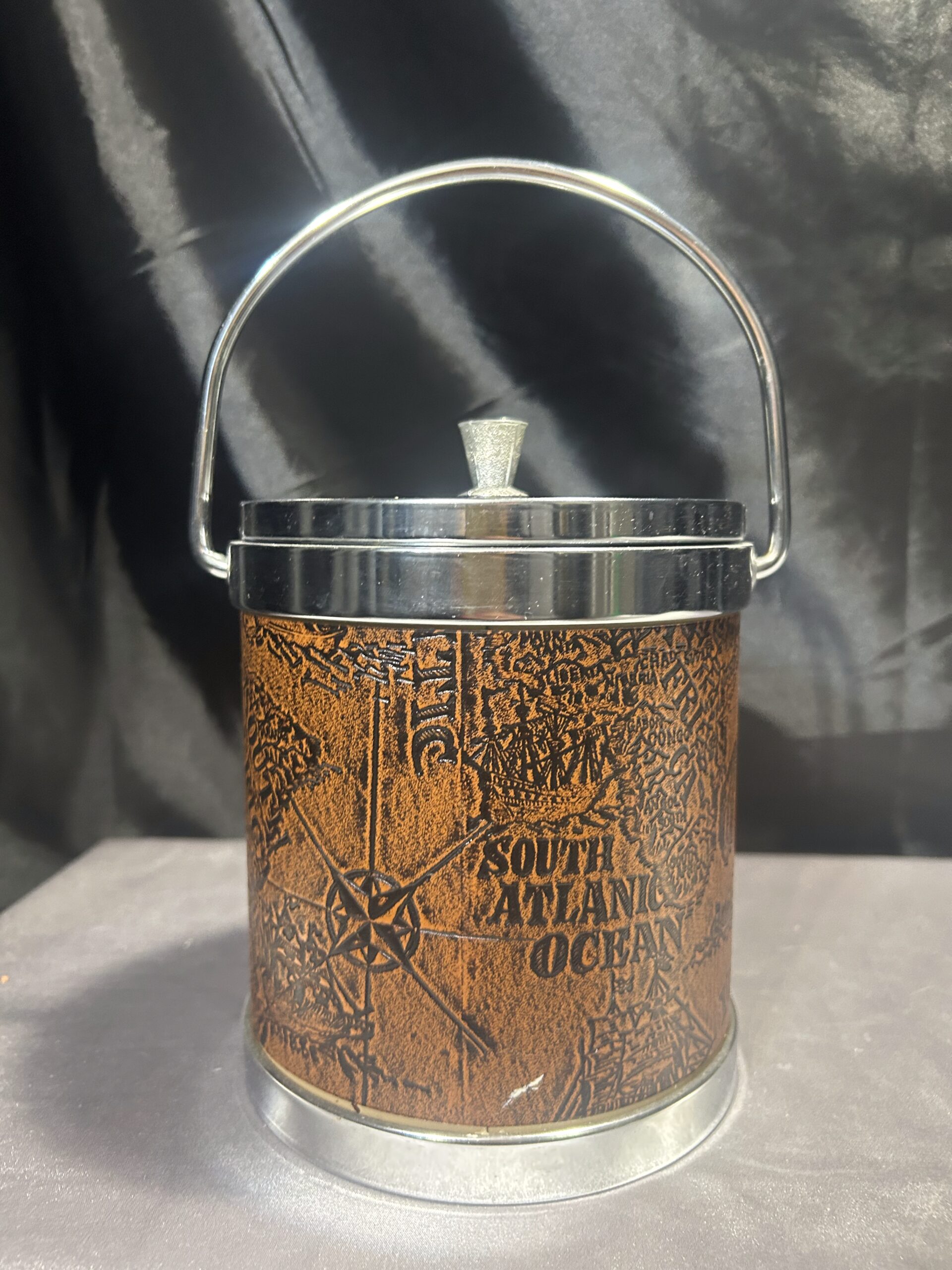Elegancki i funkcjonalny pojemnik na lód, który łączy klasyczny styl z nowoczesnym designem. Jego unikalny wygląd podkreśla brązowa ekoskóra z tłoczoną mapą, a srebrne metalowe zwieńczenie i uchwyt dodają mu wyrafinowanego charakteru. Idealny do eleganckich wnętrz oraz dla miłośników stylu vintage.