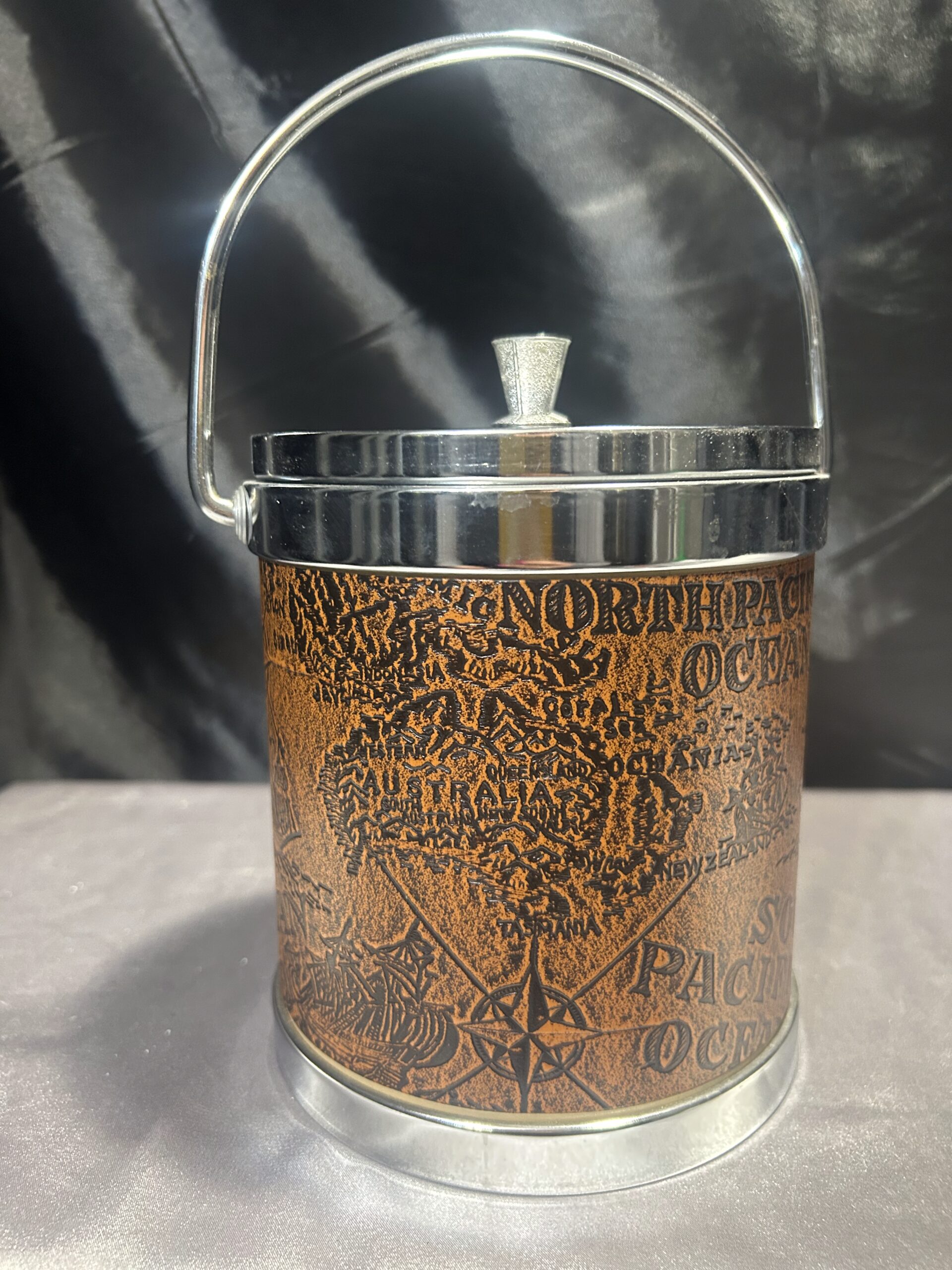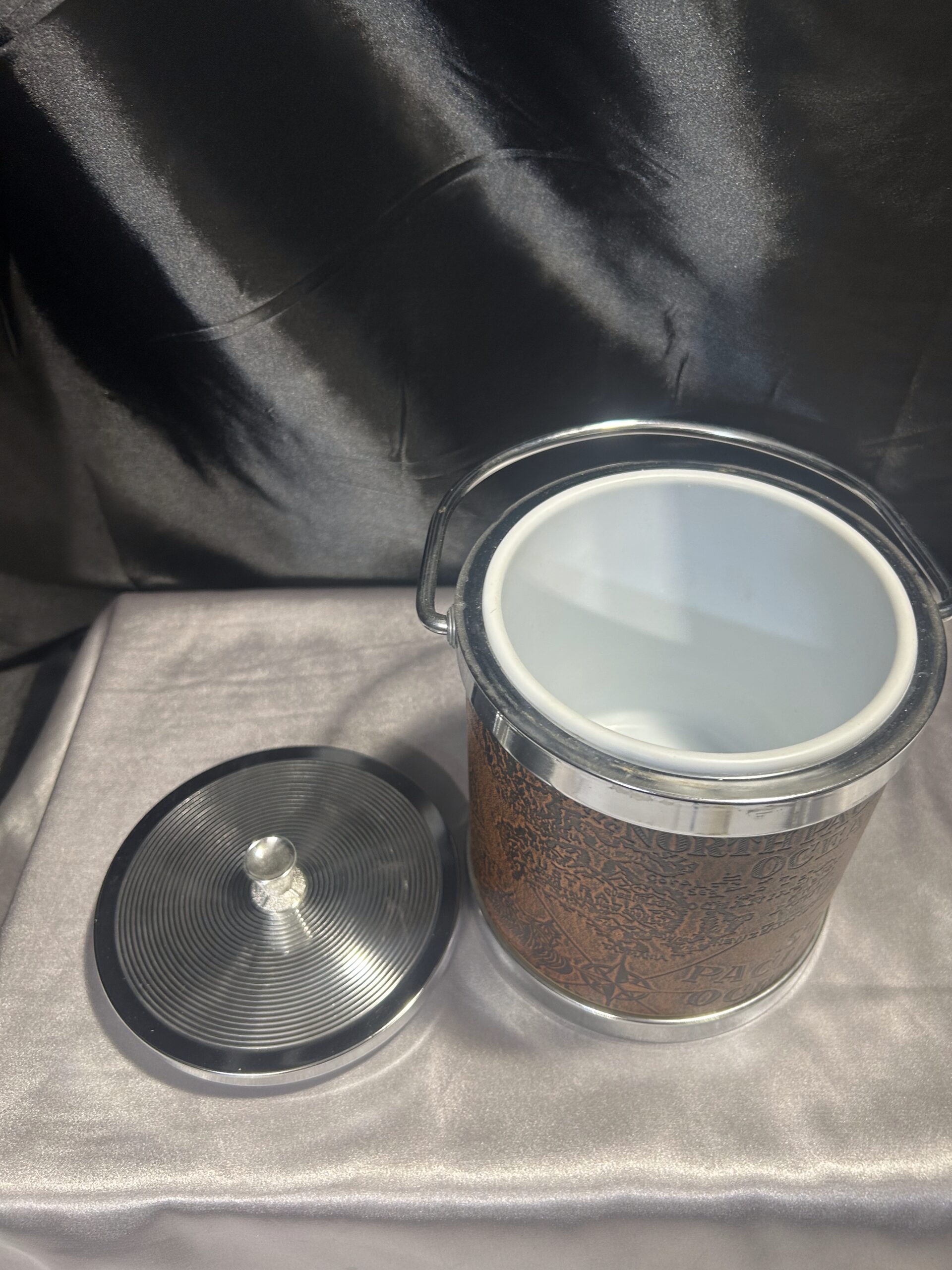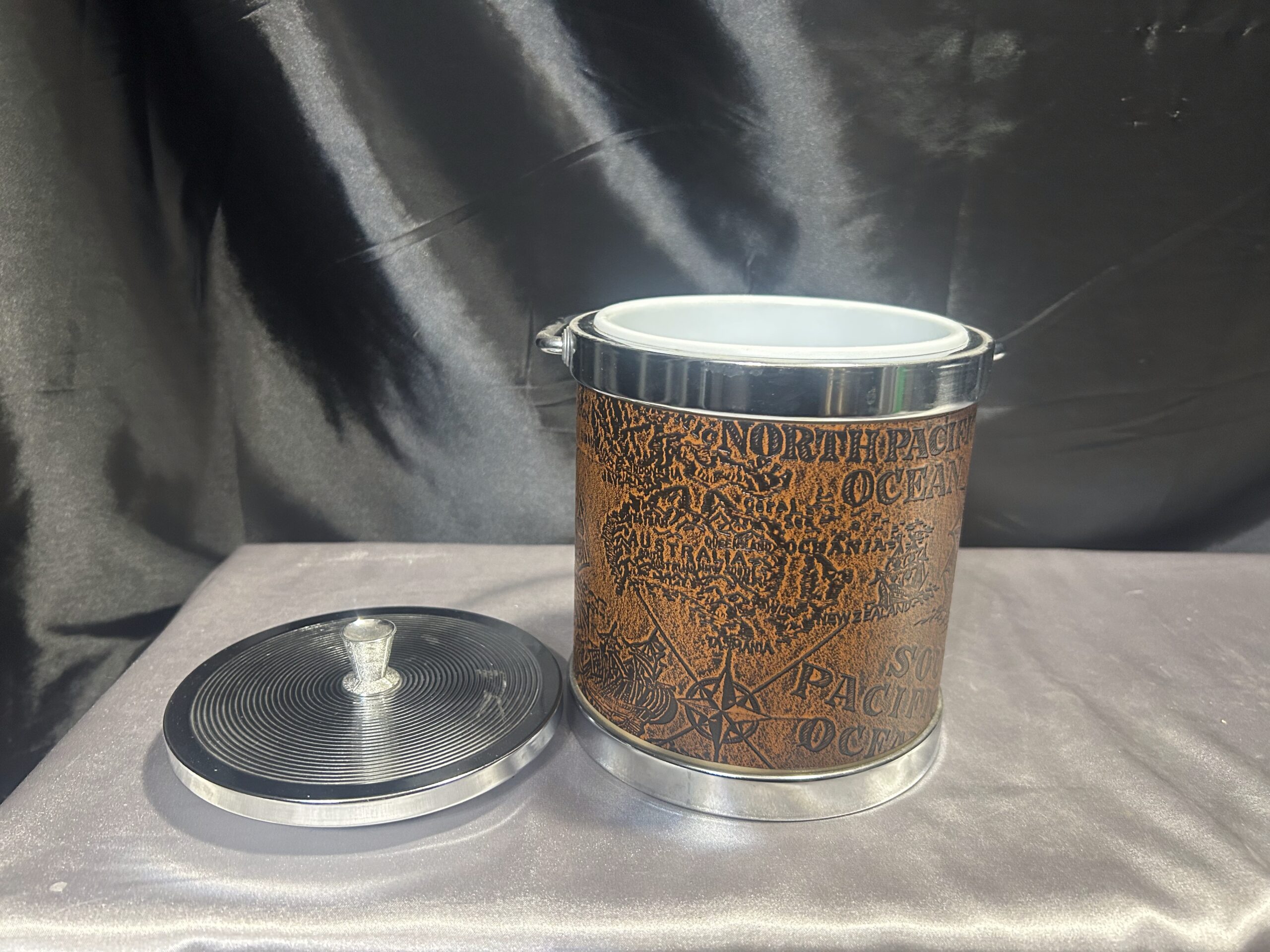 Stylowy Pojemnik na Lód – Metal i Ekoskóra z Tłoczoną Mapą