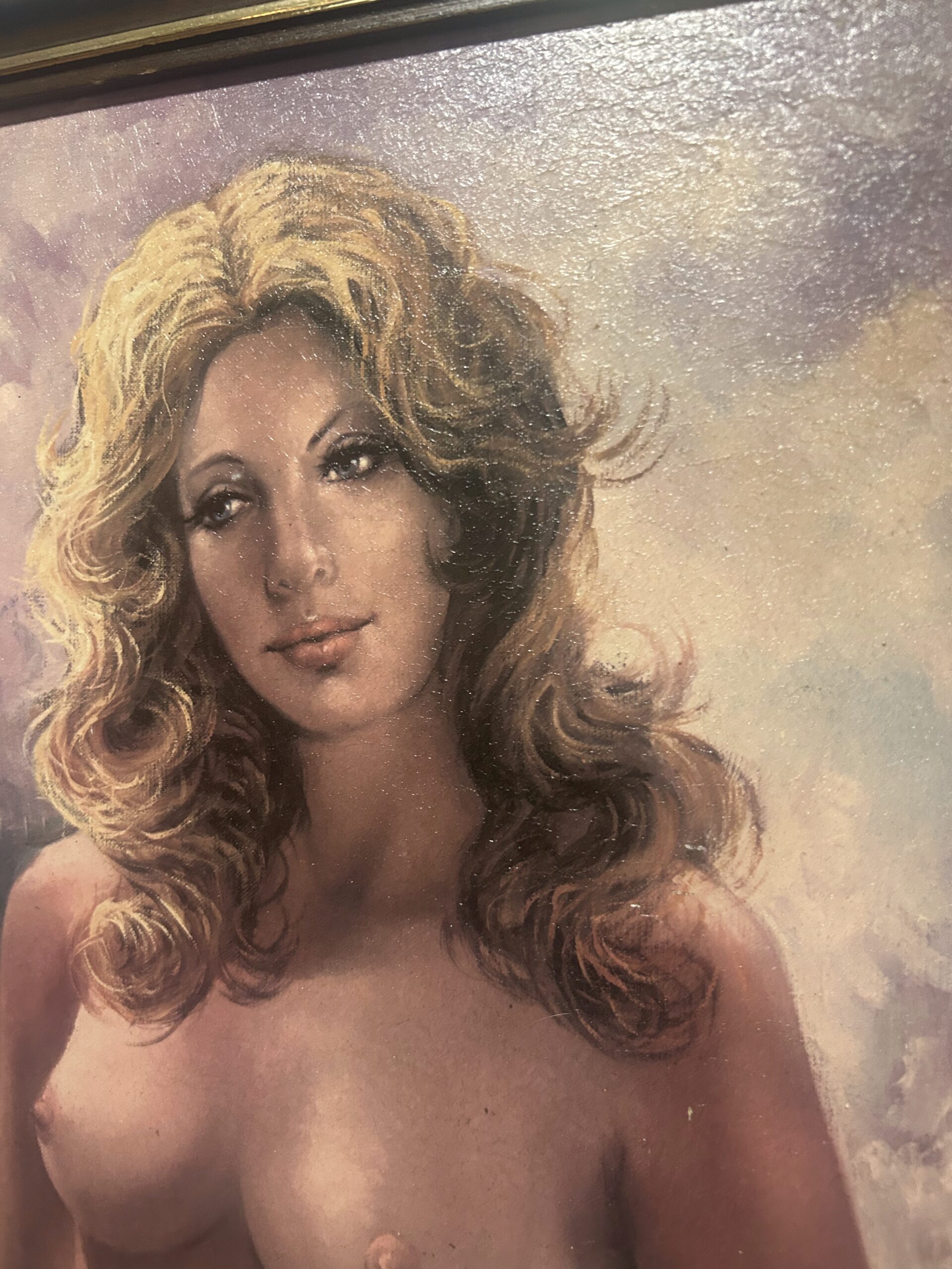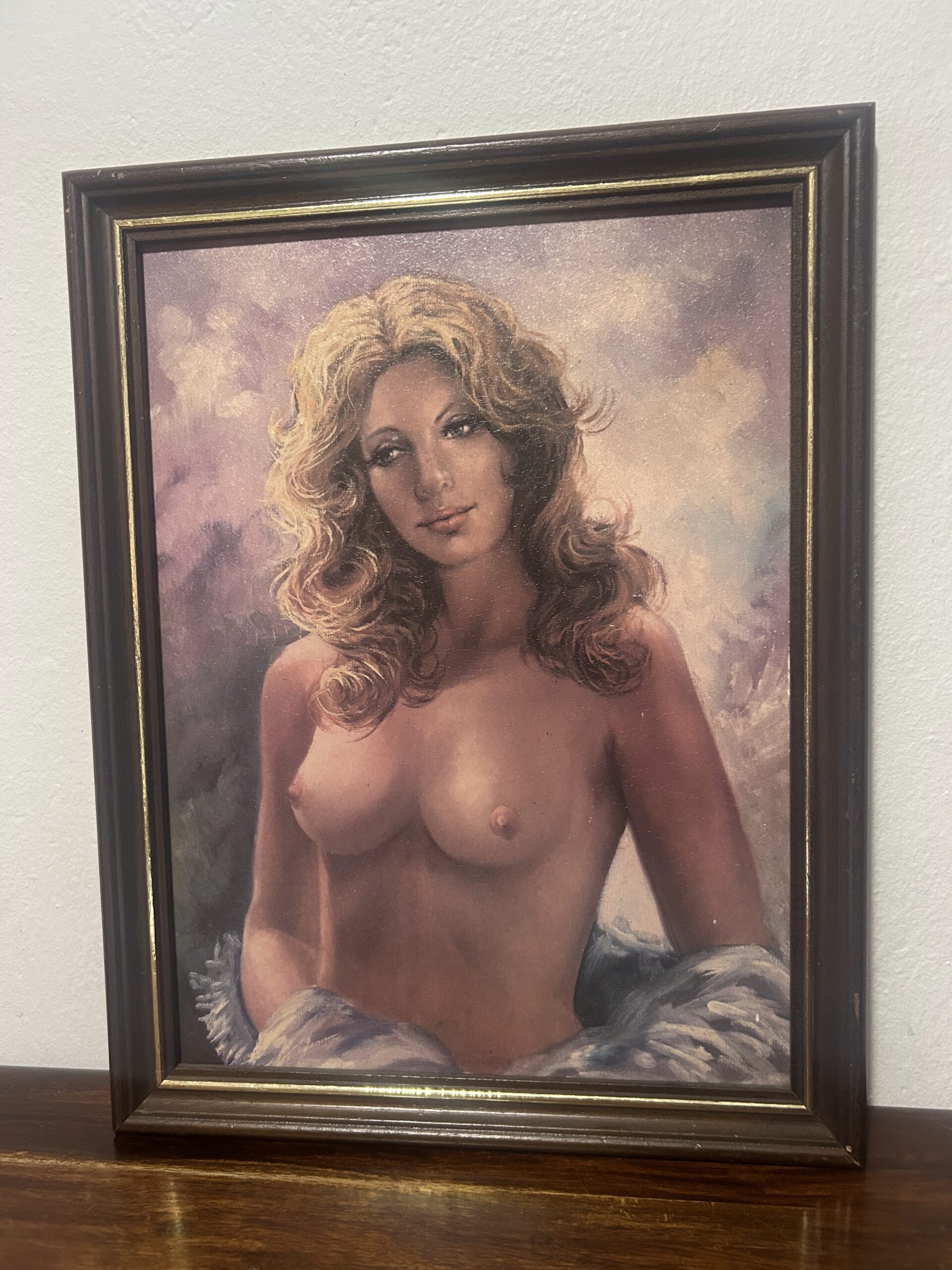 Prezentuję wyjątkowy obraz przedstawiający subtelny akt kobiety – blondynki o kręconych włosach. Ujęta do pasa postać emanuje wdziękiem, delikatnością i klasycznym pięknem. To dzieło, które przyciąga spojrzenia i wprowadza do wnętrza aurę elegancji i intymności.