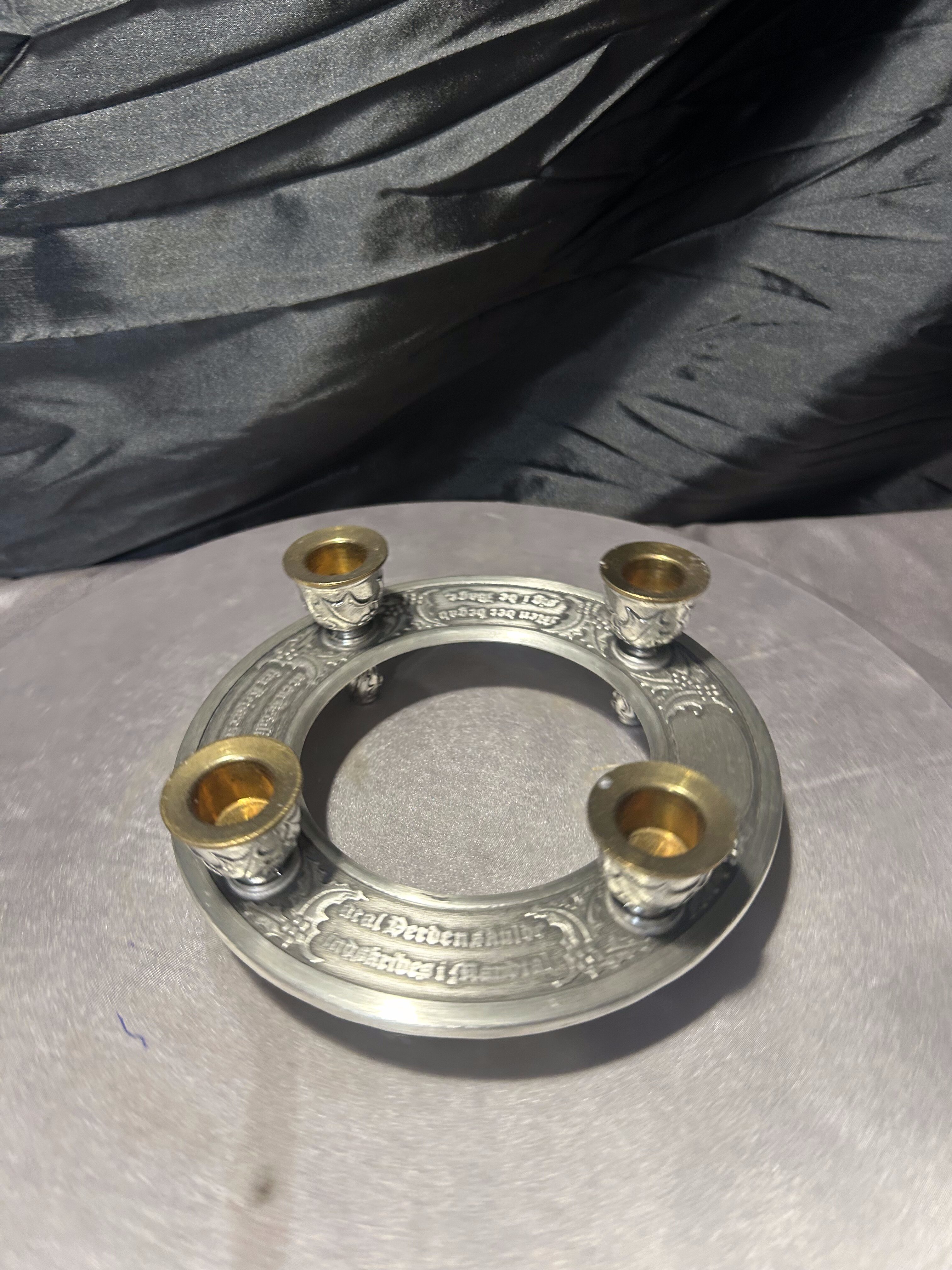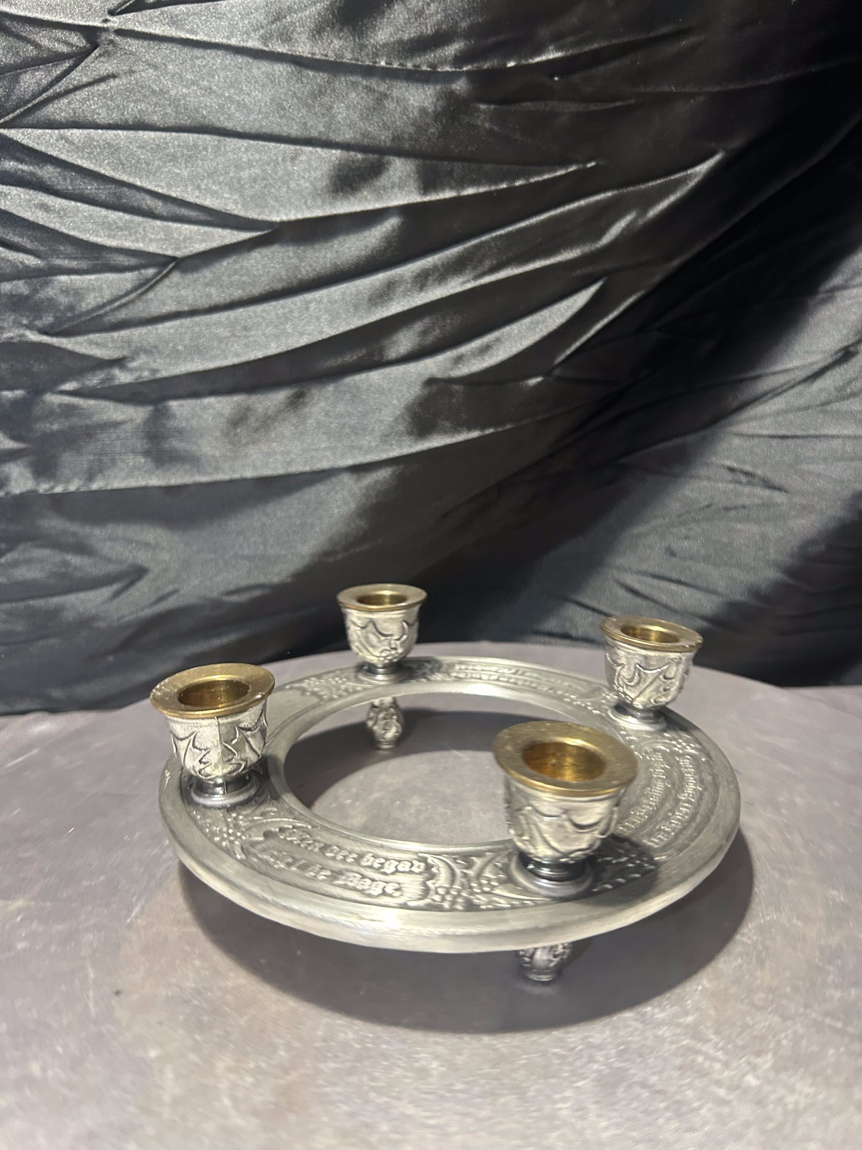 Elegancki świecznik adwentowy przeznaczony na cztery świece, wykonany w dekoracyjnym, srebrnym kolorze z subtelnymi złotymi zdobieniami wewnątrz kielichów na świece. Okrągła forma oraz starannie wykonane ornamenty nadają całości klasyczny i bardzo dekoracyjny charakter.