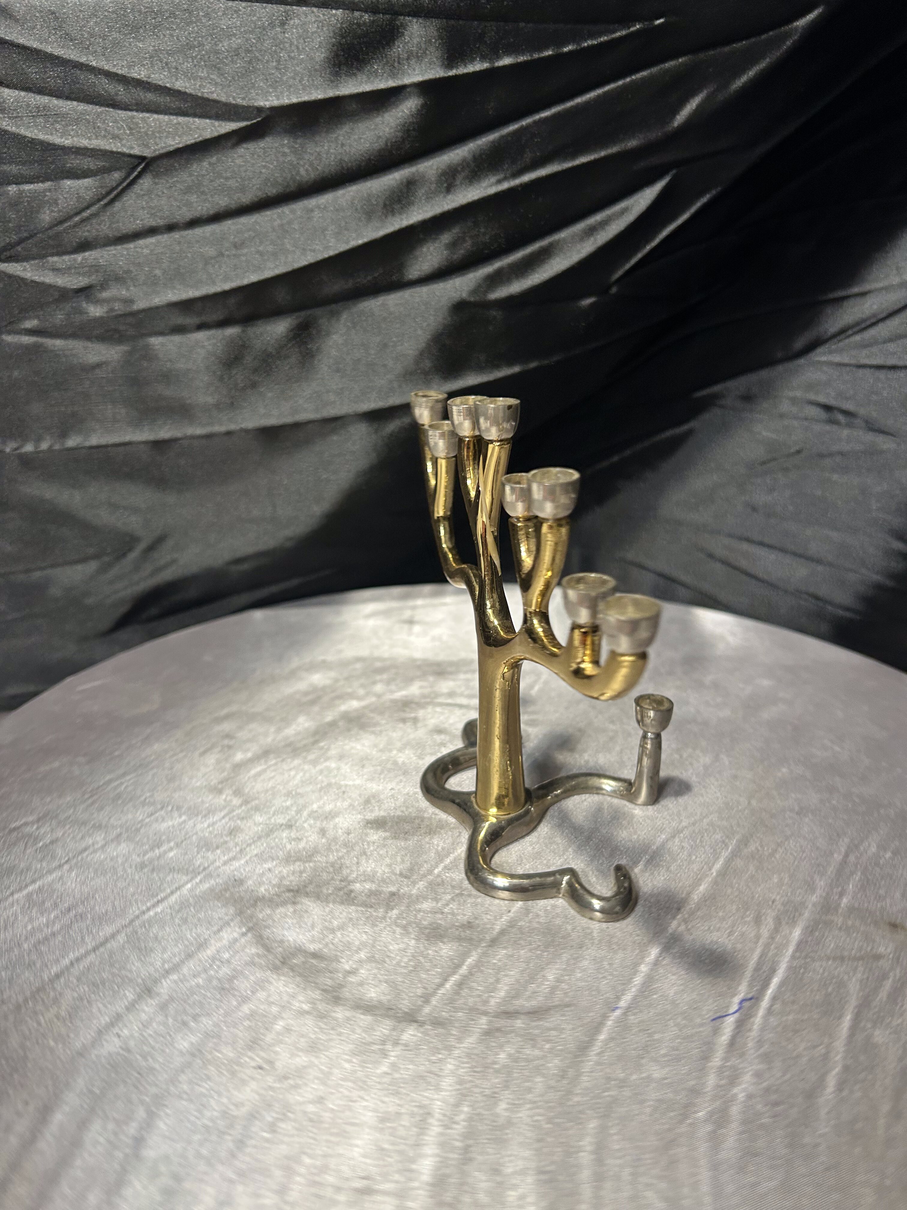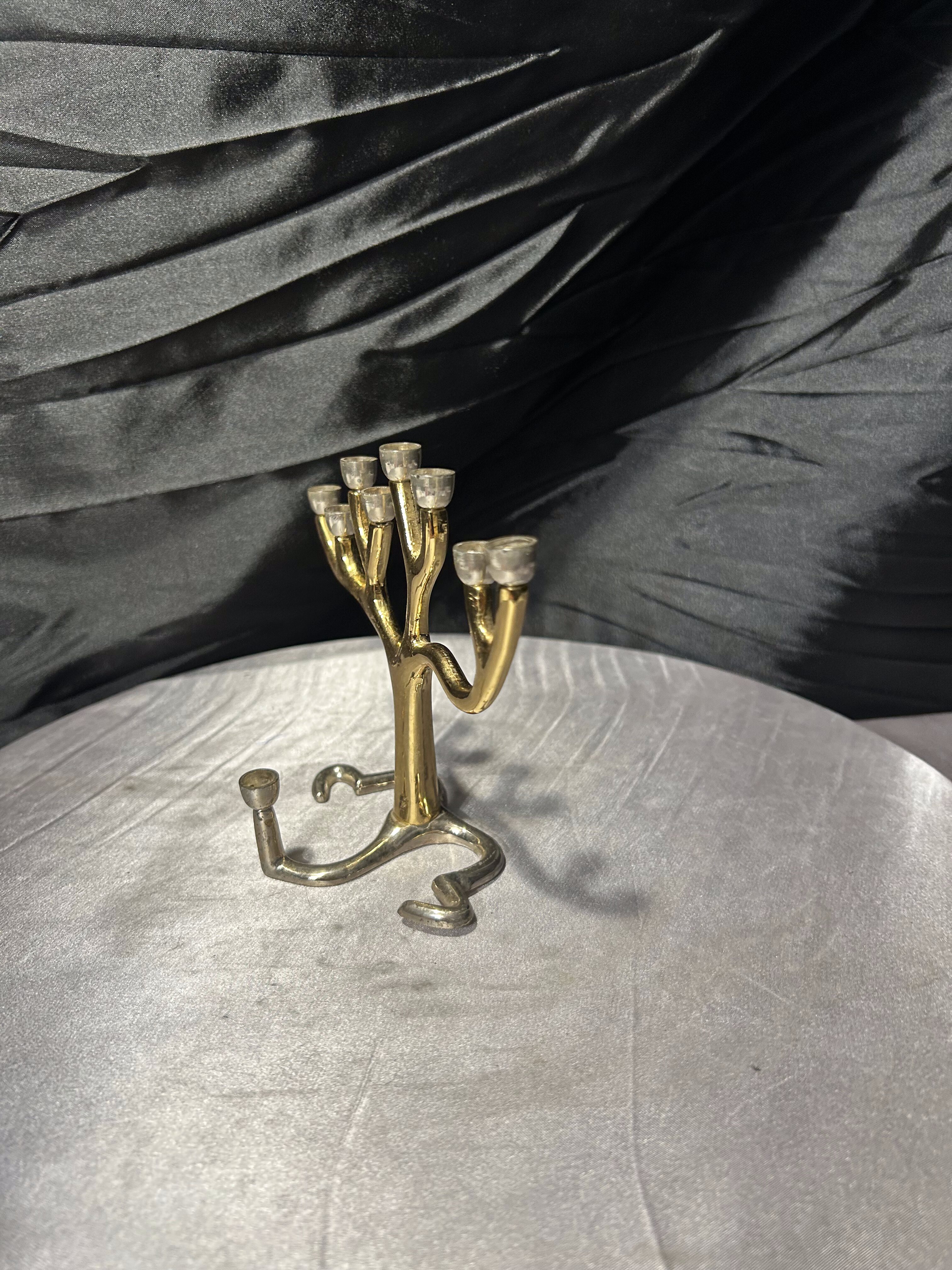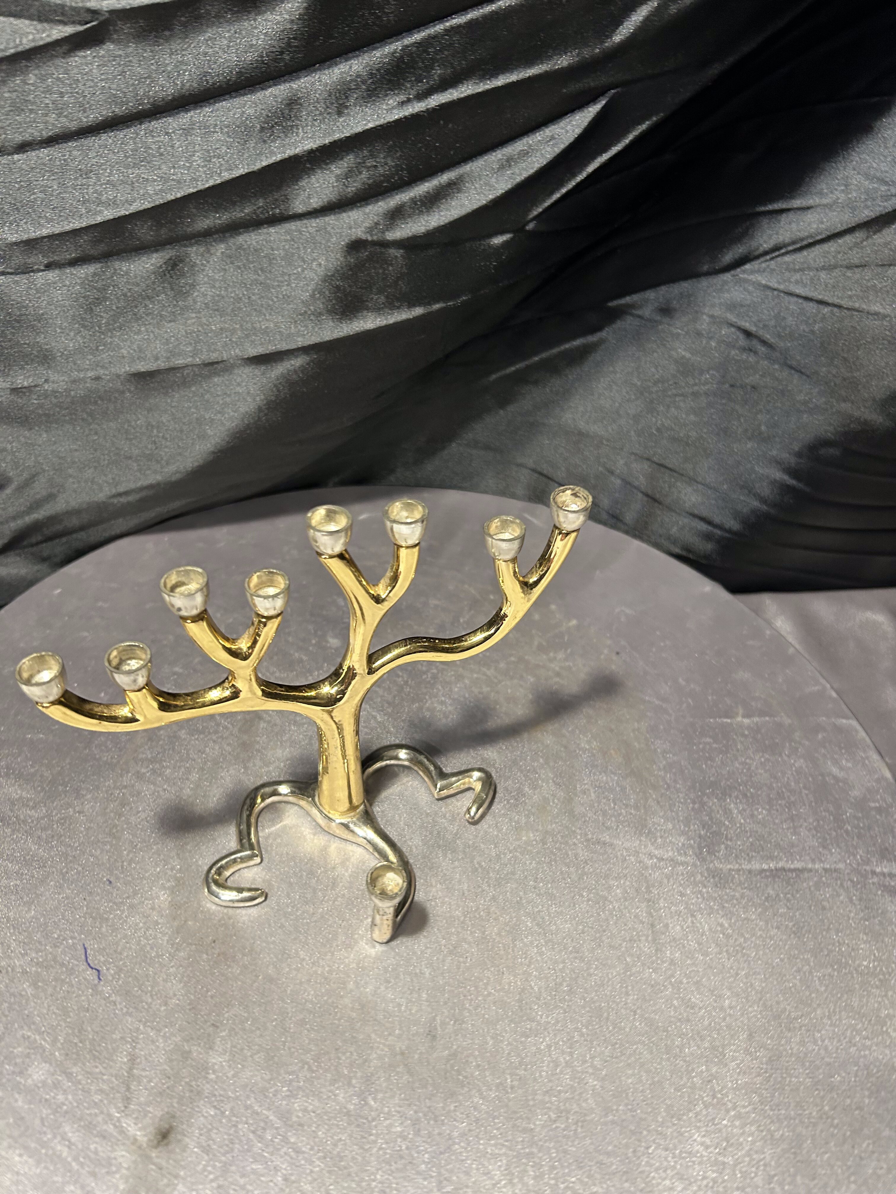 Elegancki świecznik chanukowy przeznaczony na 9 świec – osiem świec chanukowych oraz dodatkową świecę szames umieszczoną z przodu. Forma dekoracyjna, stabilna, z ciekawym rozgałęzionym układem ramion. Przedmiot łączy funkcję użytkową z ozdobną, dobrze prezentuje się zarówno podczas święta Chanuki, jak i jako element wystroju wnętrza.