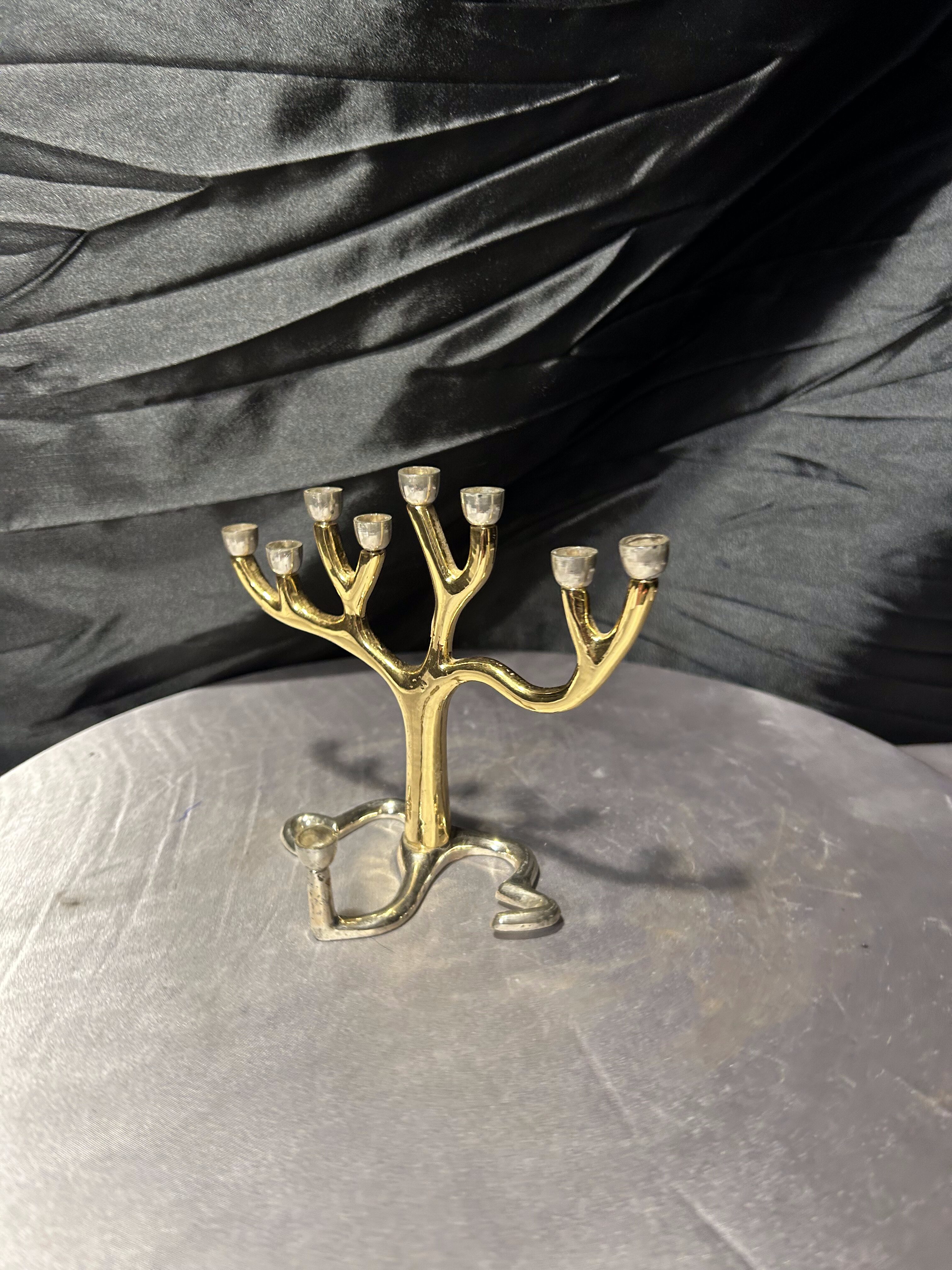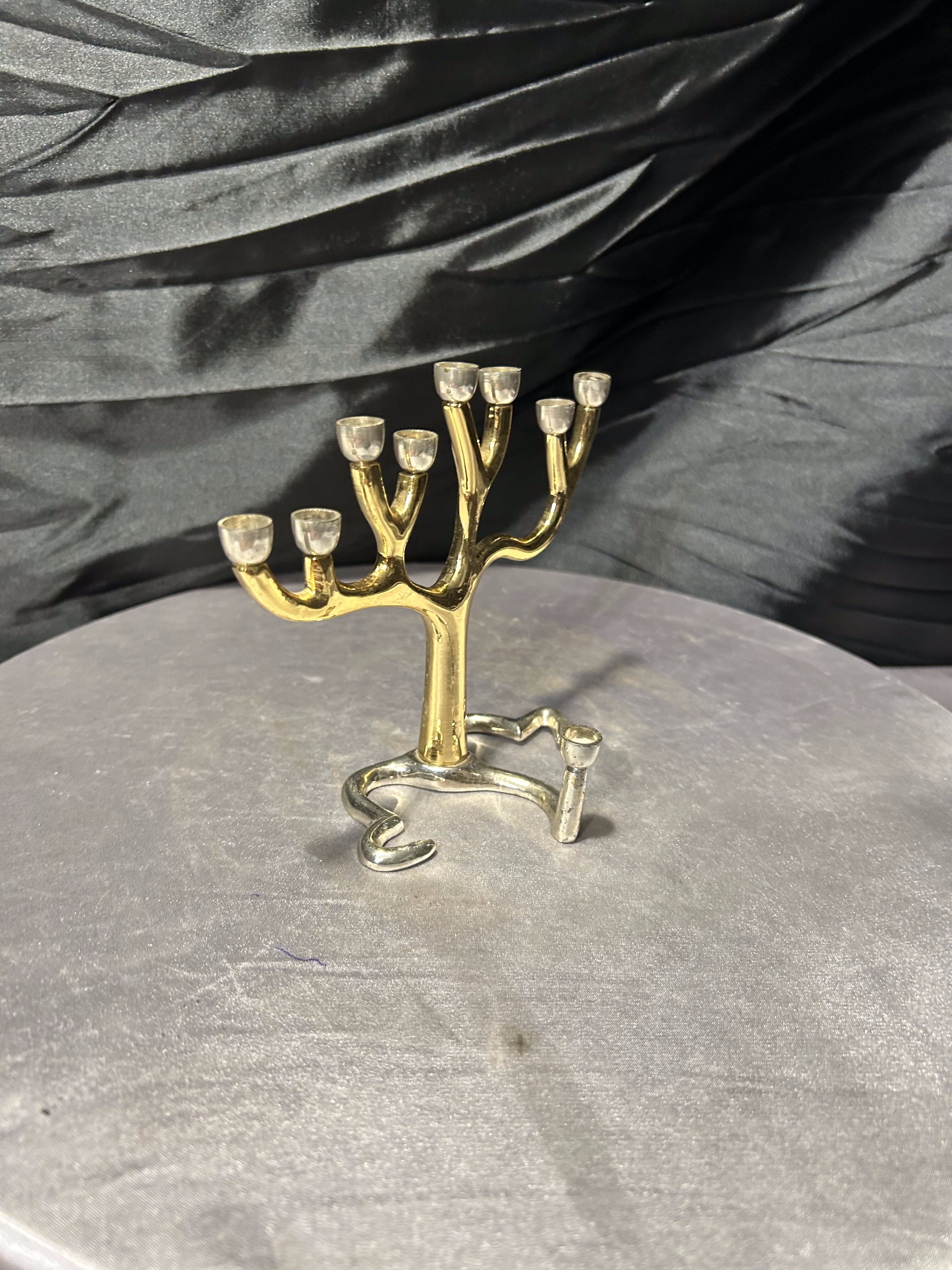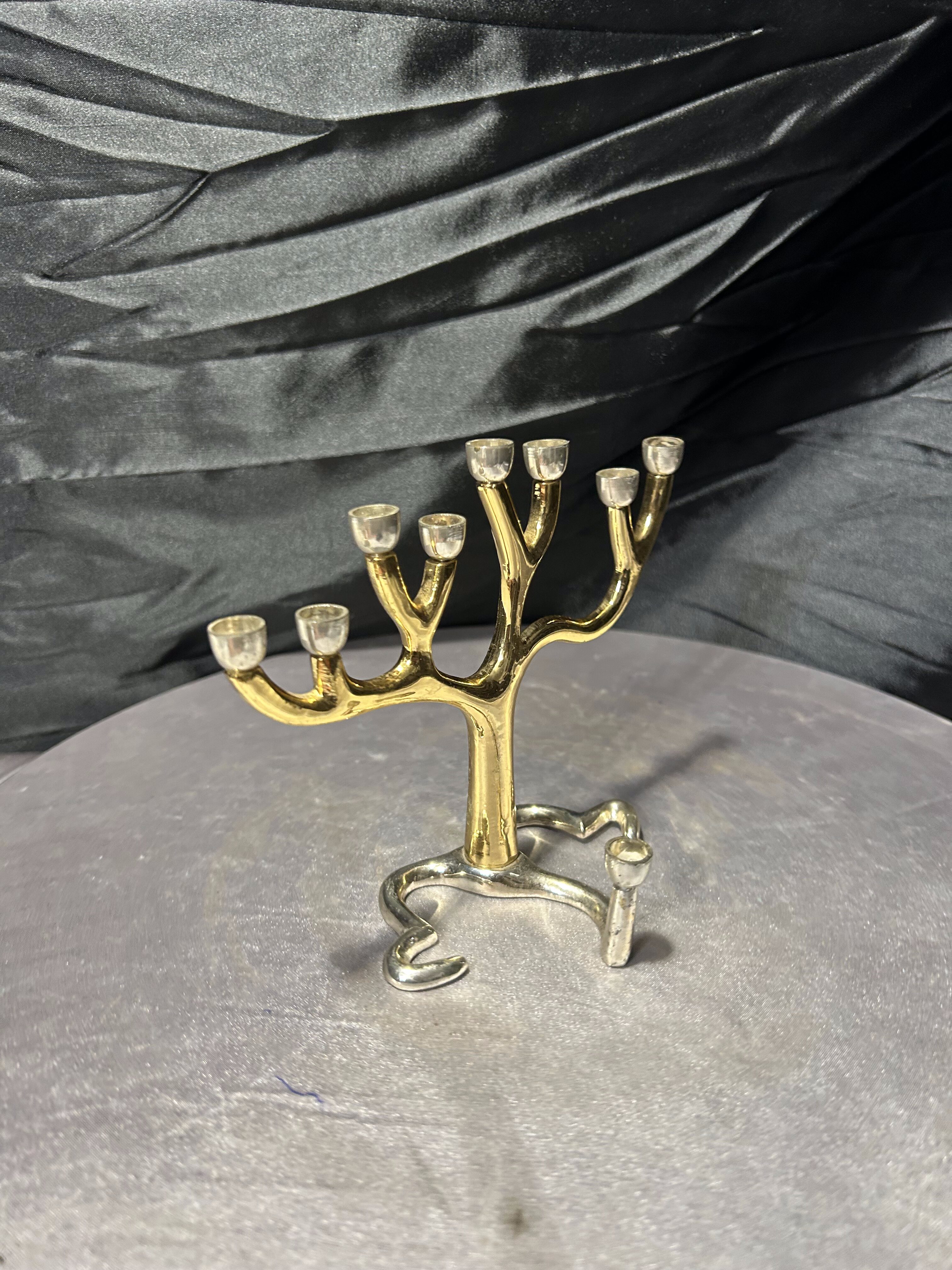 Elegancki świecznik chanukowy przeznaczony na 9 świec – osiem świec chanukowych oraz dodatkową świecę szames umieszczoną z przodu. Forma dekoracyjna, stabilna, z ciekawym rozgałęzionym układem ramion. Przedmiot łączy funkcję użytkową z ozdobną, dobrze prezentuje się zarówno podczas święta Chanuki, jak i jako element wystroju wnętrza.