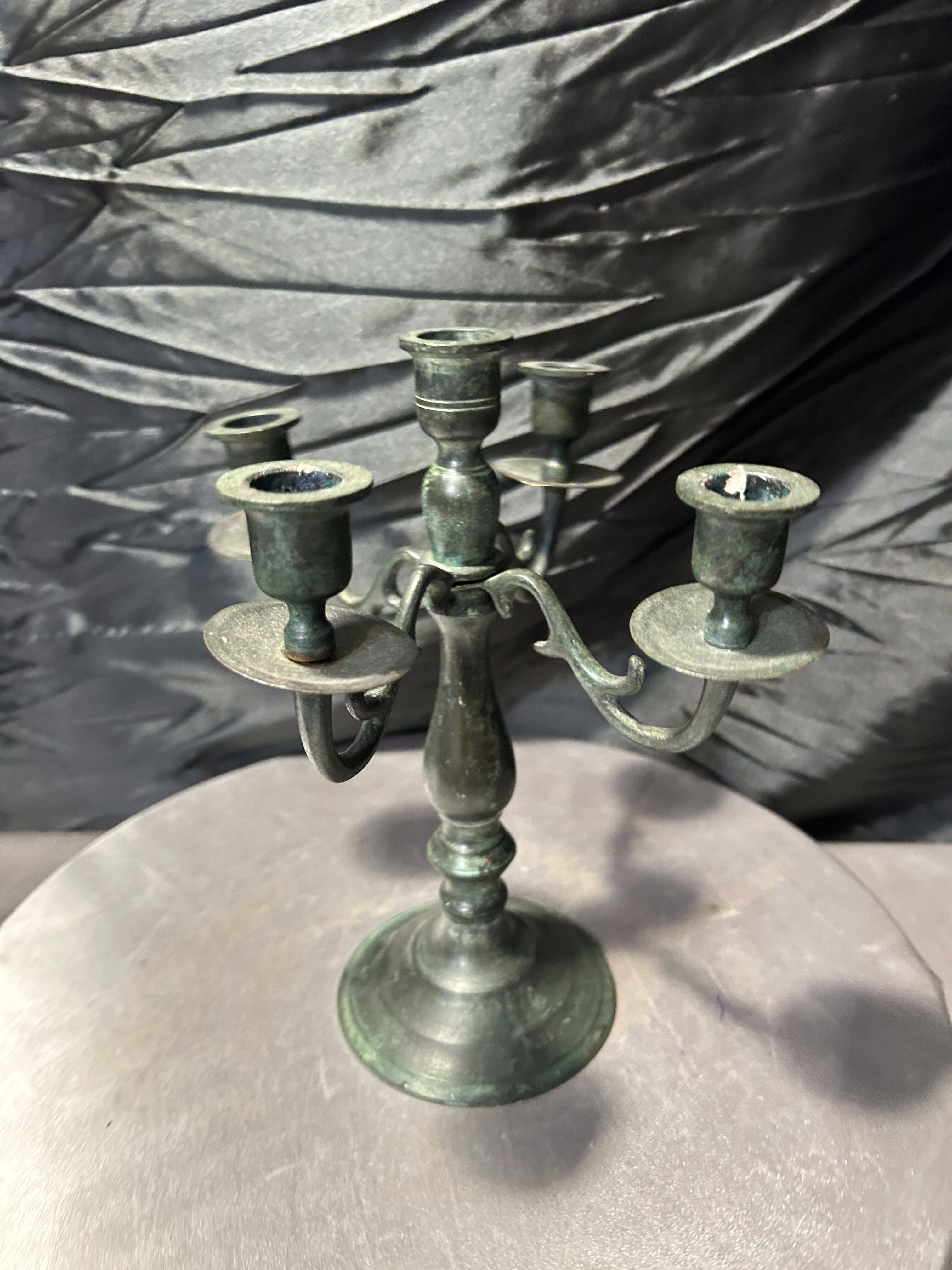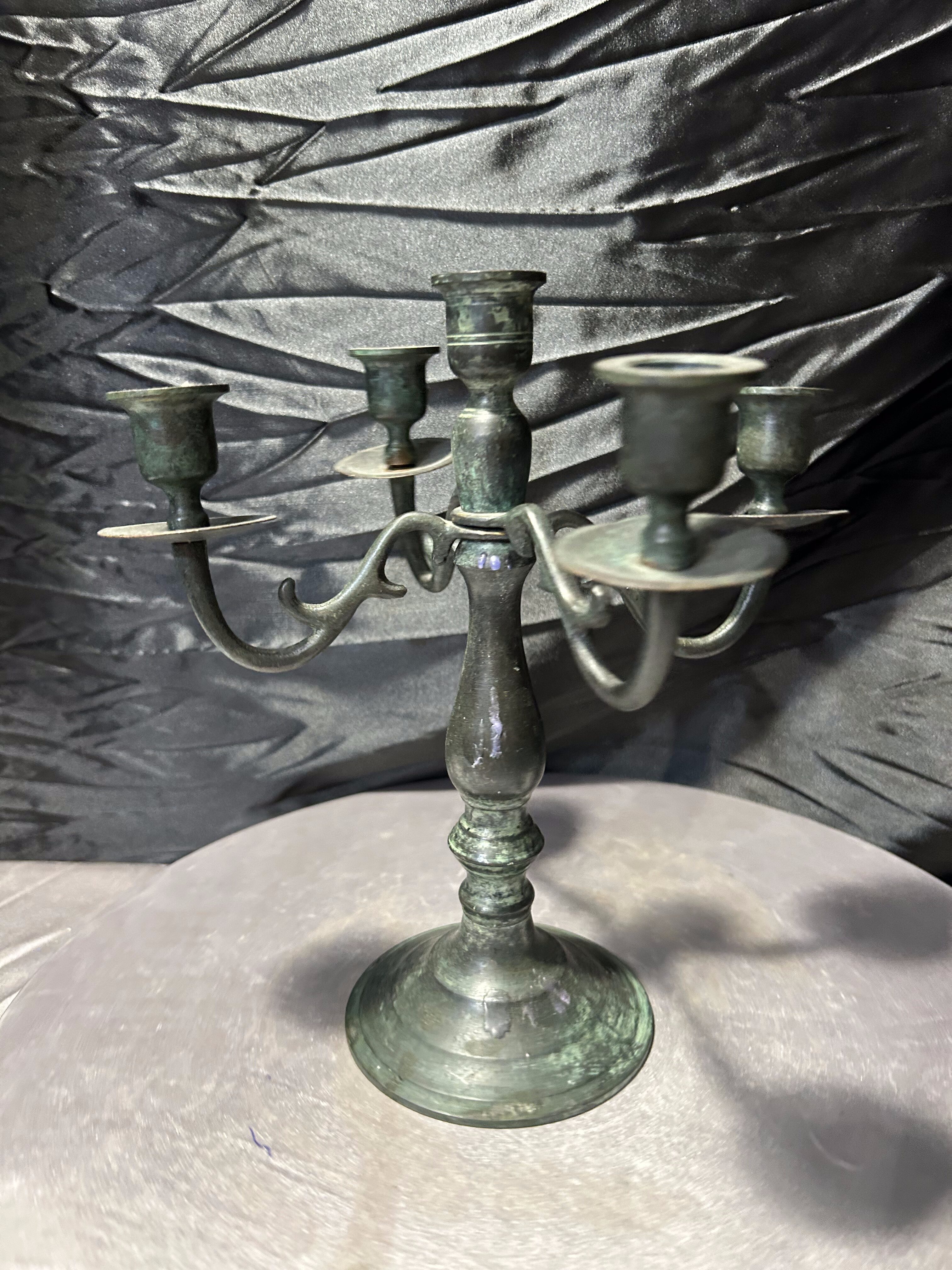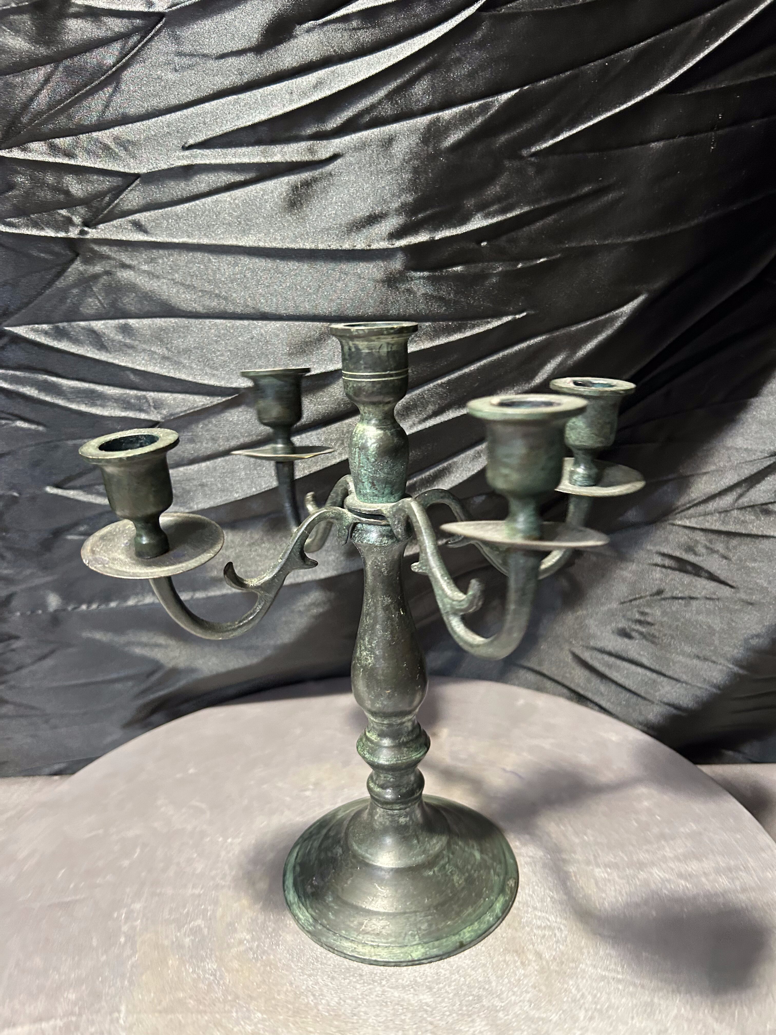 - Świecznik metalowy na 5 świec – patynowany kandelabr vintage