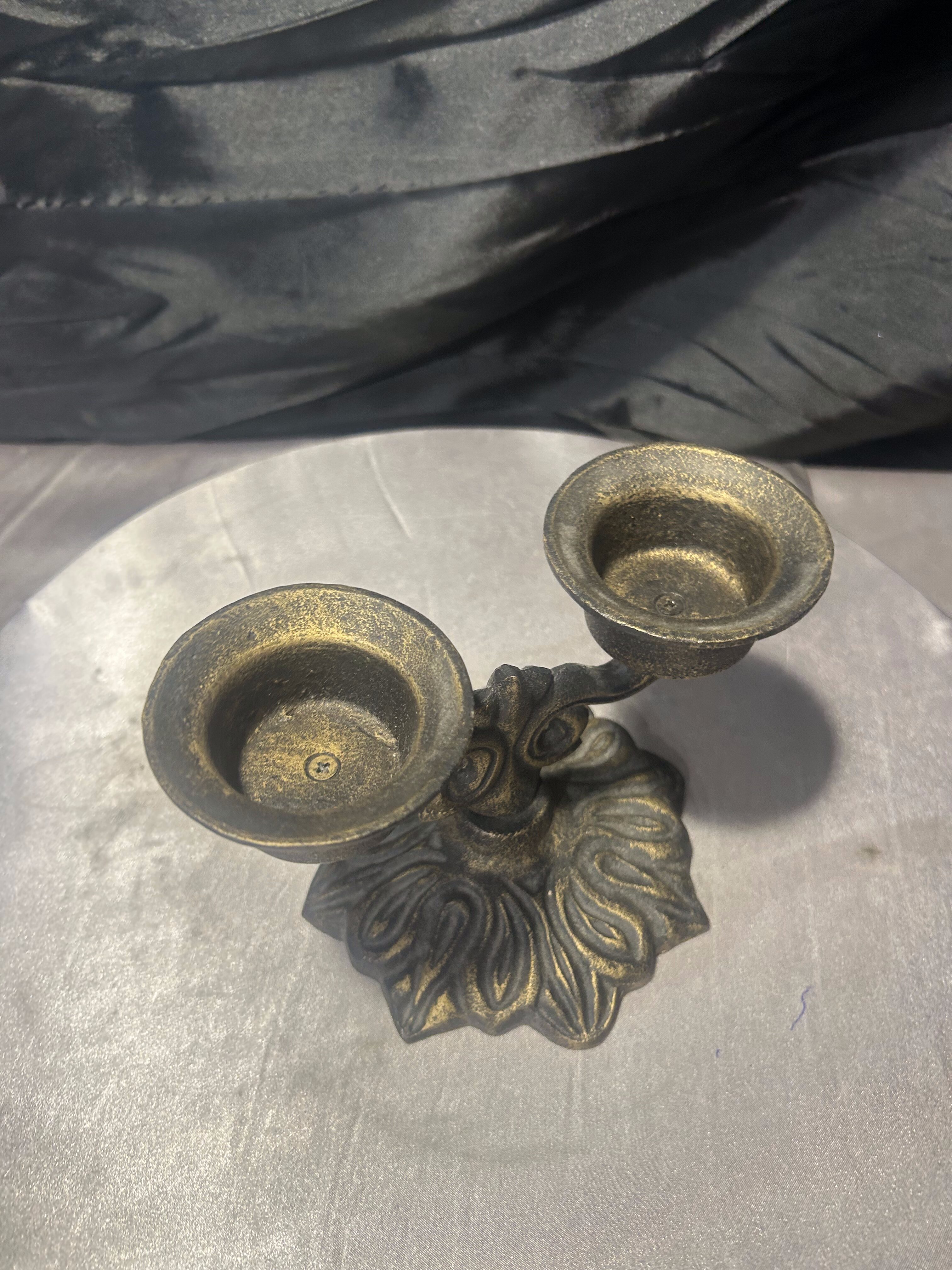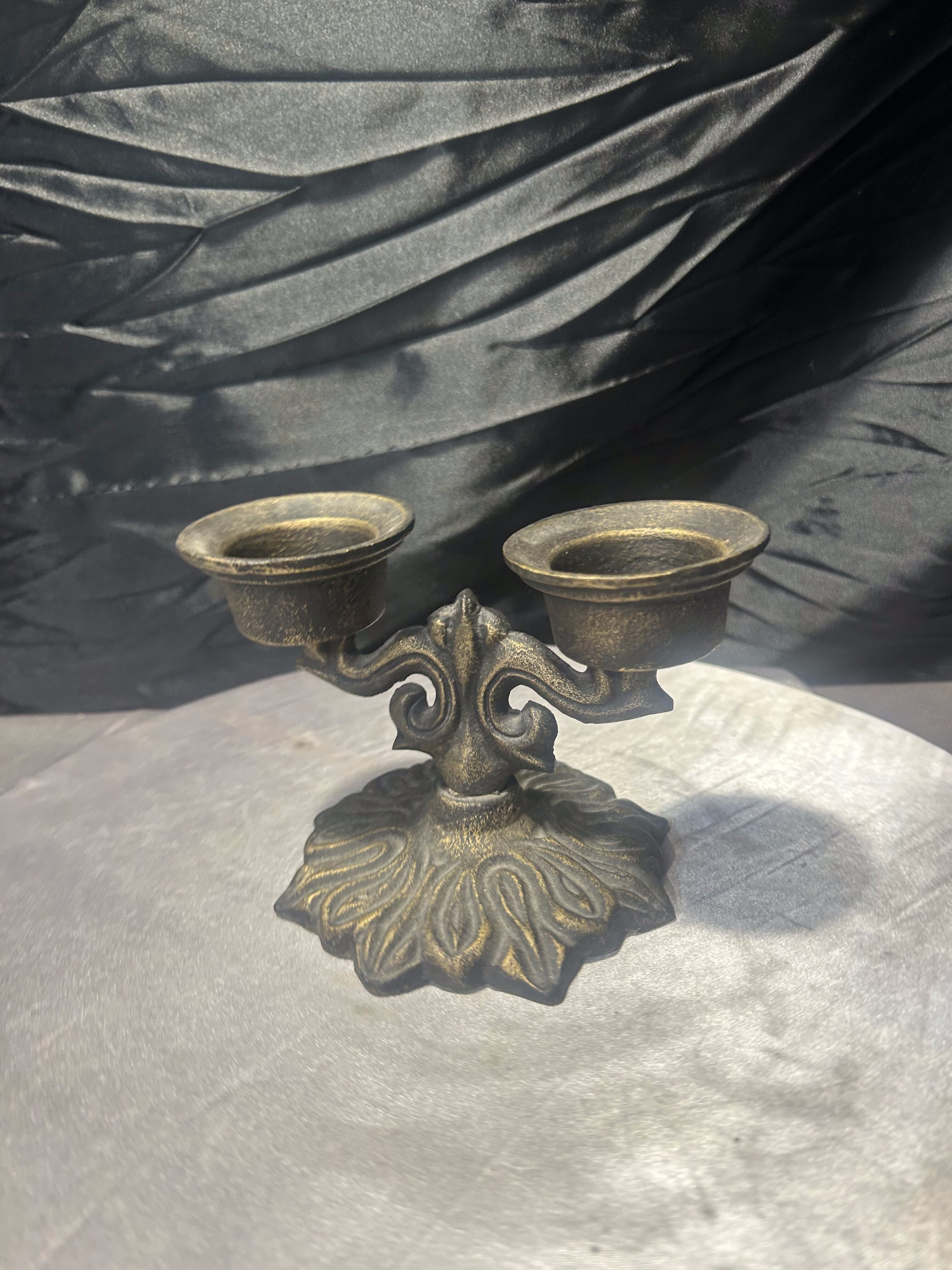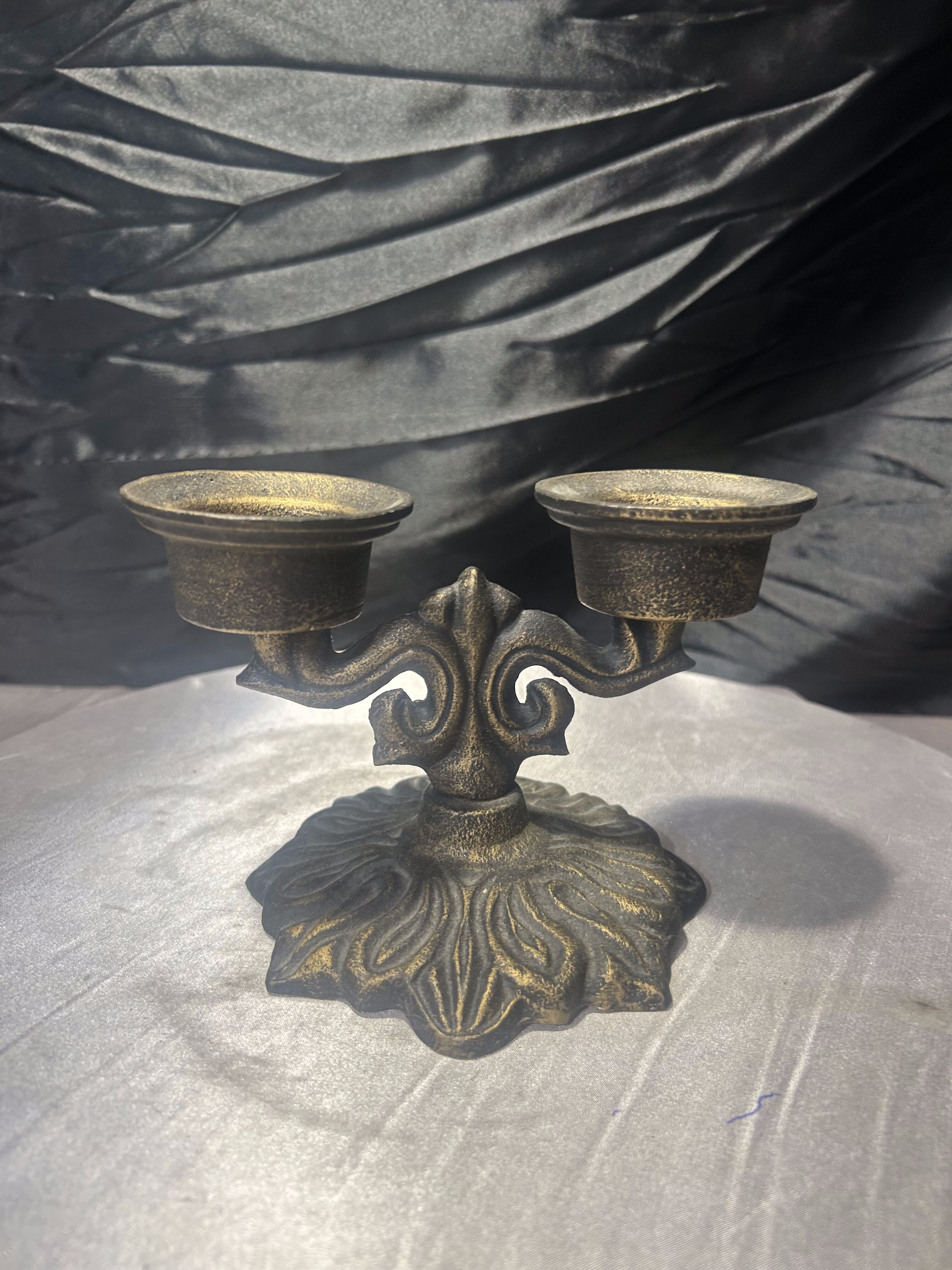 Elegancki świecznik wykonany z mosiądzu, przeznaczony na dwie szerokie świece. Forma została zaprojektowana w klasycznym stylu dekoracyjnym – masywna podstawa zdobiona jest motywem przypominającym stylizowane liście, z których wyrasta ozdobne, rozgałęzione ramię zakończone dwoma gniazdami na świece. Całość prezentuje się bardzo stabilnie i solidnie, a jednocześnie zachowuje elegancki, dekoracyjny charakter.