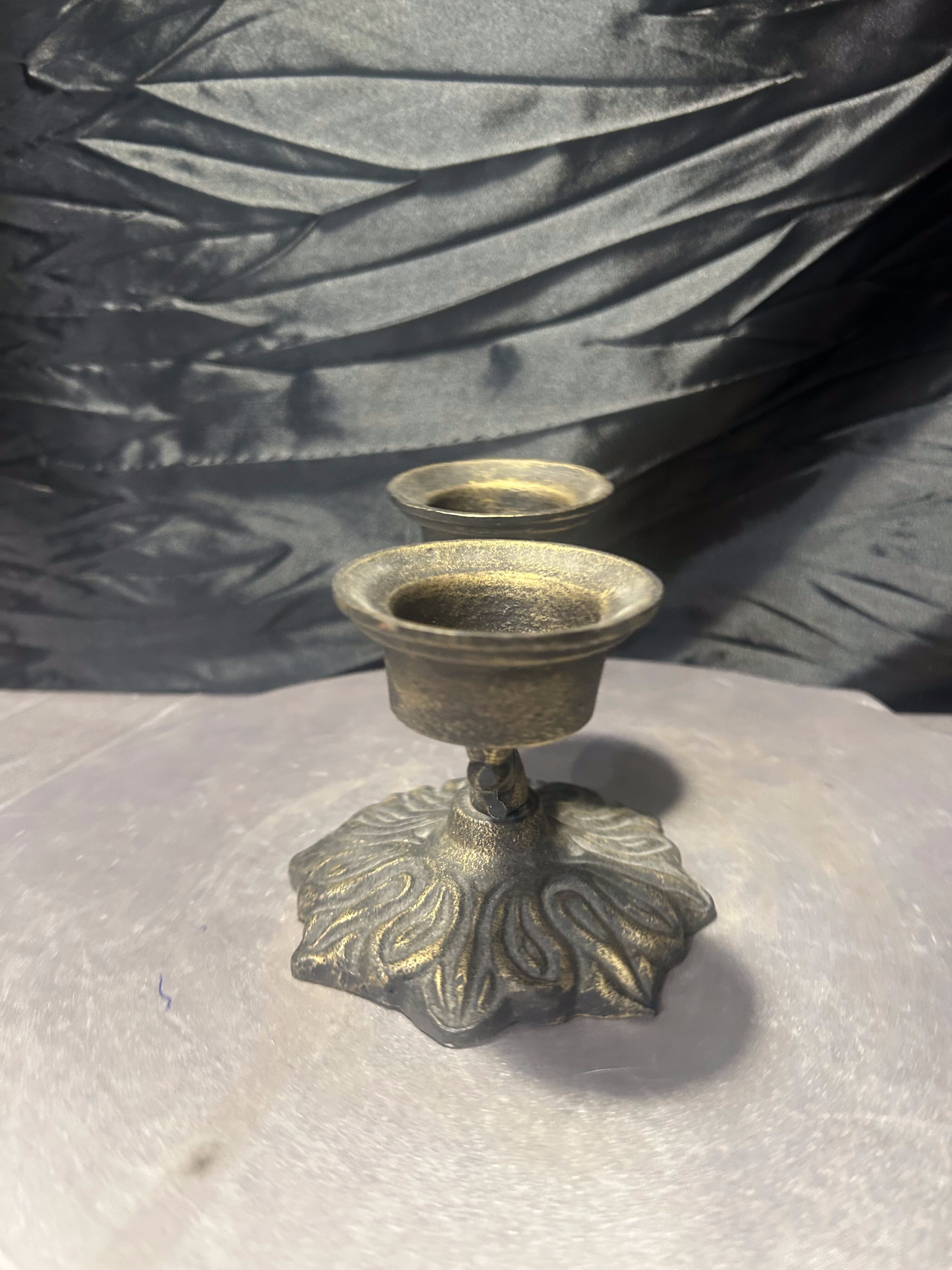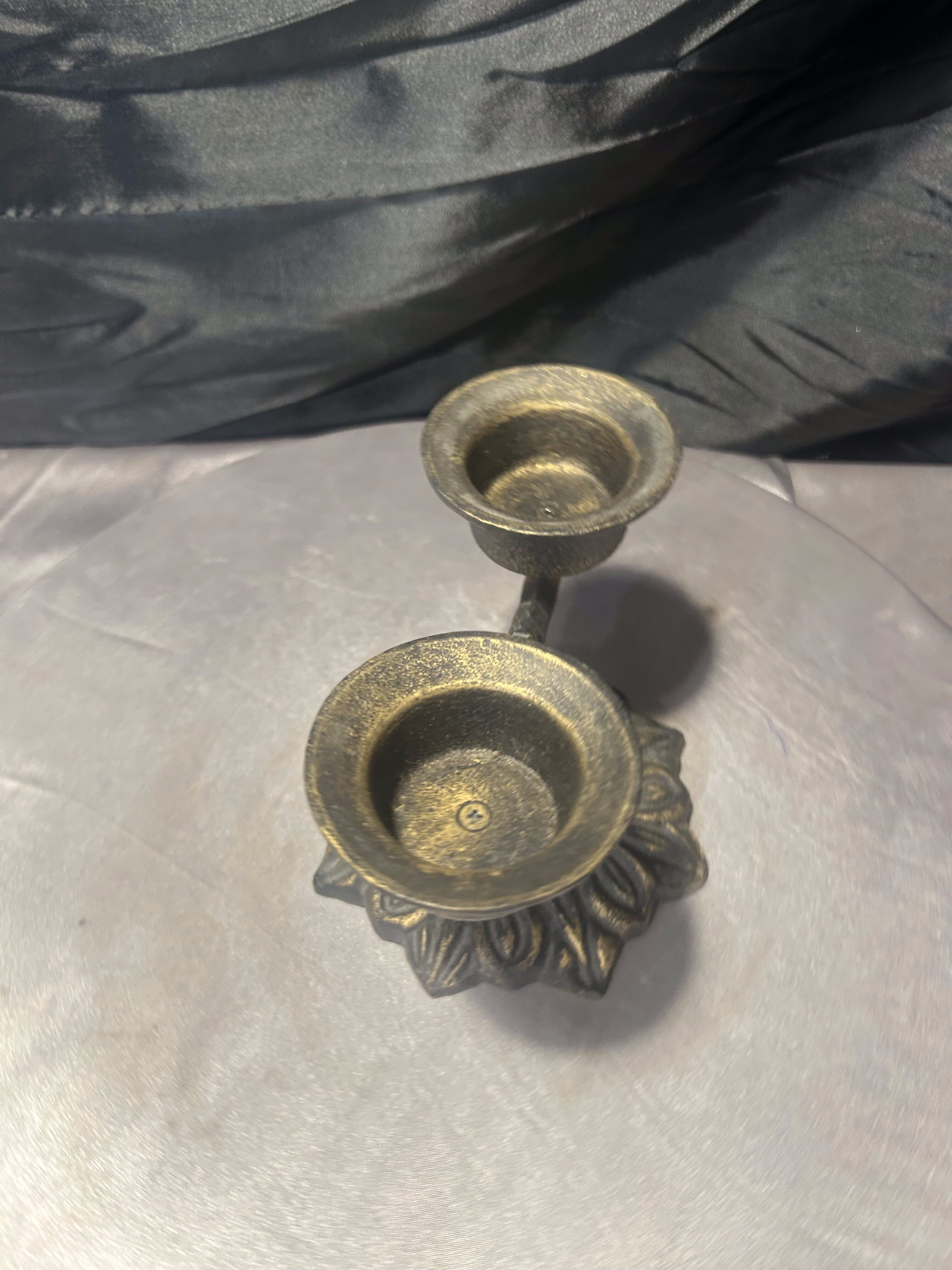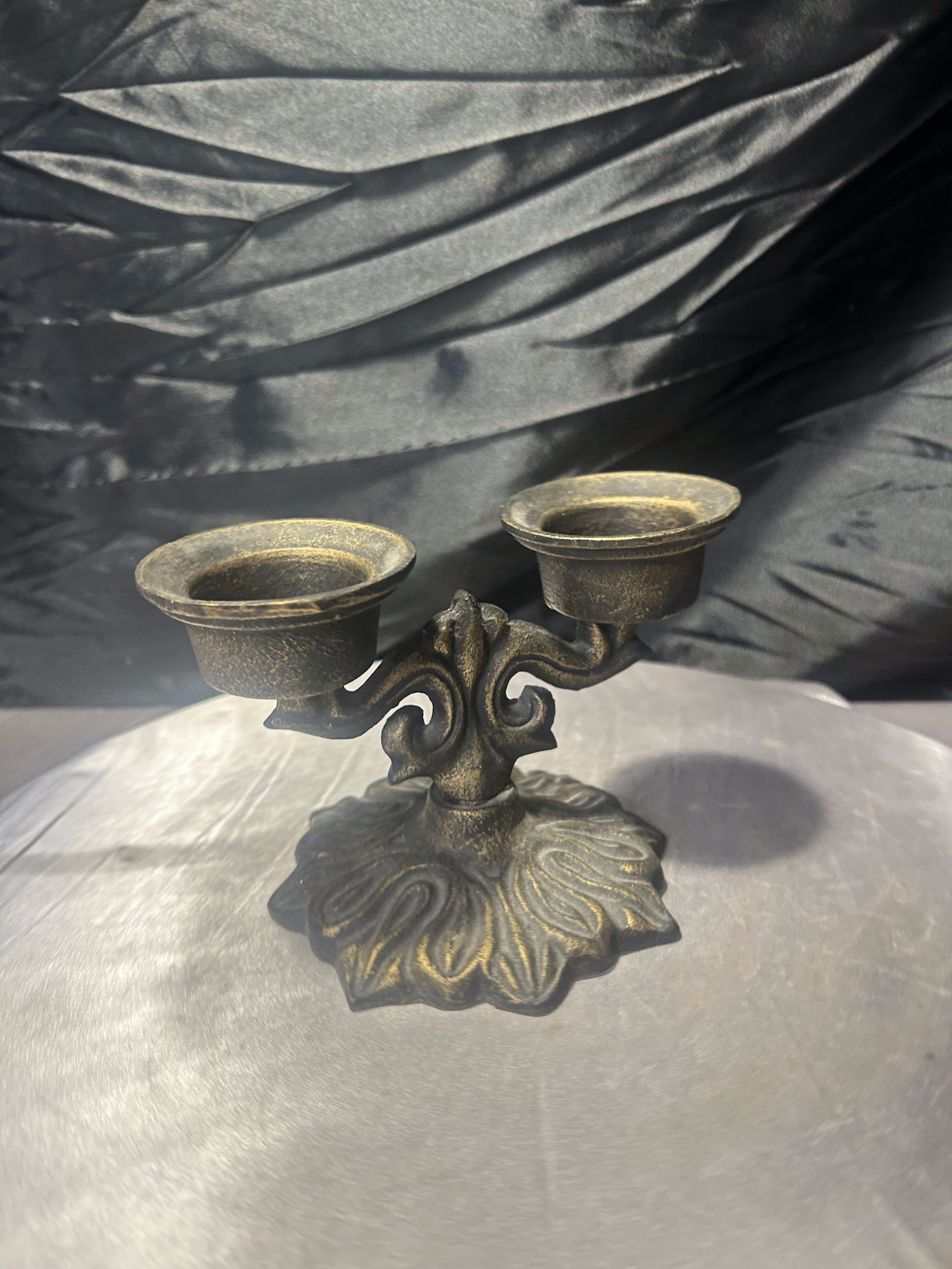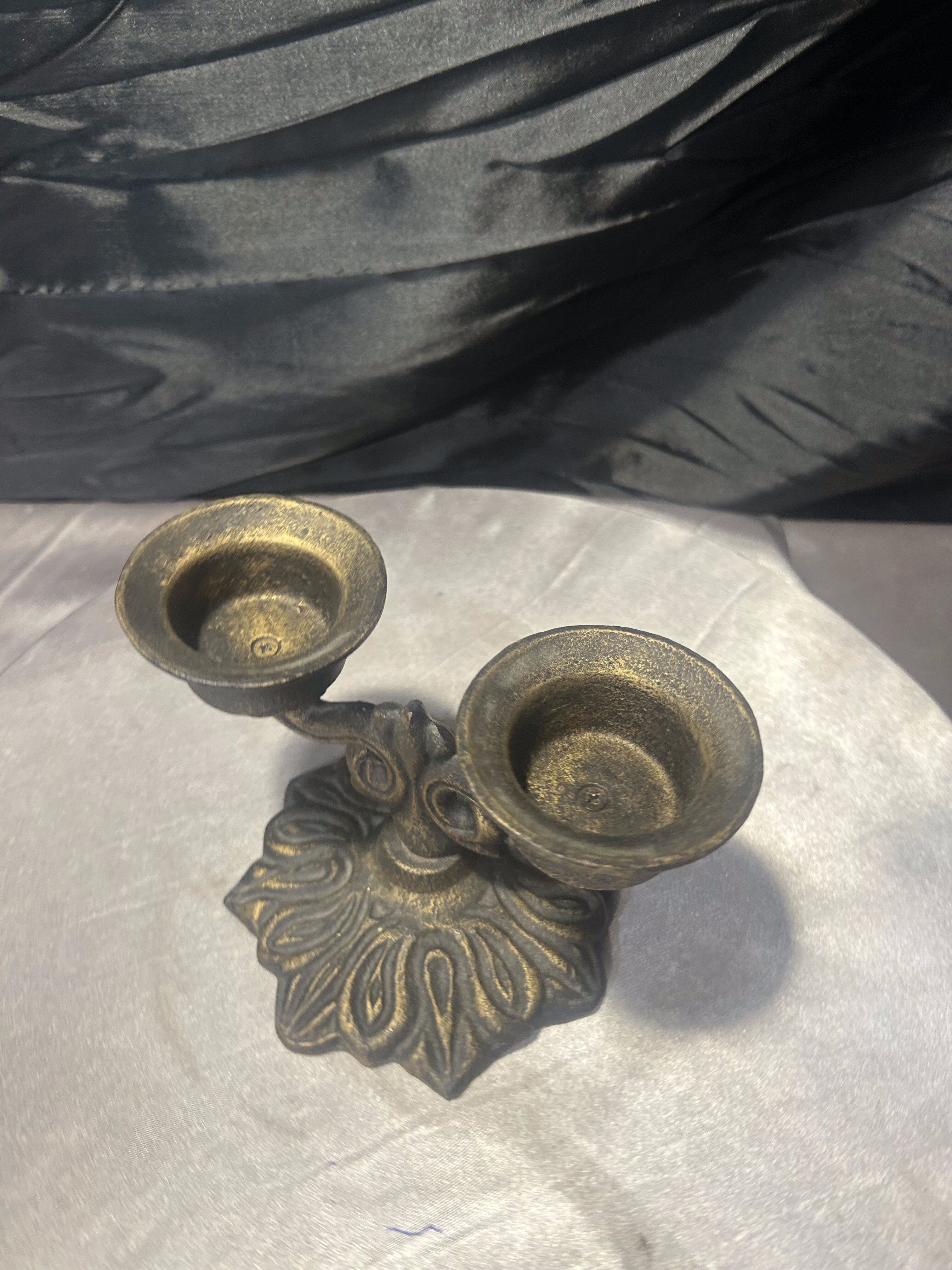 Elegancki świecznik wykonany z mosiądzu, przeznaczony na dwie szerokie świece. Forma została zaprojektowana w klasycznym stylu dekoracyjnym – masywna podstawa zdobiona jest motywem przypominającym stylizowane liście, z których wyrasta ozdobne, rozgałęzione ramię zakończone dwoma gniazdami na świece. Całość prezentuje się bardzo stabilnie i solidnie, a jednocześnie zachowuje elegancki, dekoracyjny charakter.