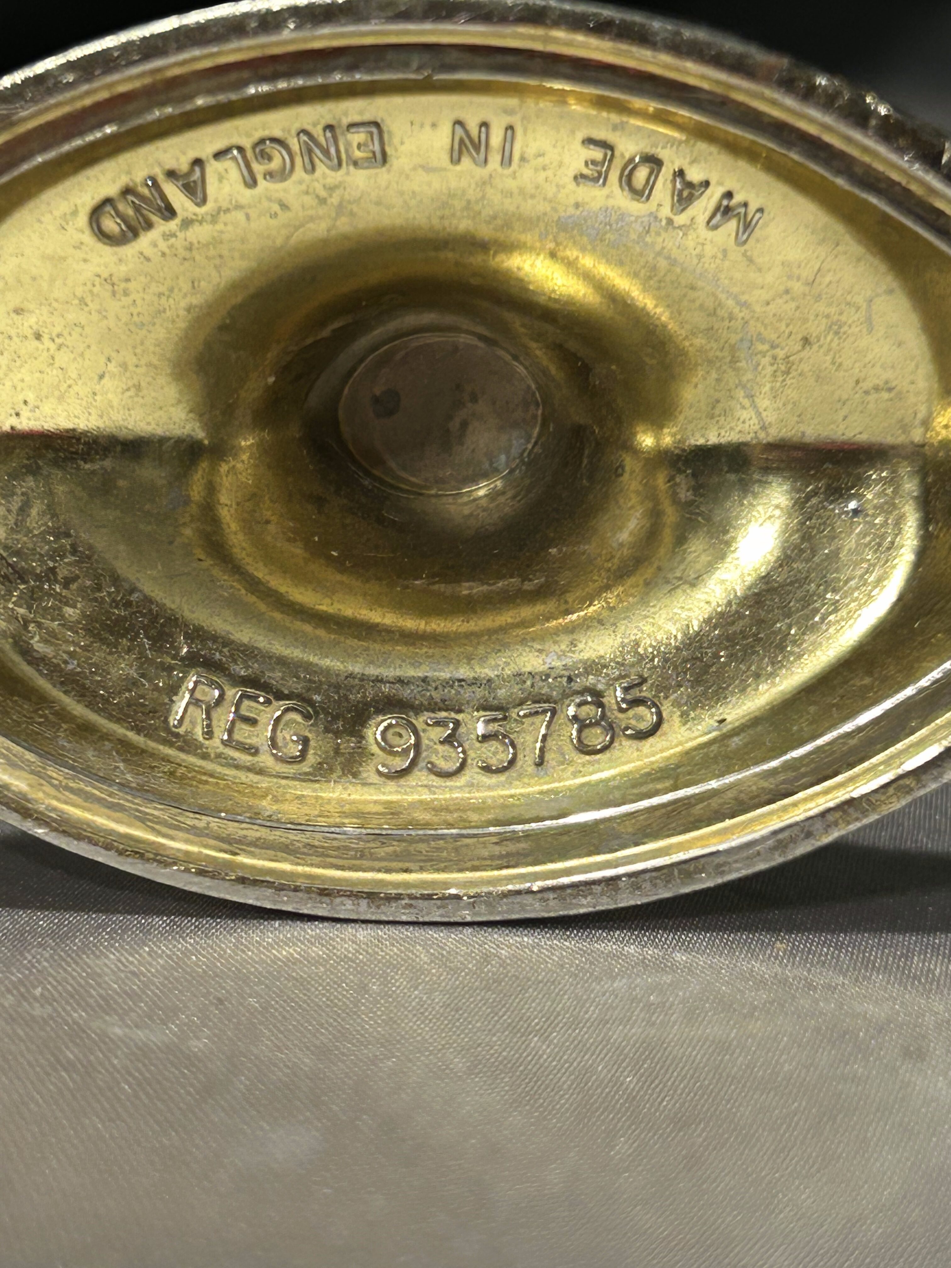 Świecznik sygnowany od spodu: Made in England, reg. 935785, co potwierdza jego pochodzenie oraz produkcję zgodną z brytyjskimi rejestrami wzorów użytkowych. Przedmiot idealny zarówno do codziennego użytku, jak i jako elegancka dekoracja stołu lub komody.