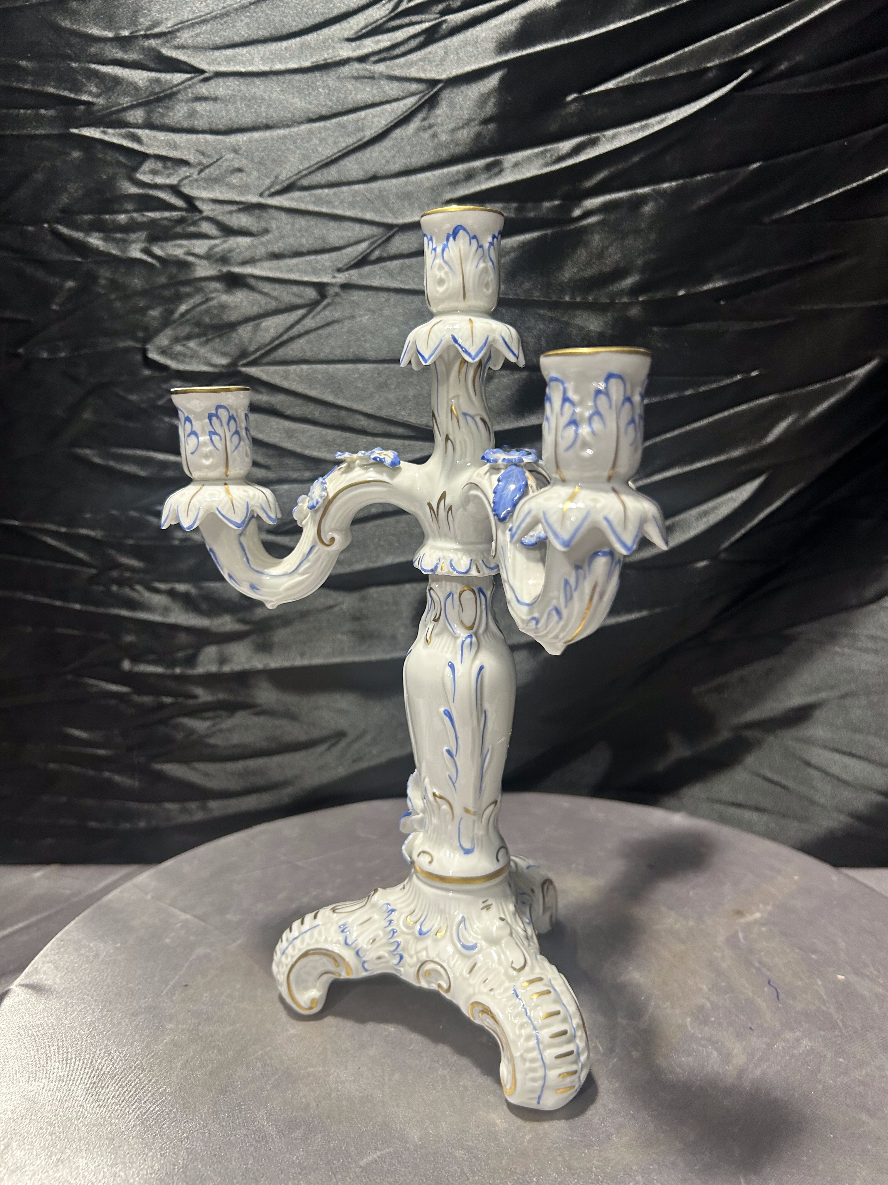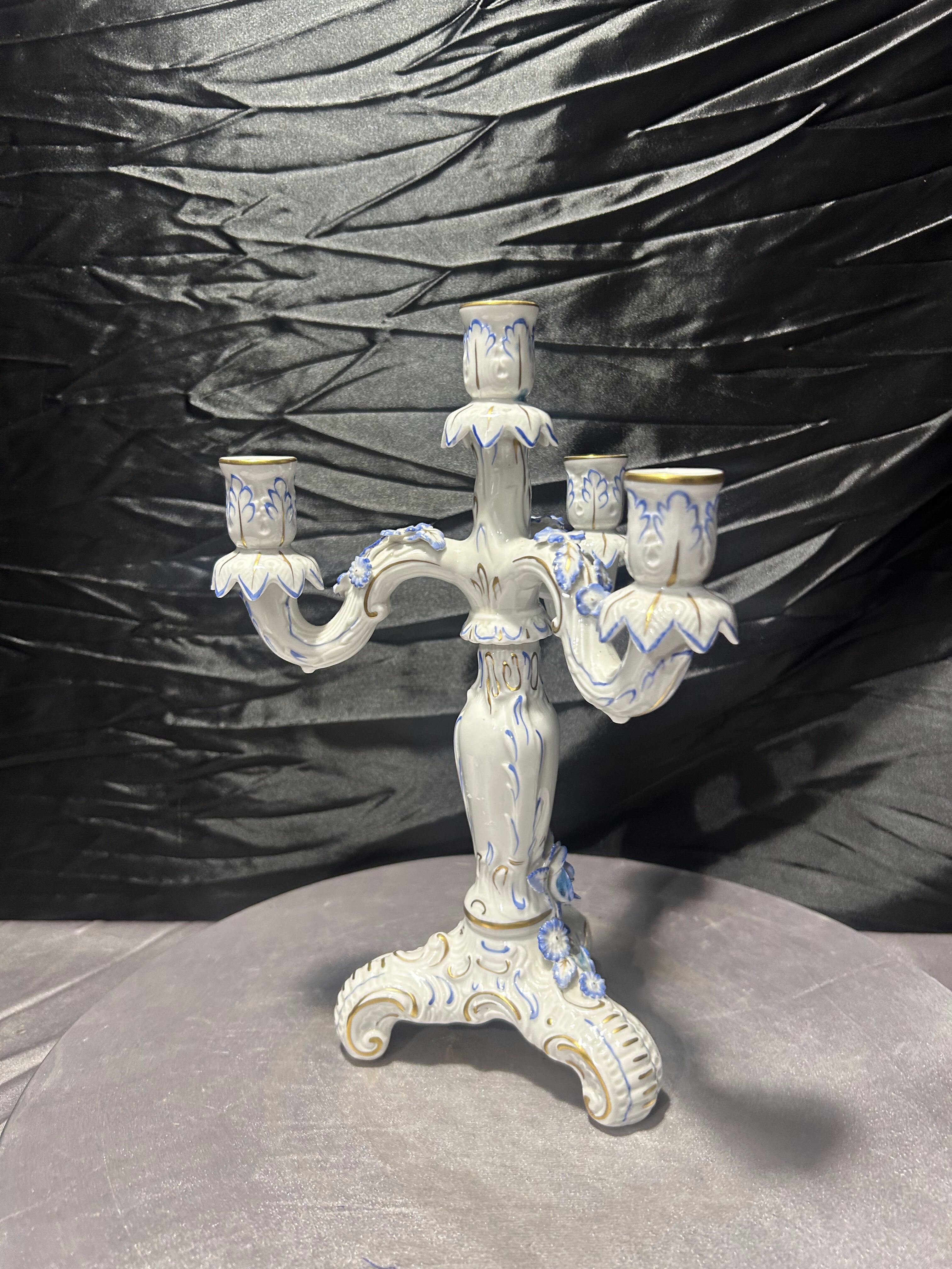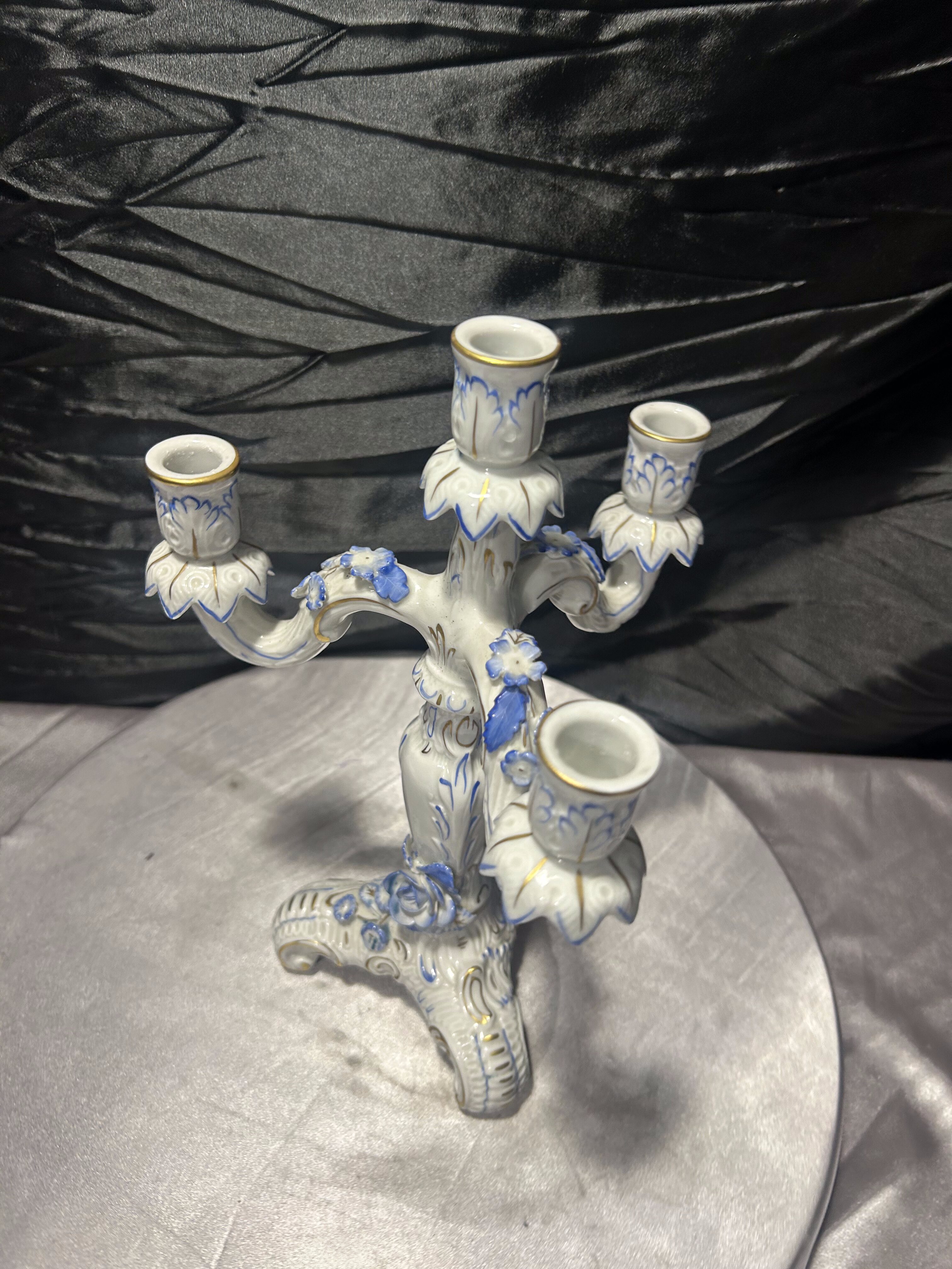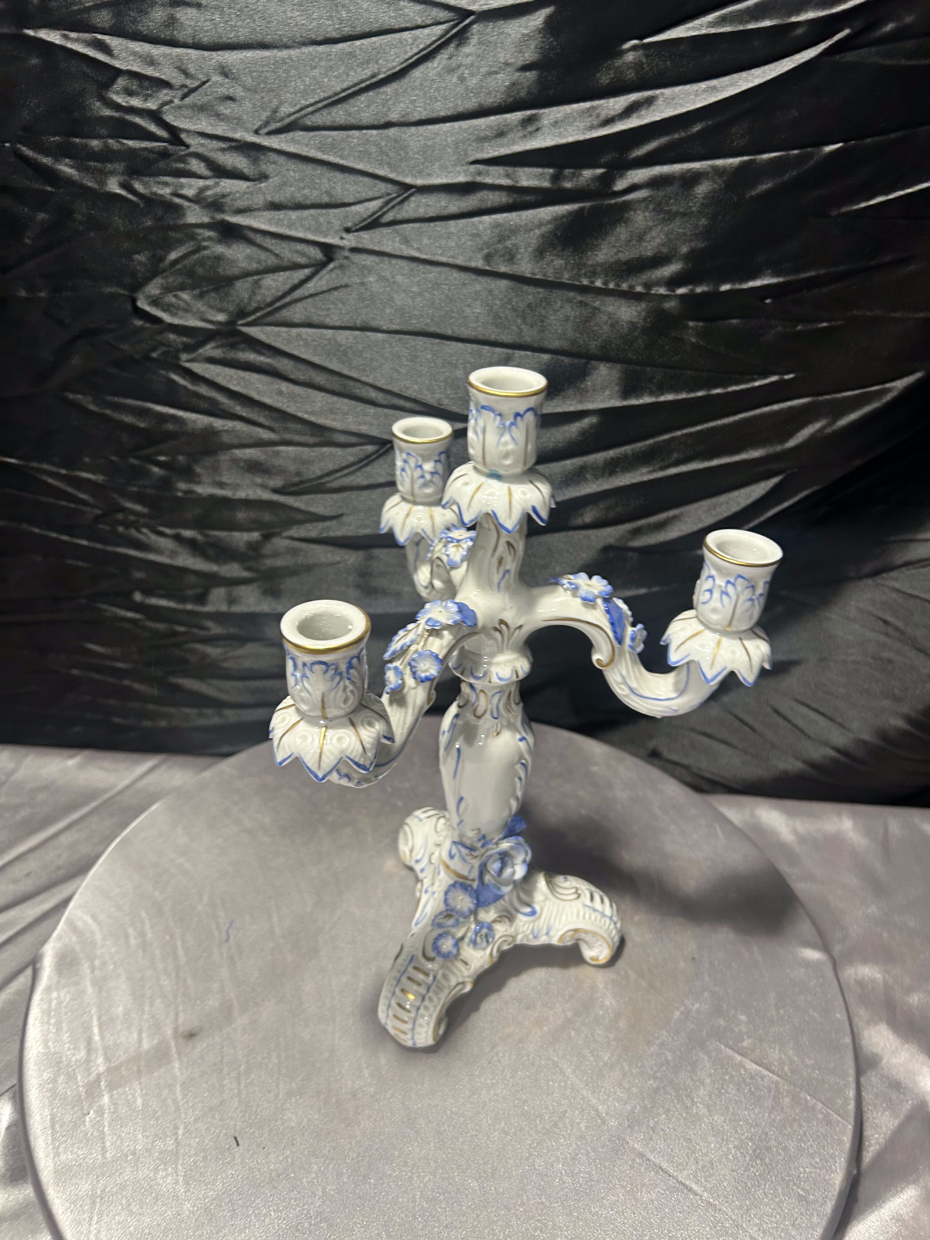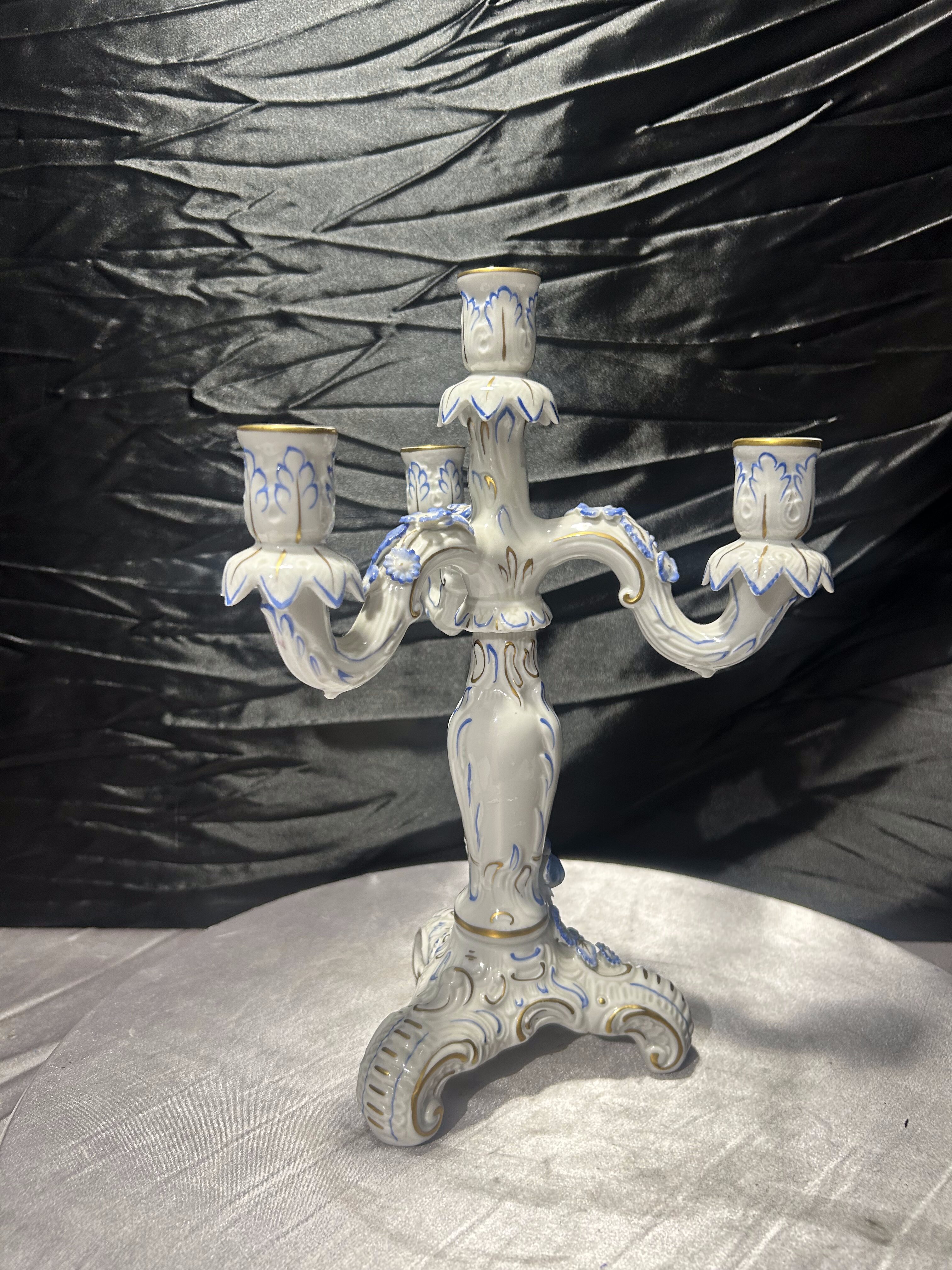 Elegancki porcelanowy świecznik czteroramienny, wykonany z wysokiej jakości porcelany i bogato zdobiony ręcznie malowanymi detalami w odcieniach błękitu oraz subtelnymi złoceniami. Forma nawiązuje do klasycznych europejskich wzorów dekoracyjnych, które doskonale komponują się zarówno z wnętrzami stylowymi, jak i bardziej nowoczesnymi aranżacjami jako dekoracyjny akcent.