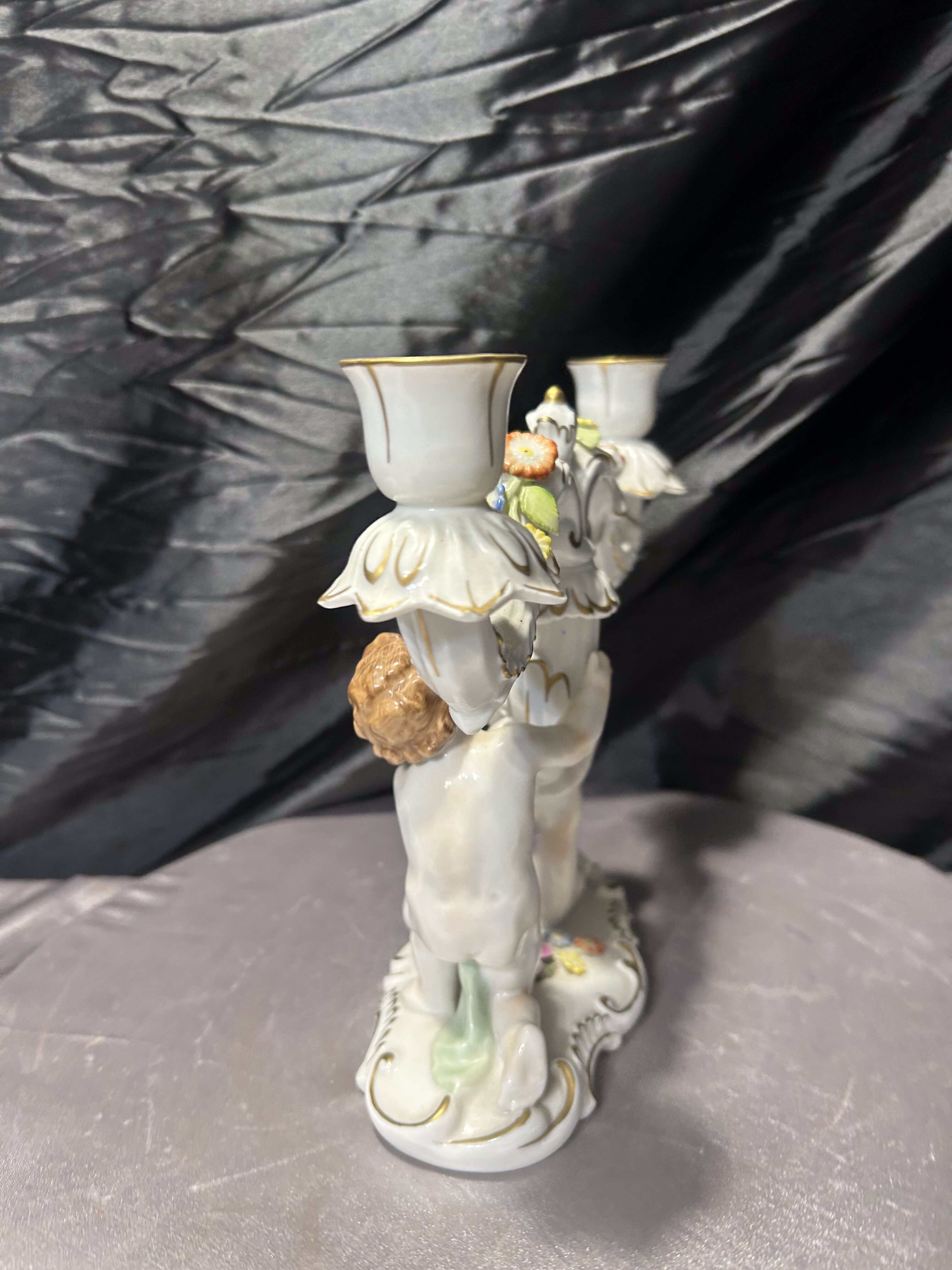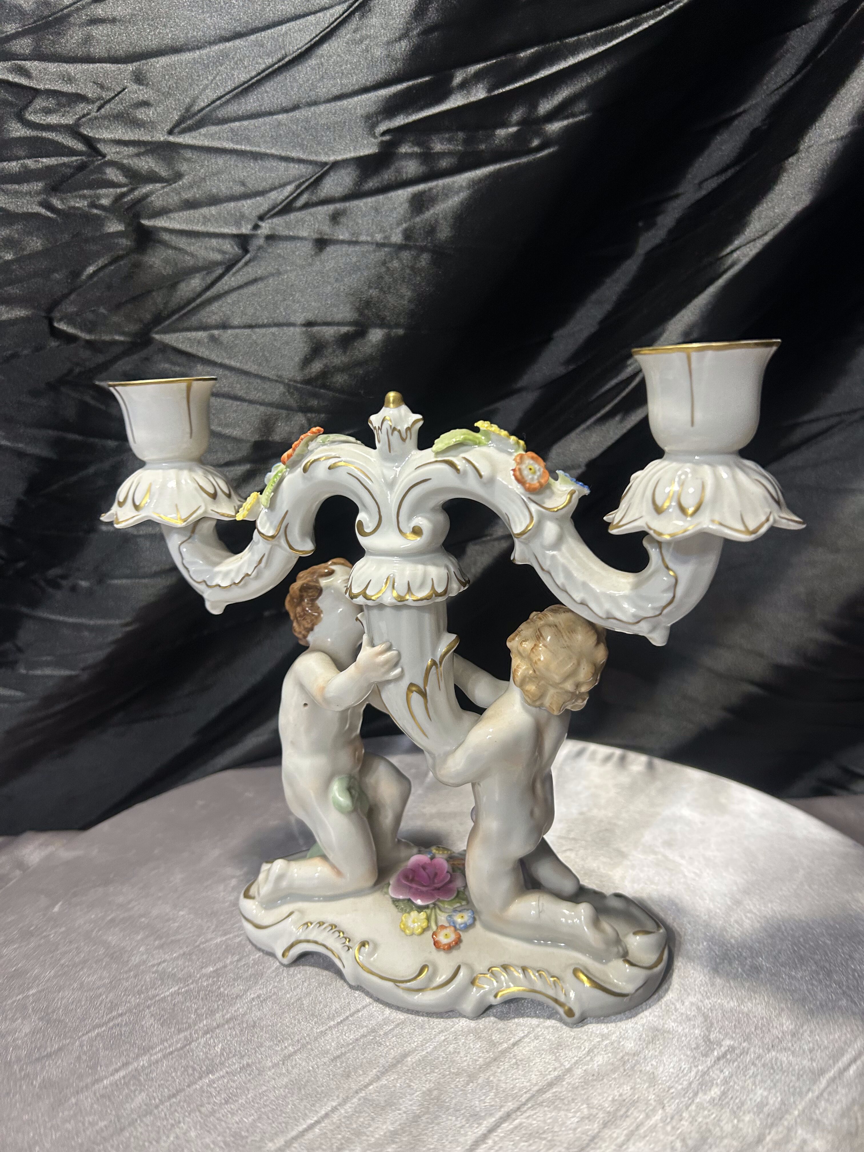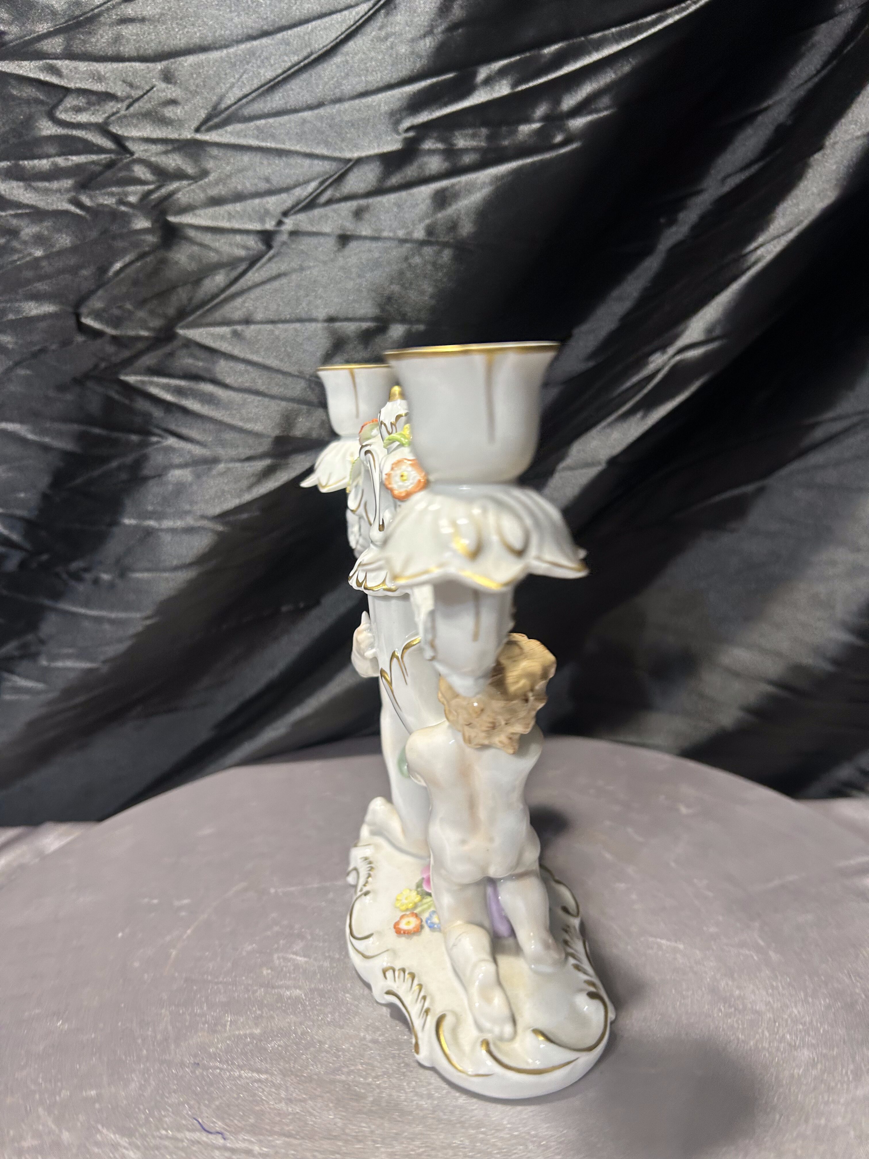 Świecznik przedstawia dwójkę dzieci podtrzymujących stylizowaną, roślinną kolumnę z dwoma ramionami świecowymi. Delikatne pastelowe barwy, ręczne złocenia i kwiatowe detale sprawiają, że jest to przedmiot pełen wdzięku i nostalgii — idealny do wnętrz klasycznych i romantycznych.