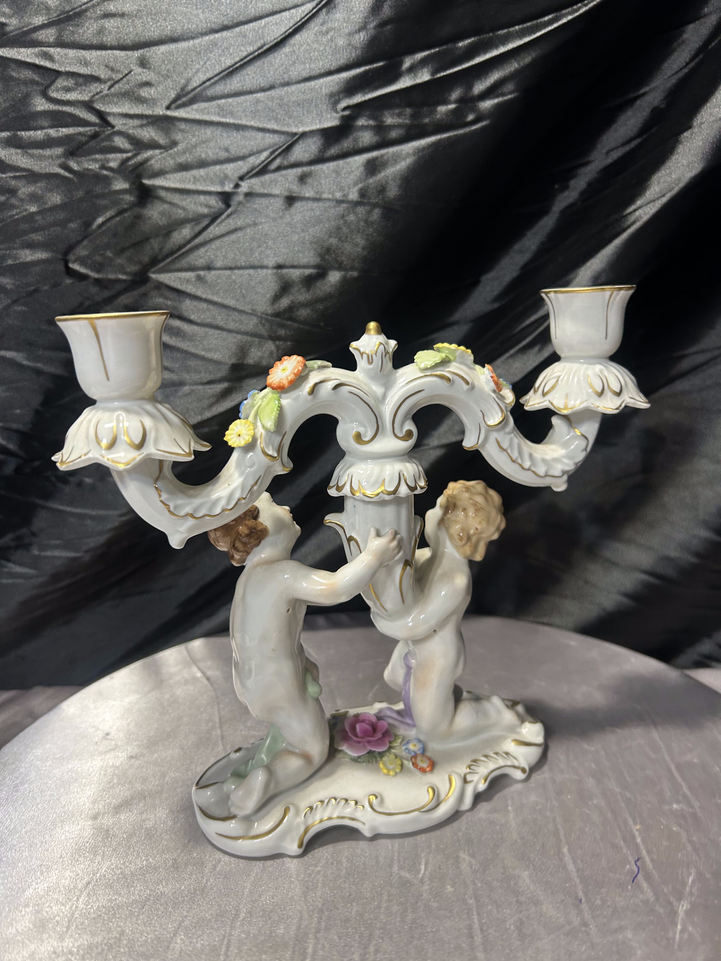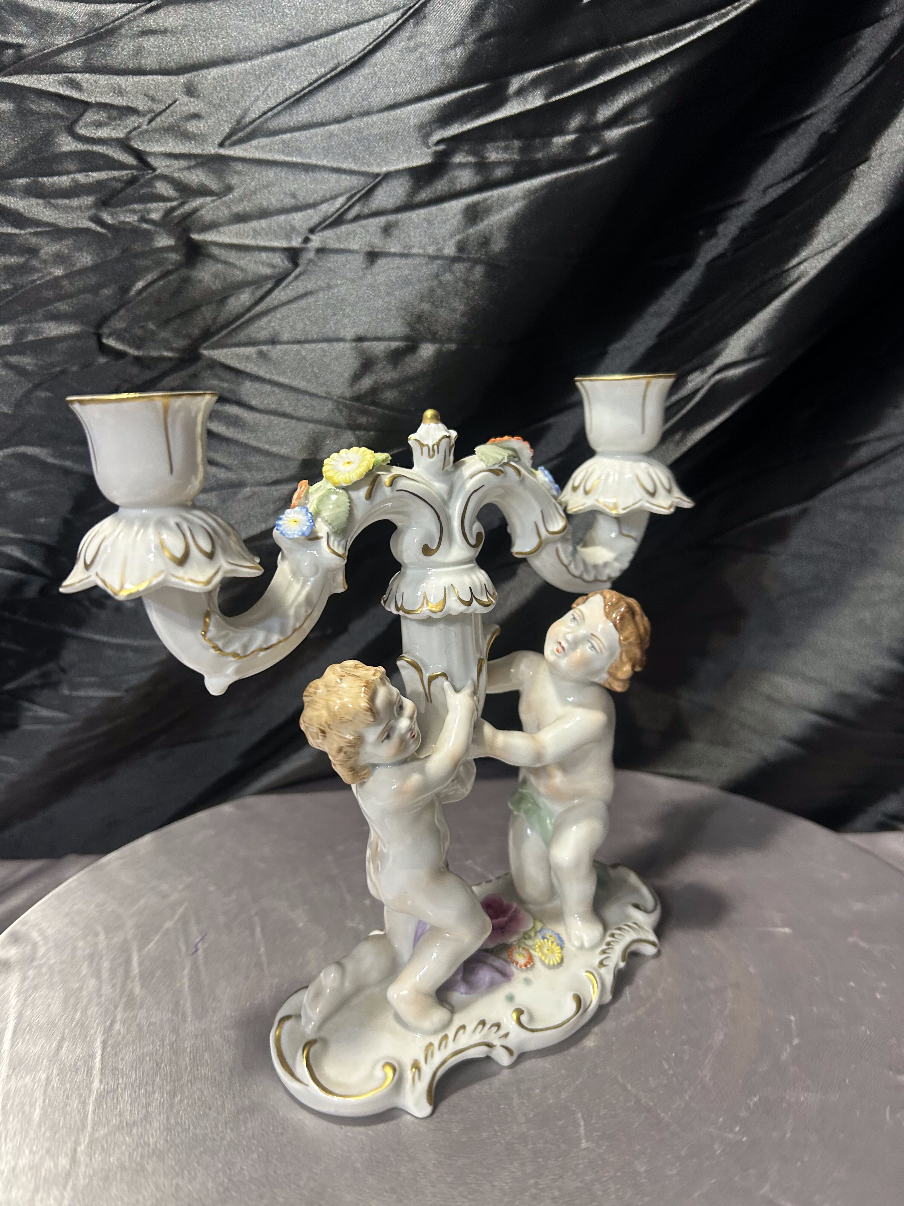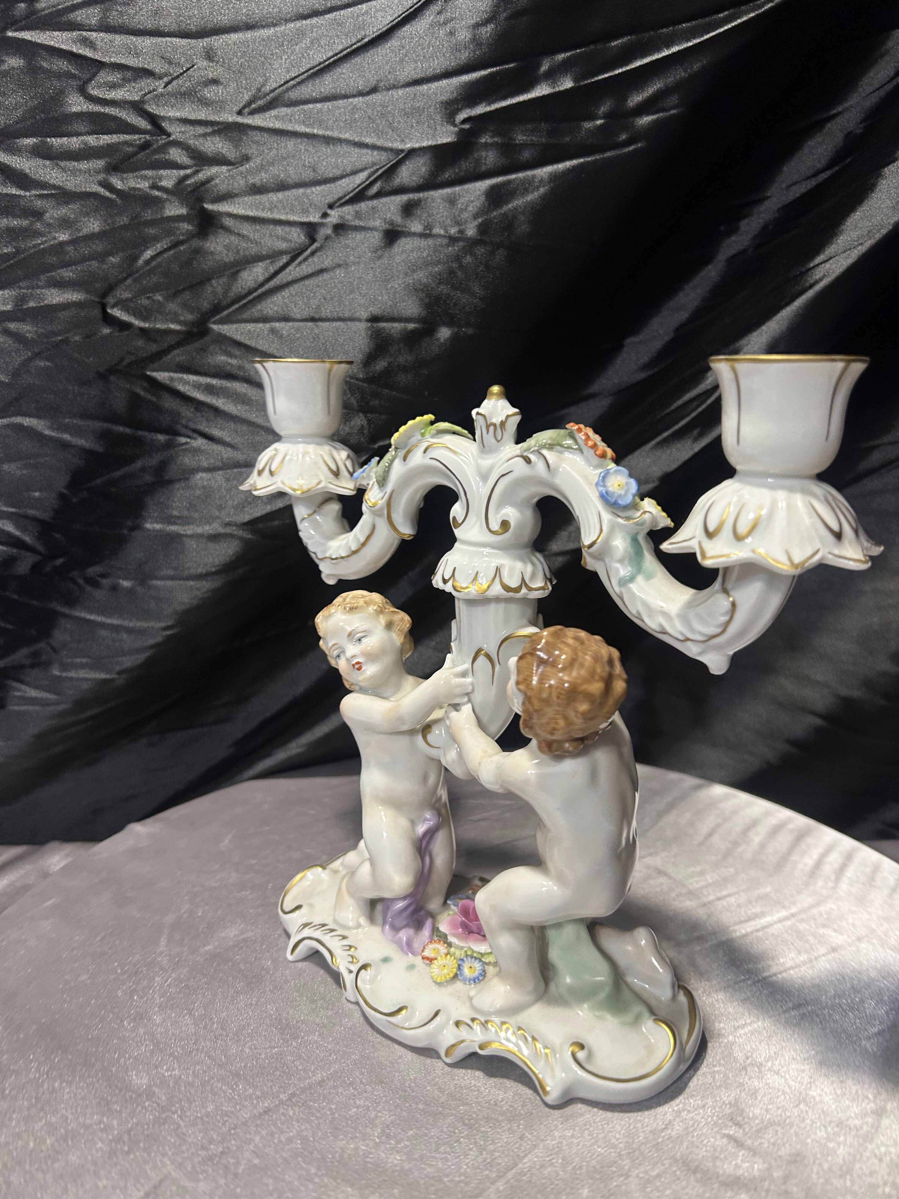 Świecznik przedstawia dwójkę dzieci podtrzymujących stylizowaną, roślinną kolumnę z dwoma ramionami świecowymi. Delikatne pastelowe barwy, ręczne złocenia i kwiatowe detale sprawiają, że jest to przedmiot pełen wdzięku i nostalgii — idealny do wnętrz klasycznych i romantycznych.