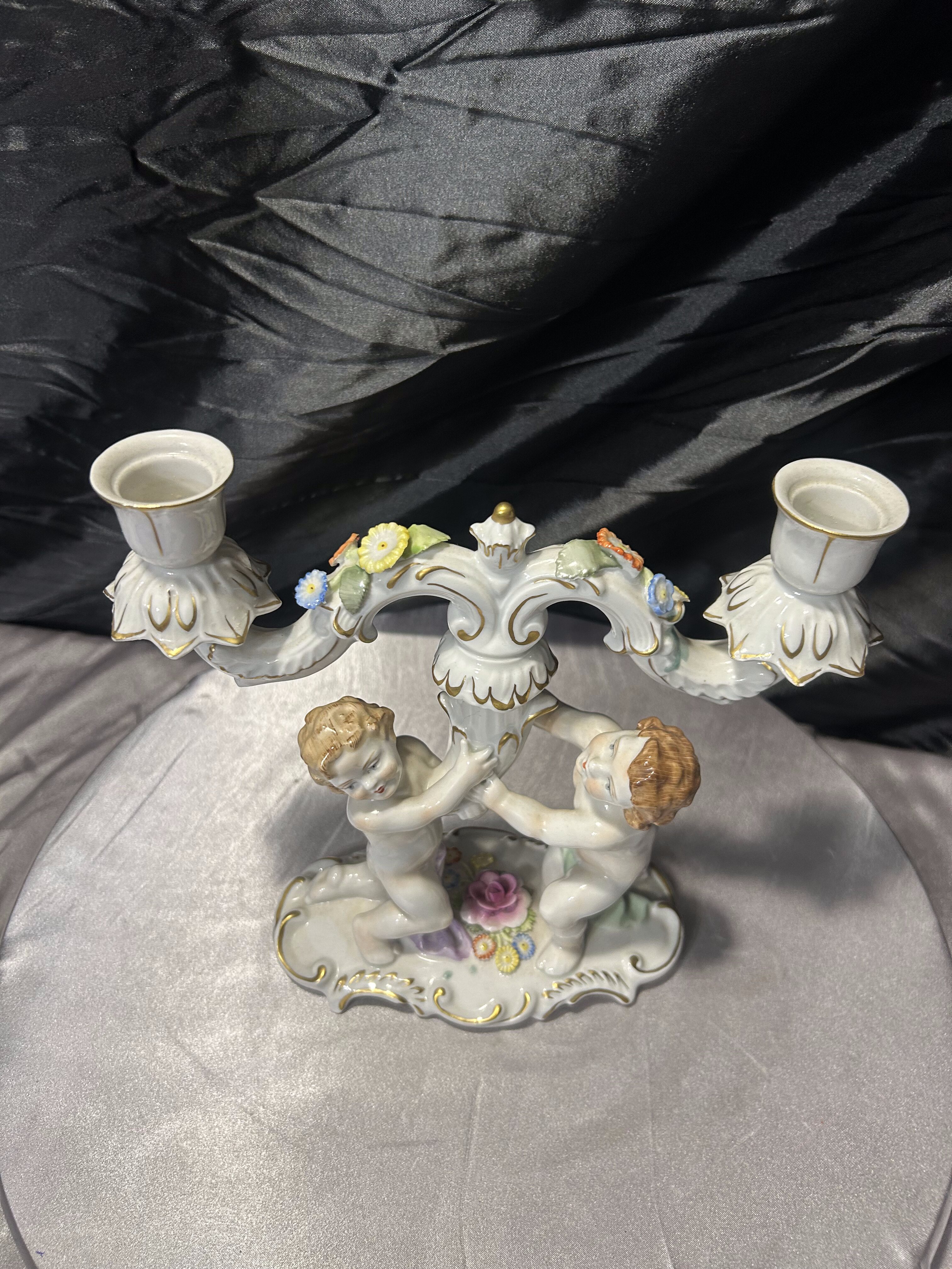 Świecznik porcelanowy z dwójką dzieci – Lichte / Volkstedt, Made in GDR, porcelana dekoracyjna