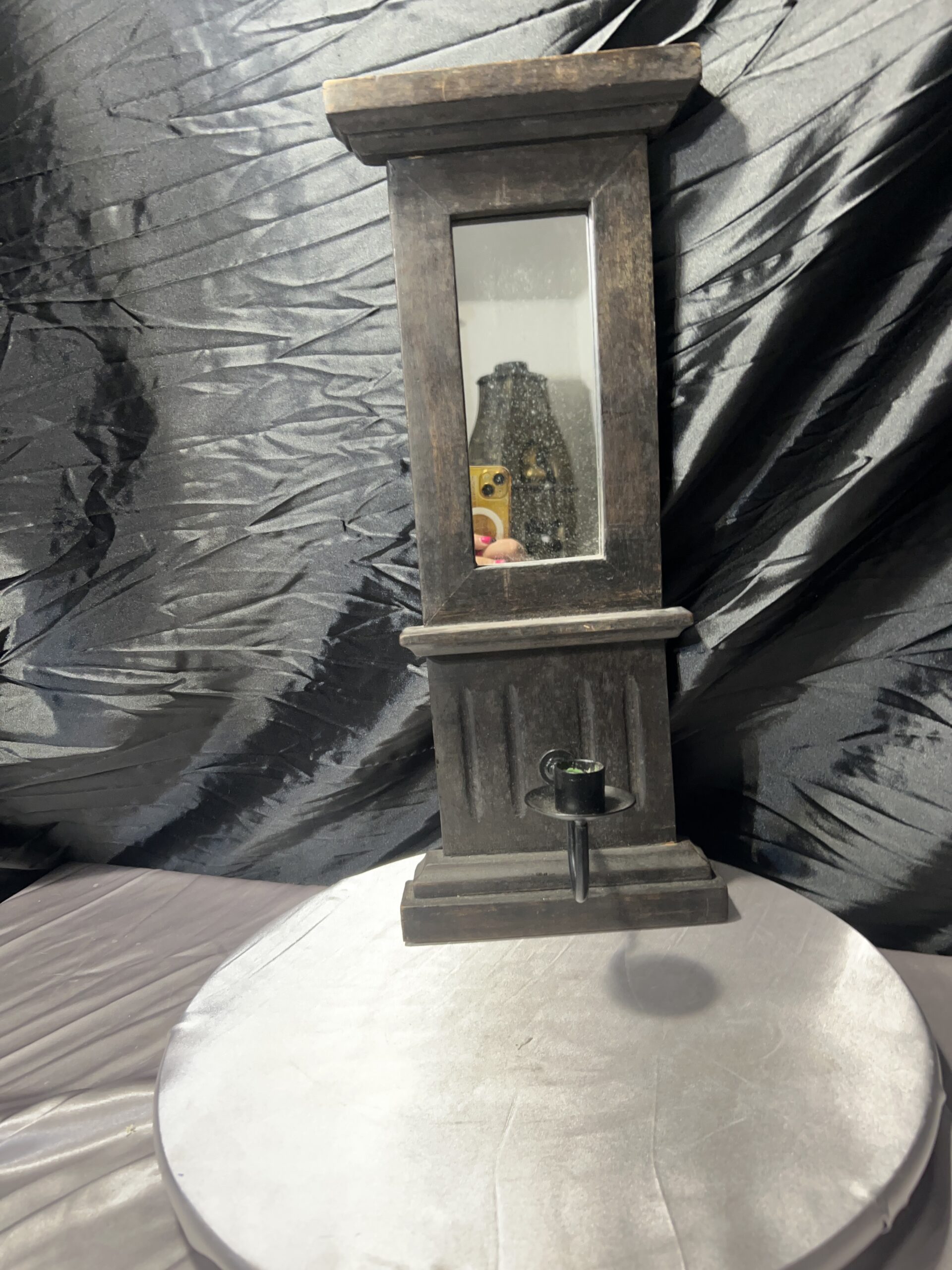 Oferuję stylowy świecznik ścienny wykonany w drewnianej ramie, wyposażony w lusterko odbijające światło świecy. Takie formy były popularne zwłaszcza w aranżacjach rustykalnych i klasycznych, ponieważ lustro wzmacniało blask płomienia, rozświetlając pomieszczenie i tworząc przyjemny, kameralny klimat.